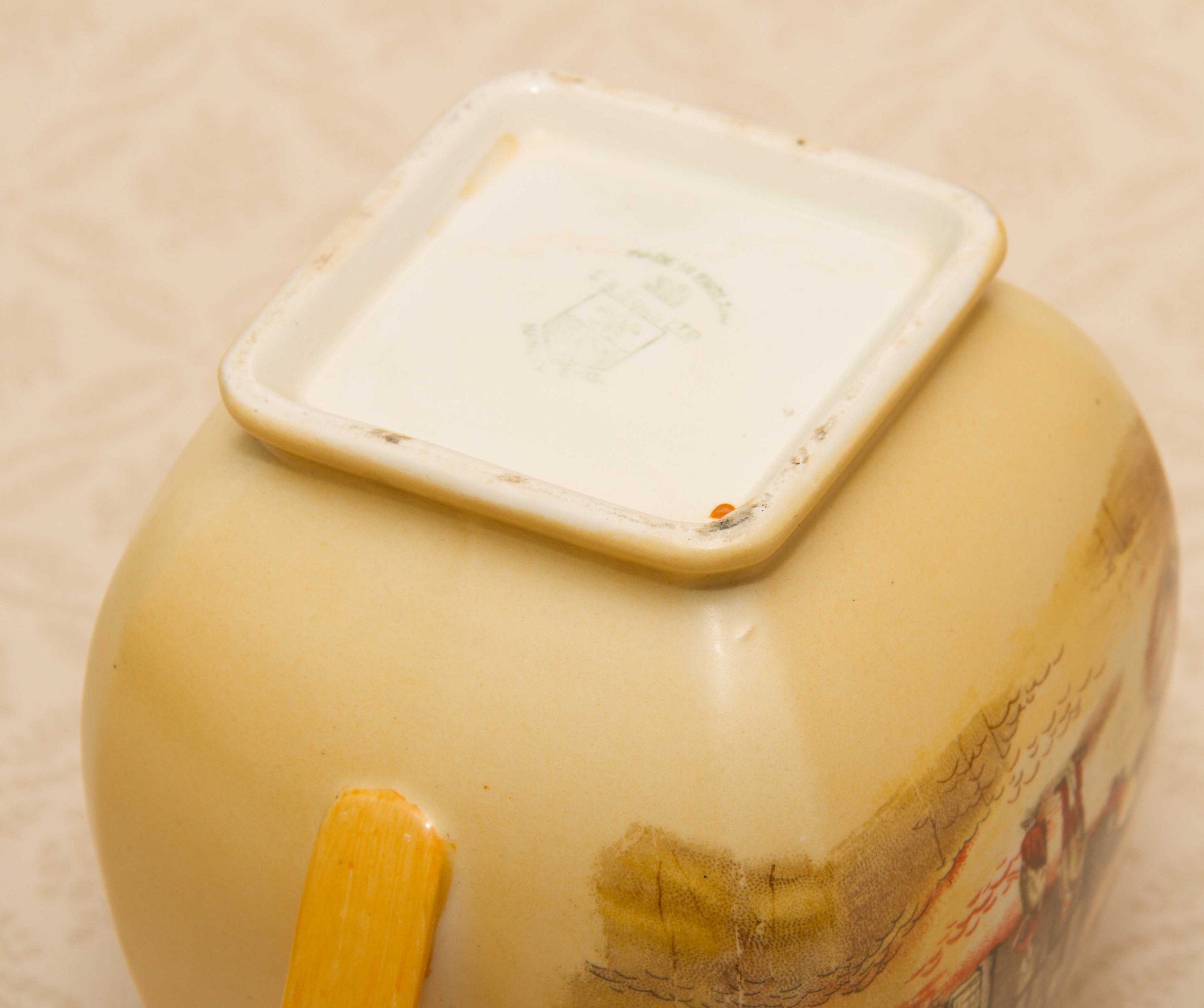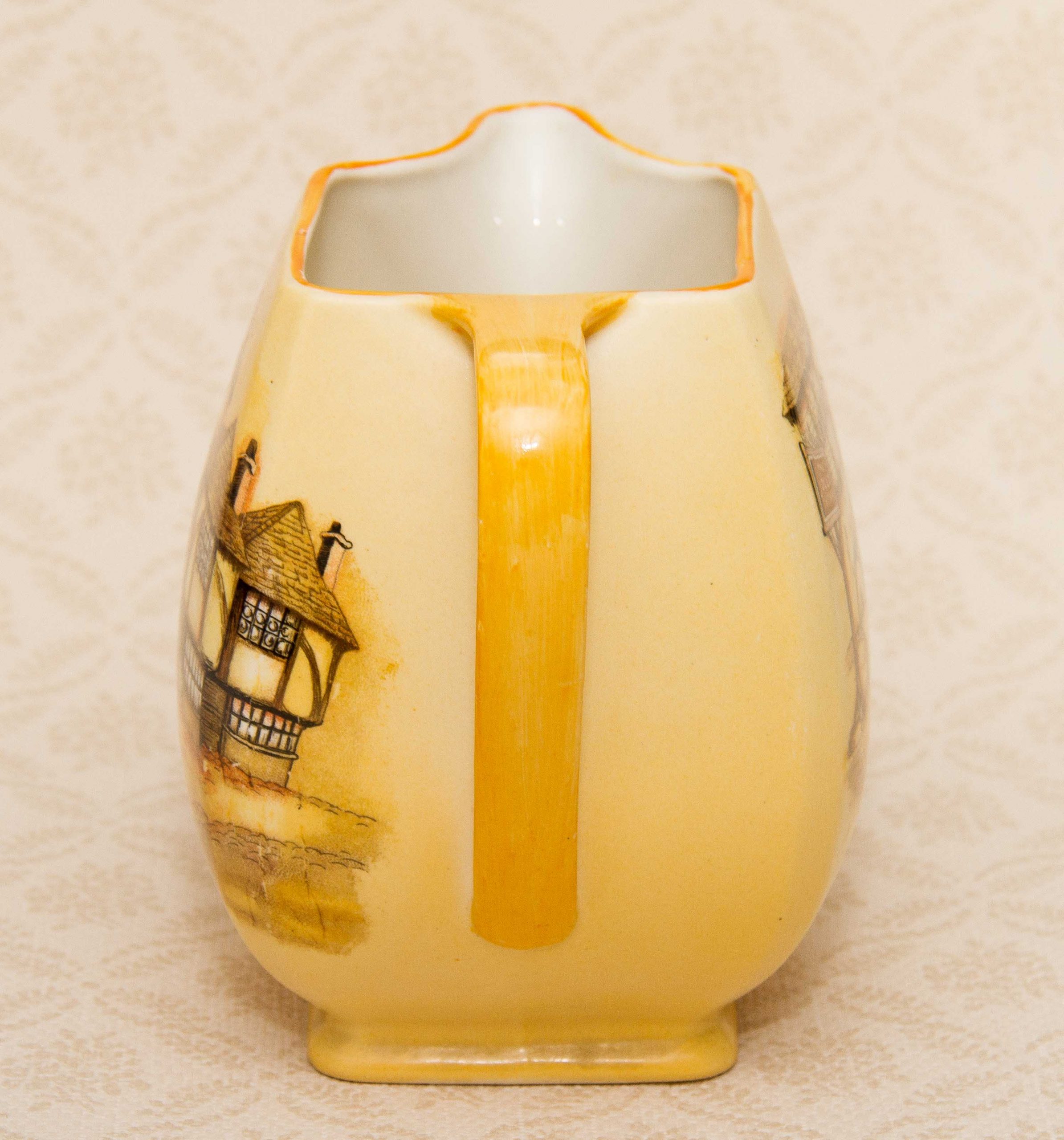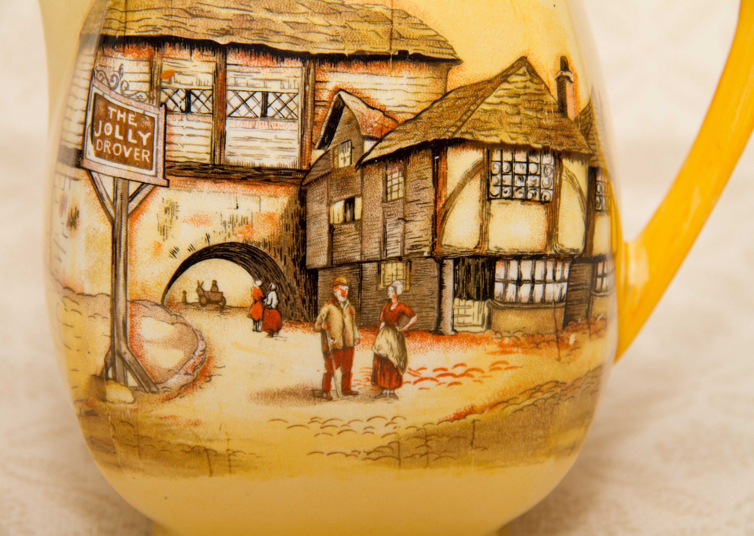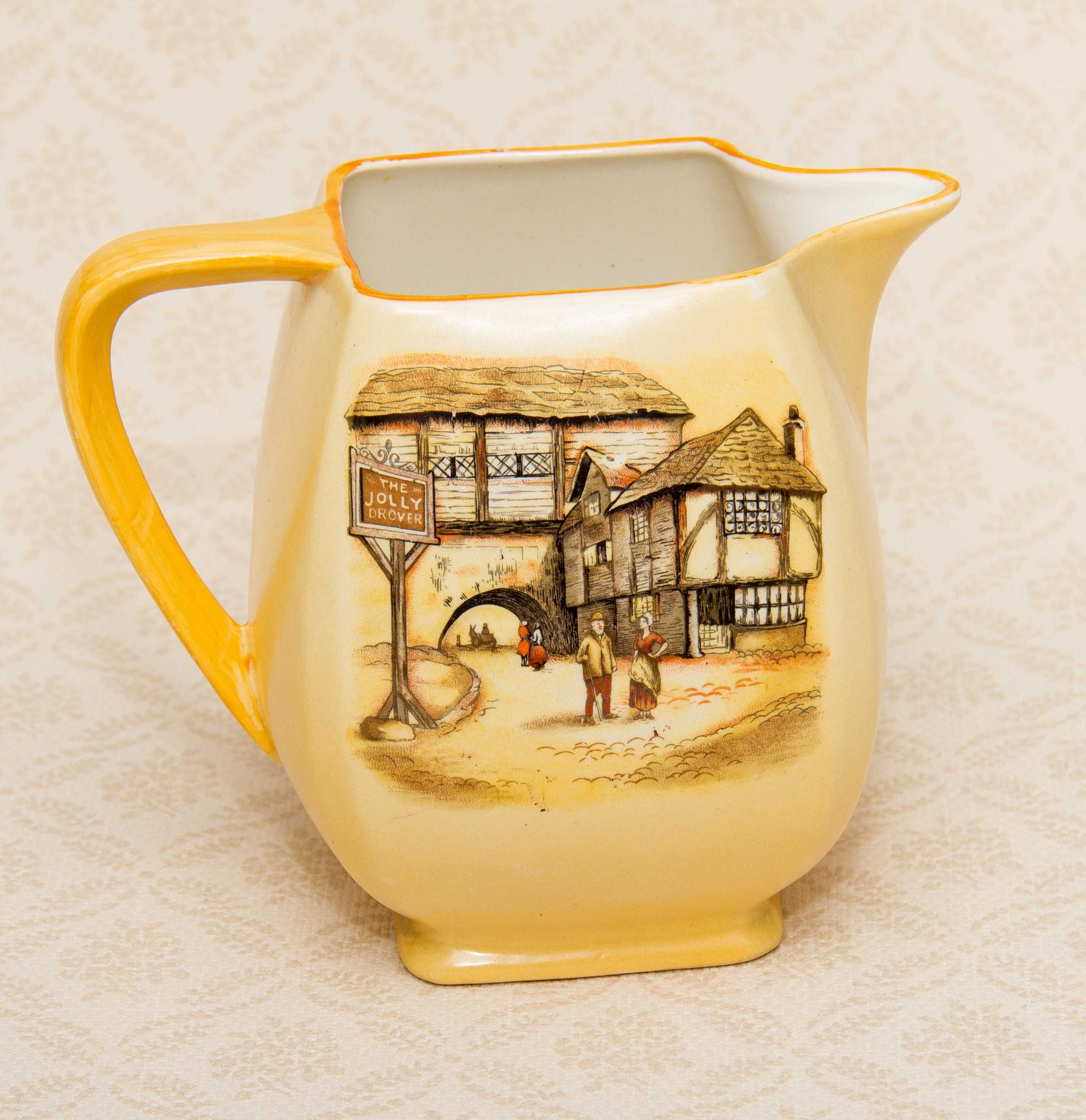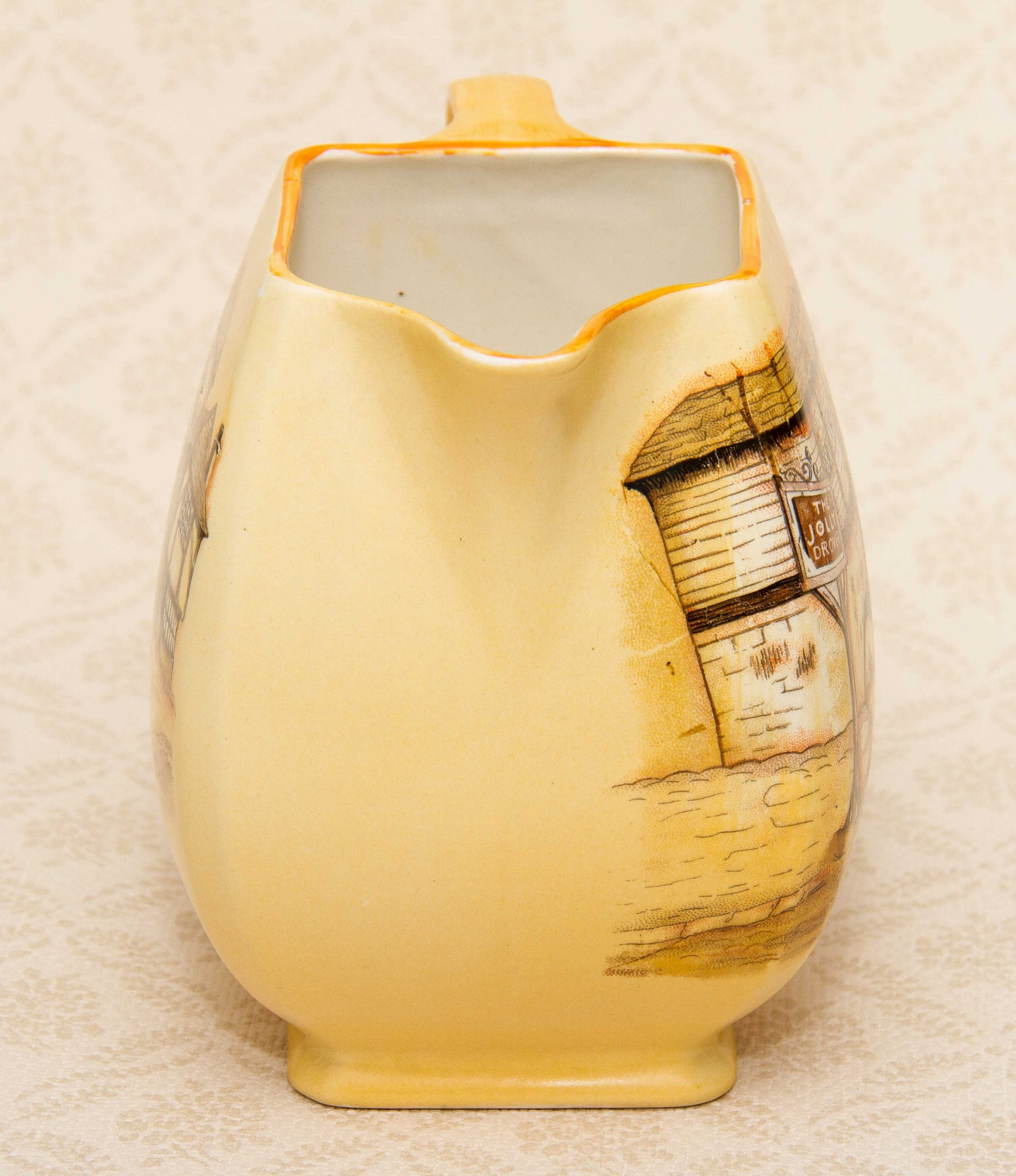 A large decorative pottery jug/pitcher by Lancaster & Sons of Hanley Staffordshire. Depicting a scene of a pub named The Jolly Drover.