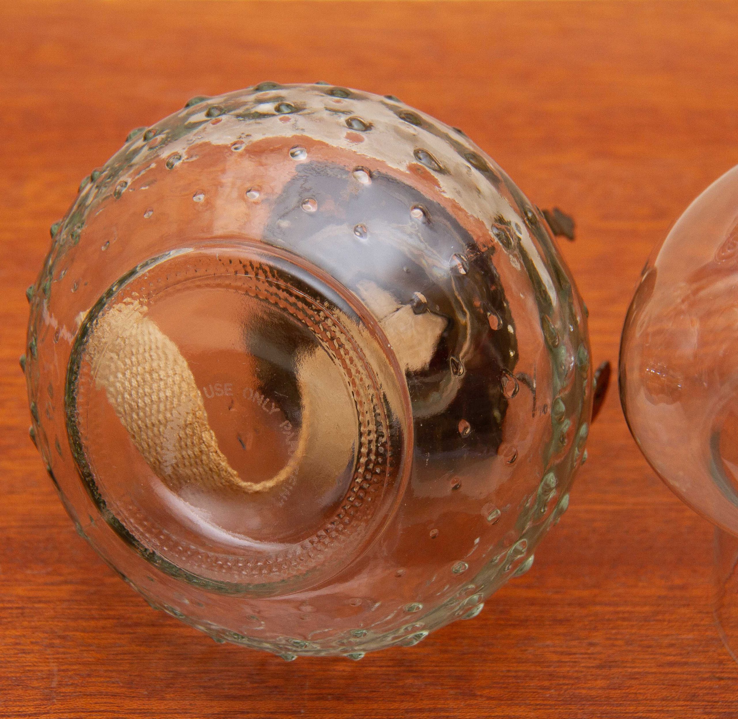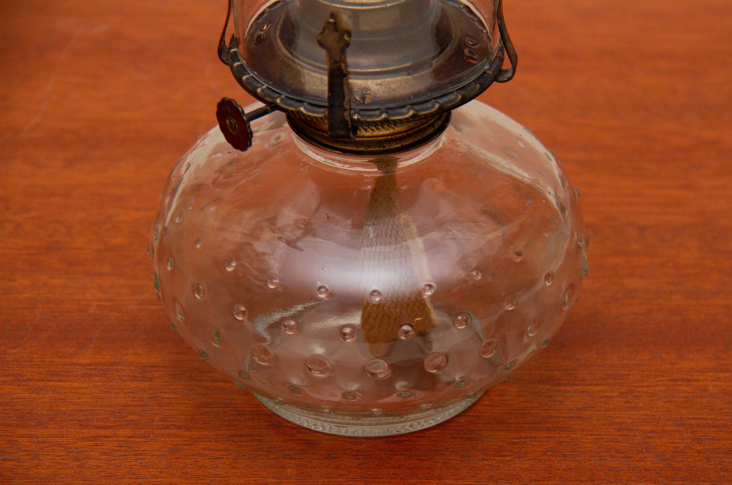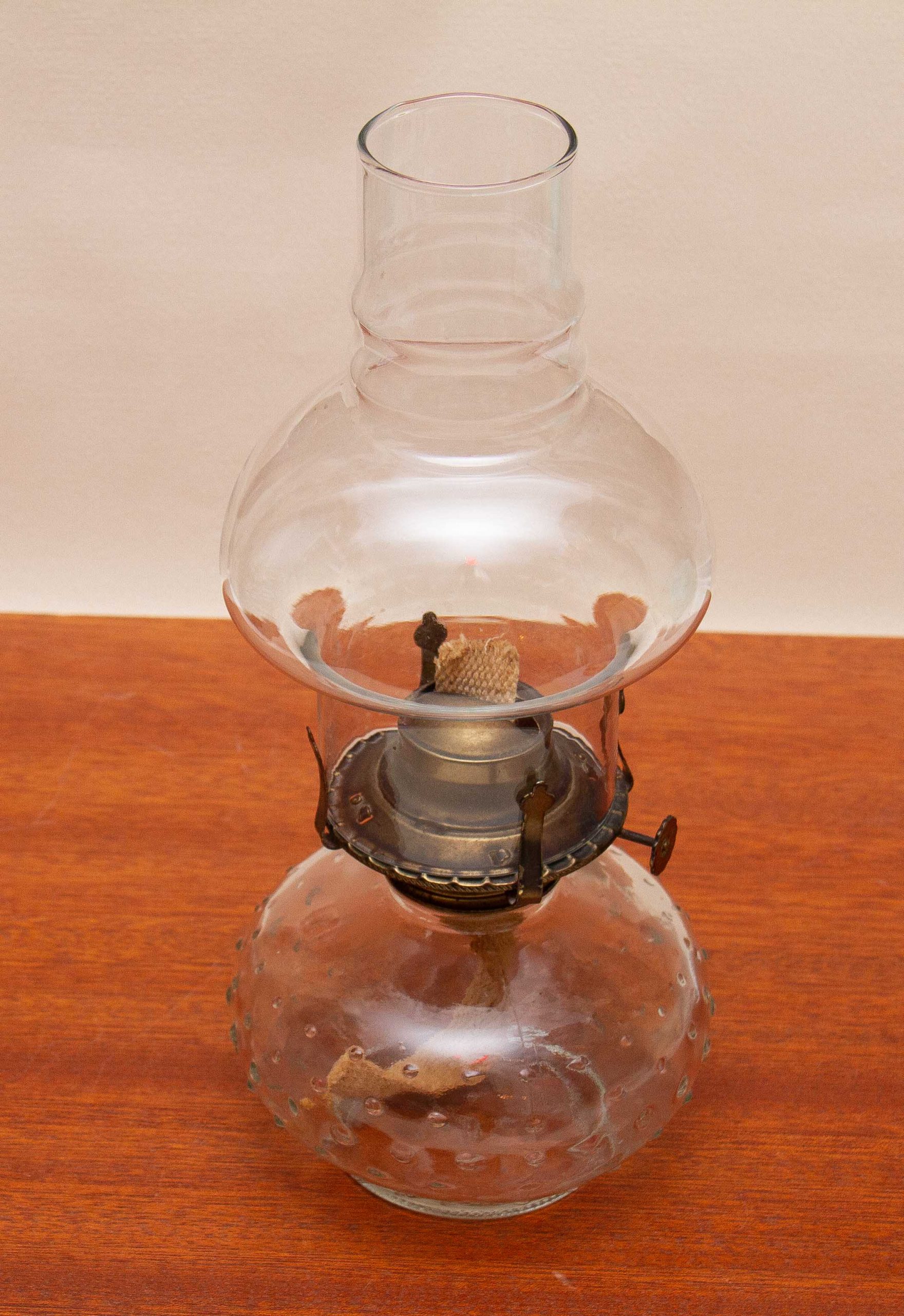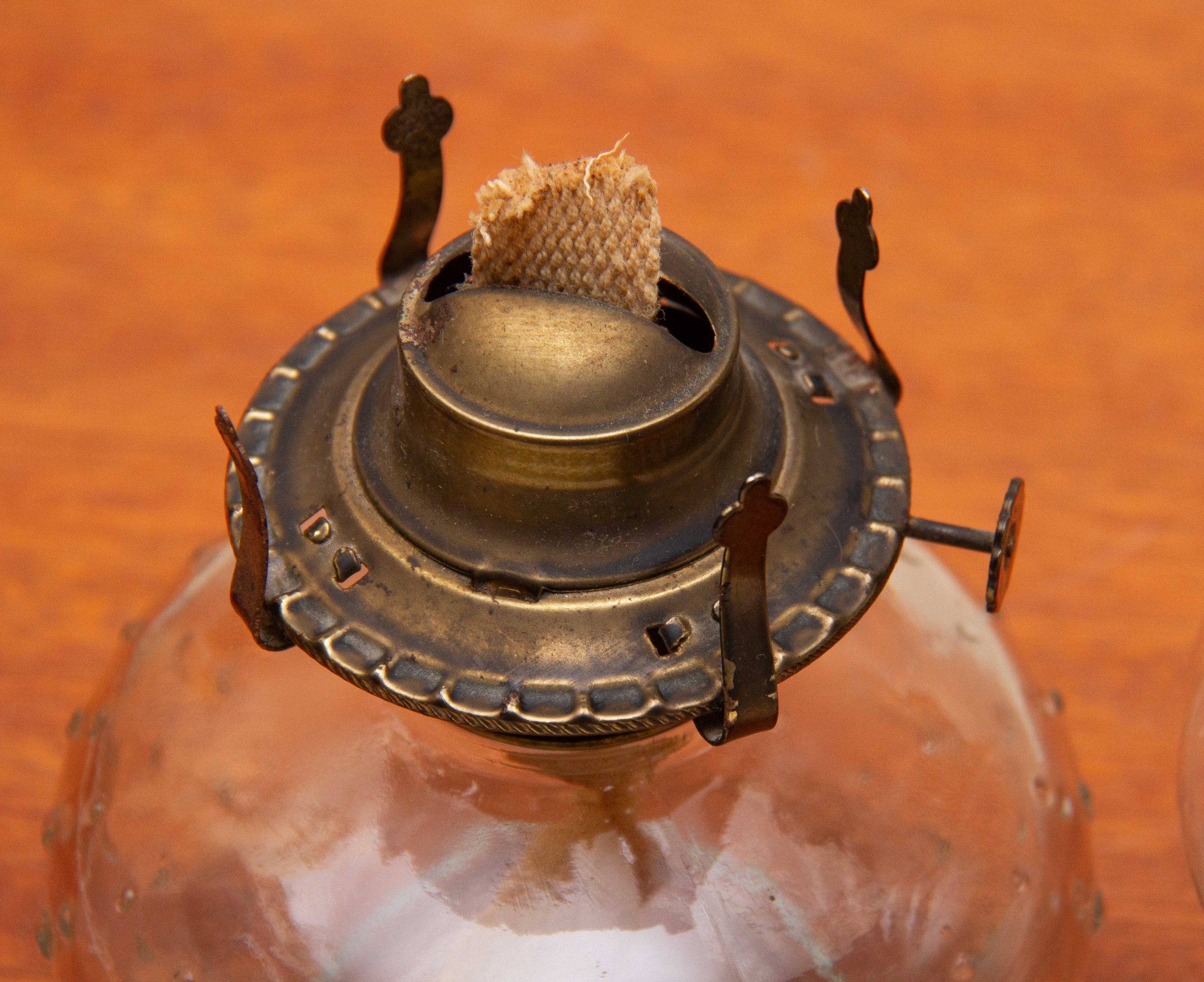 A Lamplight Farms vintage glass Oil/Paraffin lamp, with a bobble glass base, brass burner with wick and a glass chimney.