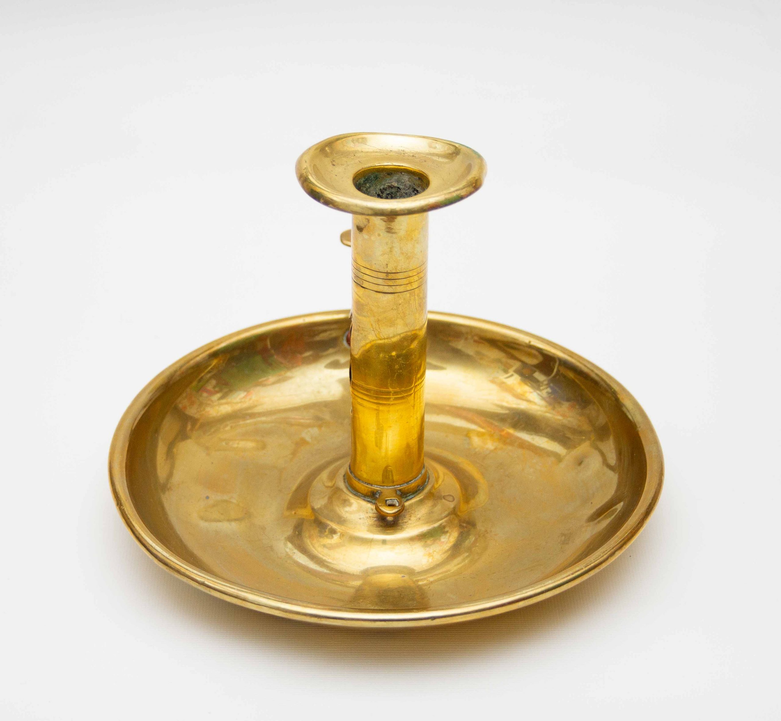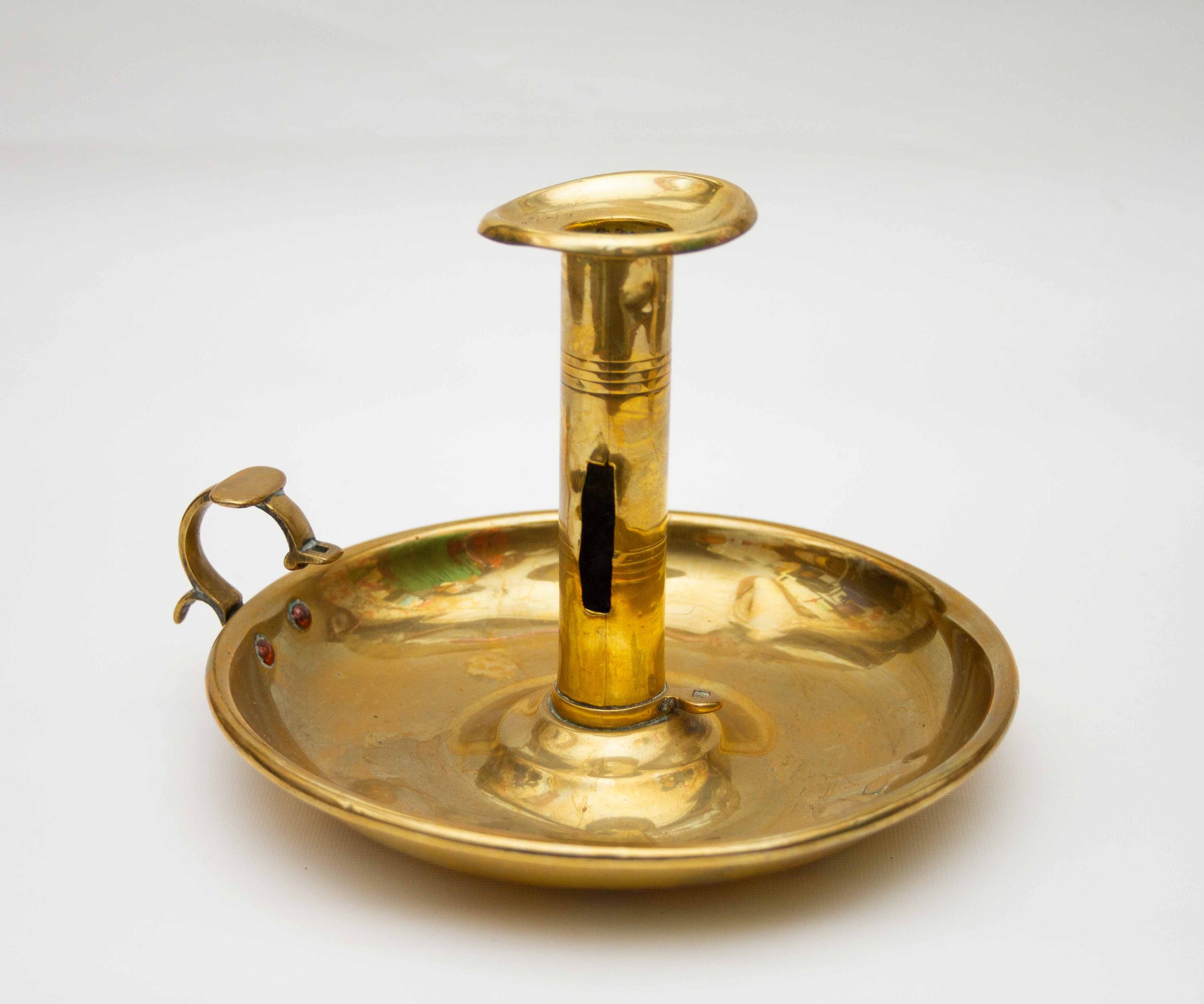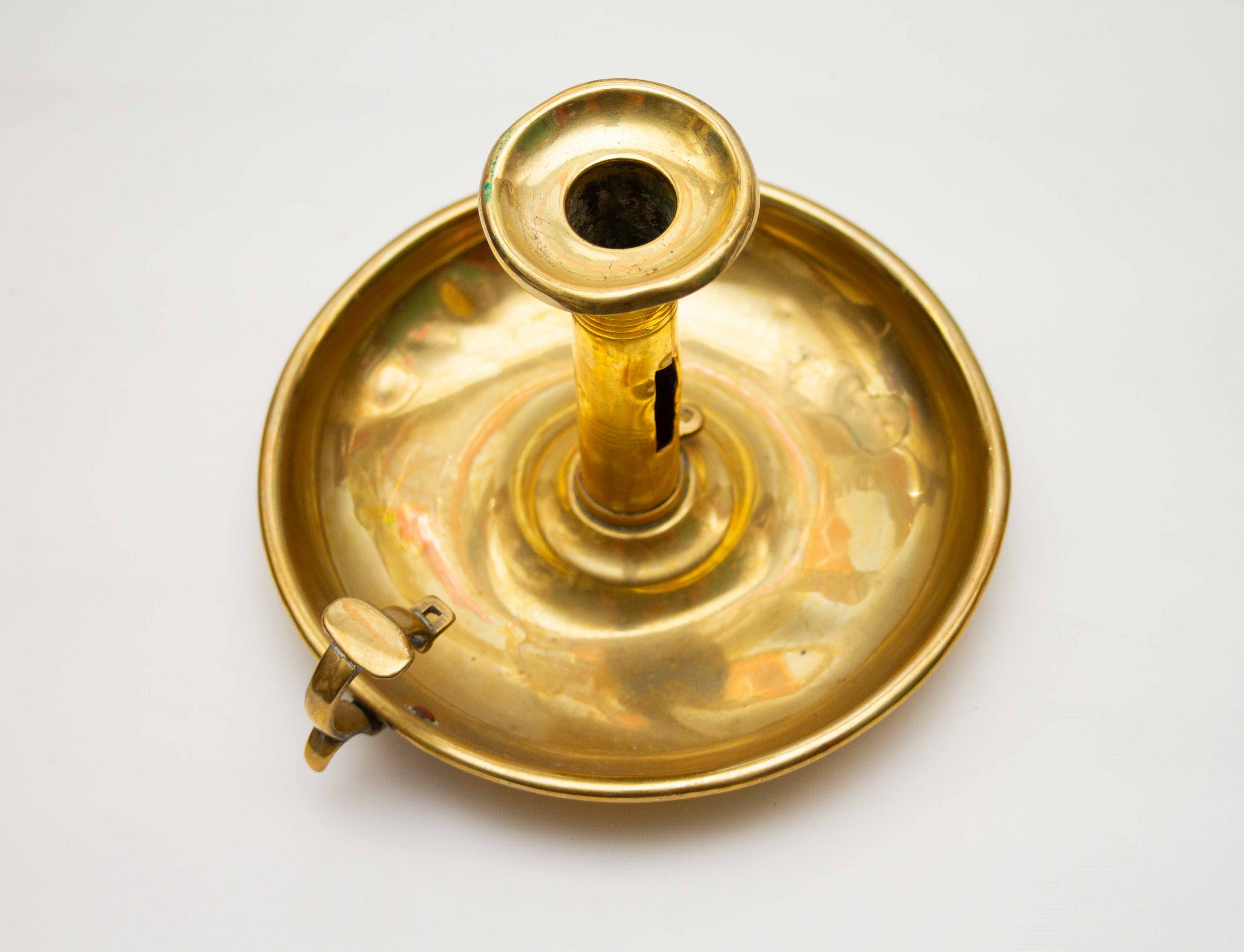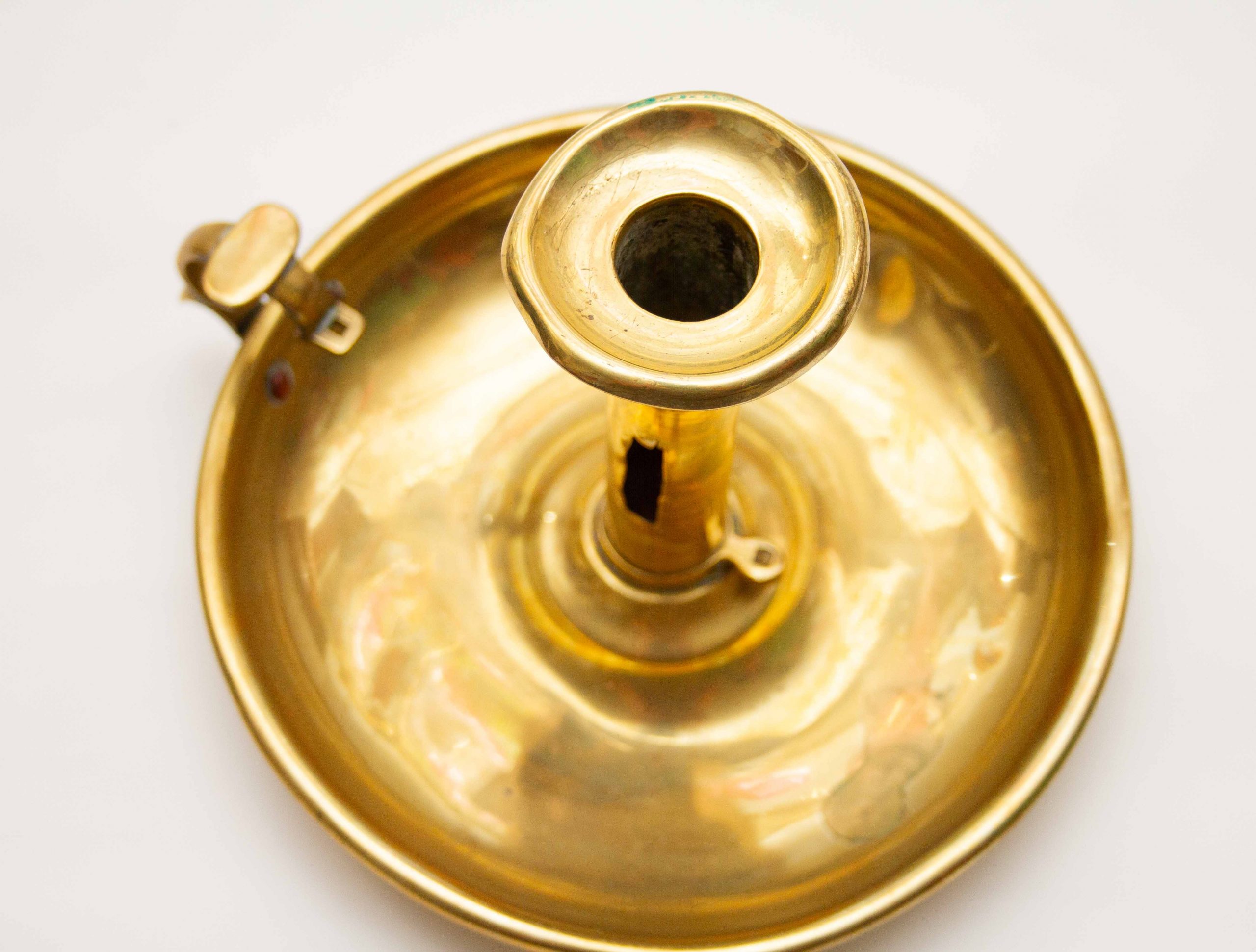 A large vintage brass Wee Willie Winkie style candlestick, chamberstick, candle holder, candle push up lever is missing.