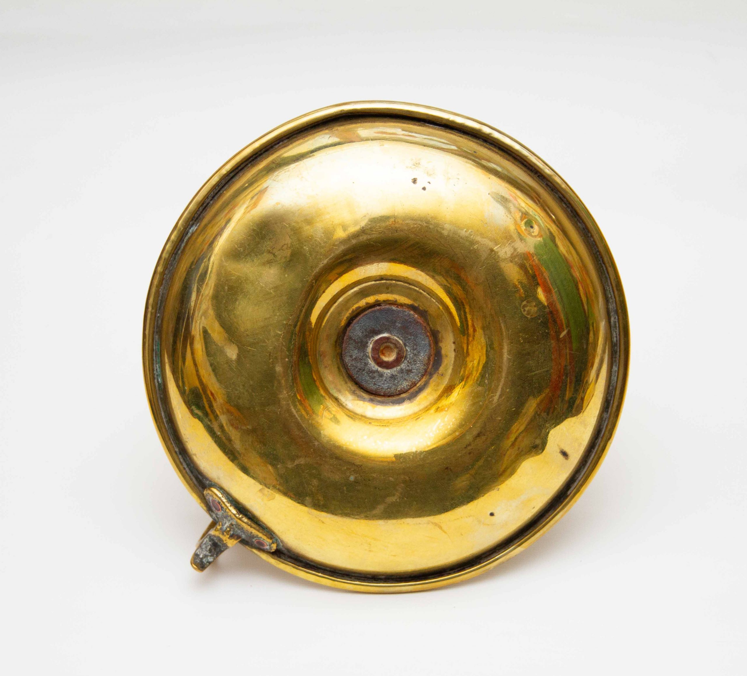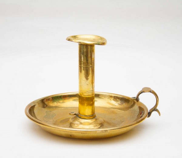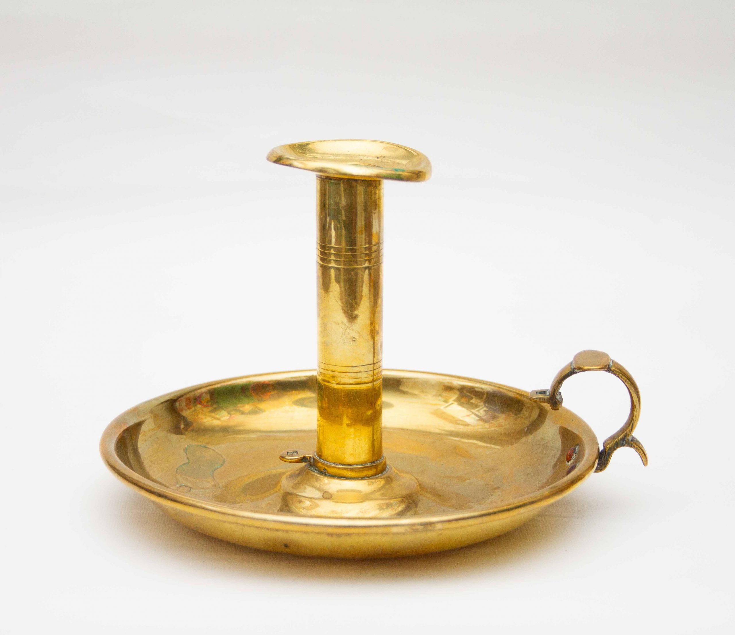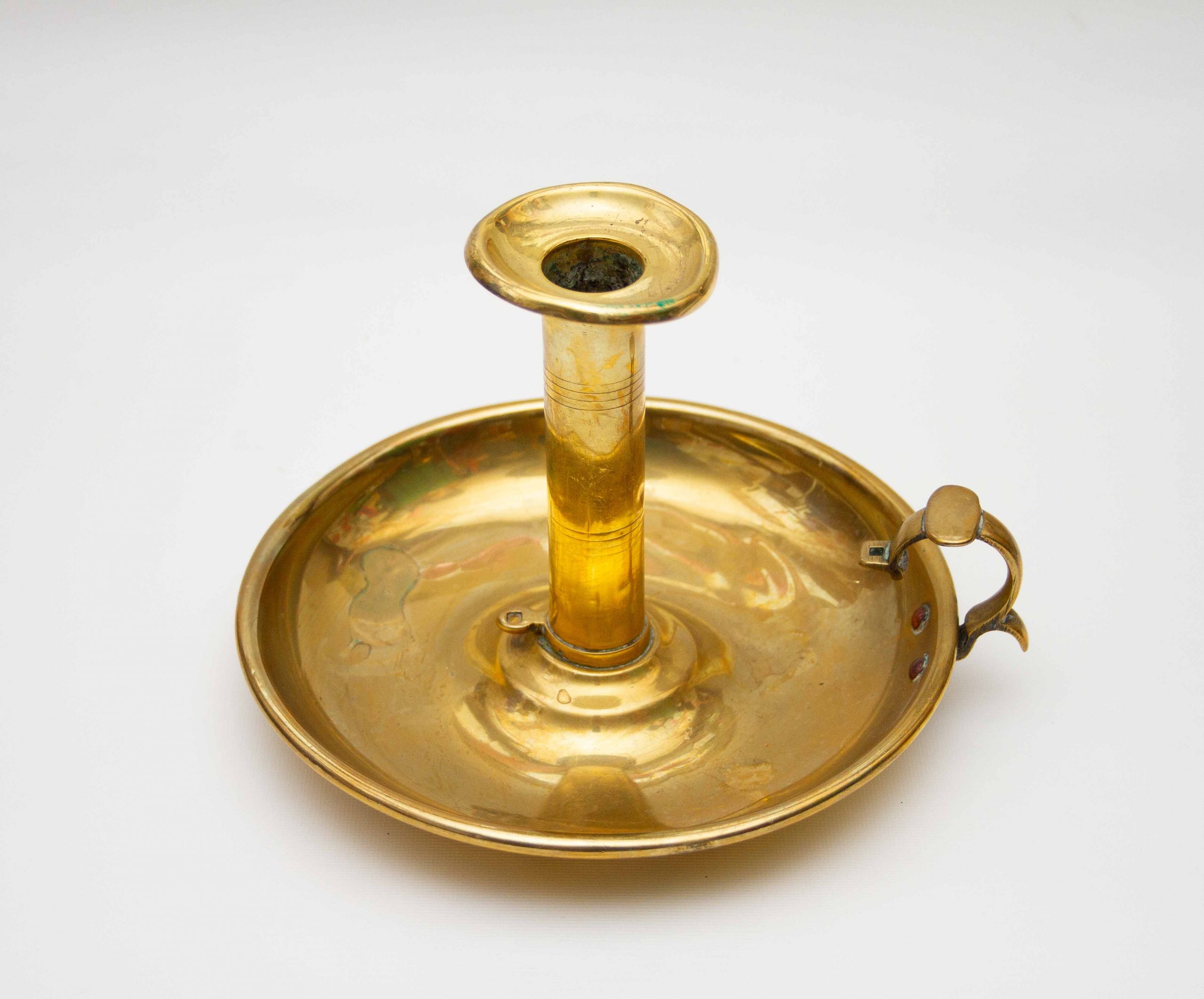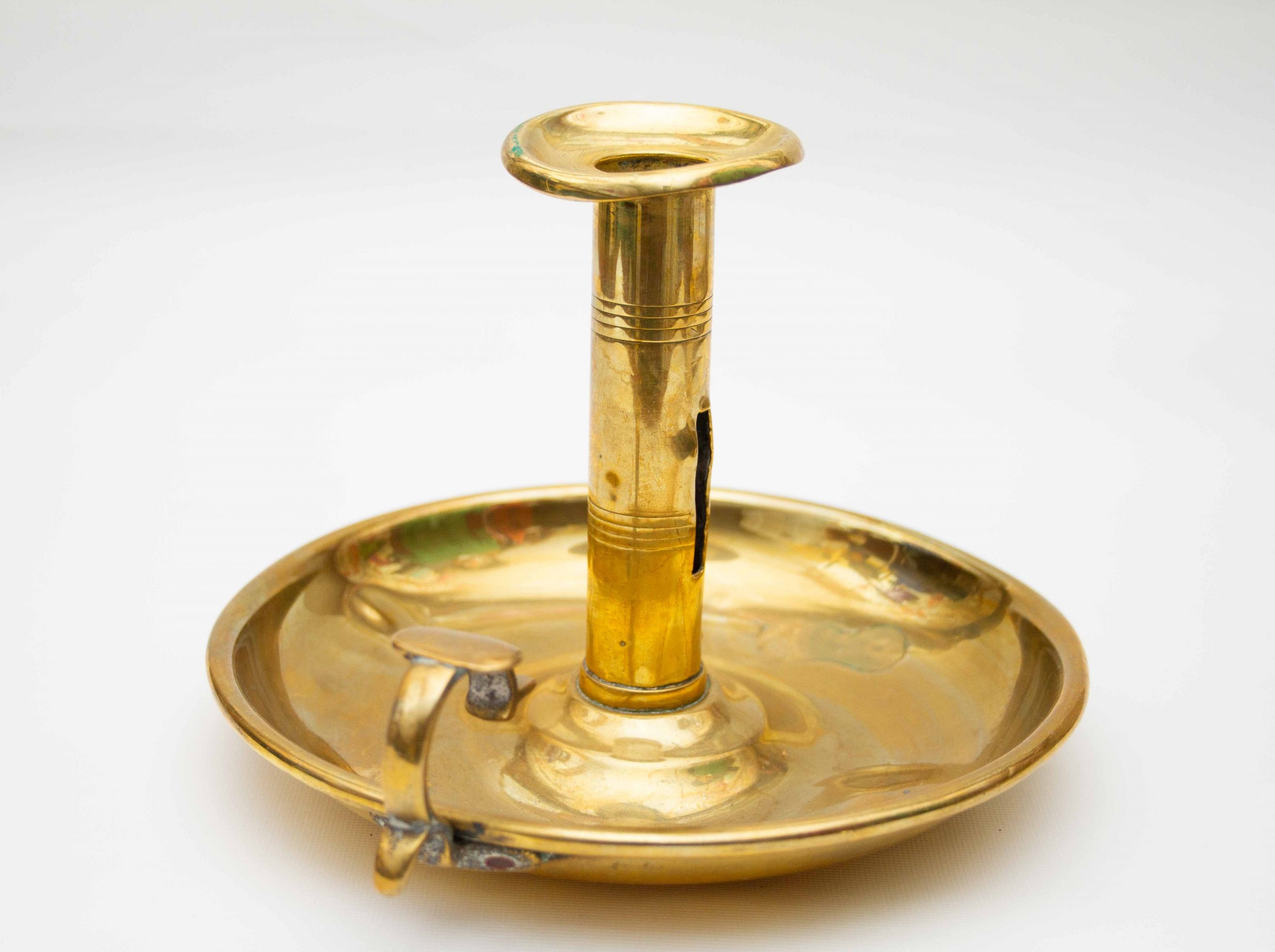A large vintage brass Wee Willie Winkie style candlestick, chamberstick, candle holder, candle push up lever is missing.
