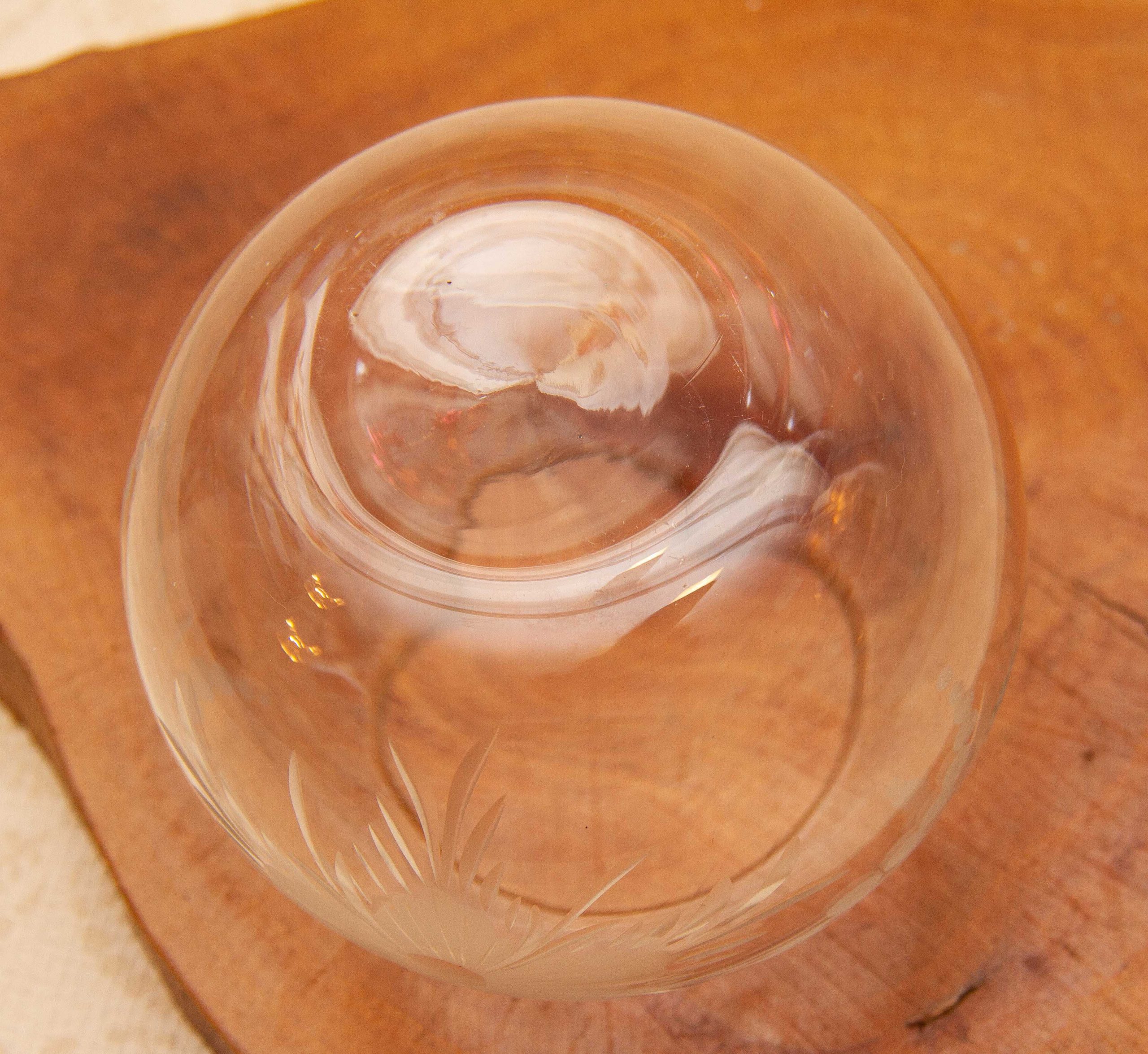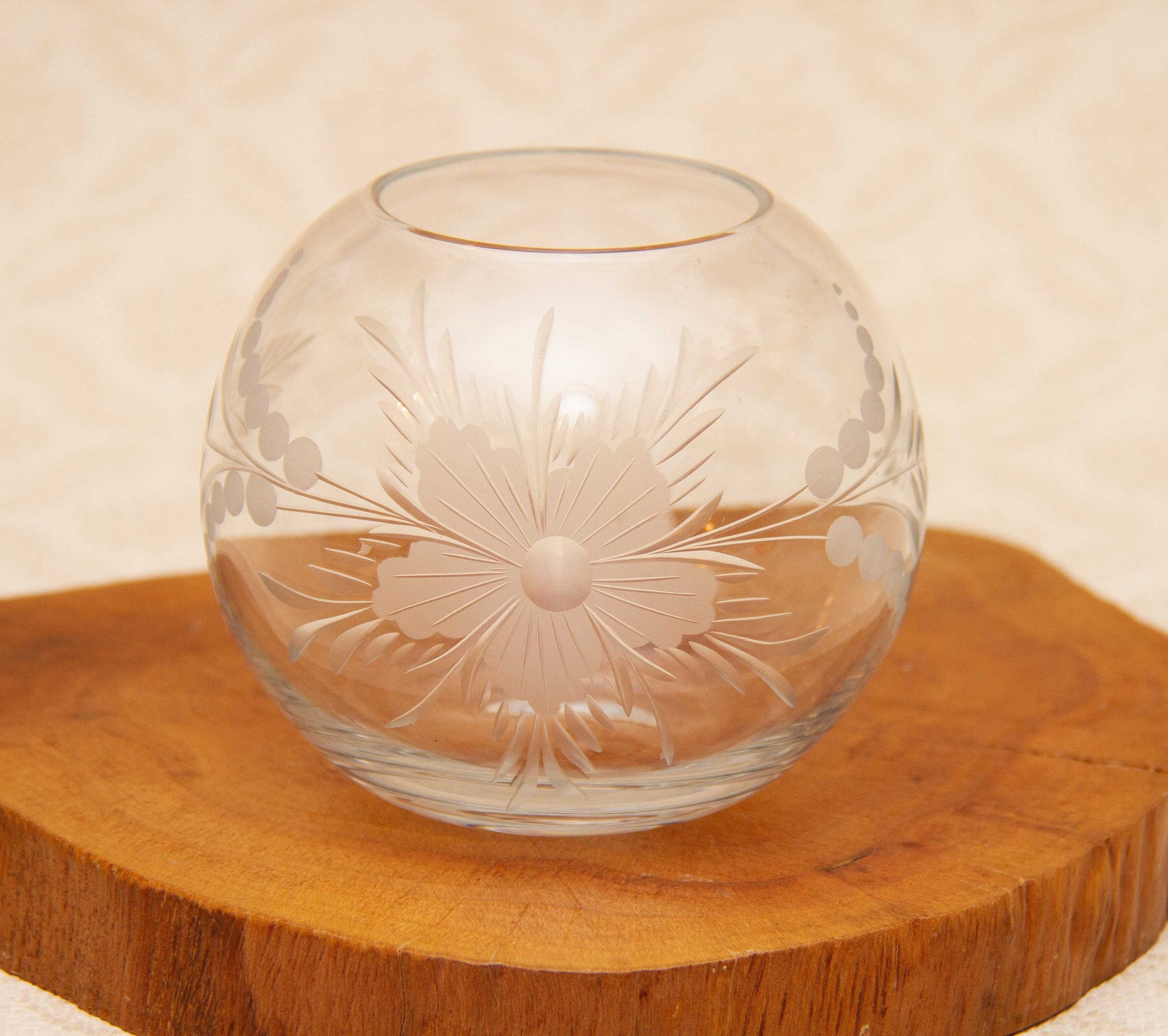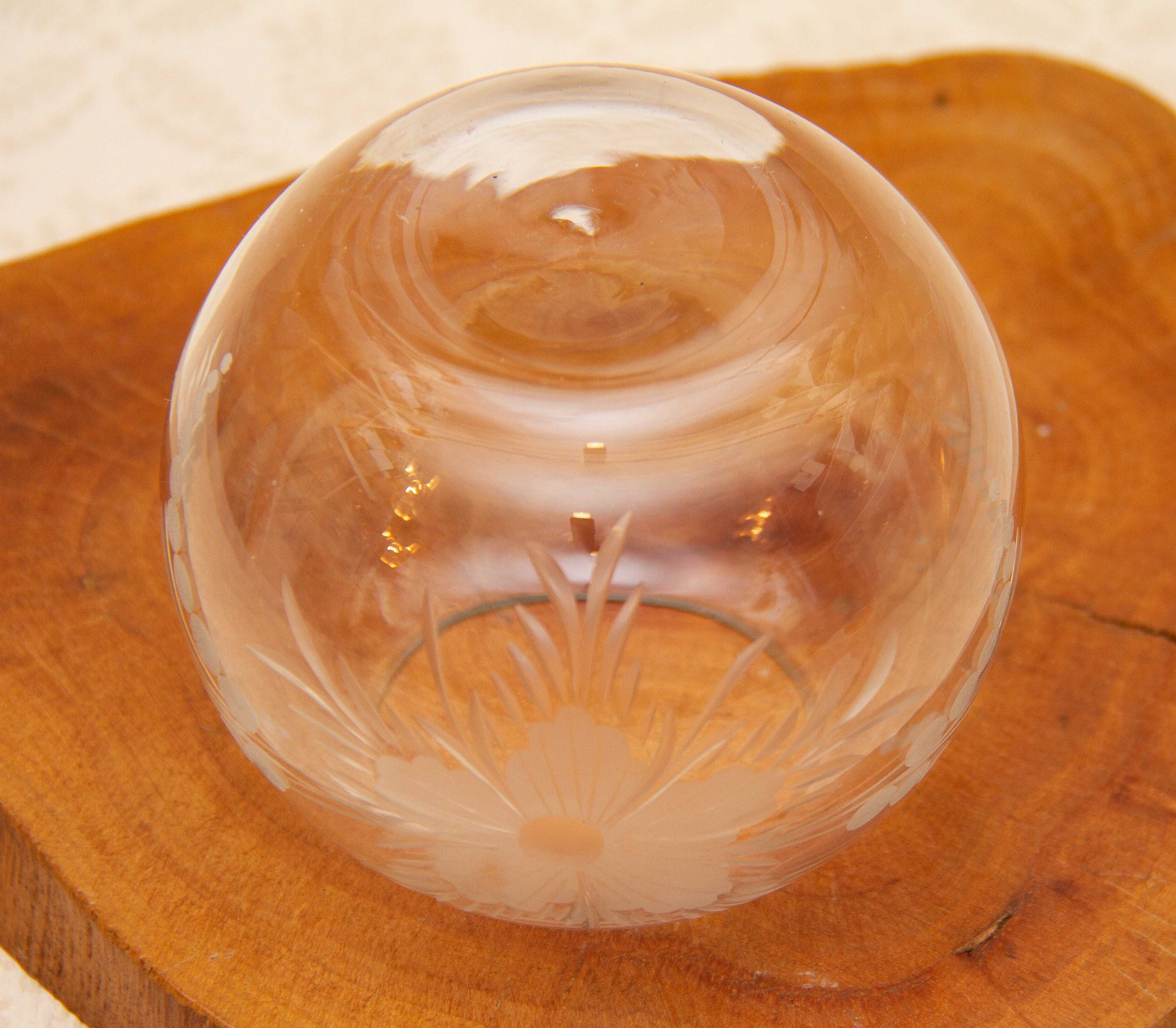 A large etched glass globe shape bowl with a flower design on. Suitable as a posy bowl or as a tea light candle holder.