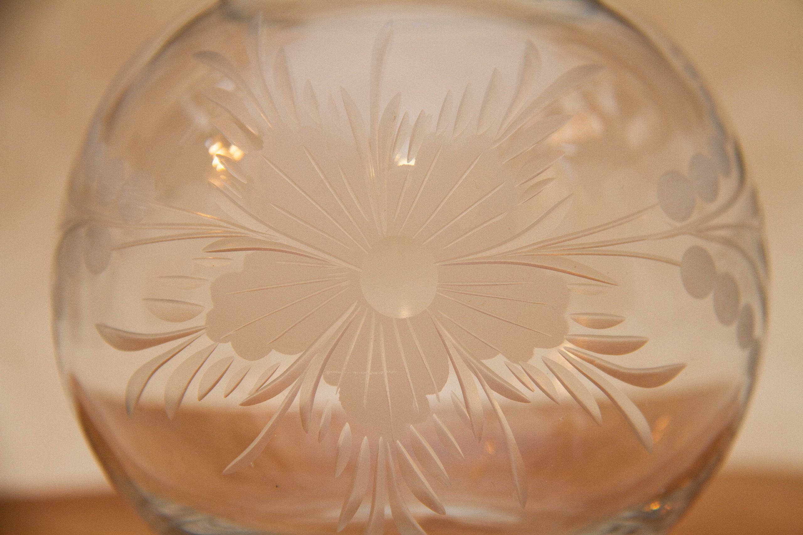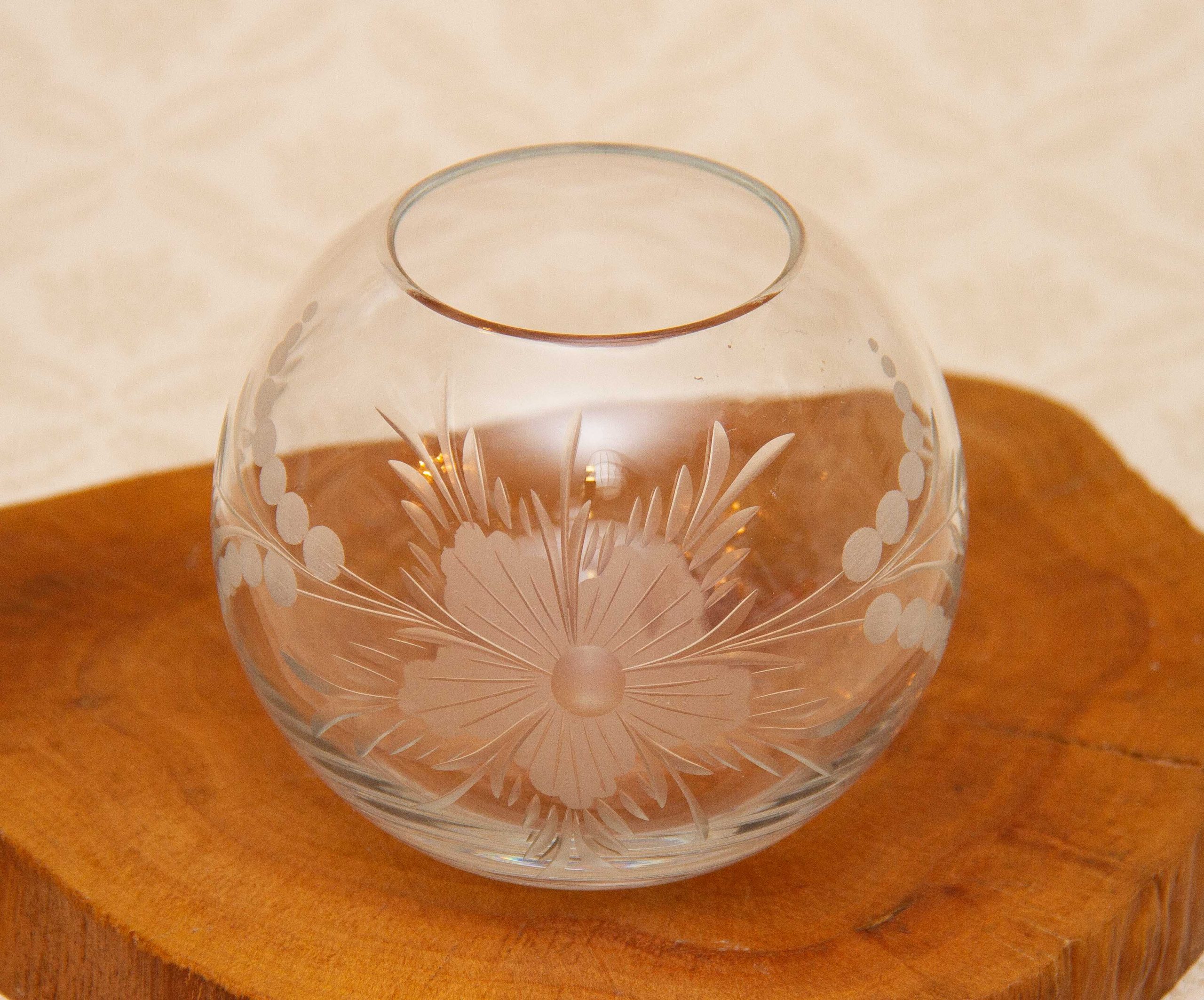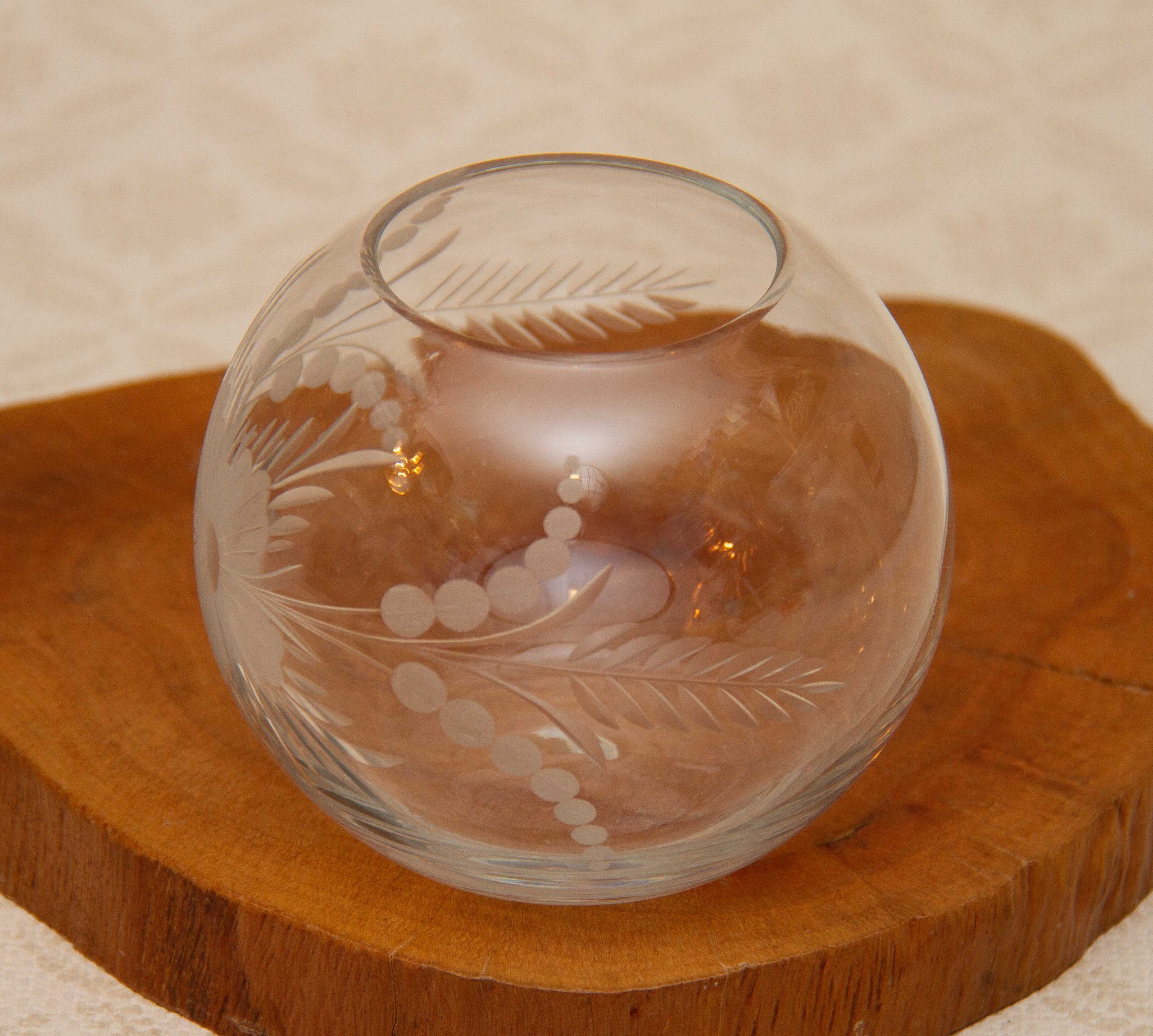A large etched glass globe shape bowl with a flower design on. Suitable as a posy bowl or as a tea light candle holder.