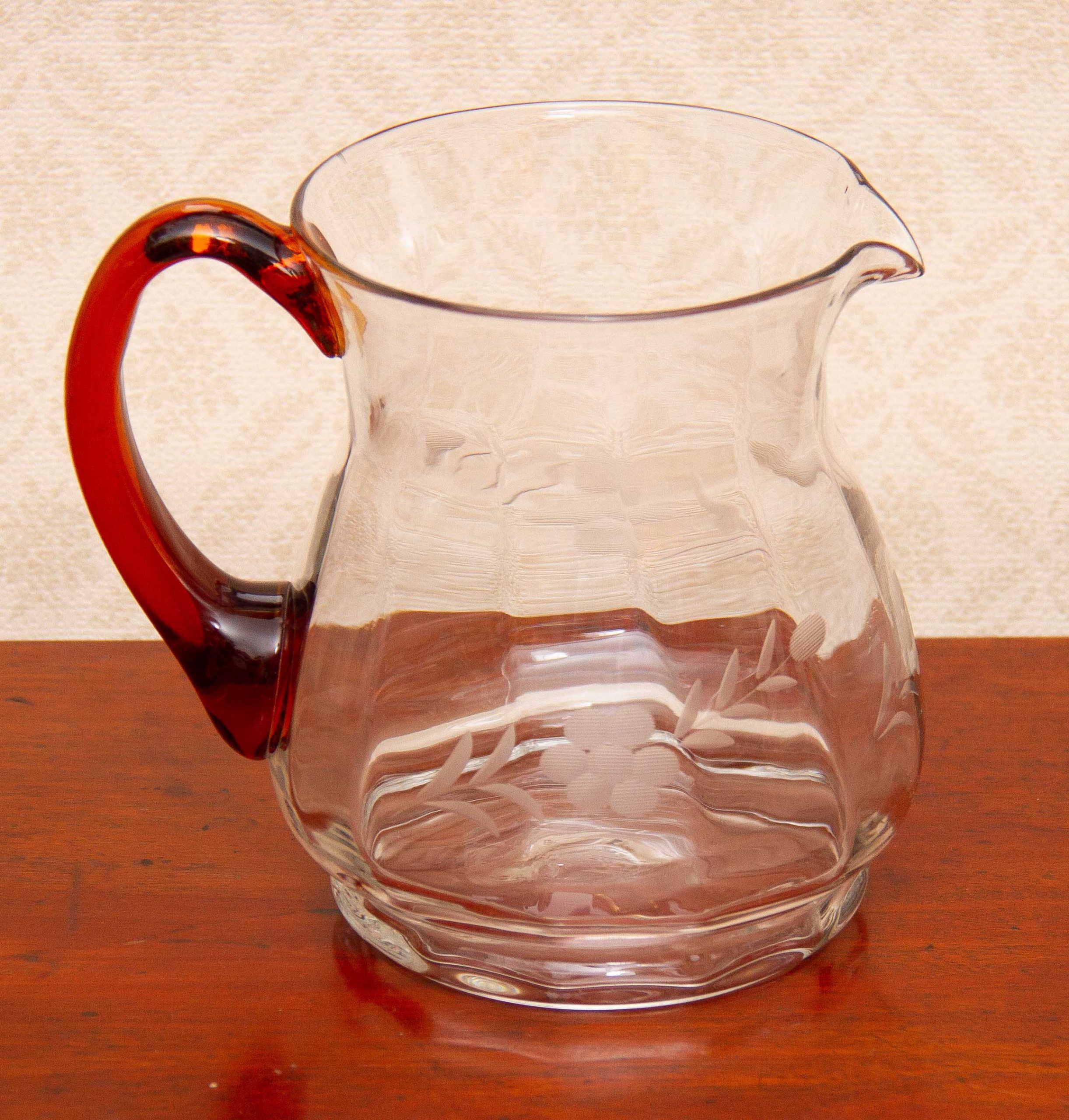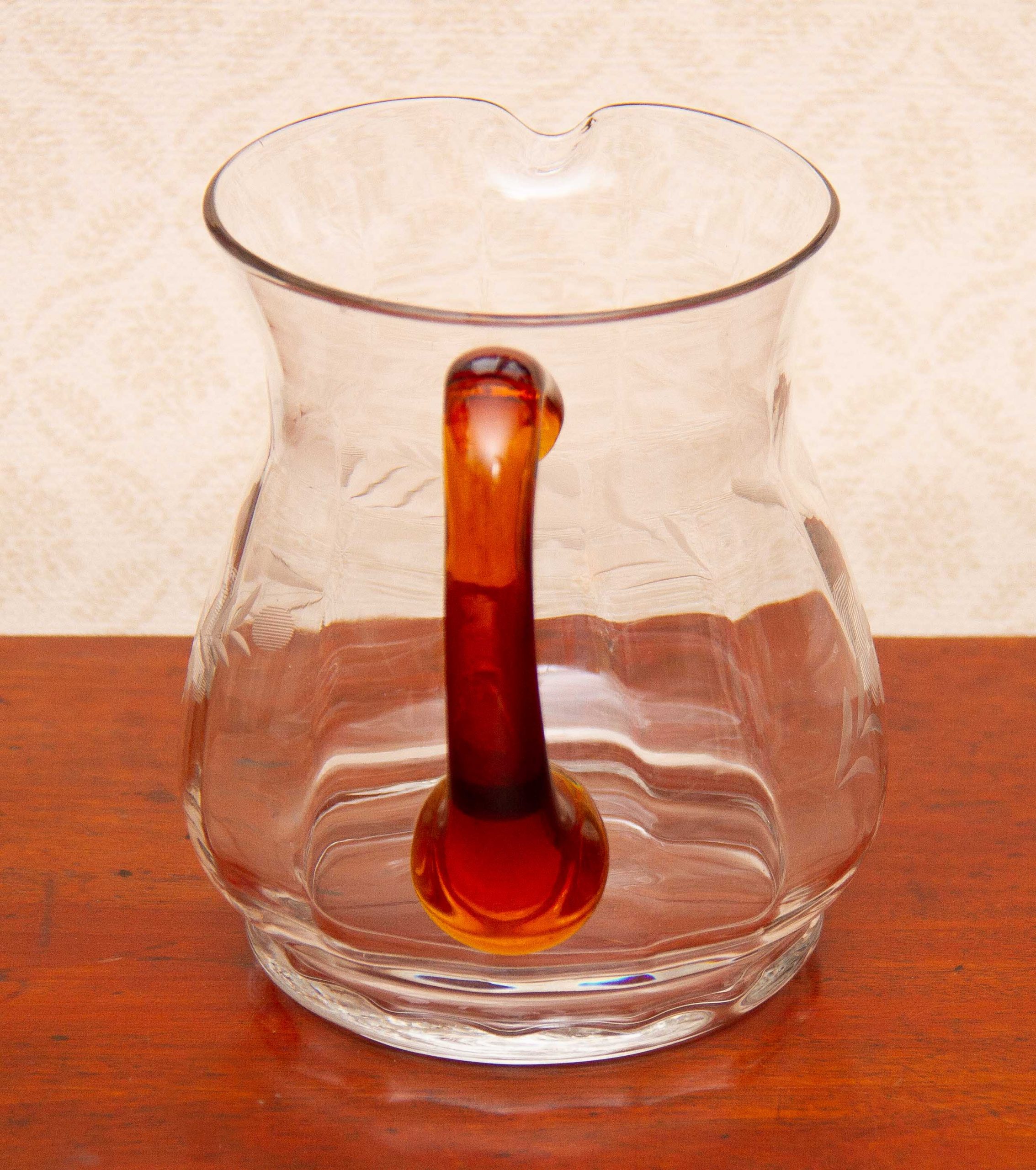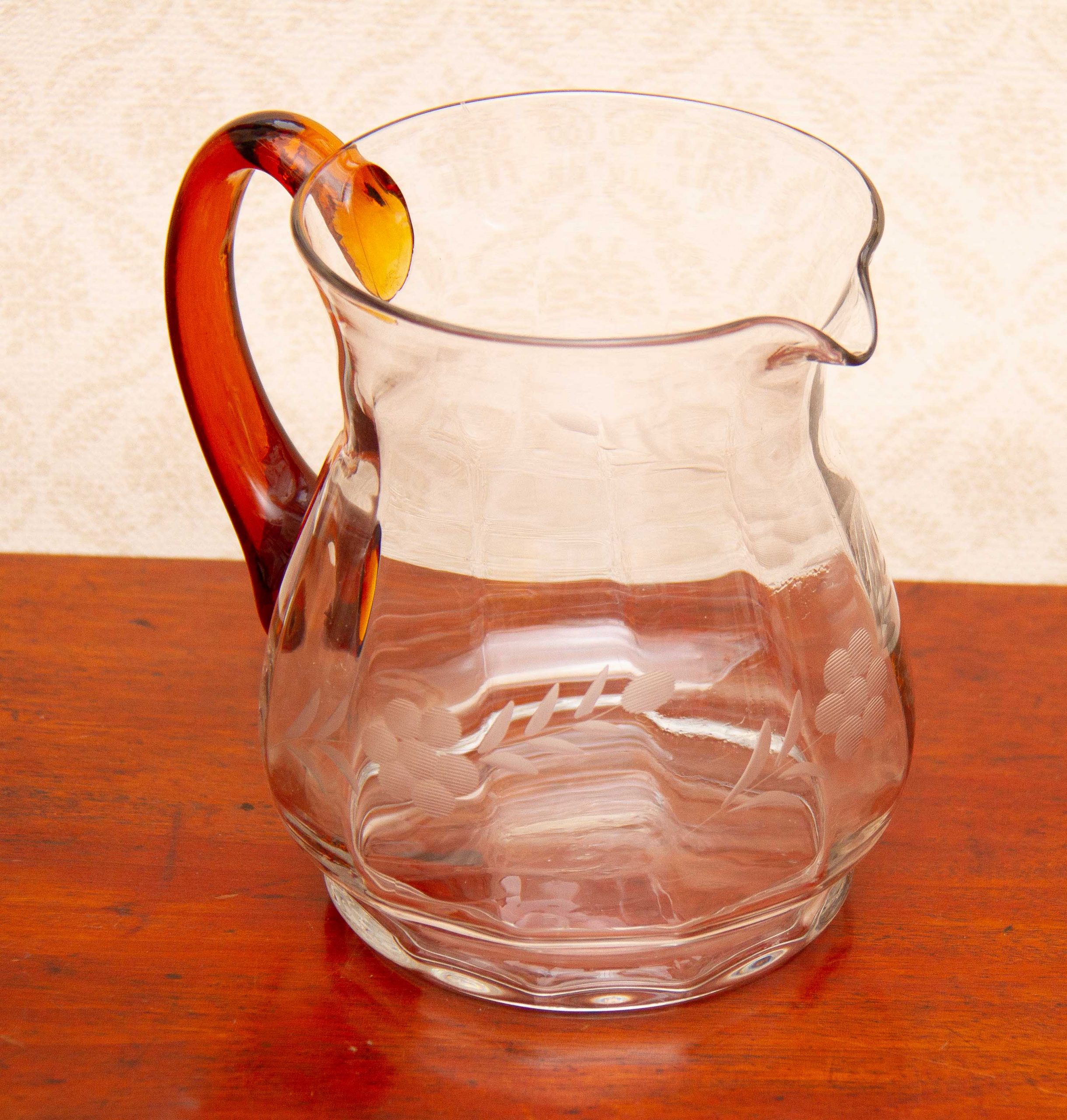 A large vintage glass jug with an amber glass handle and etched flower design
