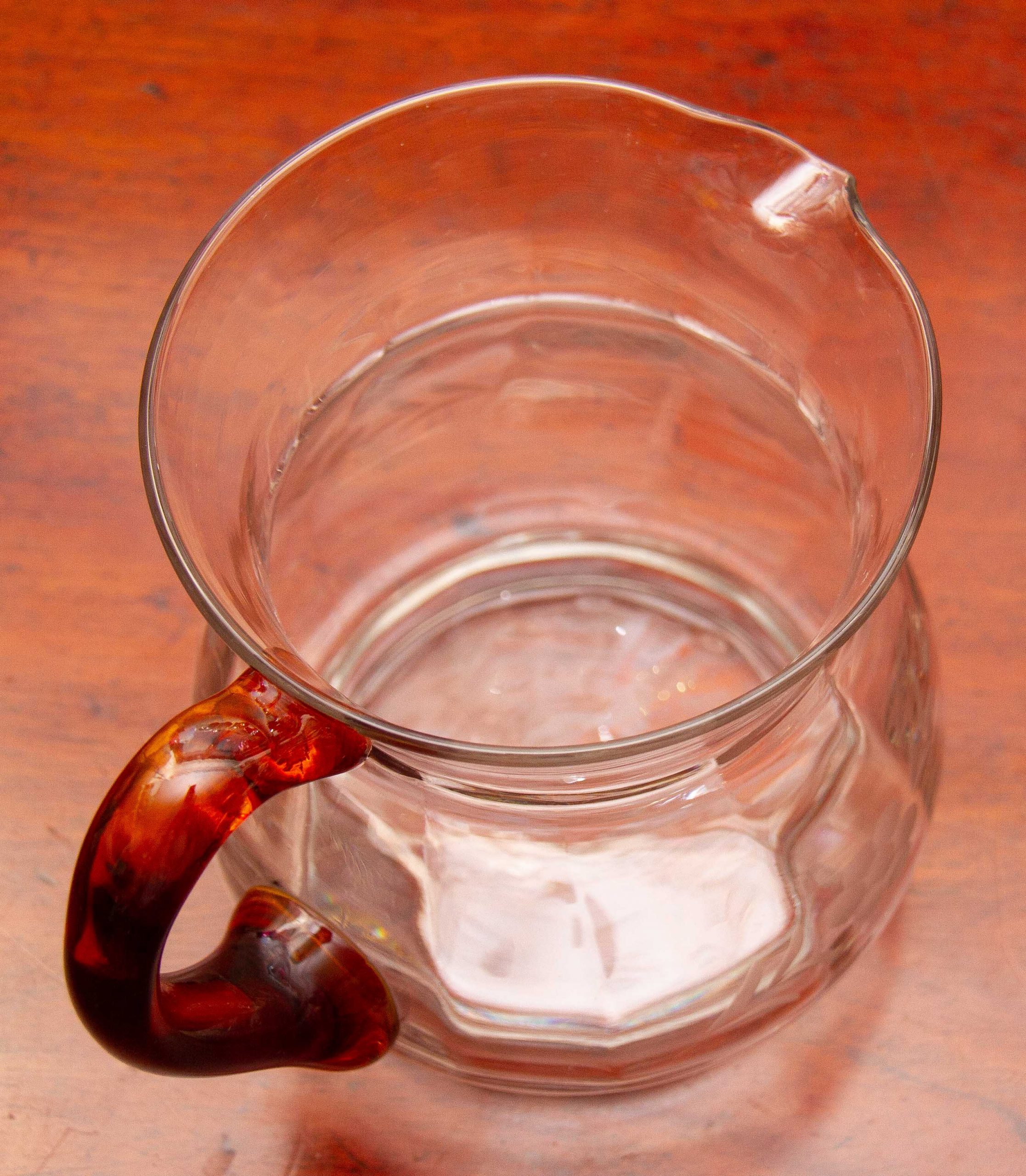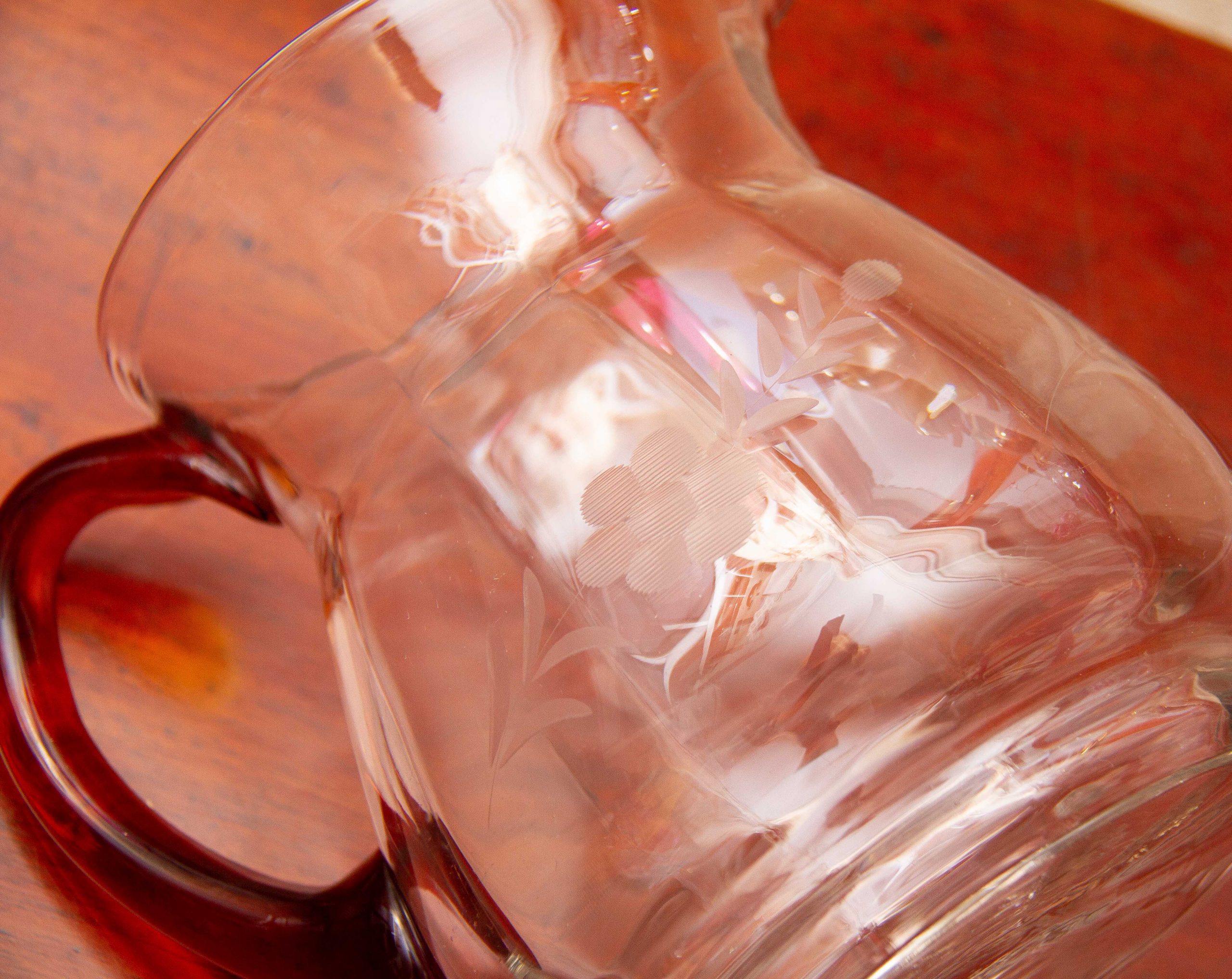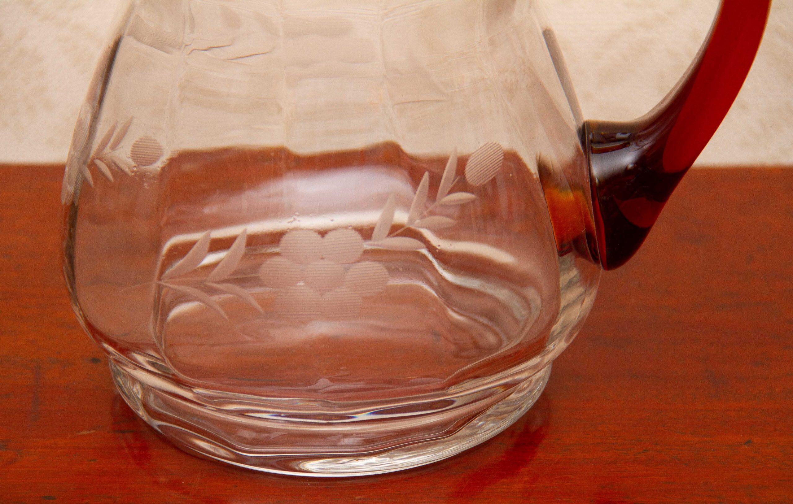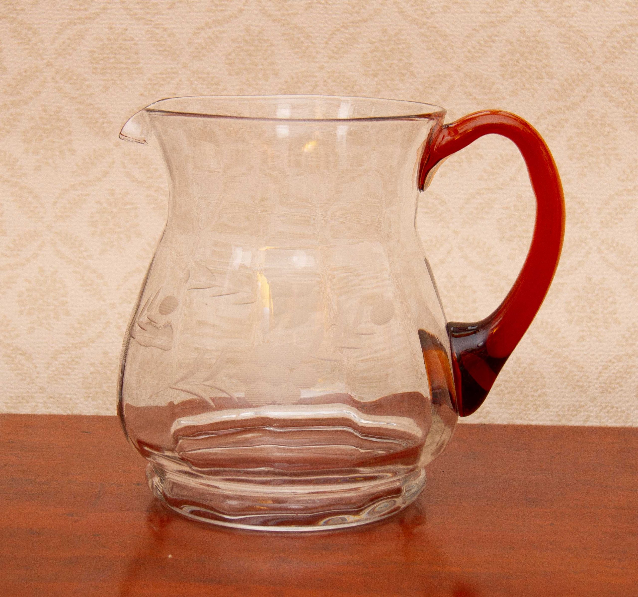 A large vintage glass jug with an amber glass handle and etched flower design