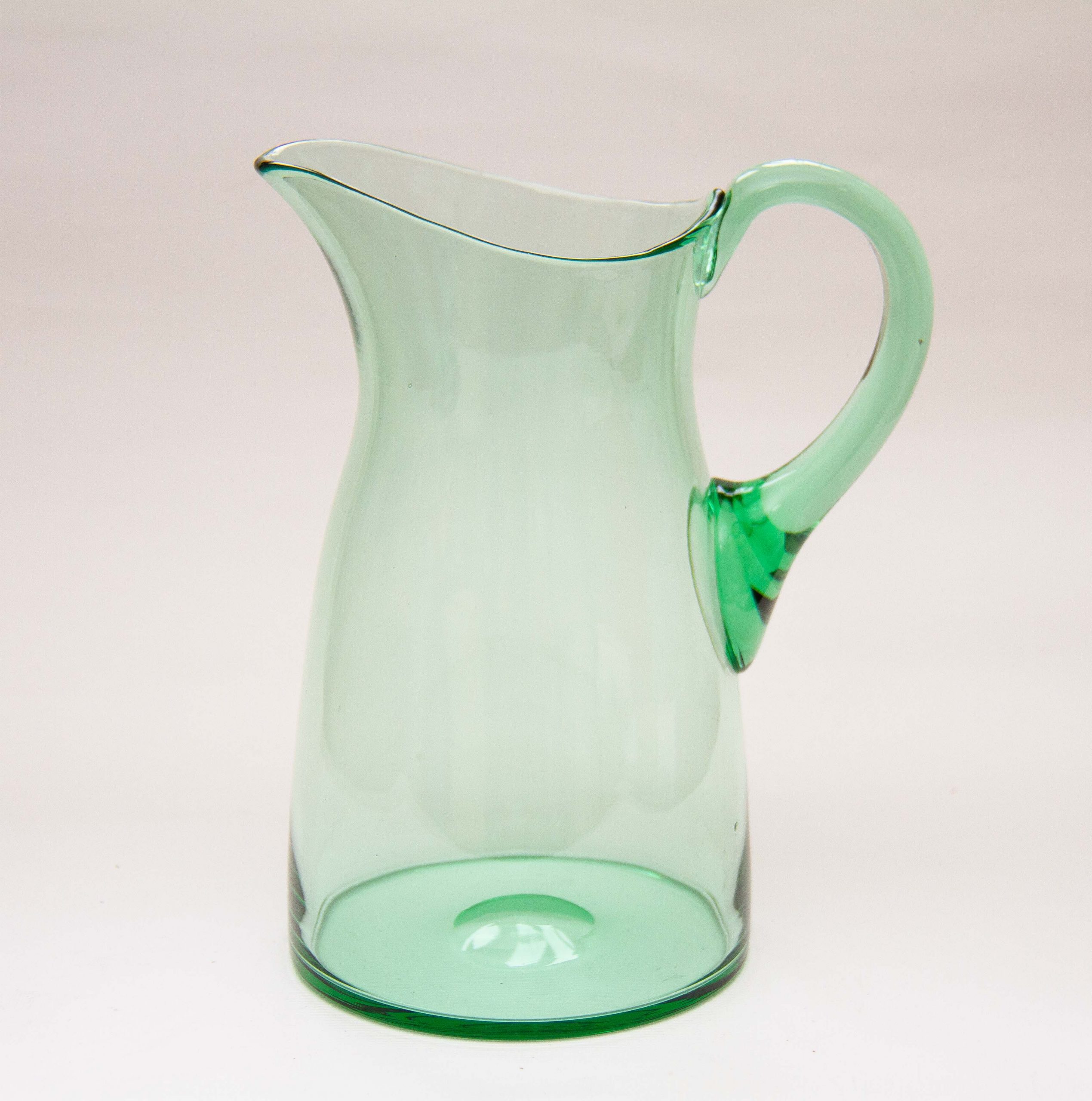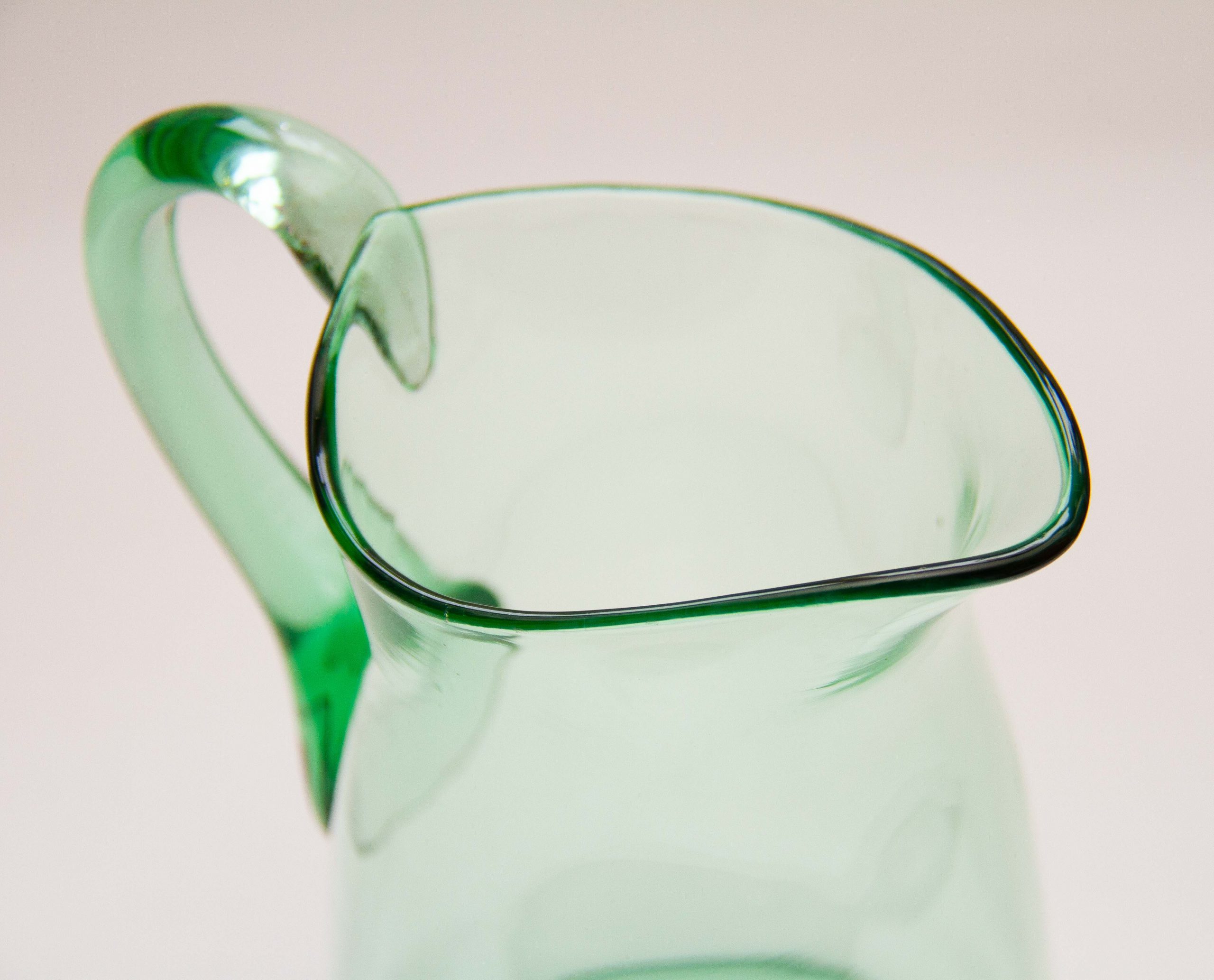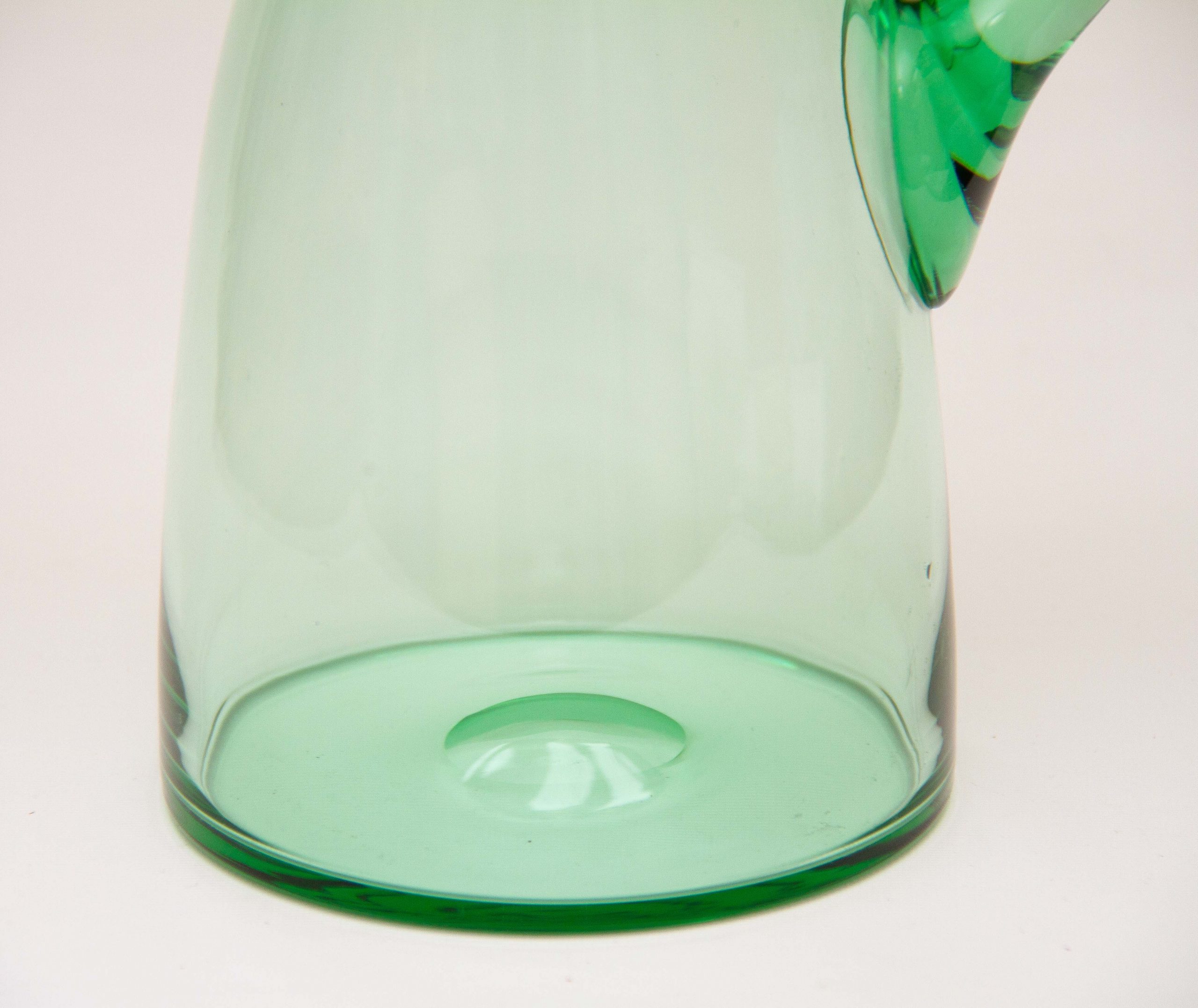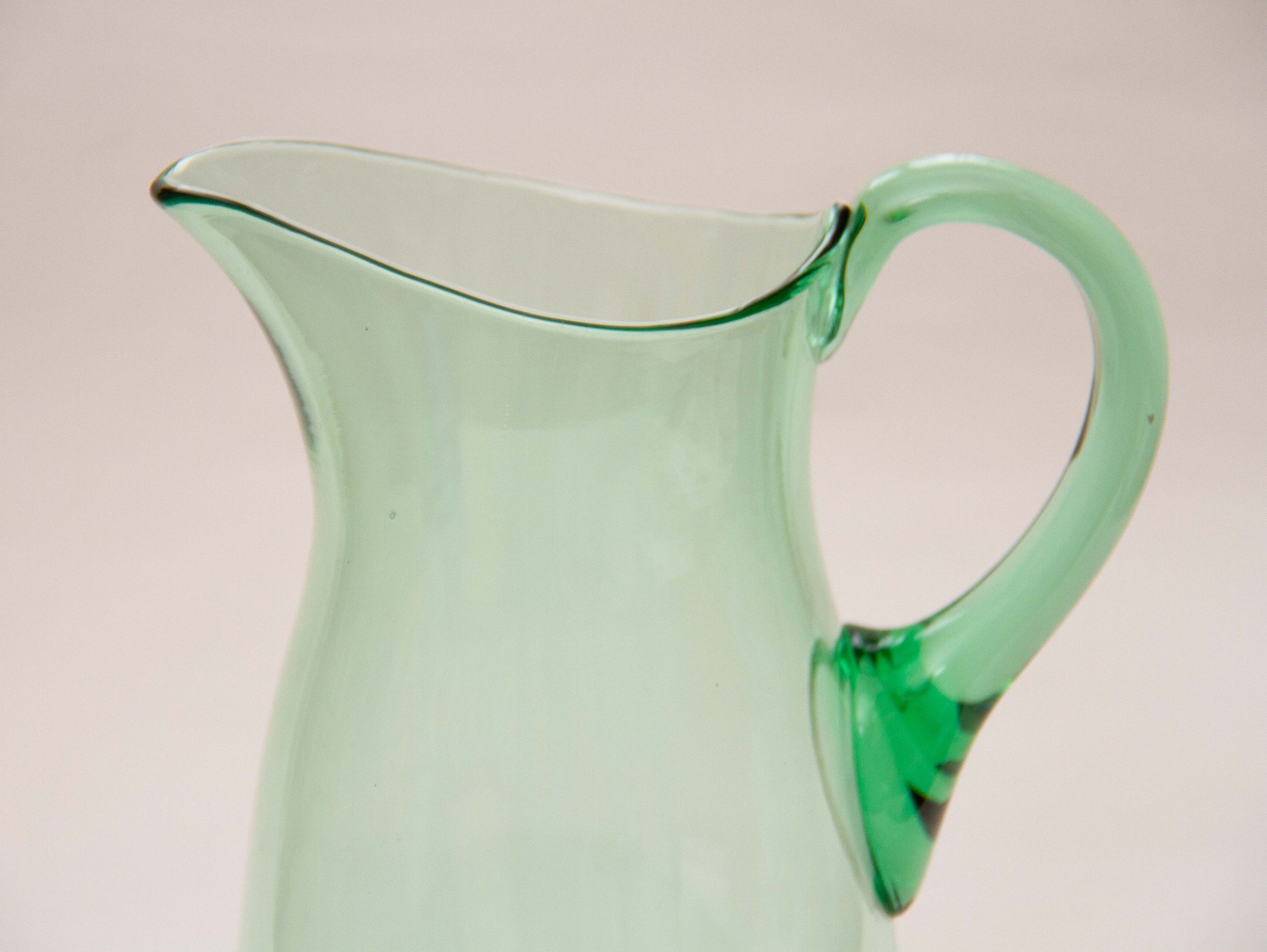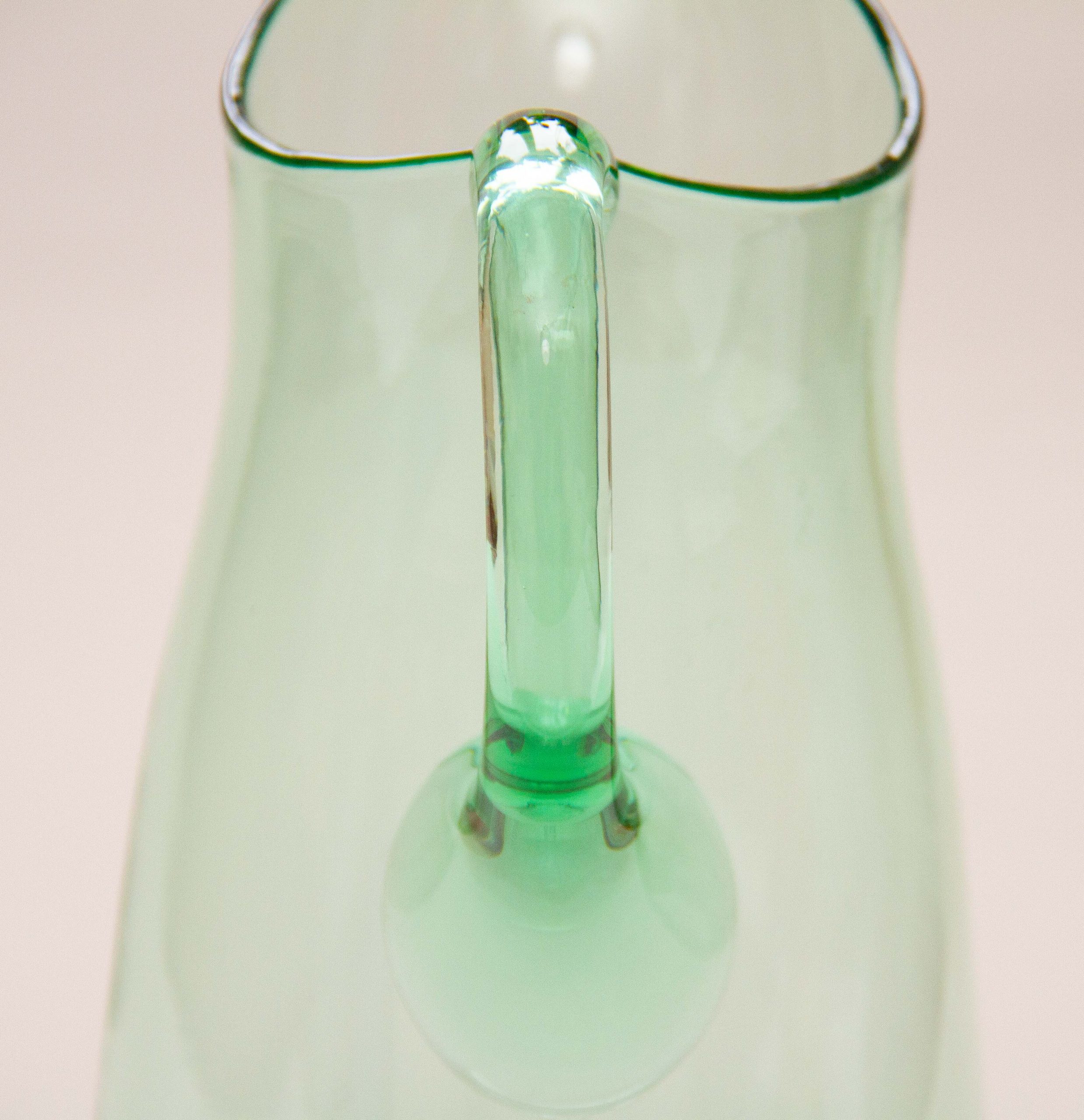A large vintage green glass water/lemonade jug pitcher with an applied glass handle. Also perfect for cocktails