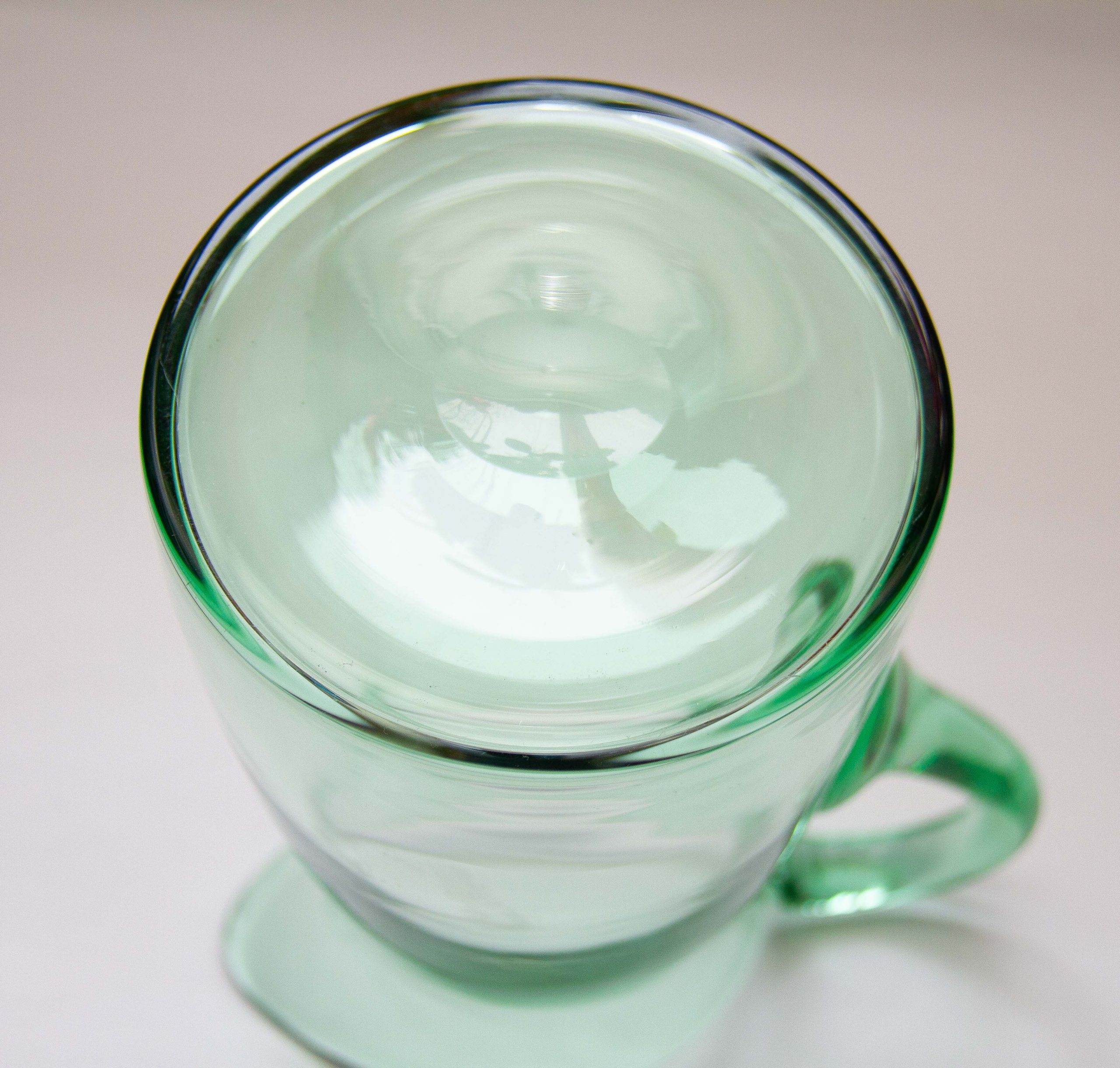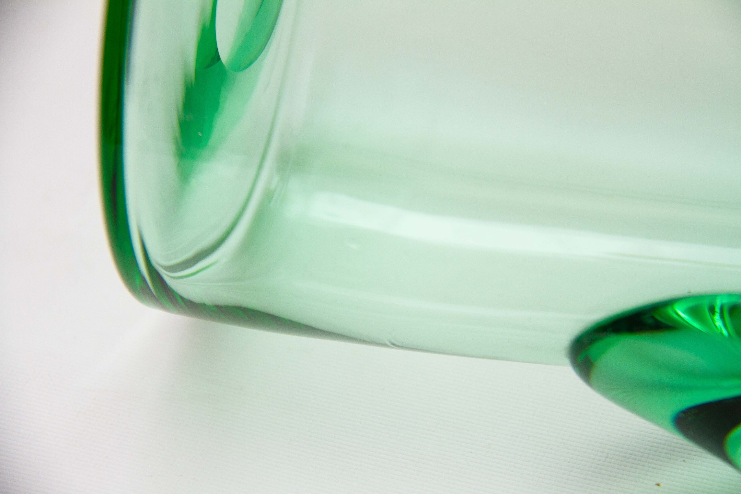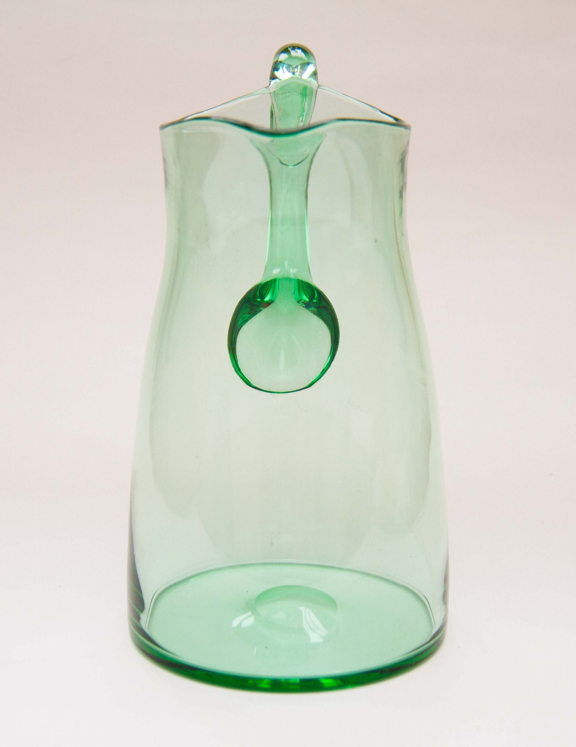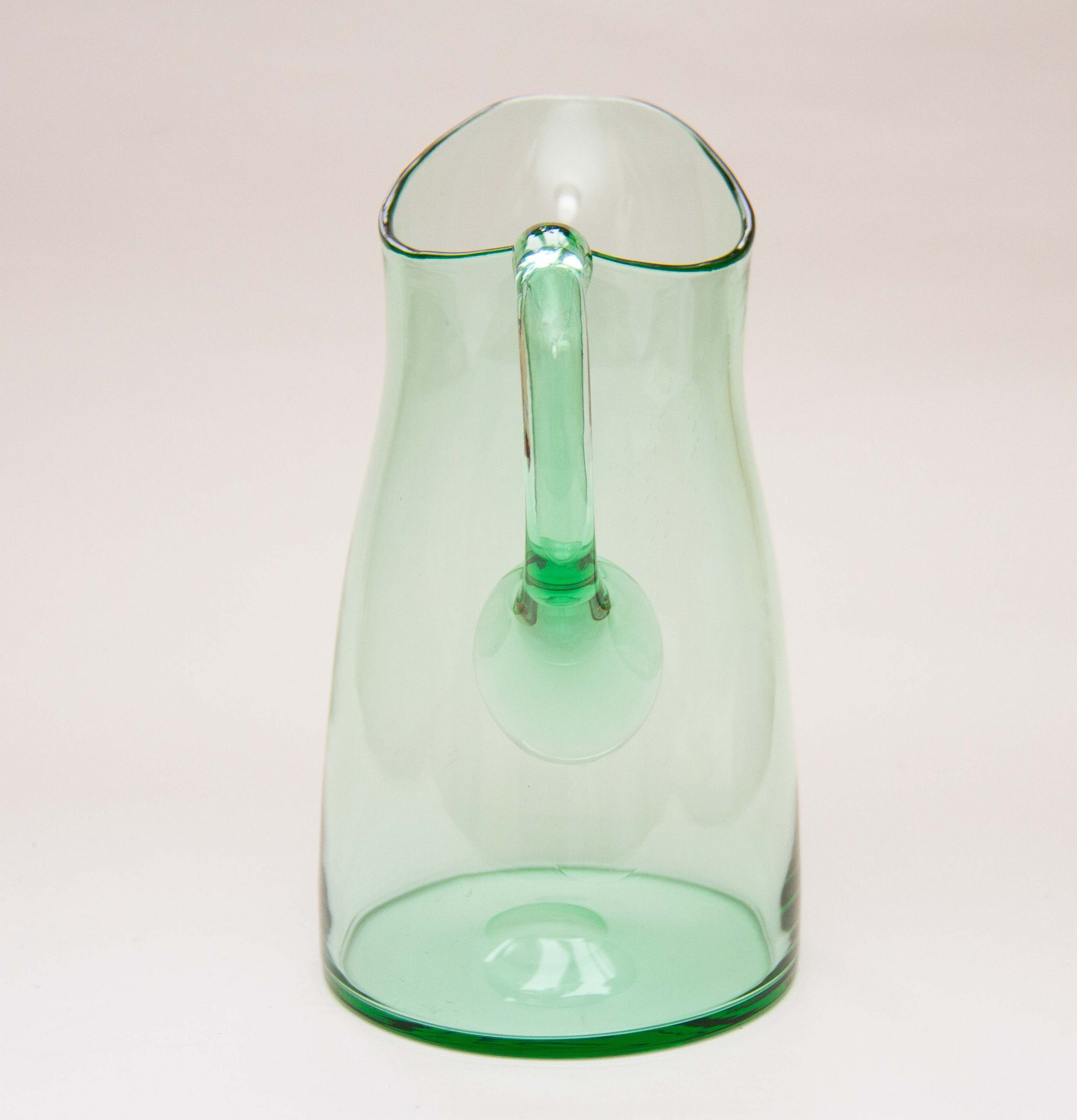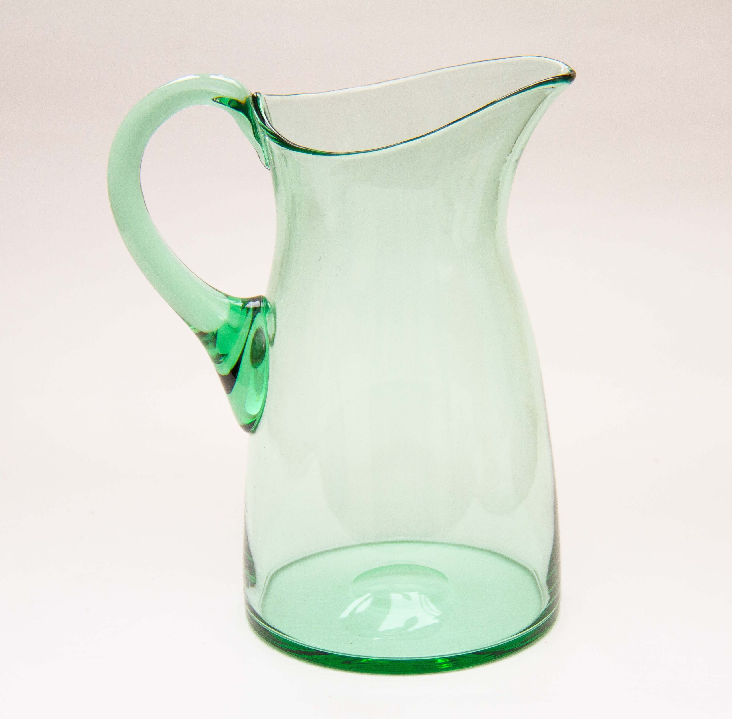 A large vintage green glass water/lemonade jug pitcher with an applied glass handle. Also perfect for cocktails