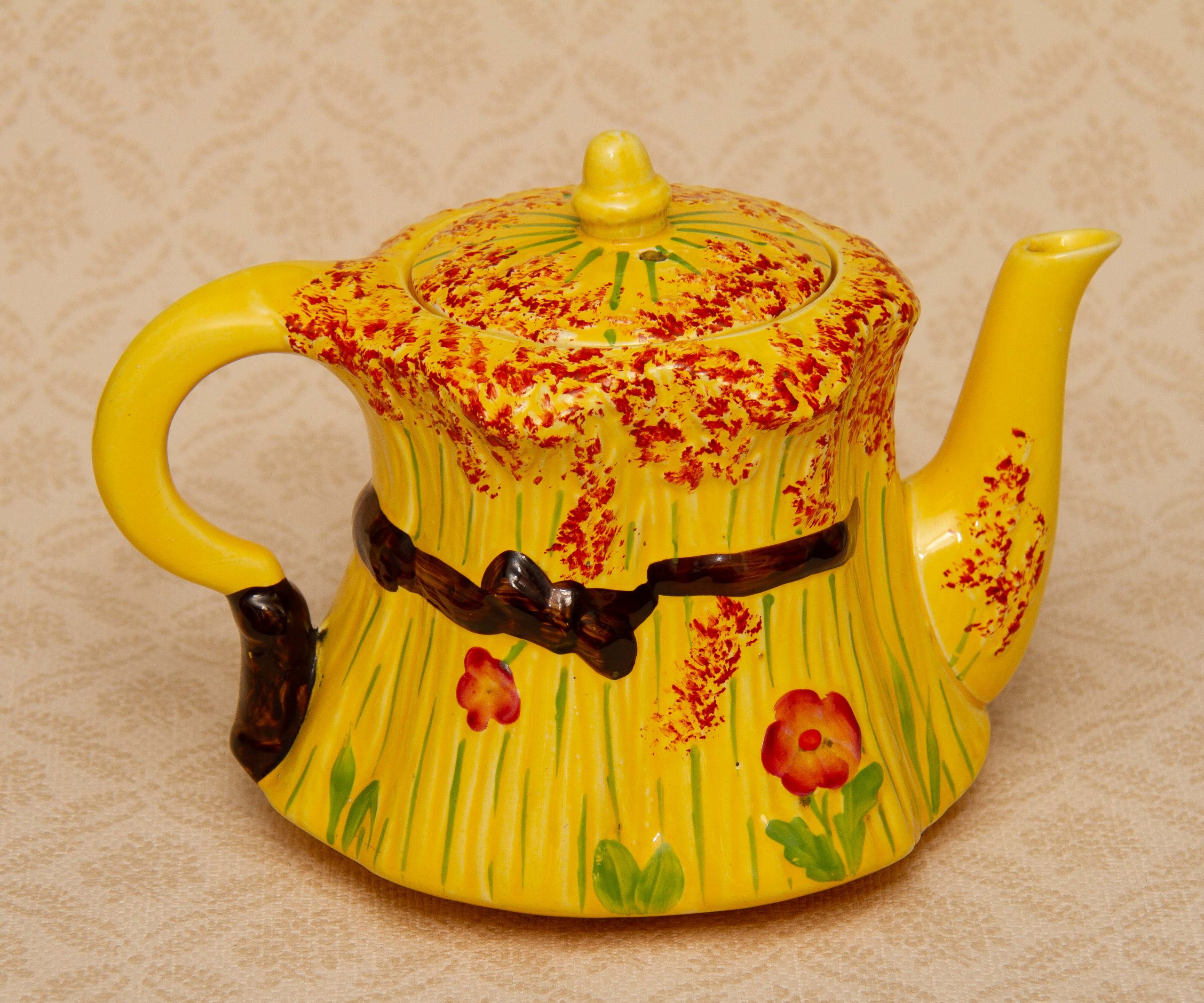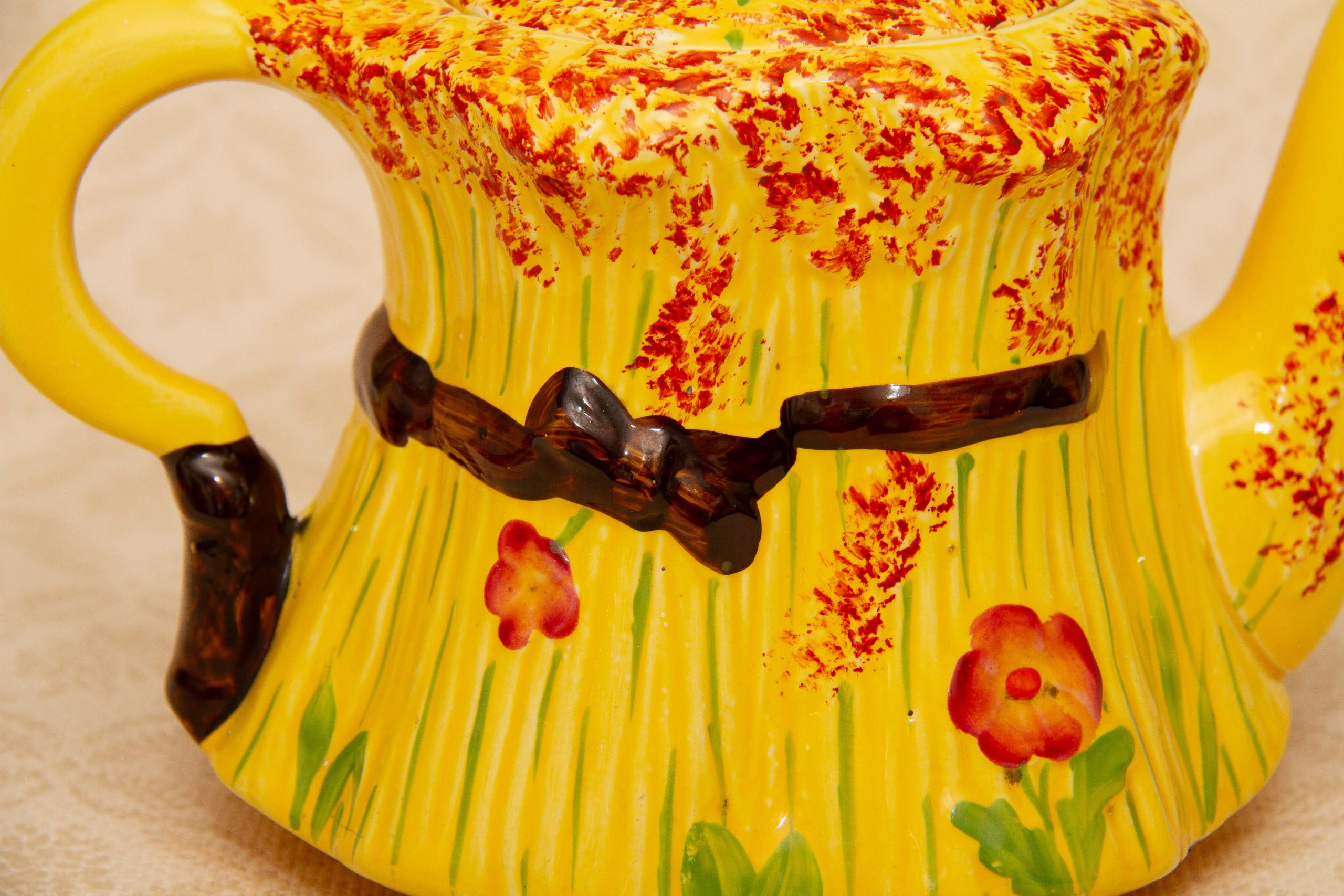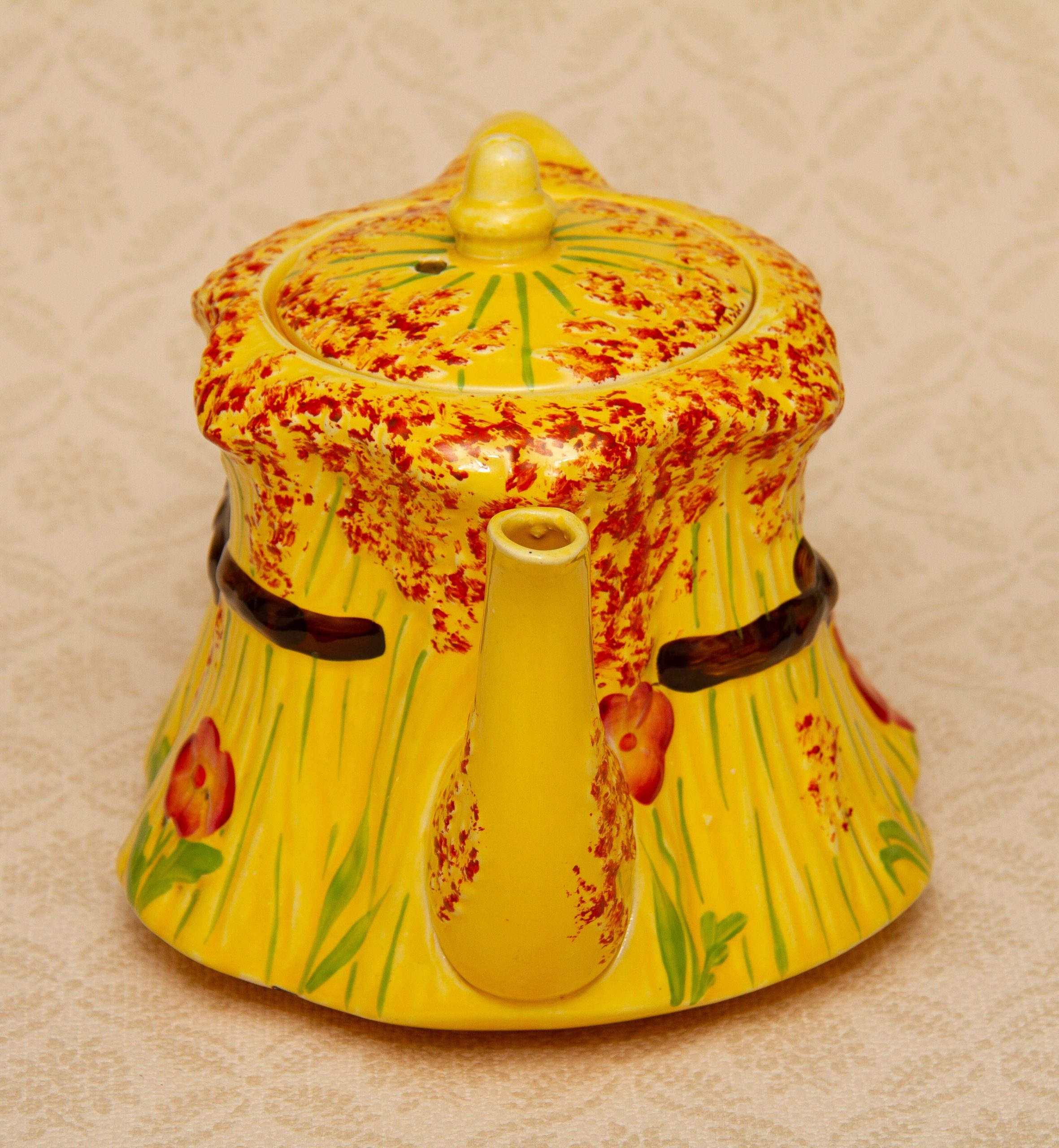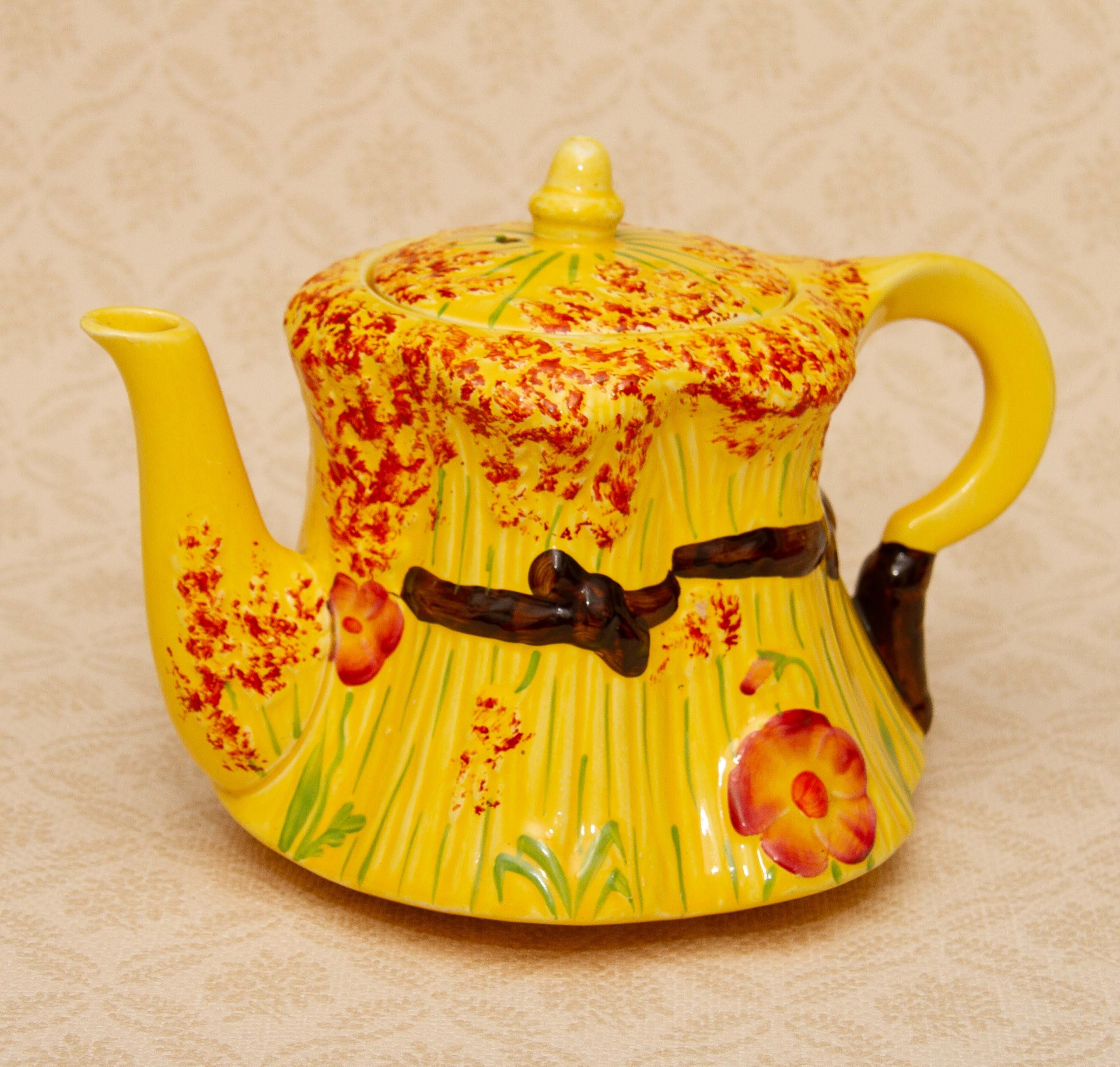 A rare large yellow vintage teapot in a novelty design of a bale of hay/straw tied in the middle, hand painted with poppies and a scythe as the handle. Impressed England on the base, and marked 207 A, but no manufacturer mark. There were several of the Staffordshire potteries producing novelty teapots, such as Arthur Wood, Royal Winton, Burleighware, Beswick. Probably dating from the 1930’s.