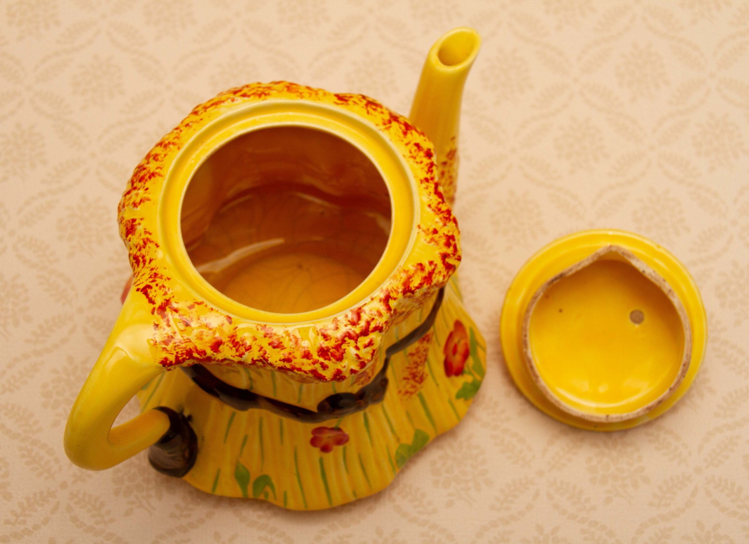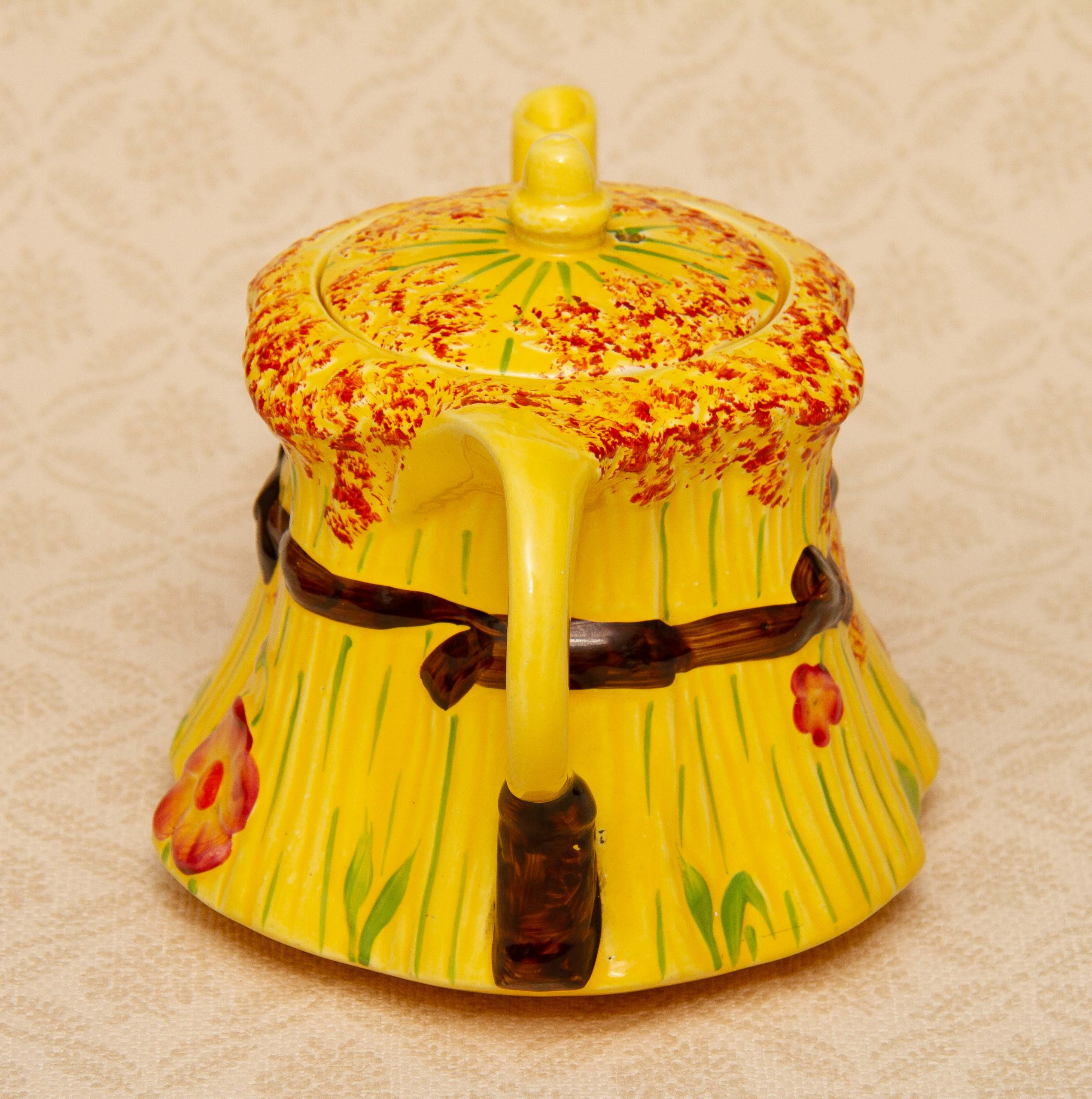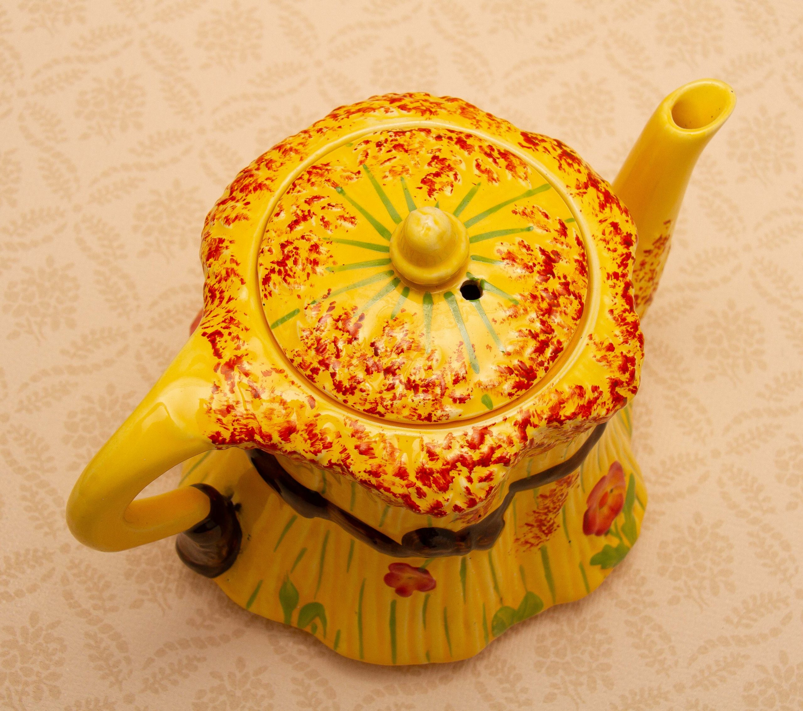 A rare large yellow vintage teapot in a novelty design of a bale of hay/straw tied in the middle, hand painted with poppies and a scythe as the handle. Impressed England on the base, and marked 207 A, but no manufacturer mark. There were several of the Staffordshire potteries producing novelty teapots, such as Arthur Wood, Royal Winton, Burleighware, Beswick. Probably dating from the 1930’s.