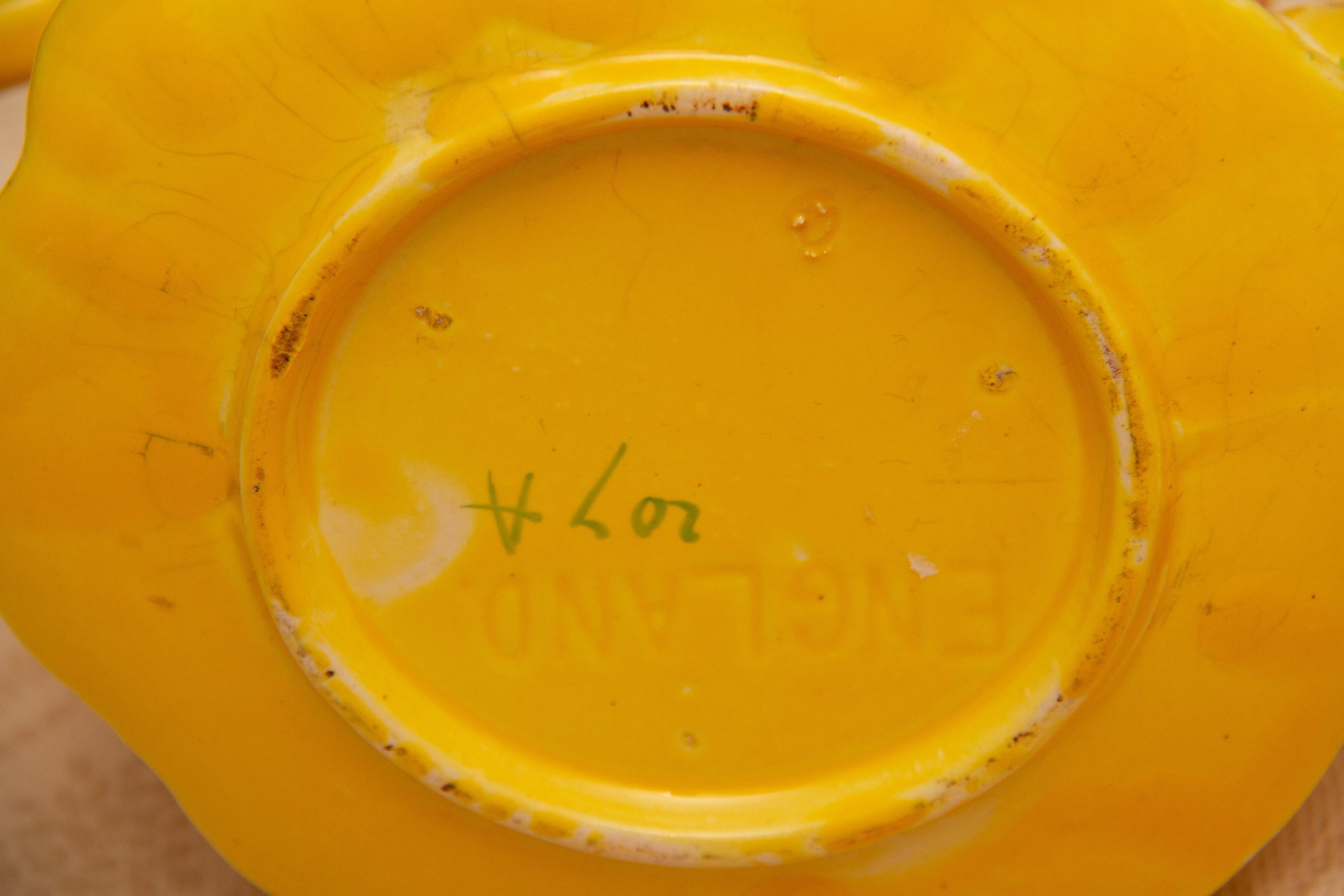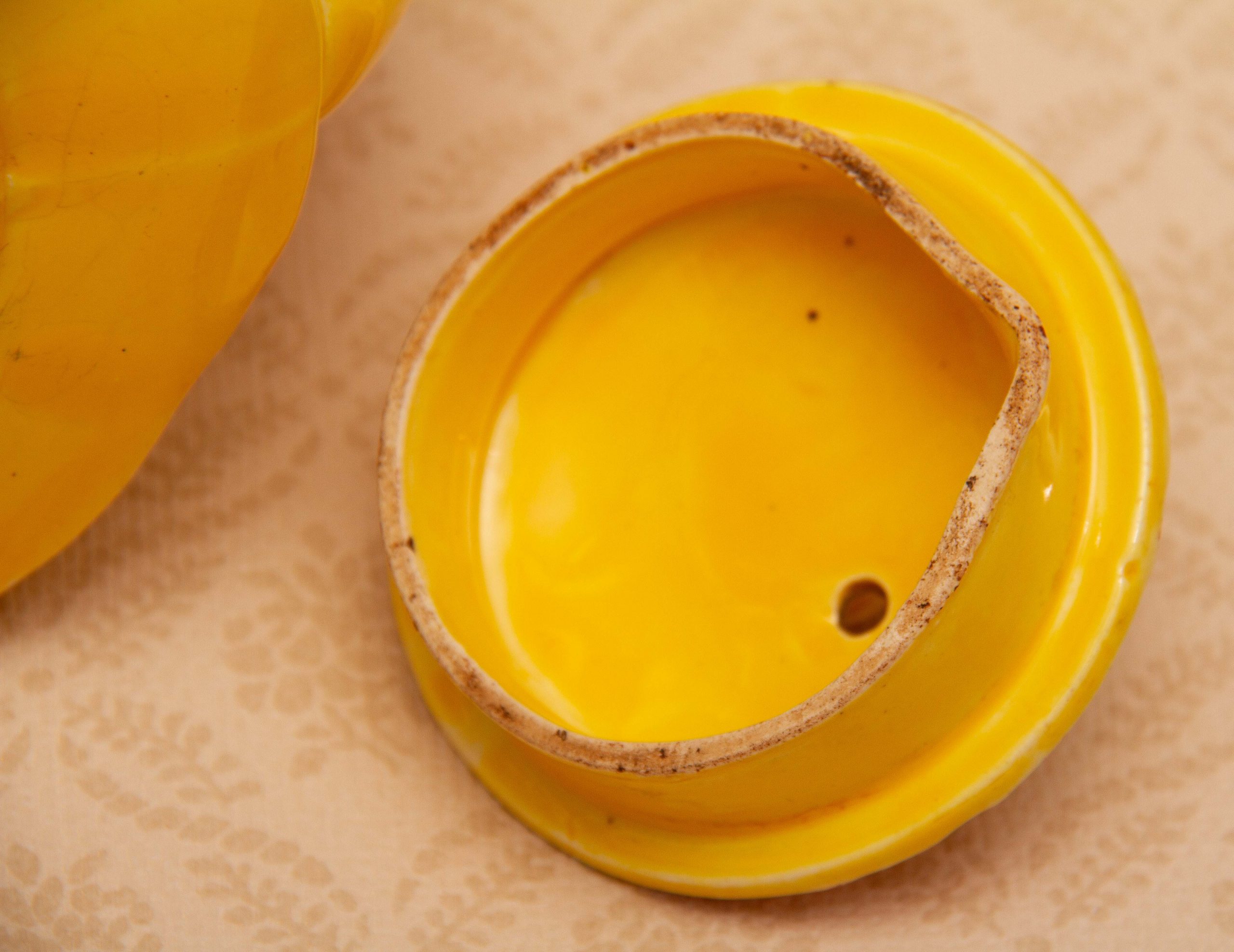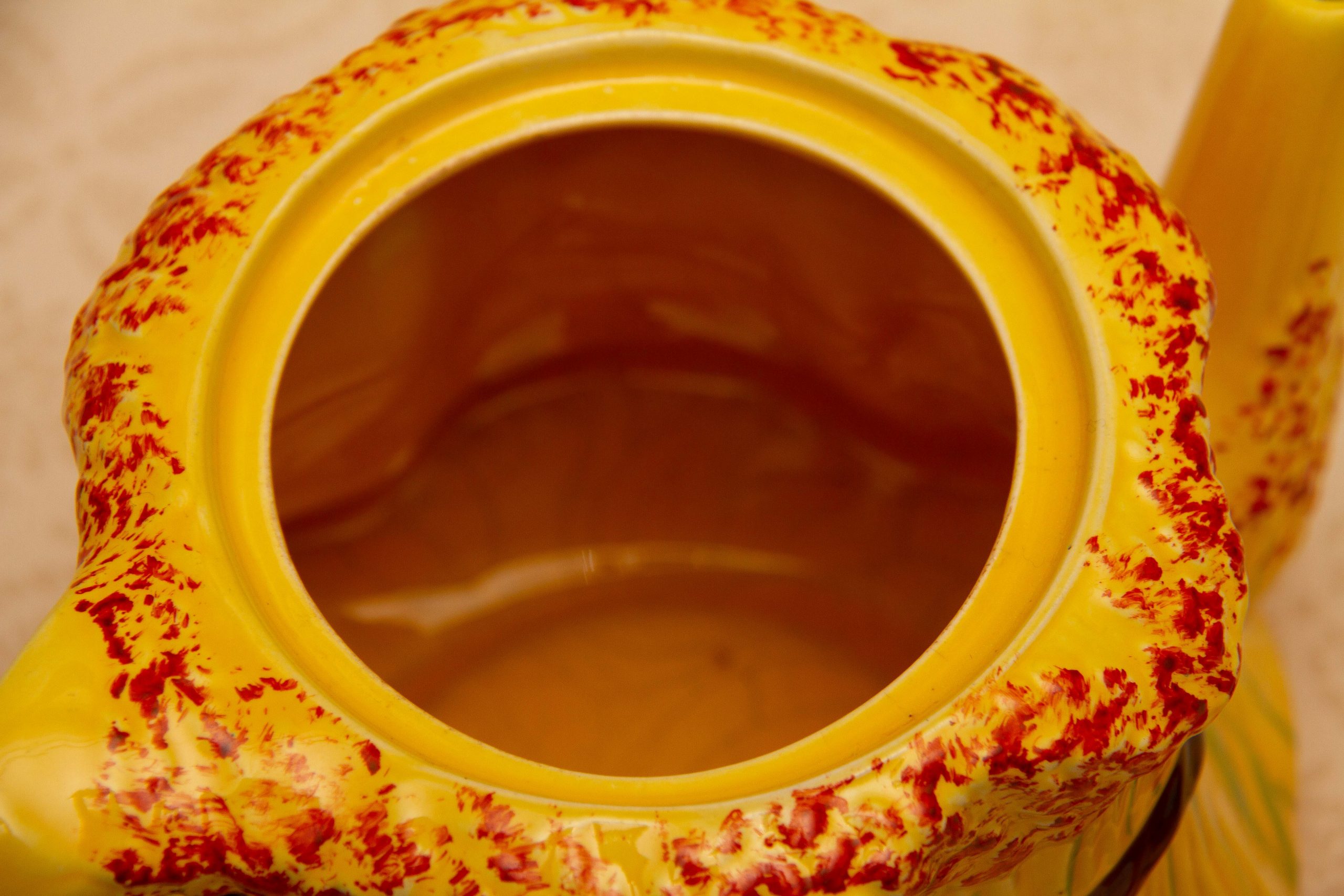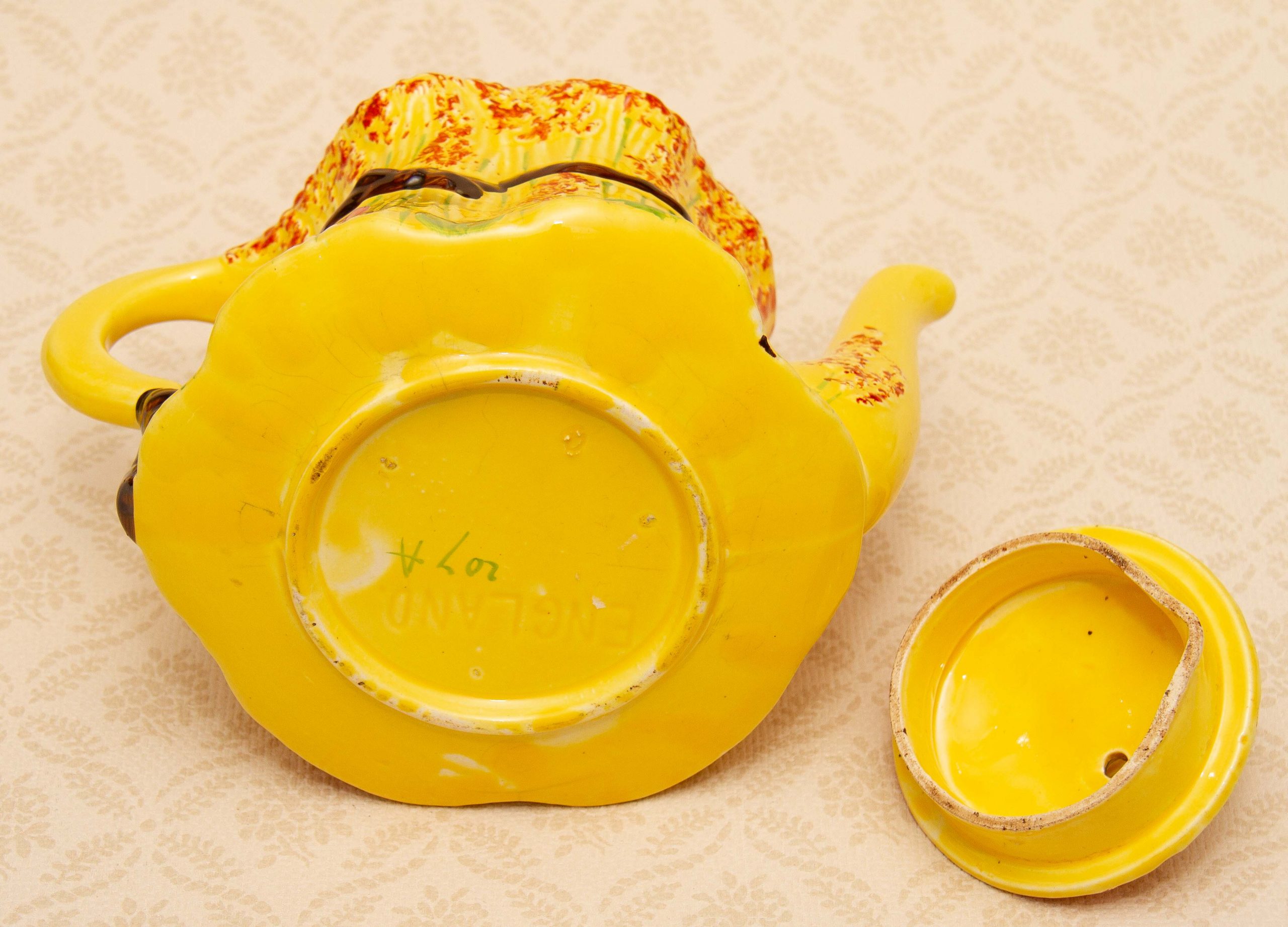 A rare large yellow vintage teapot in a novelty design of a bale of hay/straw tied in the middle, hand painted with poppies and a scythe as the handle. Impressed England on the base, and marked 207 A, but no manufacturer mark. There were several of the Staffordshire potteries producing novelty teapots, such as Arthur Wood, Royal Winton, Burleighware, Beswick. Probably dating from the 1930’s.