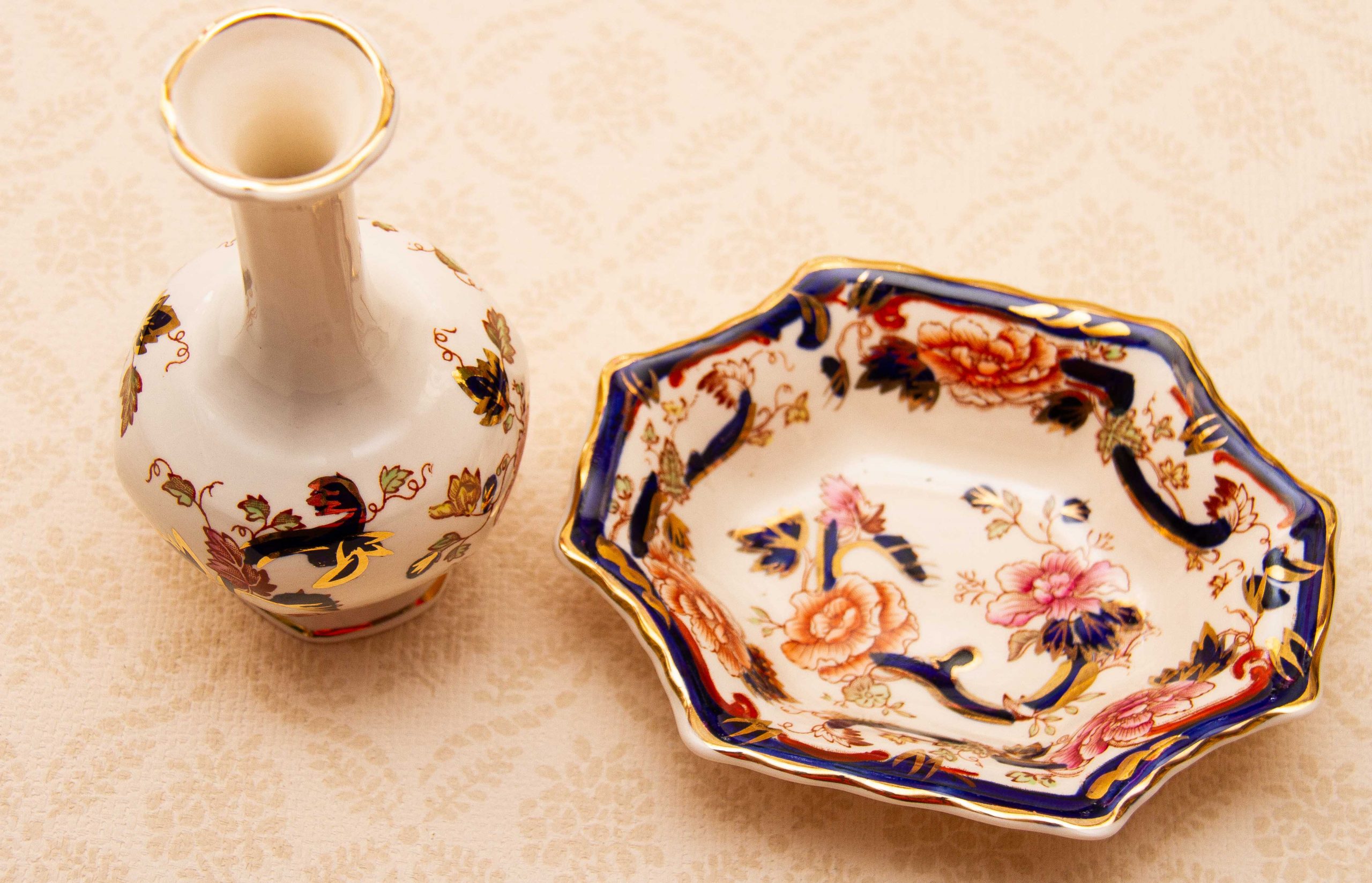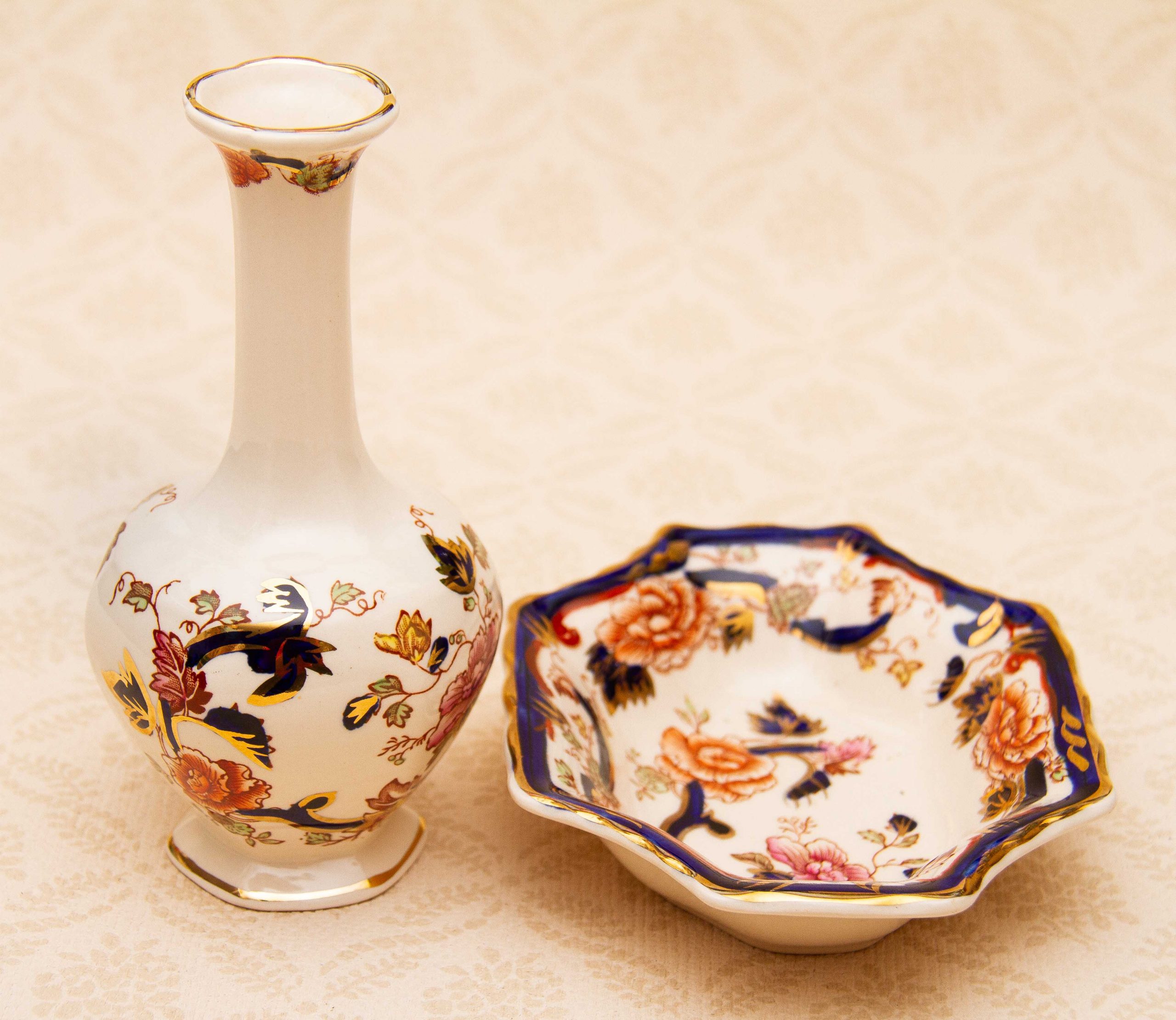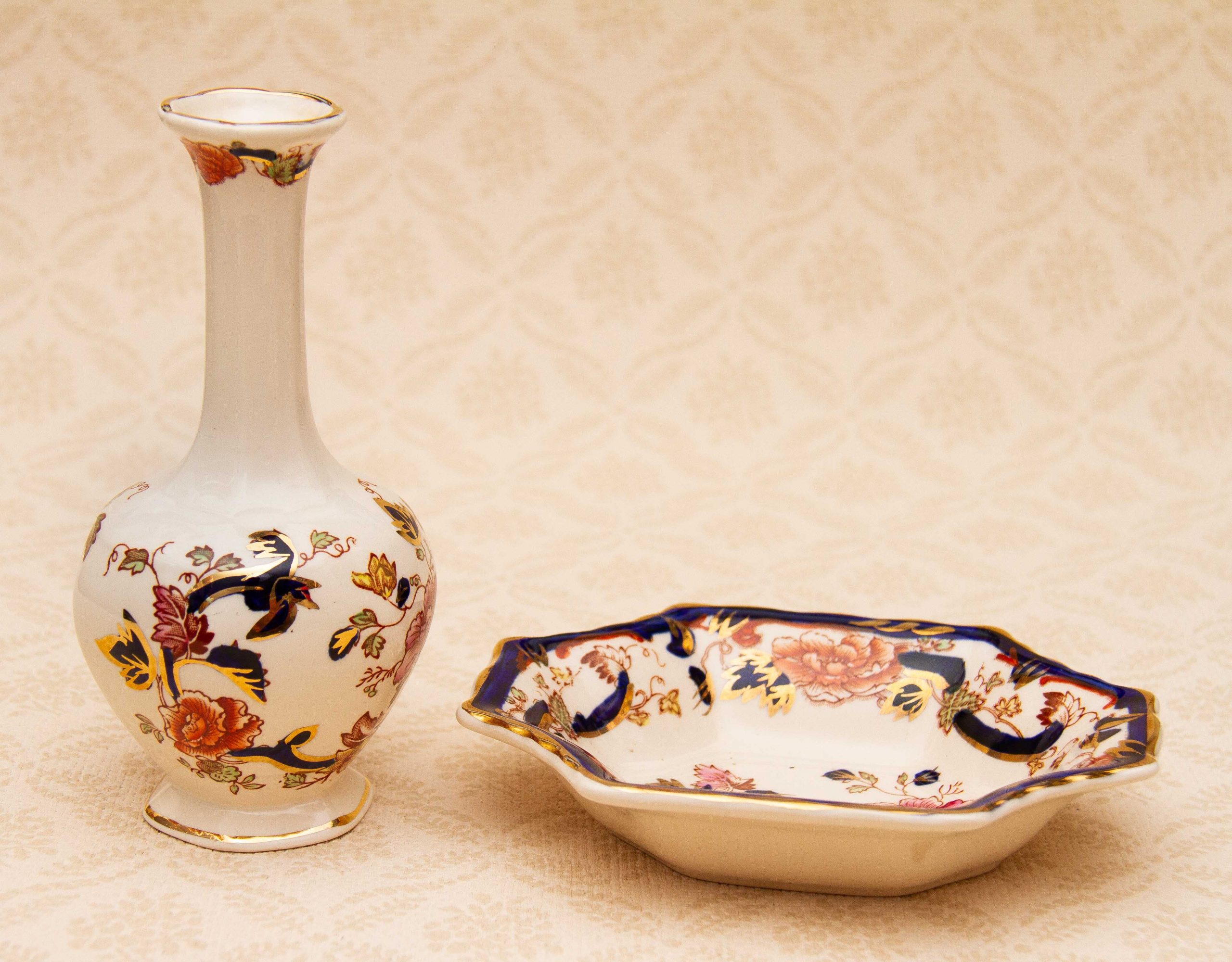 Masons hand painted ironstone blue Mandalay small stem vase and trinket dish set. Signed on each base, Made in England.