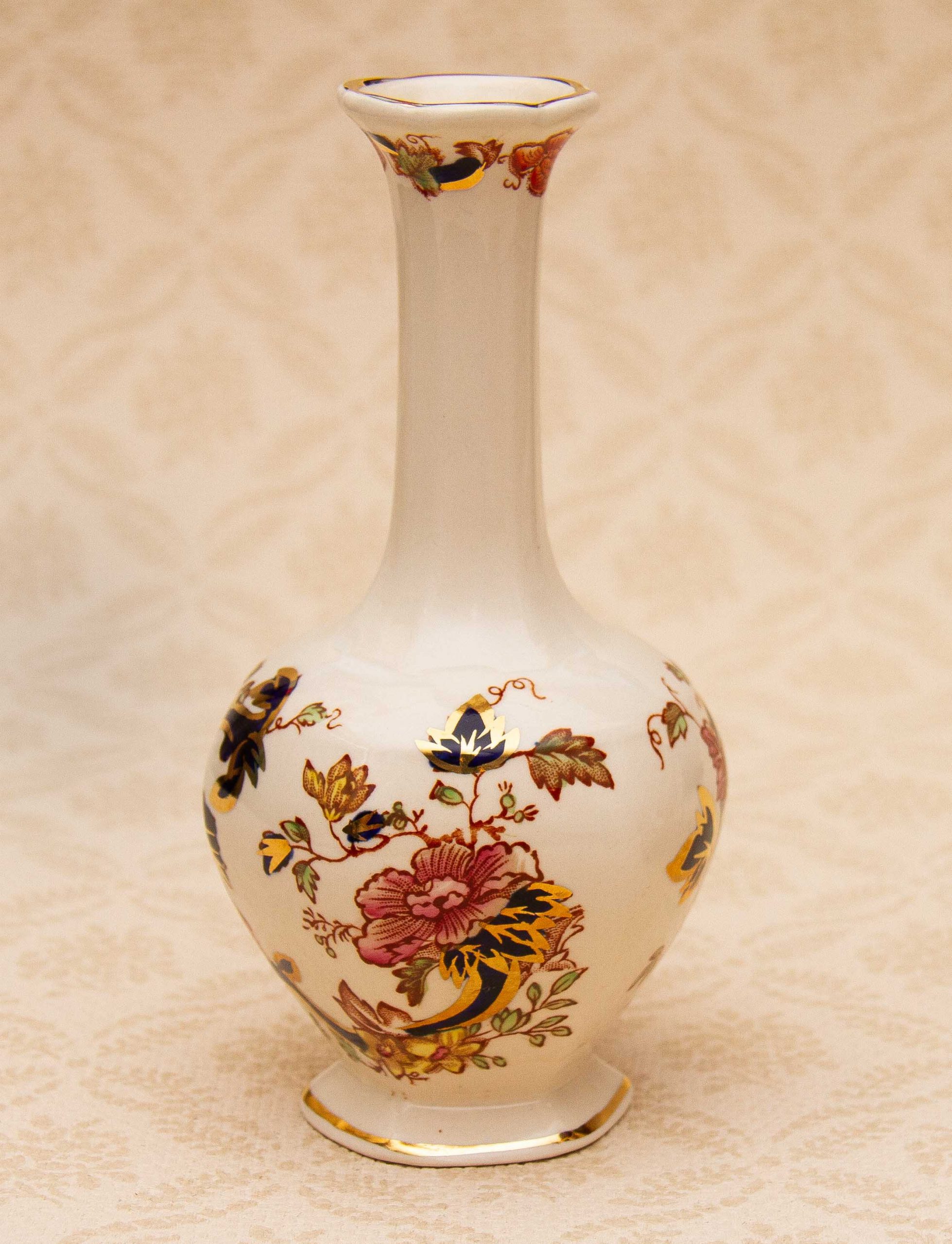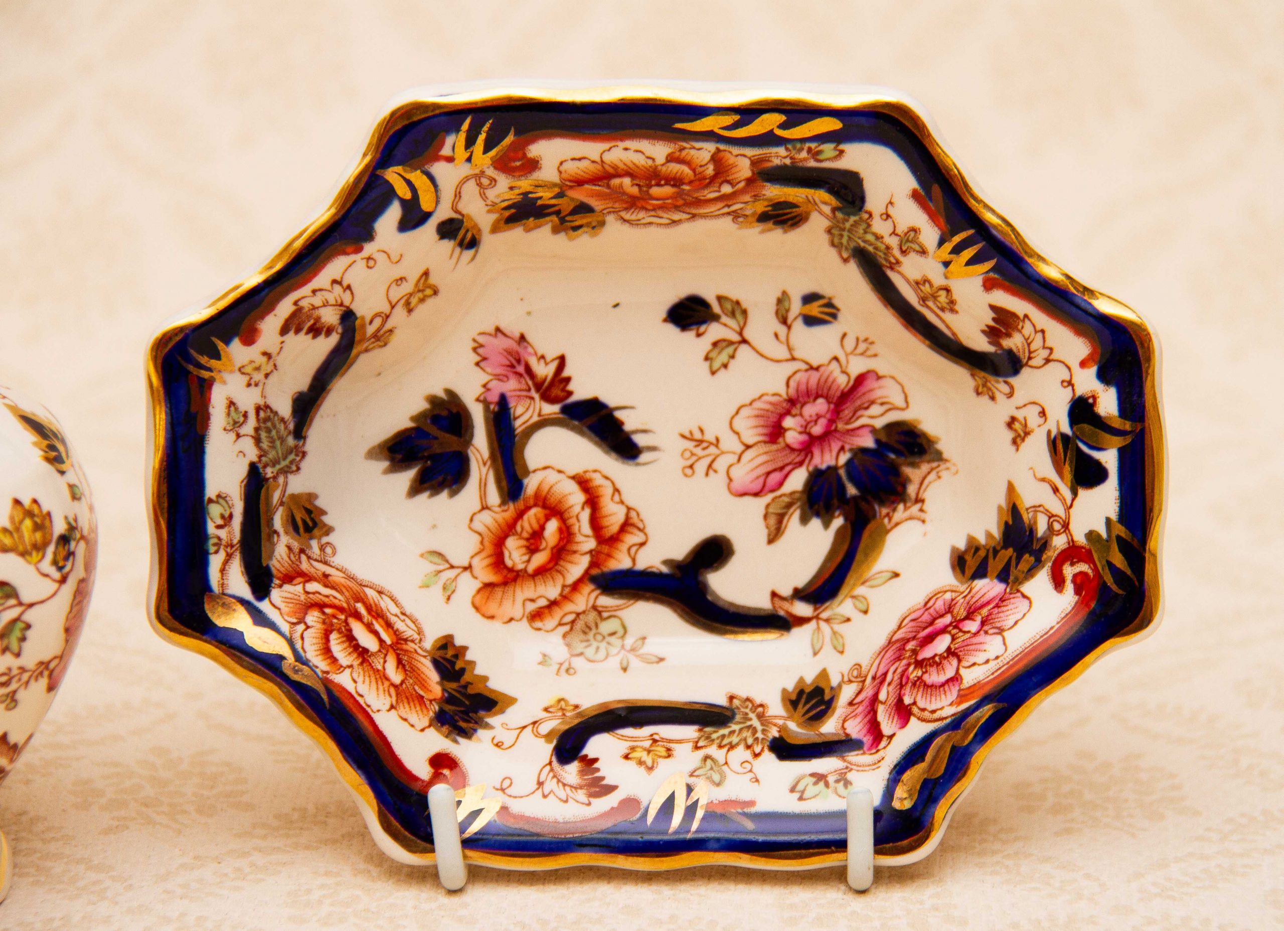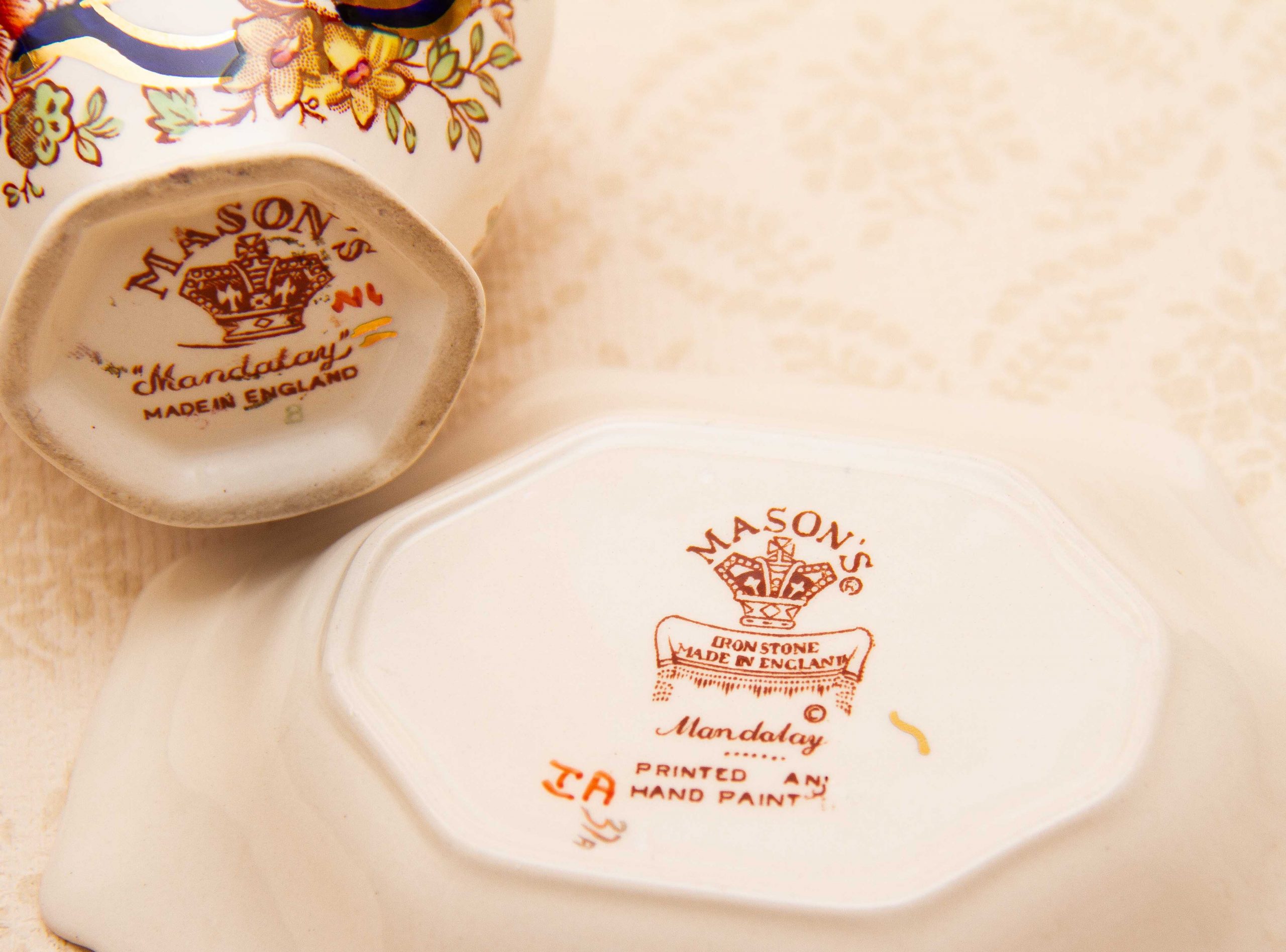 Masons hand painted ironstone blue Mandalay small stem vase and trinket dish set. Signed on each base, Made in England.
