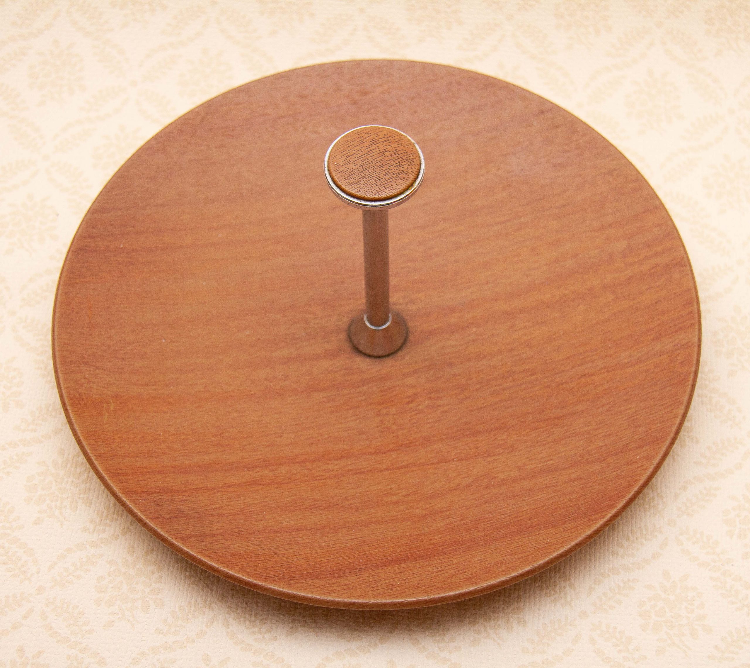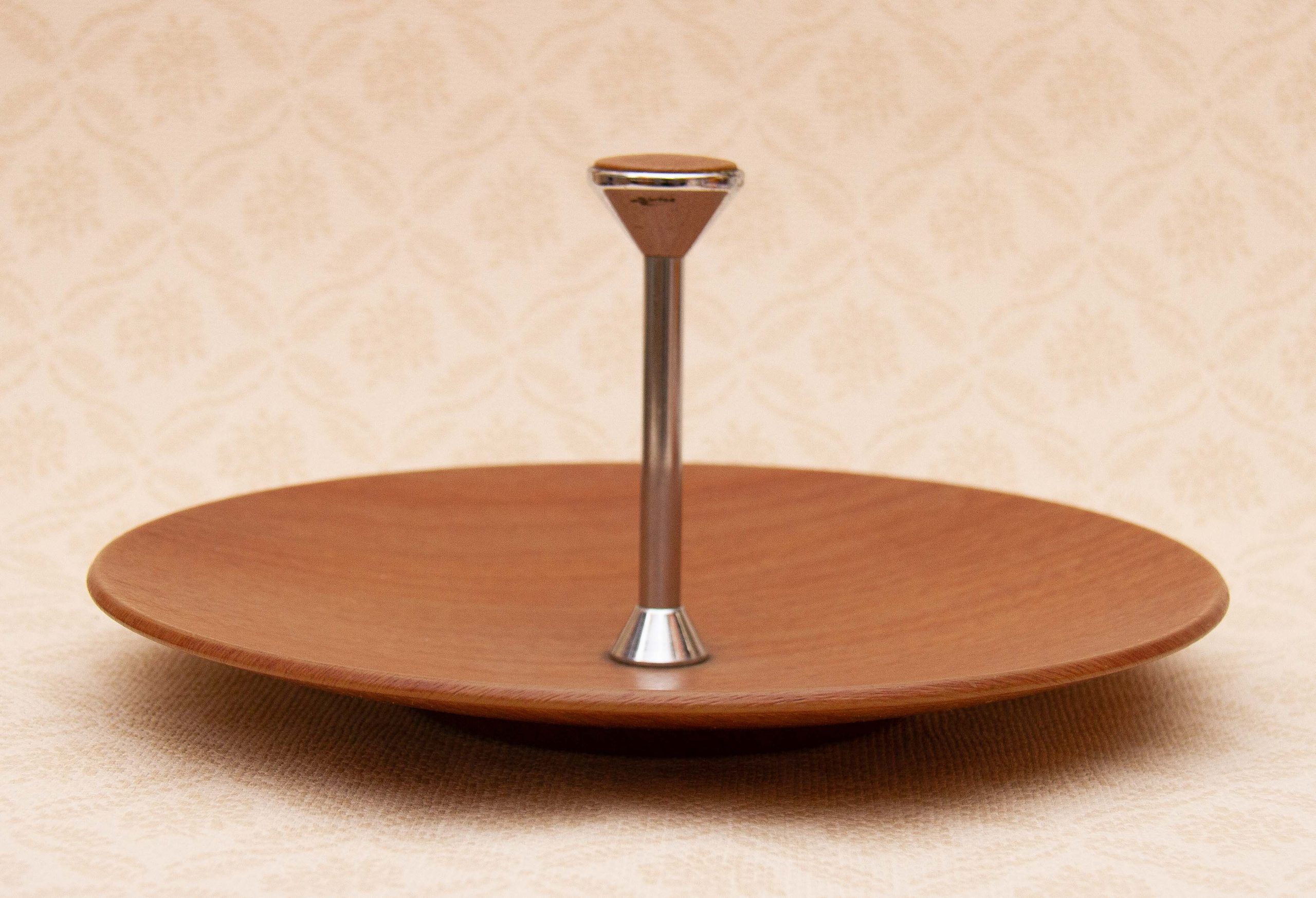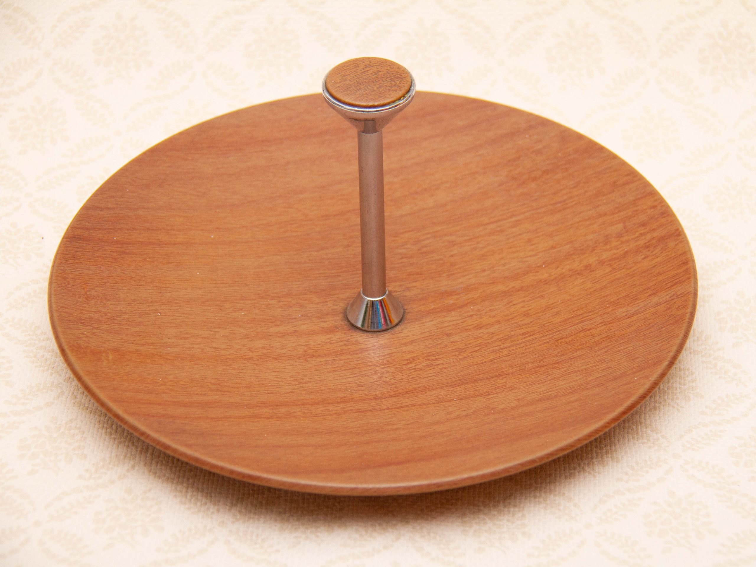 A  Mid Century Modern Danish Style Cake Plate/Stand in a teak wood effect finish, with a central chrome handle