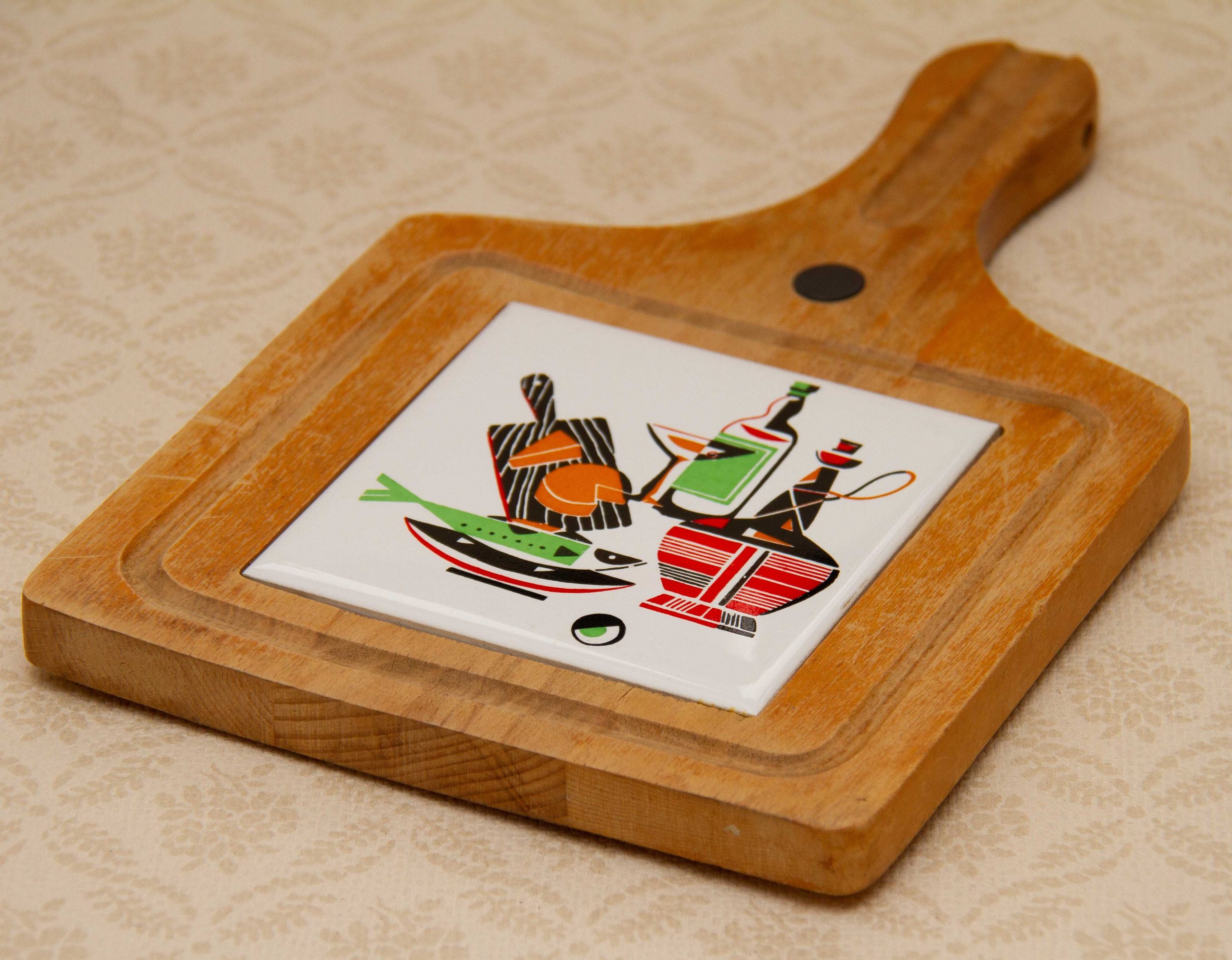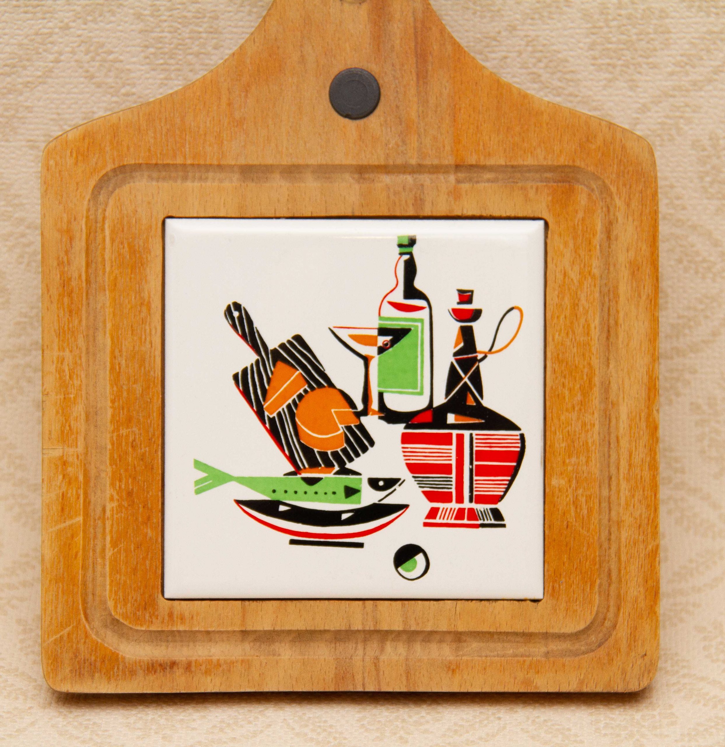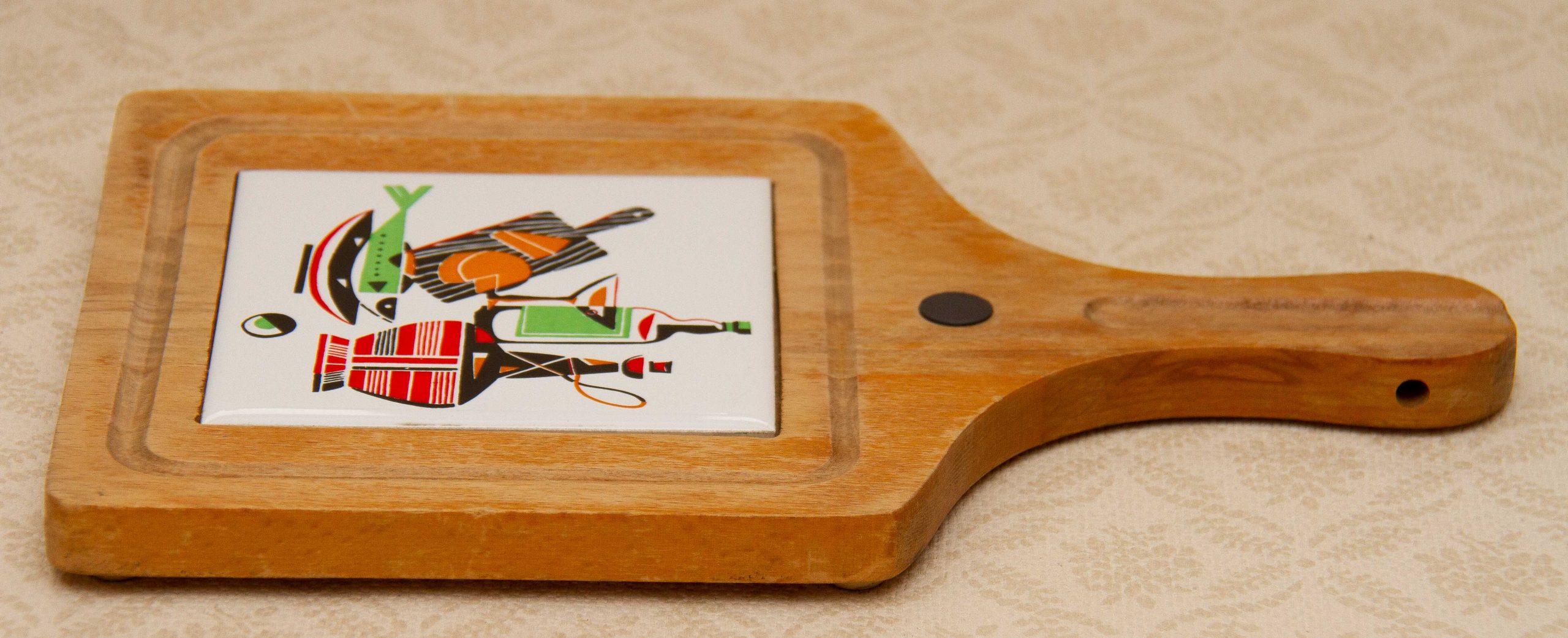 A vintage Mid Century Modern cheese board, with a ceramic tile inset and magnet for holding a cheese knife. The cheese board is light wood and the ceramic inset features a design of cheese, wine and fish.