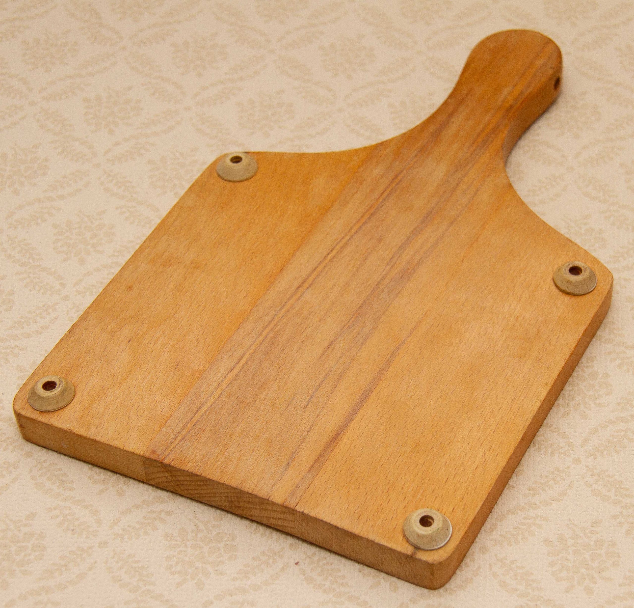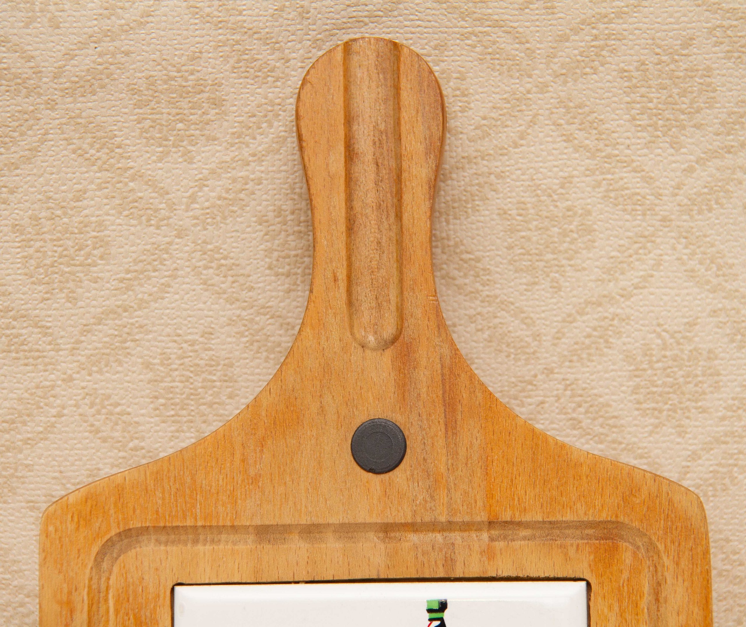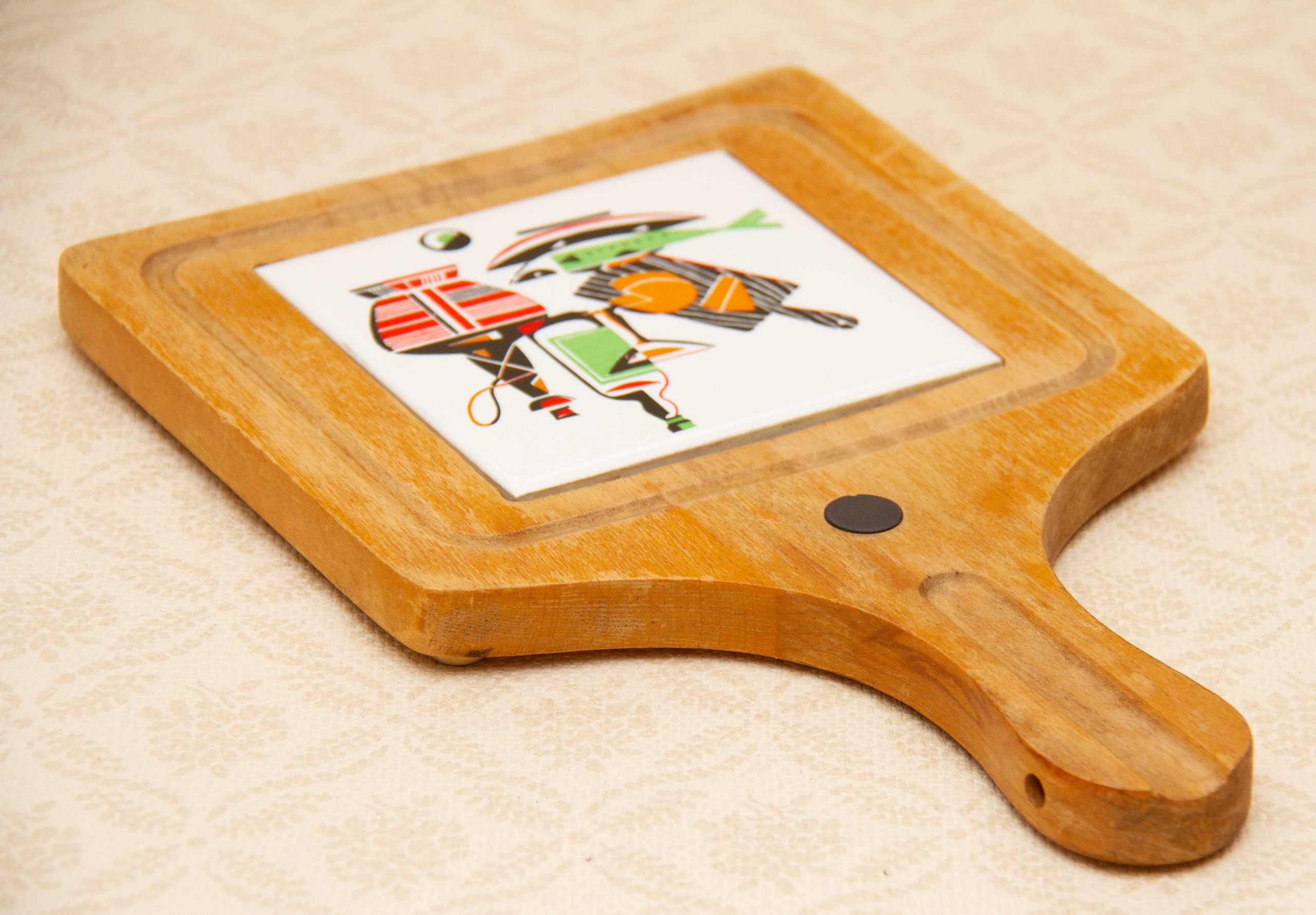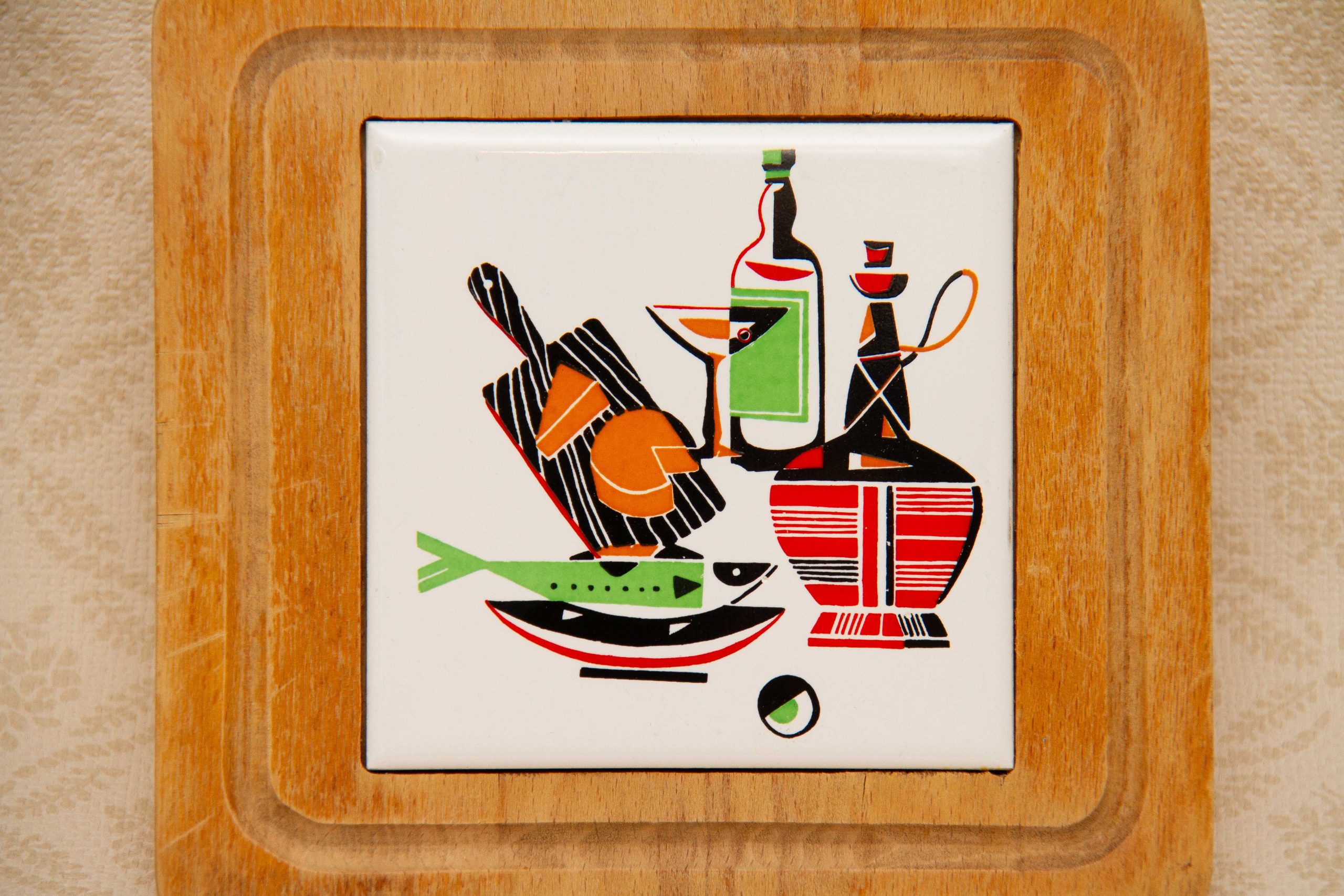 A vintage Mid Century Modern cheese board, with a ceramic tile inset and magnet for holding a cheese knife. The cheese board is light wood and the ceramic inset features a design of cheese, wine and fish.