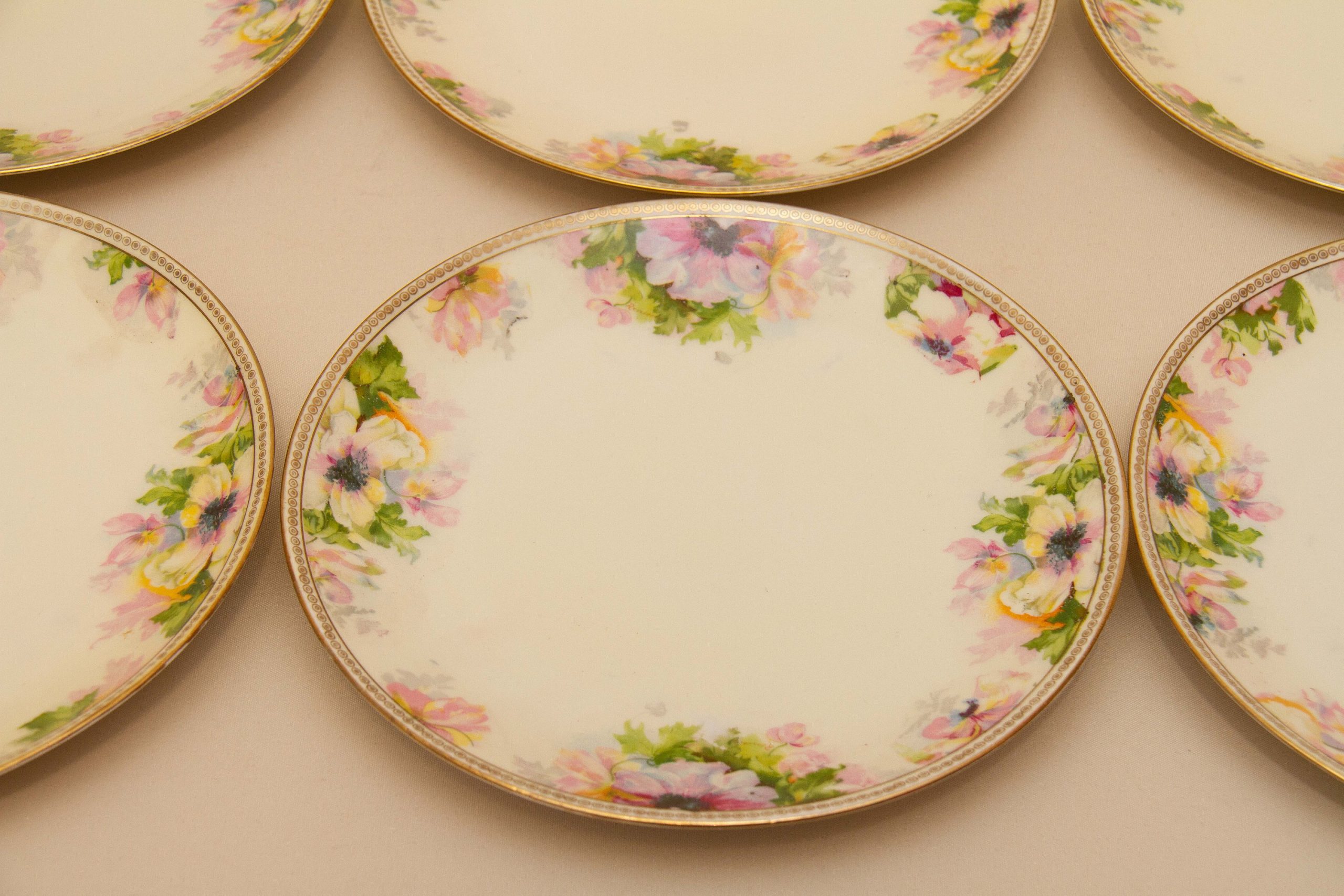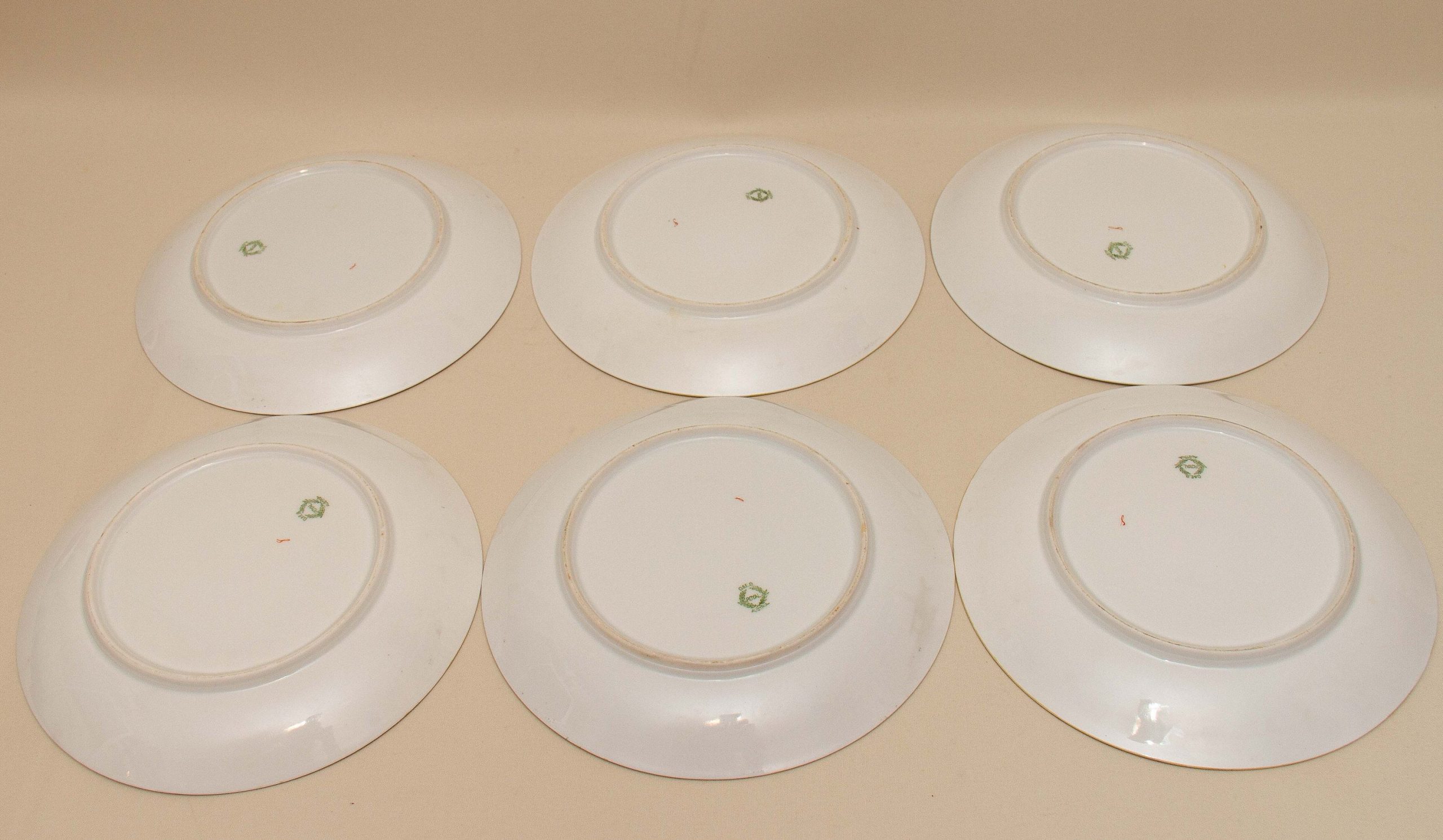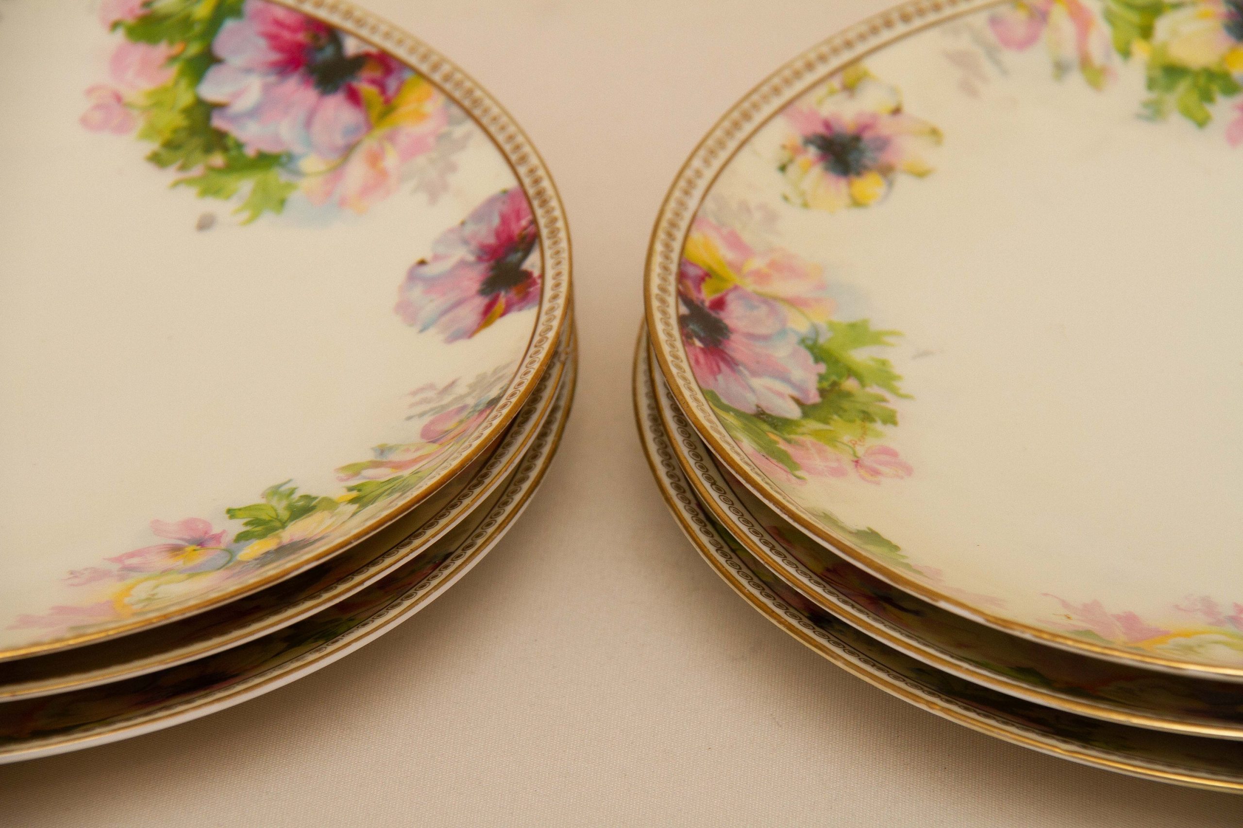 A set of 6 Antique Vintage O.&.E.G. Royal Austria Porcelain Plates, with decorative gold edges and a hand painted floral pattern.