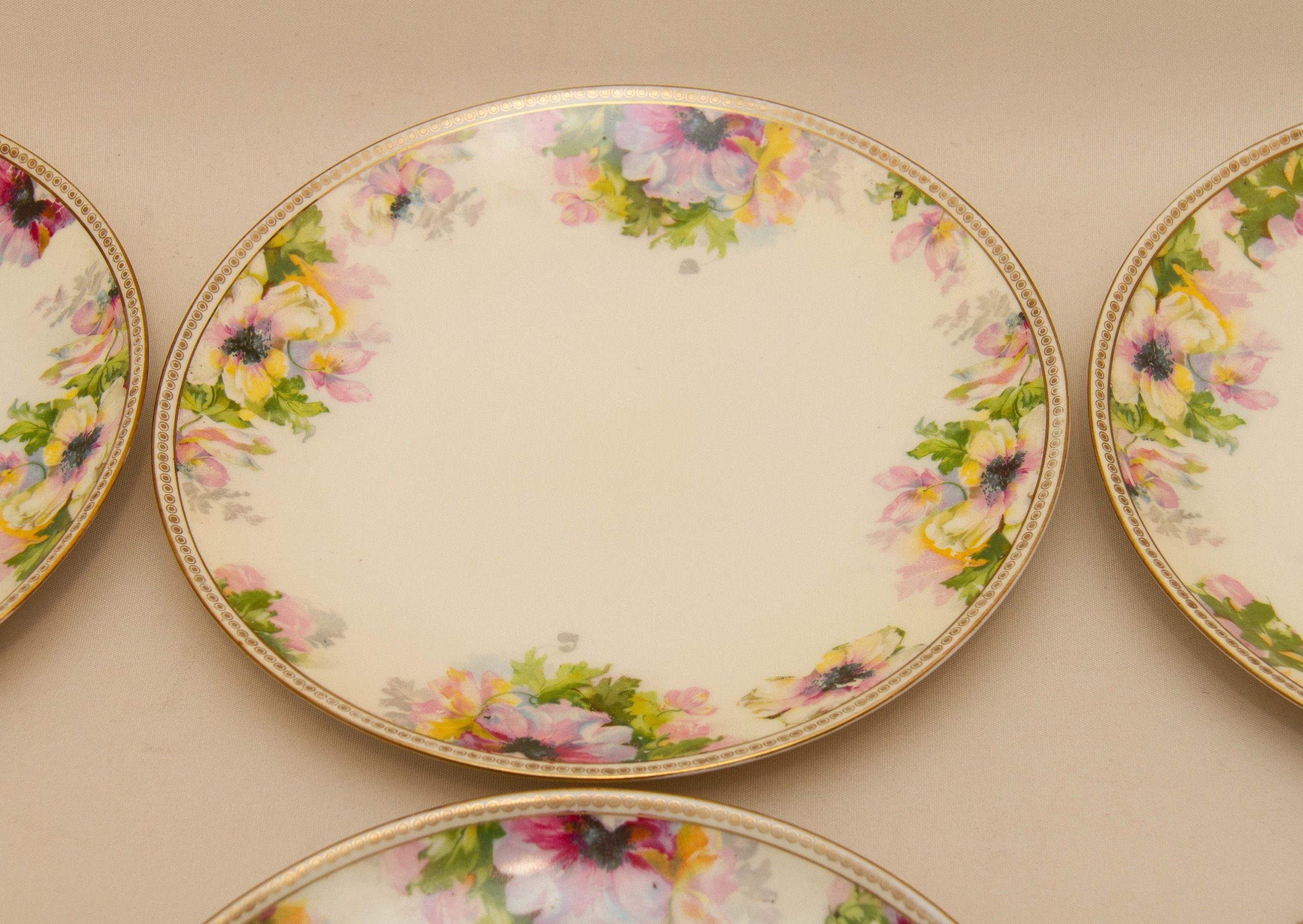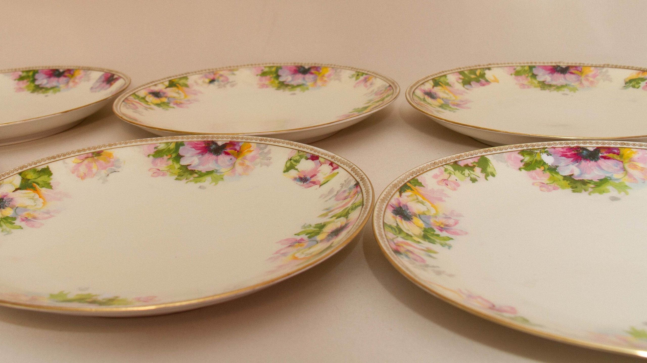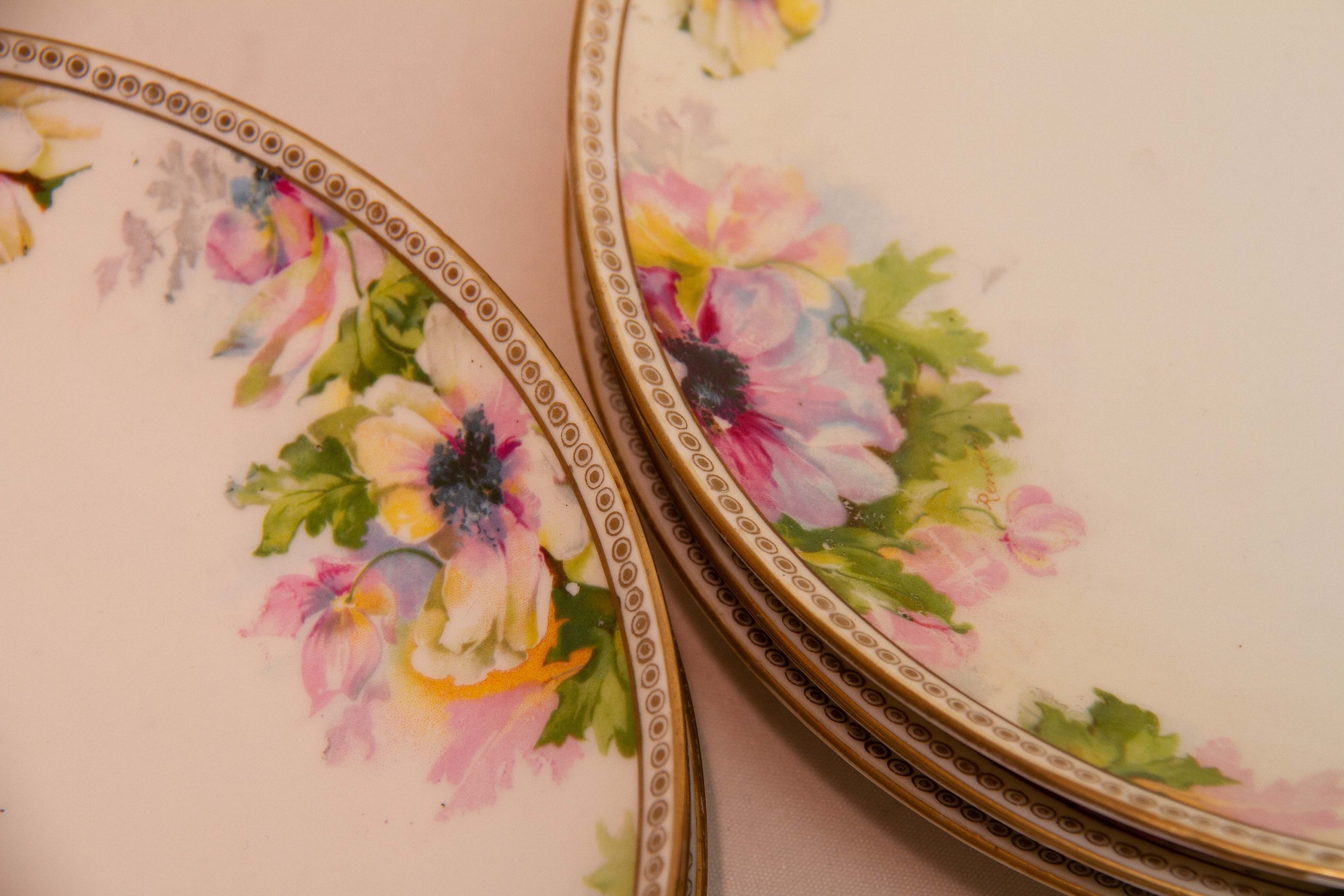 A set of 6 Antique Vintage O.&.E.G. Royal Austria Porcelain Plates, with decorative gold edges and a hand painted floral pattern.