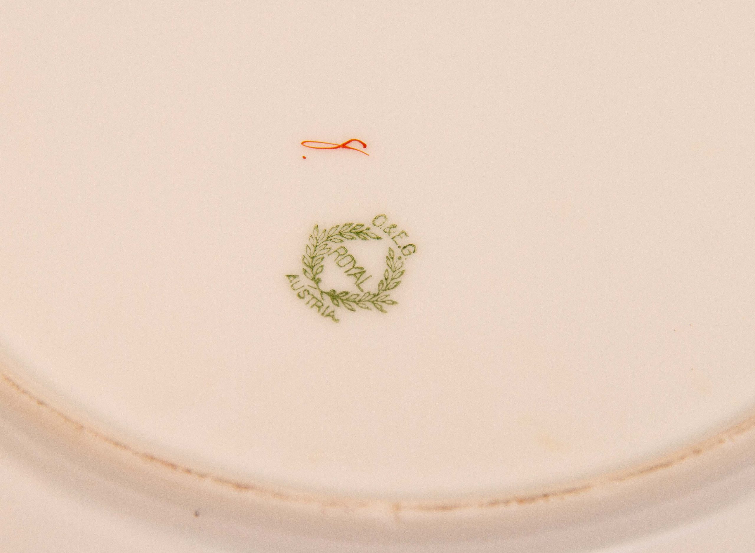 Each one is back stamped, this mark was used by Oscar and Edgar Gutherz of Altrolau, Bohemia (now Stara Role, Czech Republic) from 1899 to 1918. Oscar Gutherz and Maximilian Marx had started a porcelain decorating business in Altrolau in 1884 with financial backing from Lazarus Straus & Sons, an American importer. Later the company began making porcelain. In 1898 Oscar’s brother, Edgar Gutherz, bought out Marx and joined Oscar in the business, which became known as the Oscar & Edgar Gutherz (O. & E.G.) Royal Austria factory.