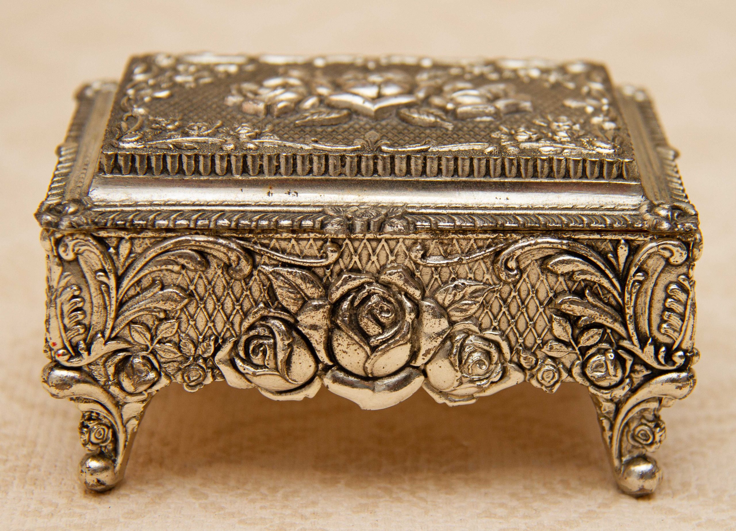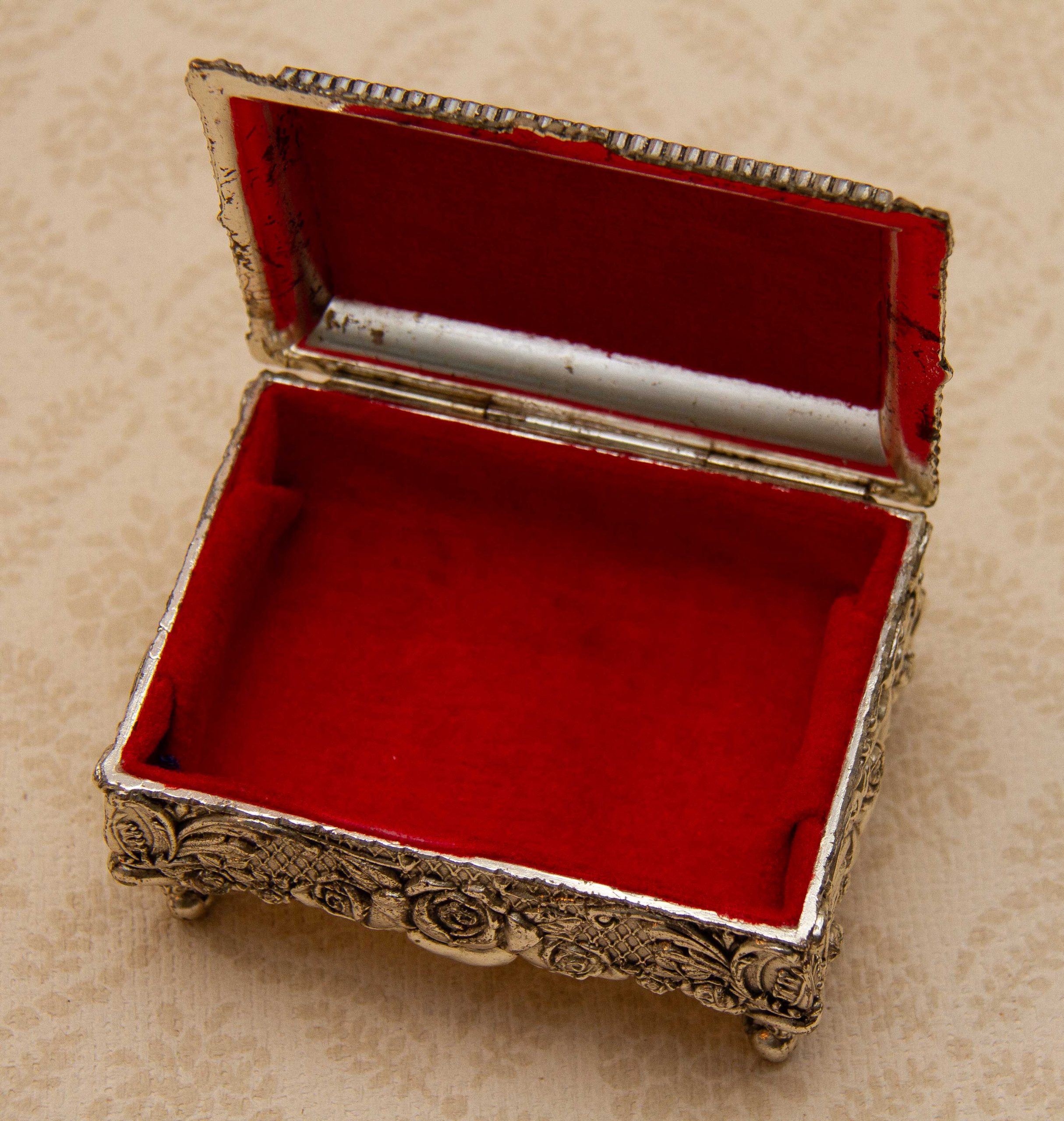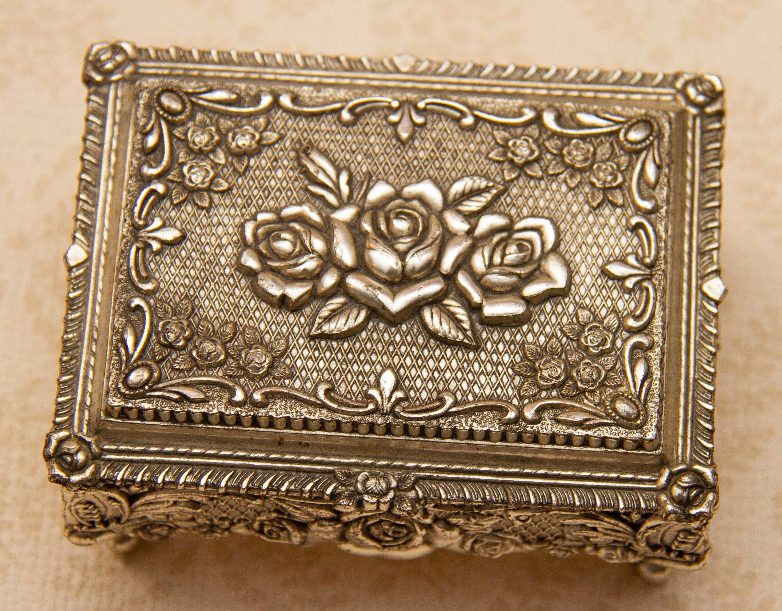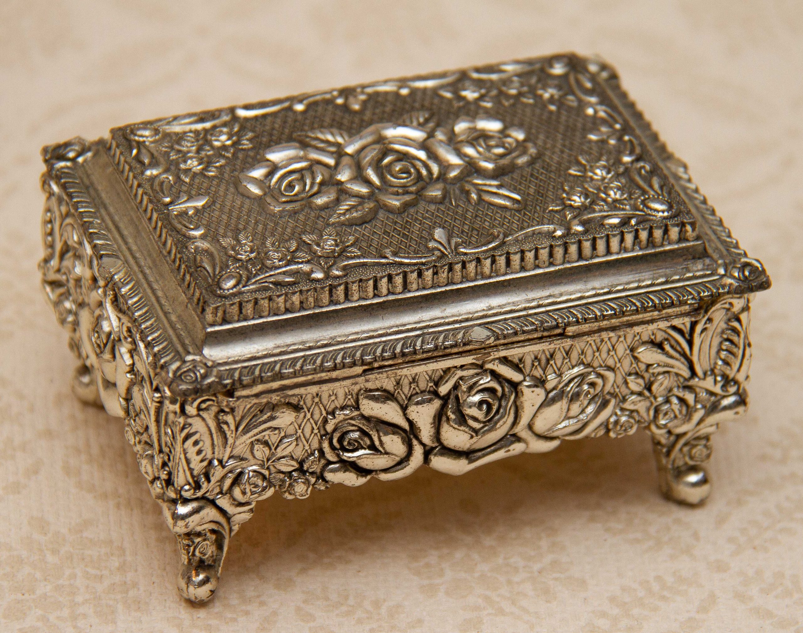 A silver plated footed jewellery trinket box. Ornately decorated with roses, and lined in red velvet. Made in Japan is stamped on the base, dating from the 1950’s.