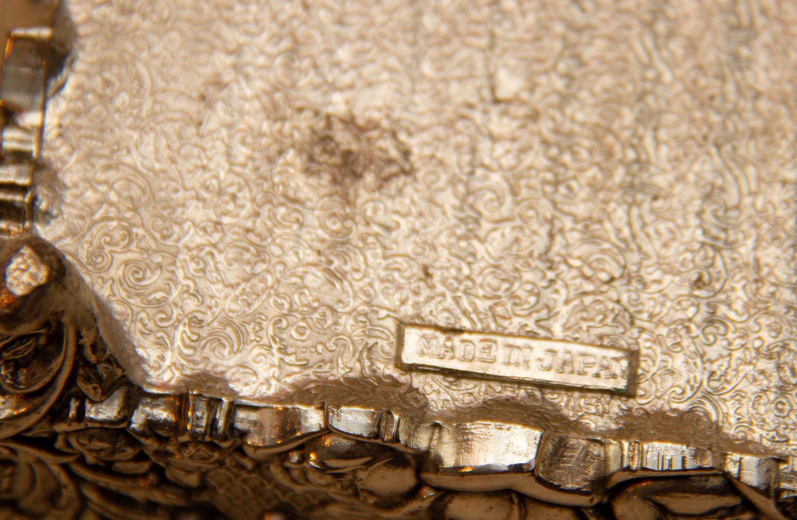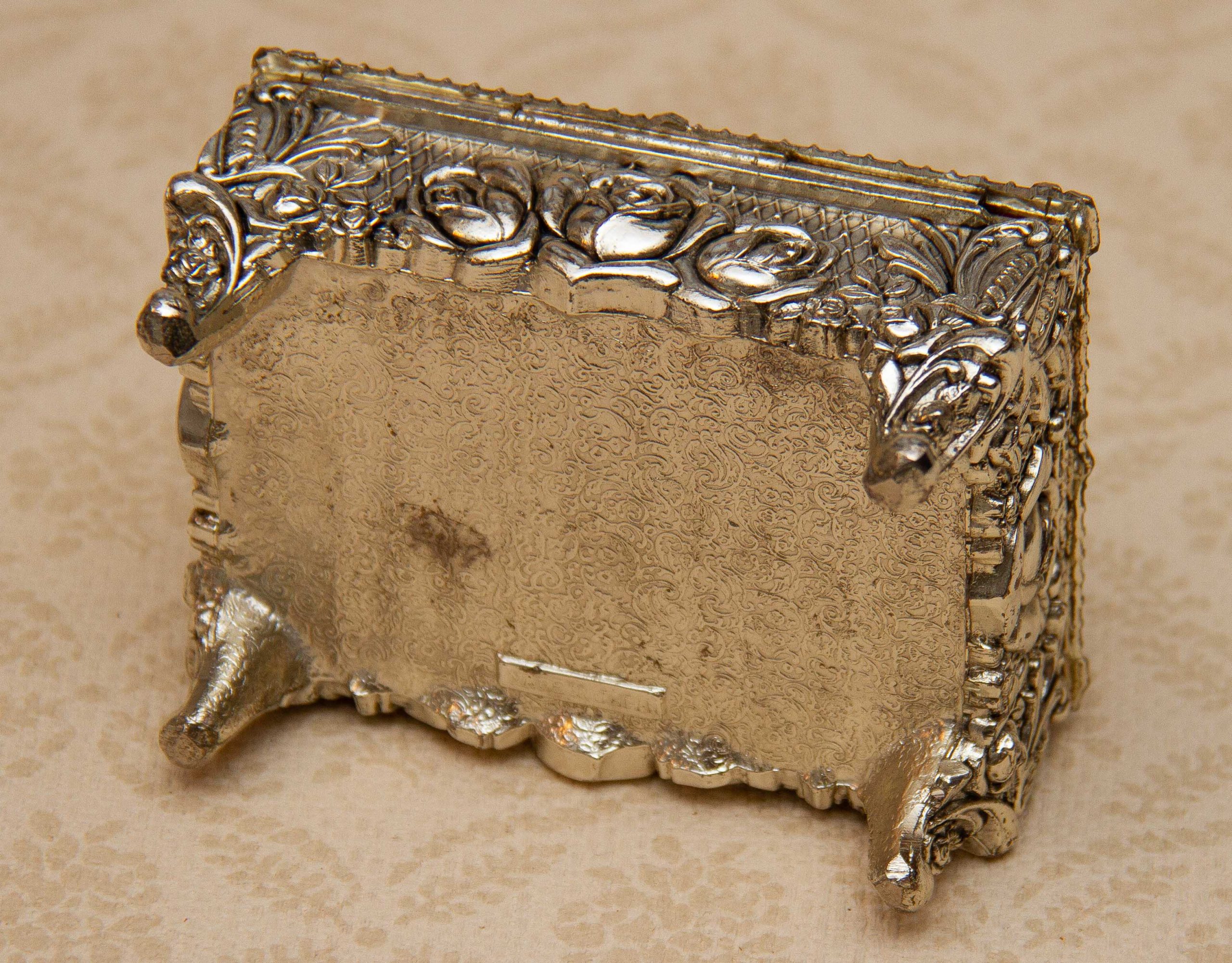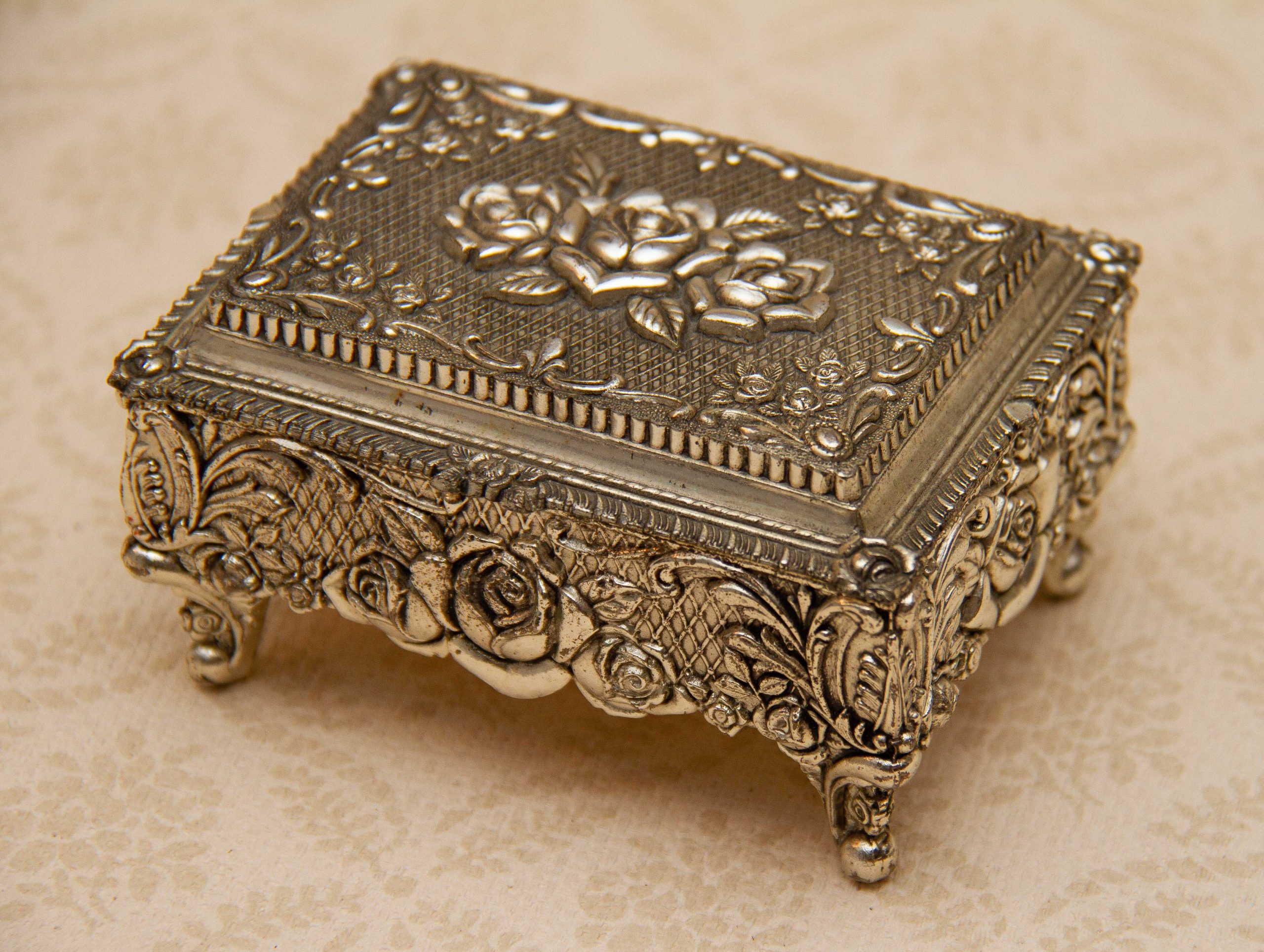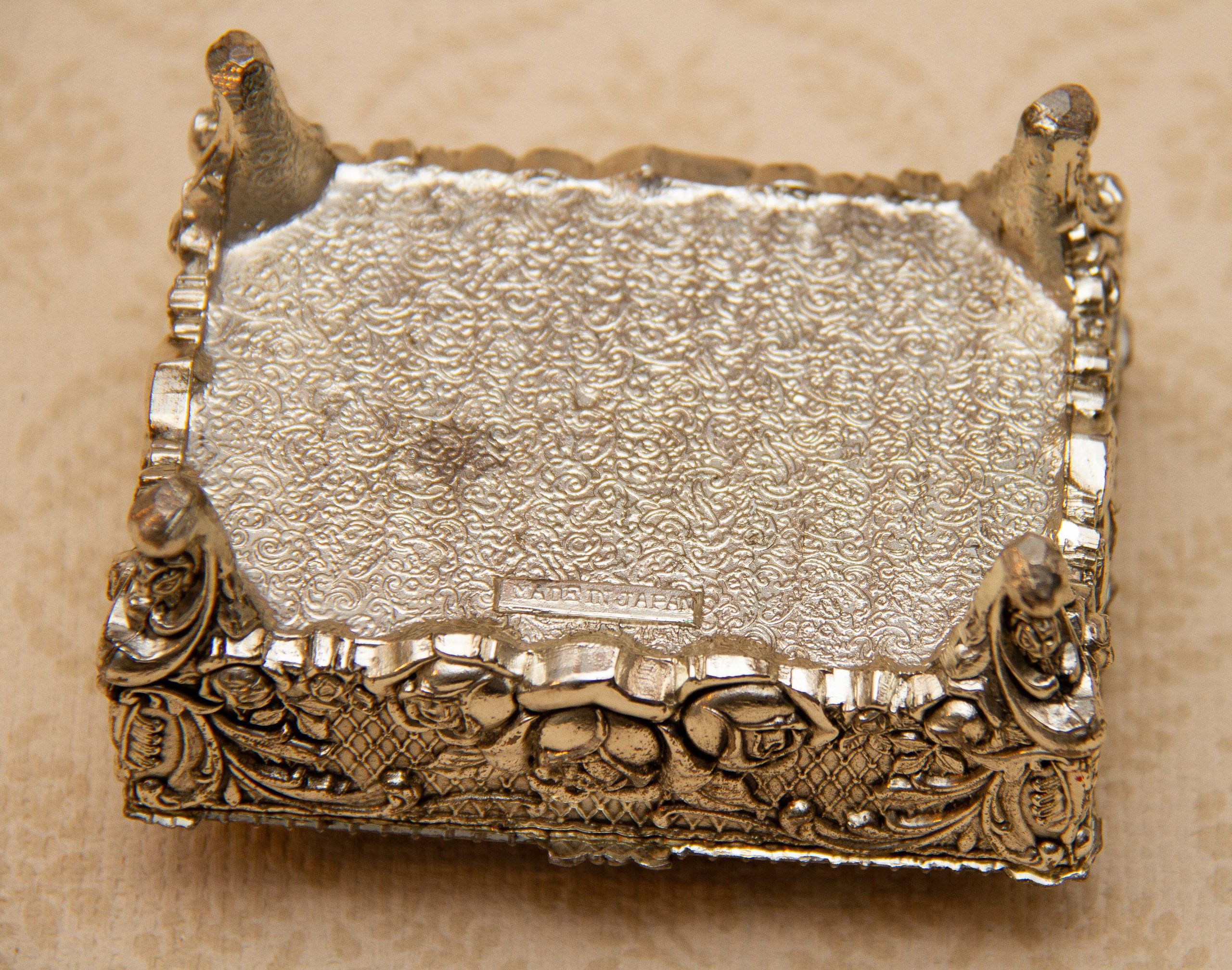 A silver plated footed jewellery trinket box. Ornately decorated with roses, and lined in red velvet. Made in Japan is stamped on the base, dating from the 1950’s.
