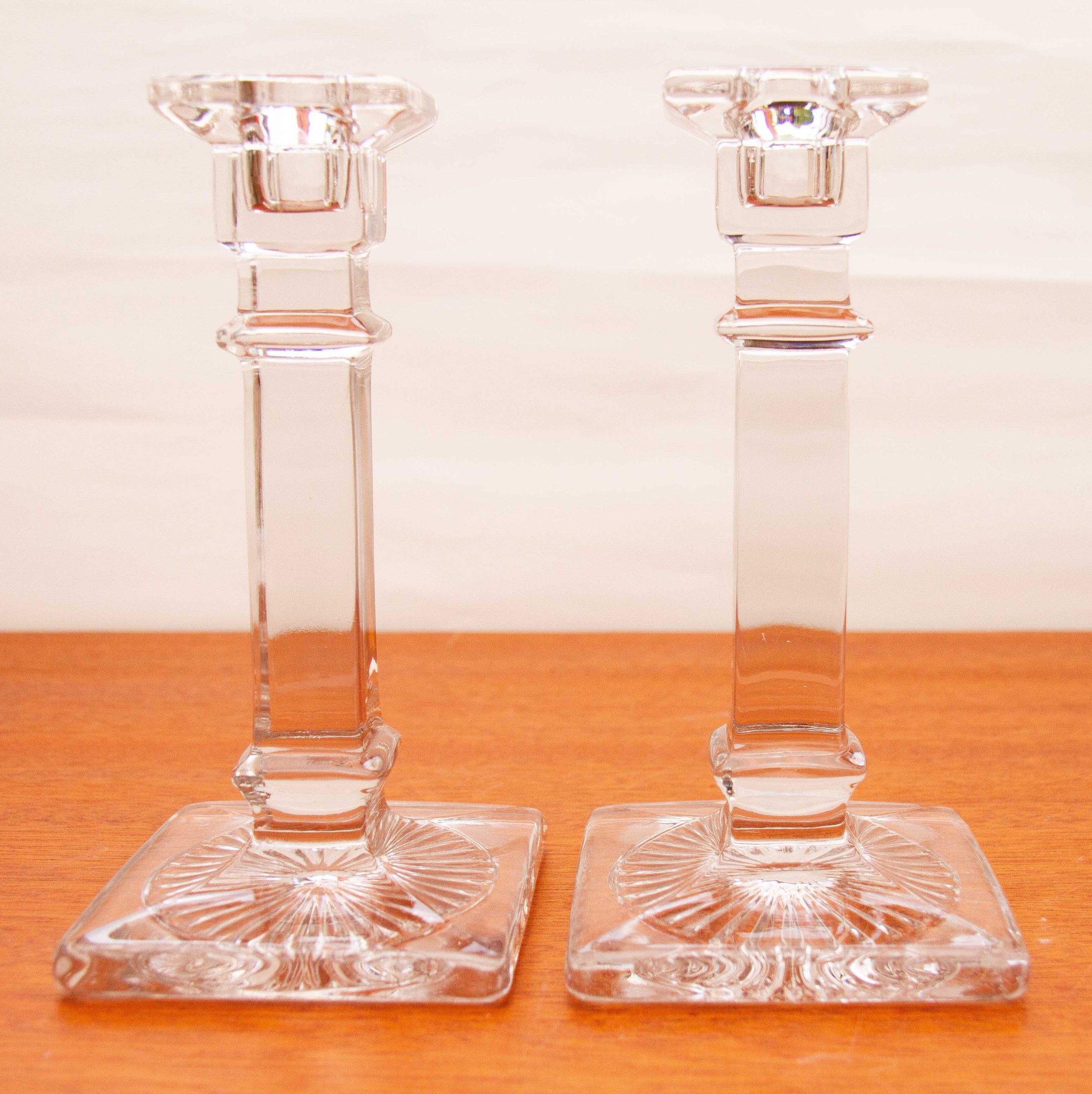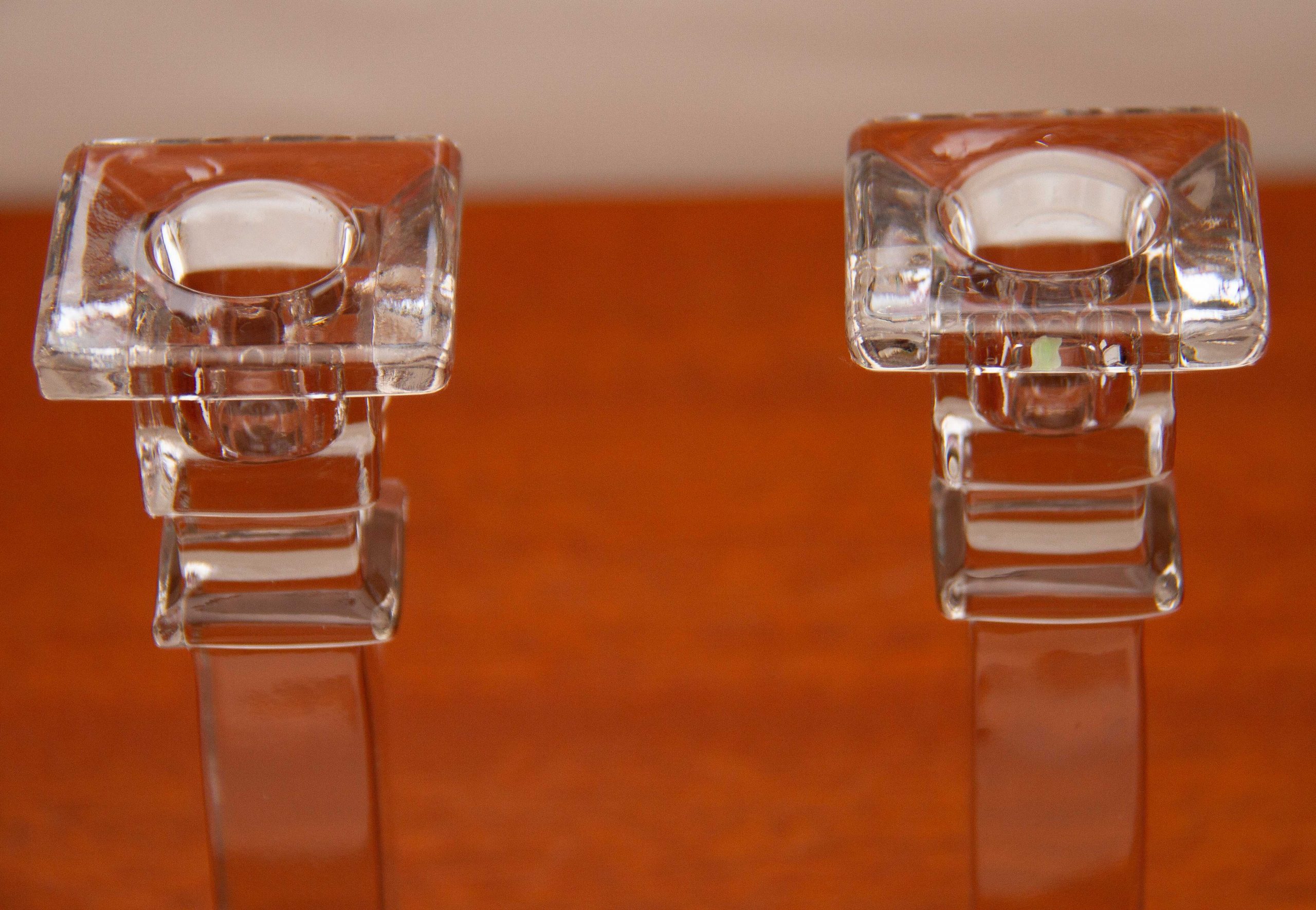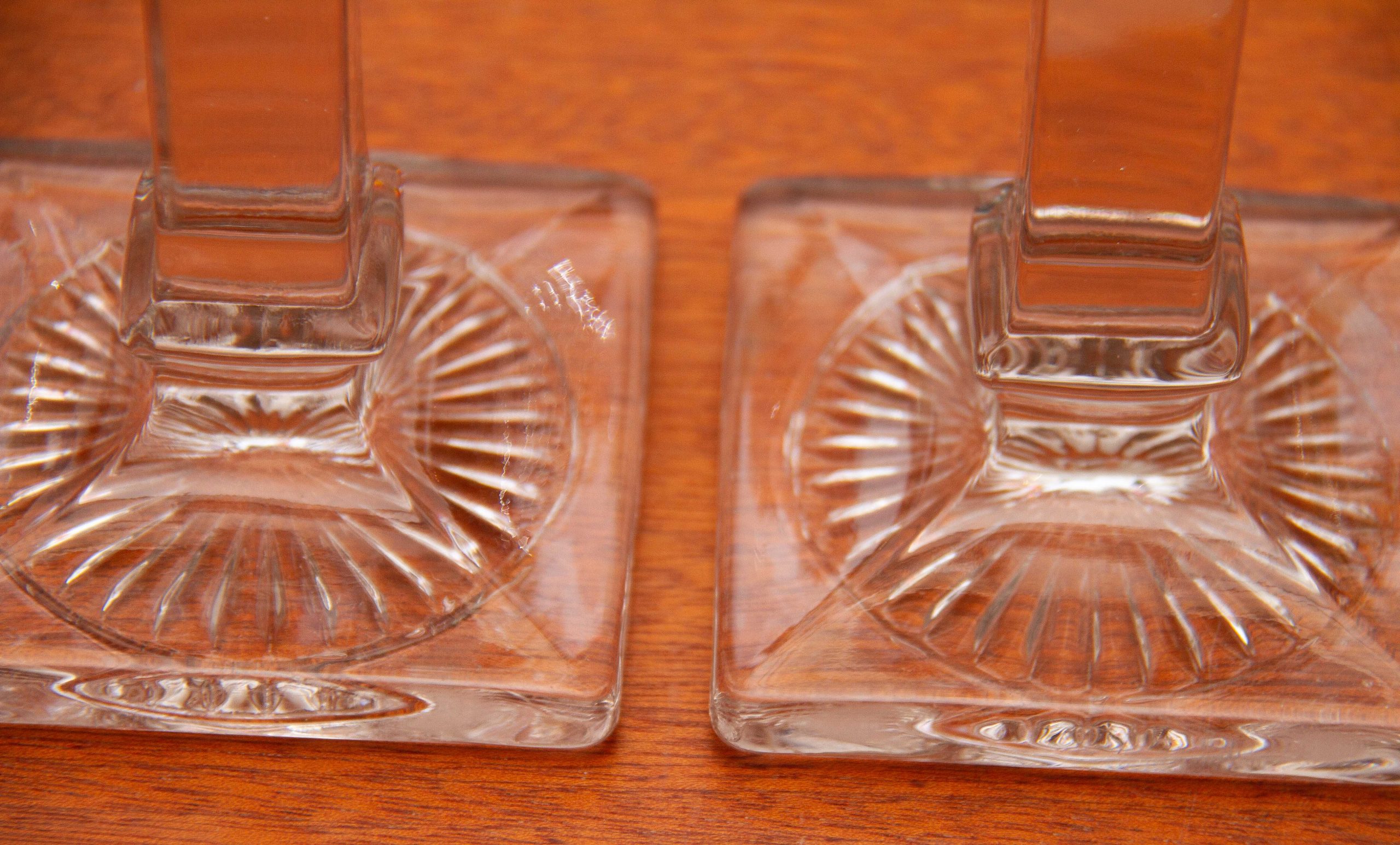 A pair of Art Deco vintage clear glass candlesticks, suitable for dinner/taper candles
