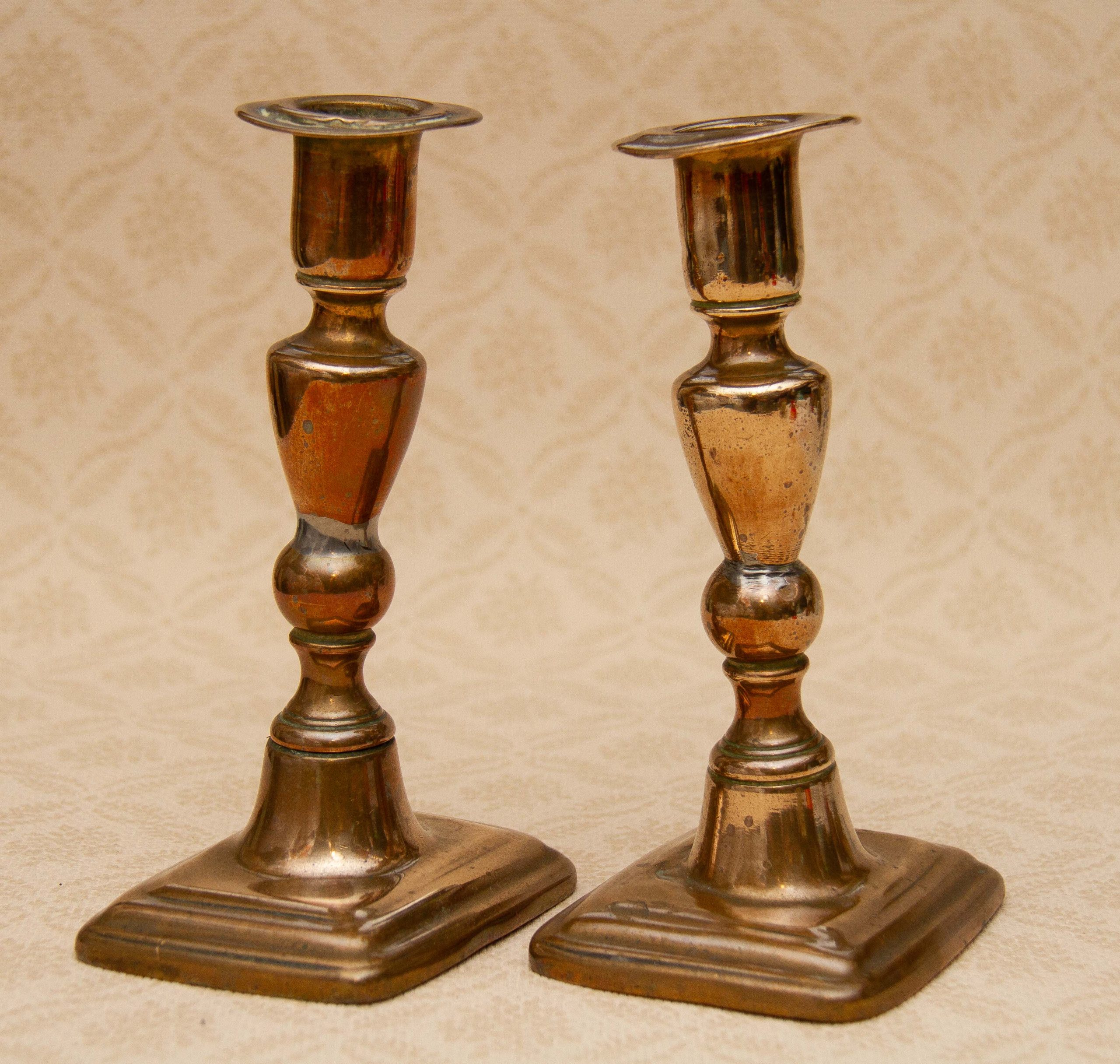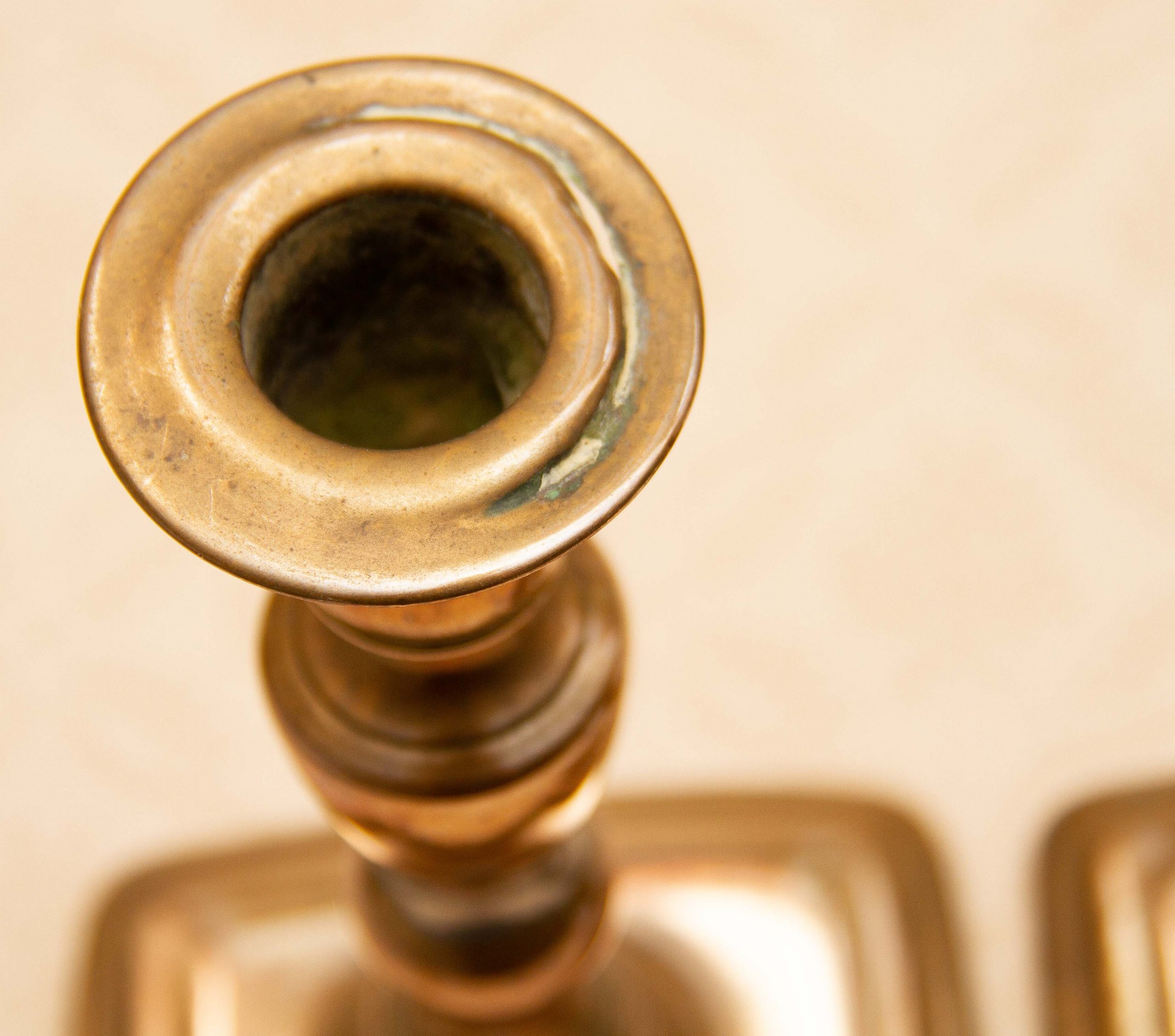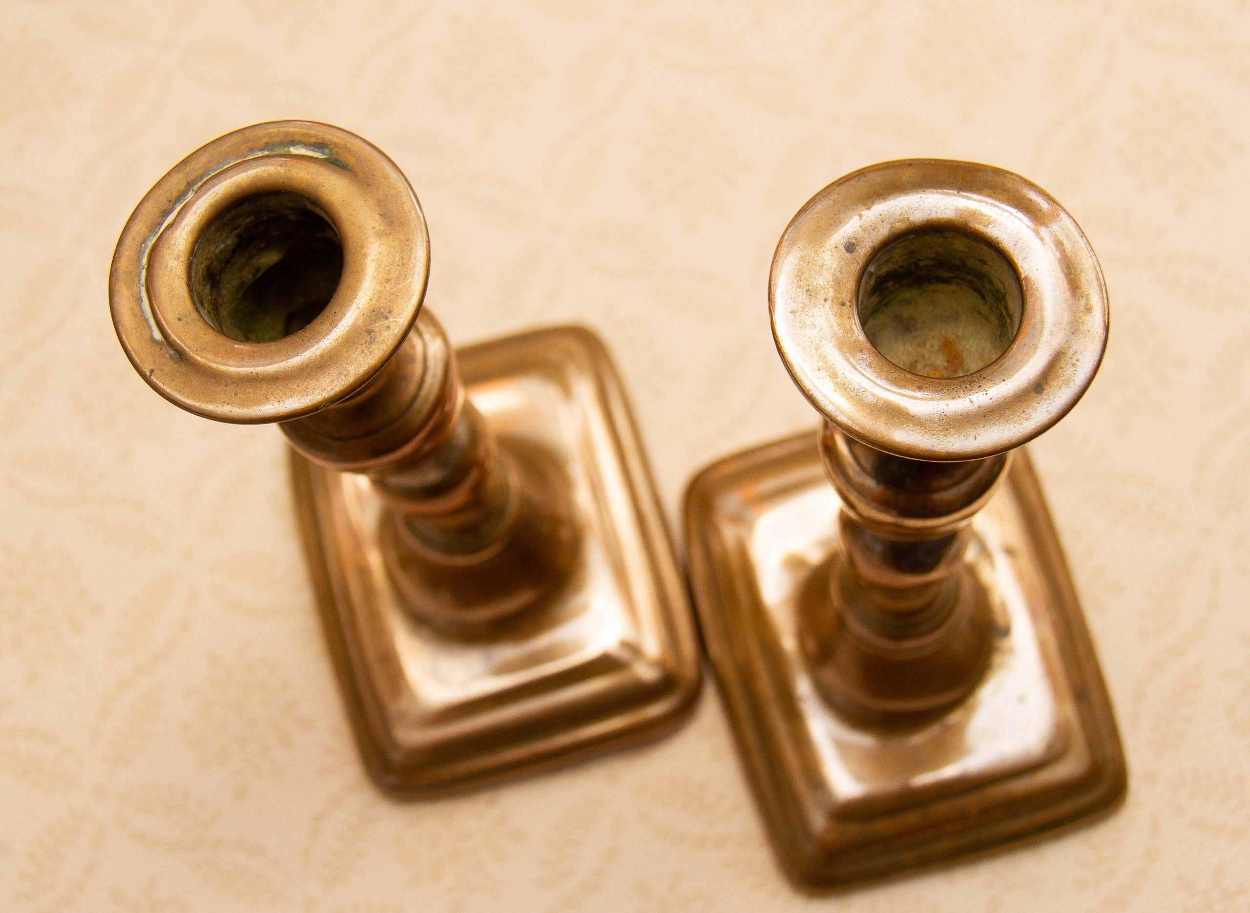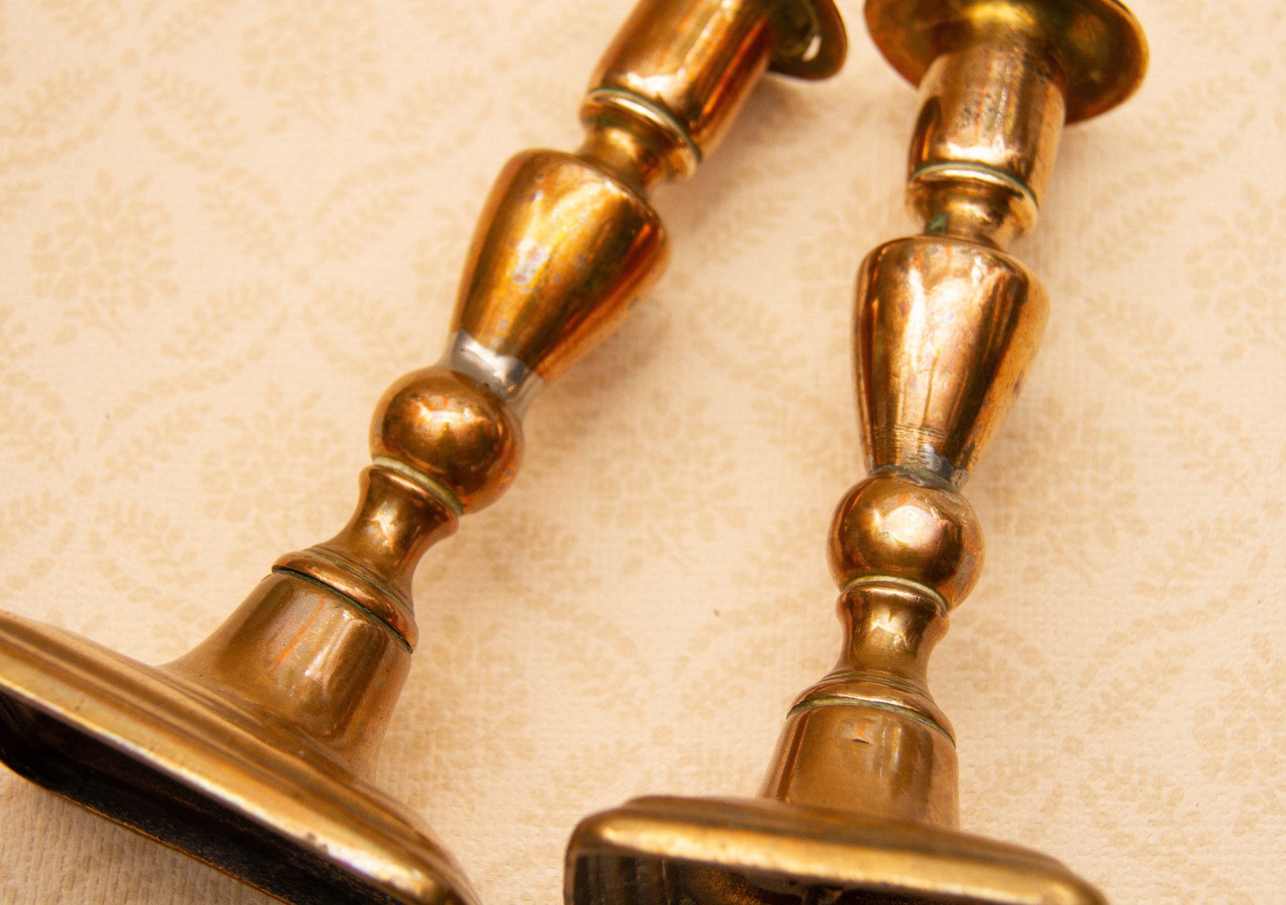 A pair of solid brass well used and distressed vintage candlesticks suitable for dinner or taper candles. These are perfect for styling a bookshelf, mantelpiece or on a dining table.