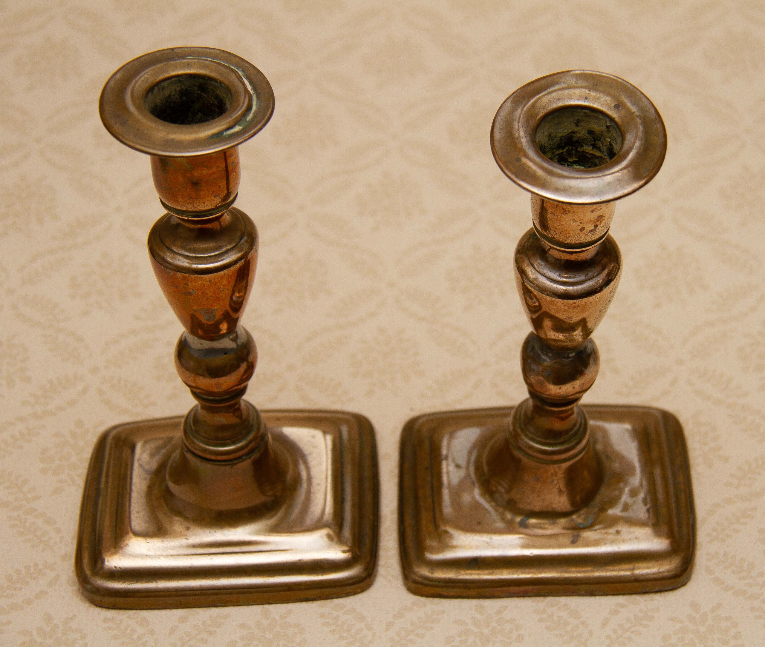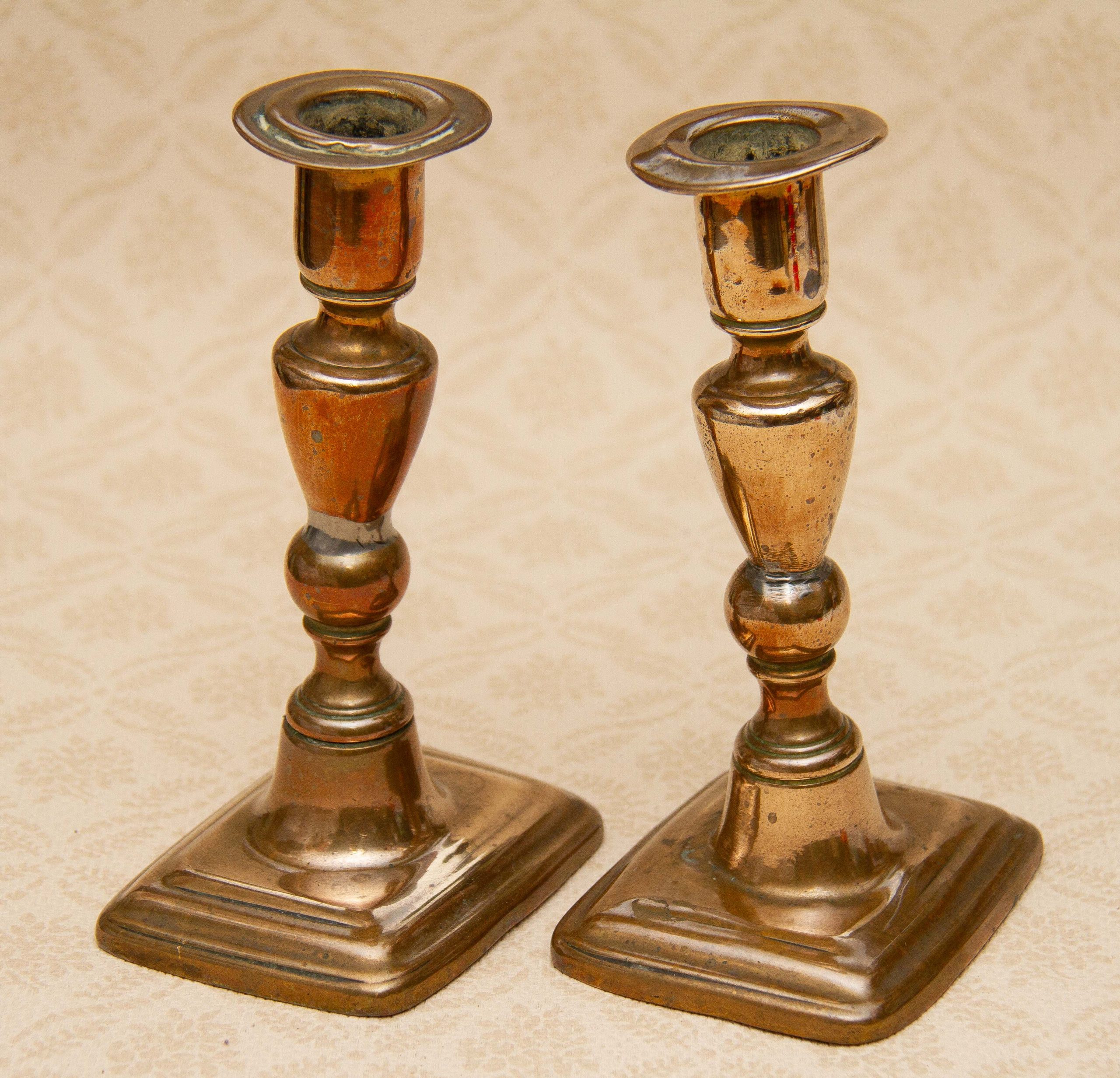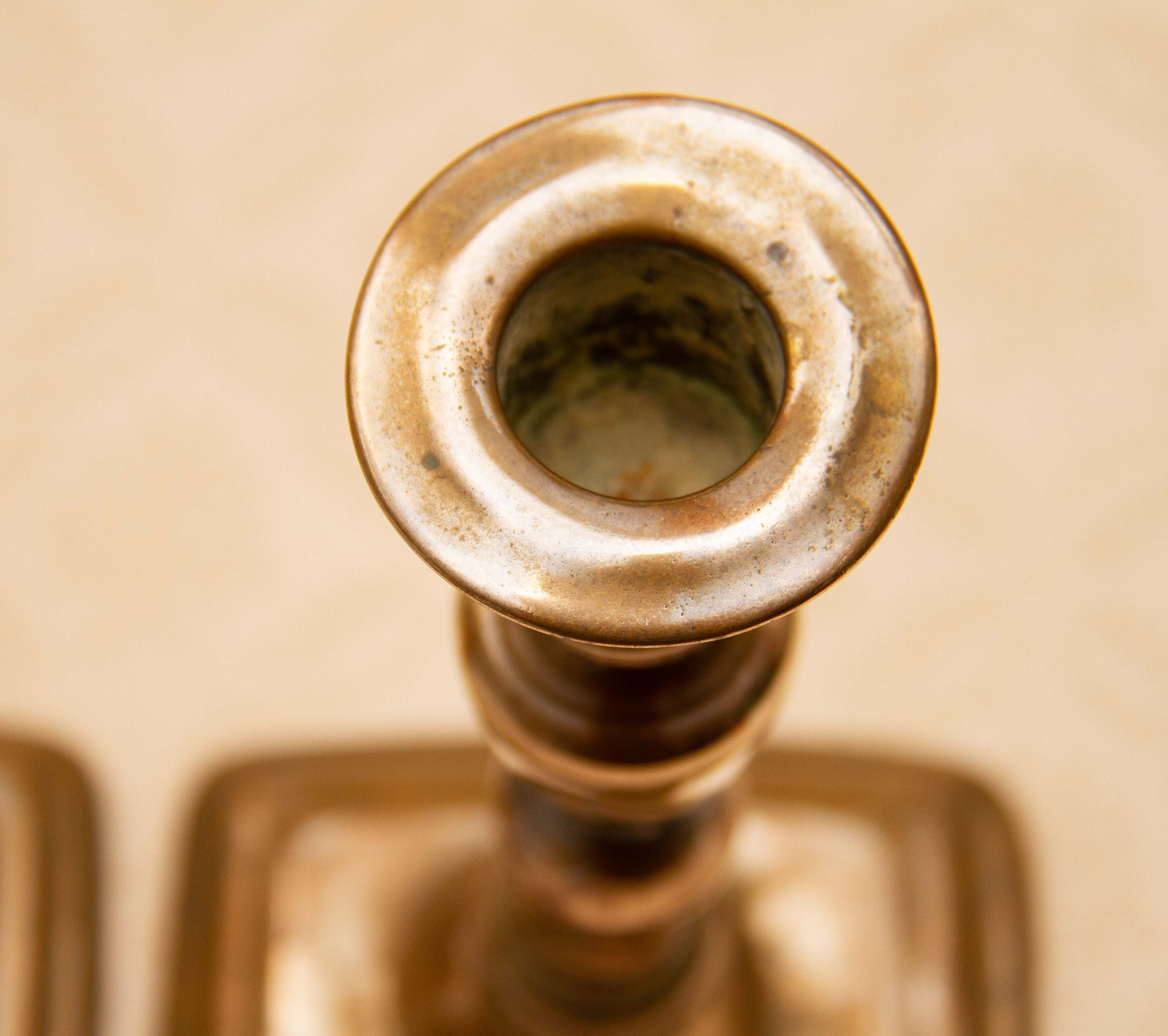 A pair of solid brass well used and distressed vintage candlesticks suitable for dinner or taper candles. These are perfect for styling a bookshelf, mantelpiece or on a dining table.
