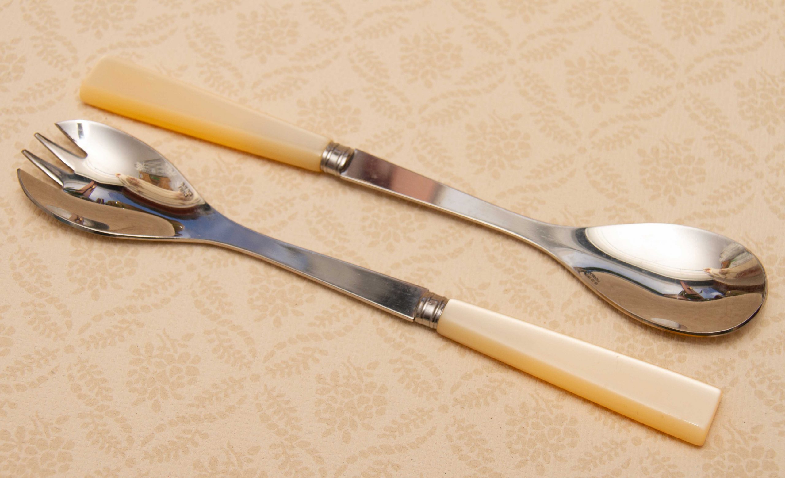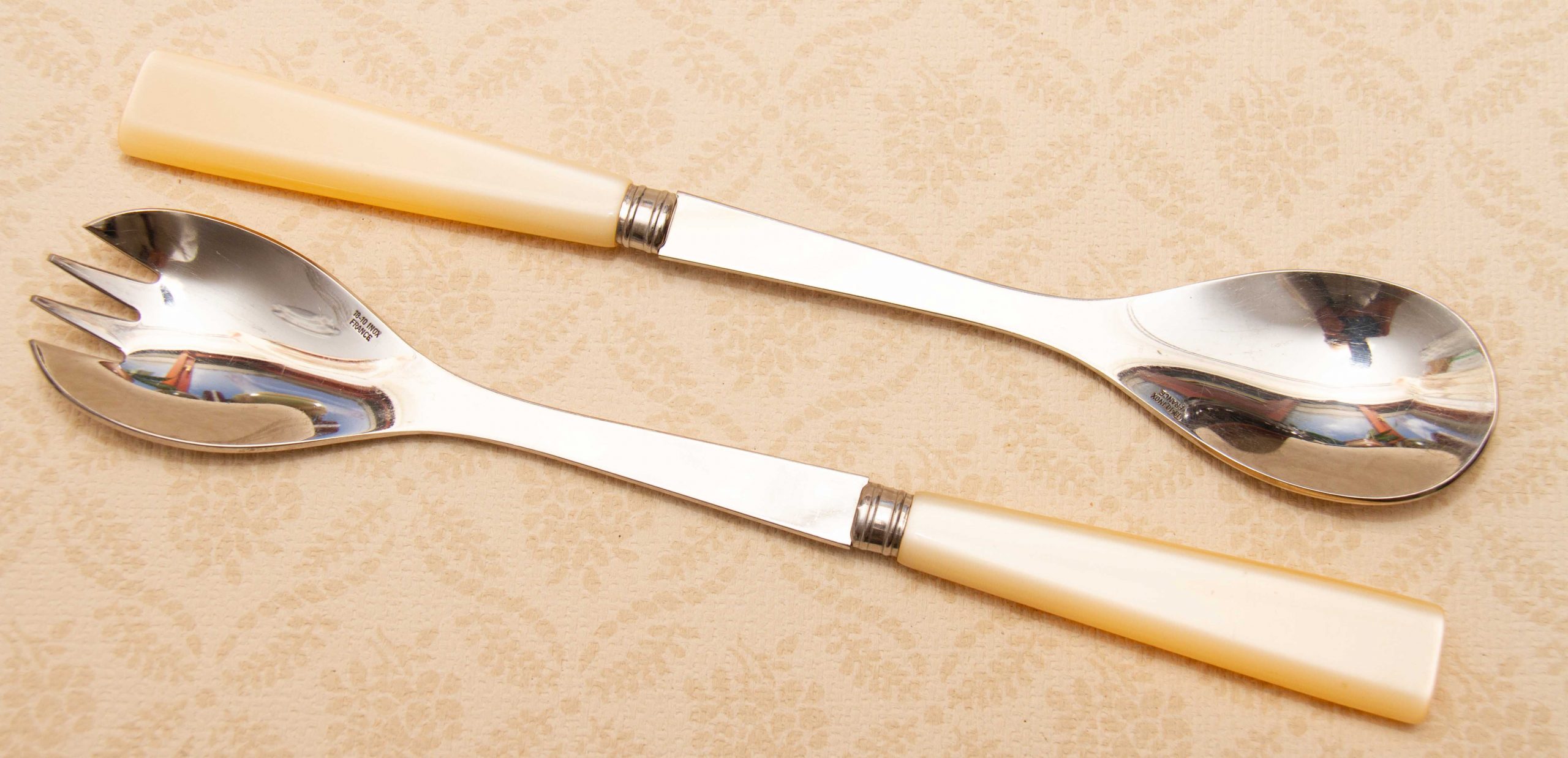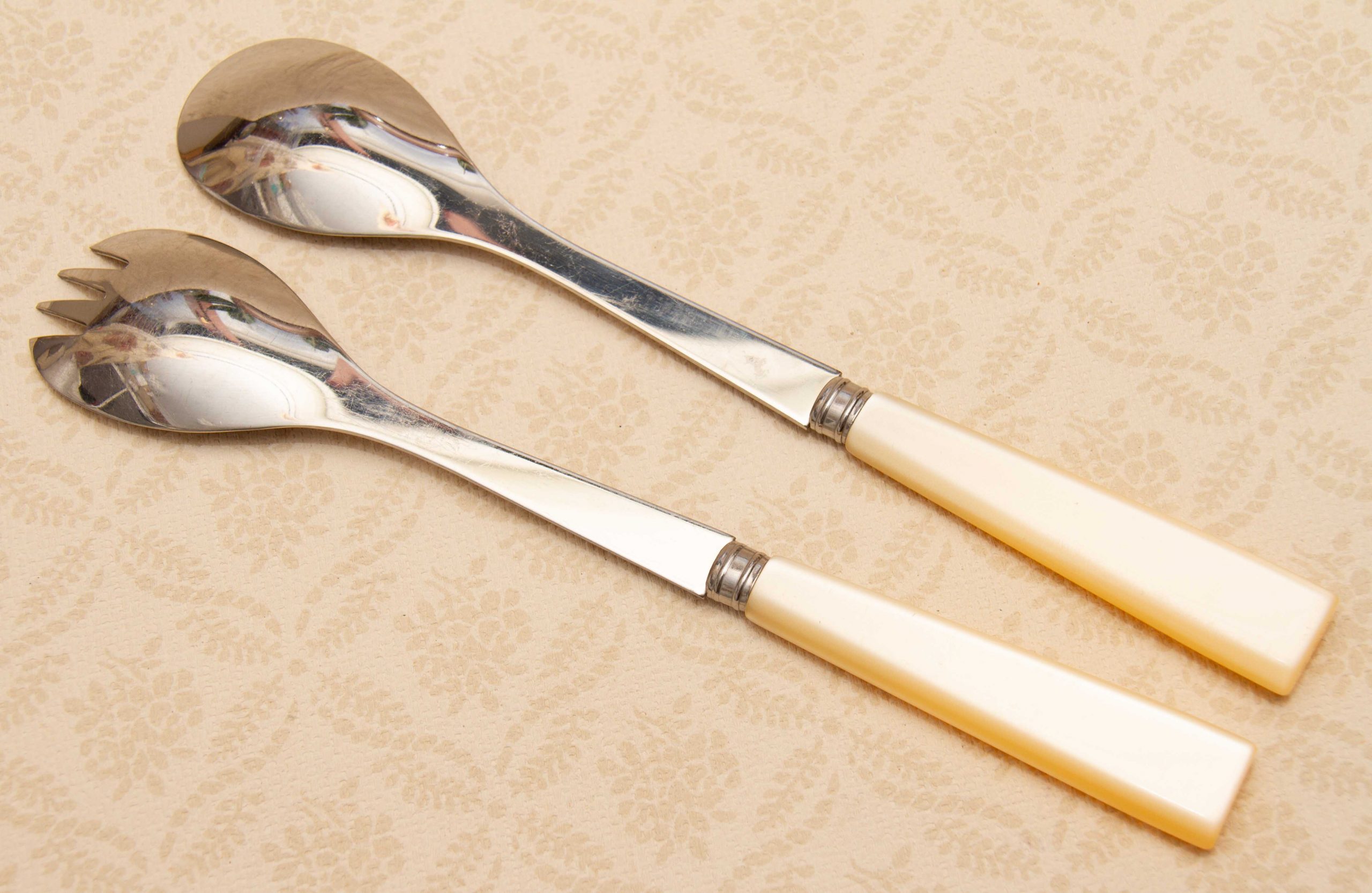 A pair of good quality vintage Inox 18/10 stainless steel spoon and fork style salad servers with wide mother of pearl style handles. Made in France