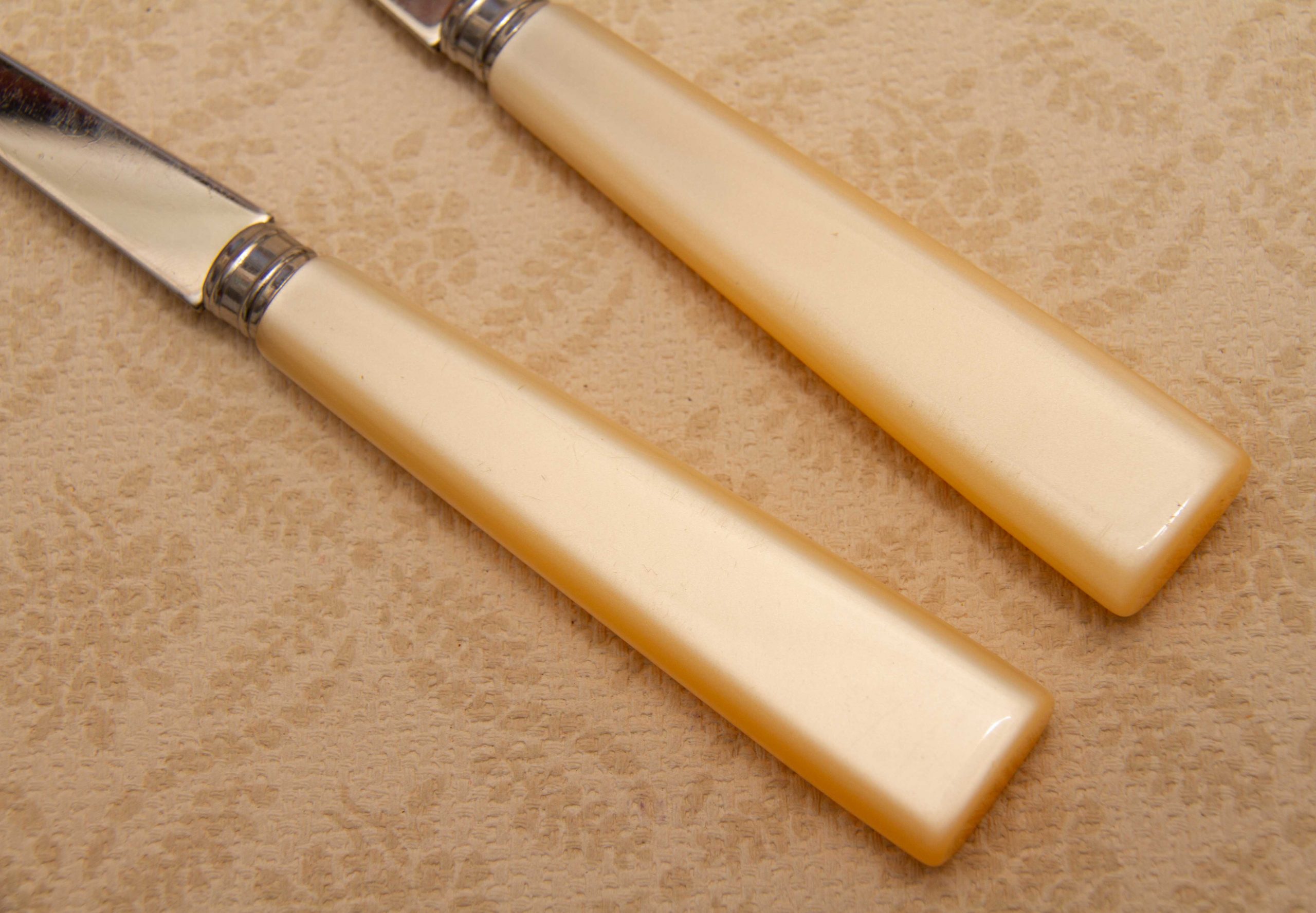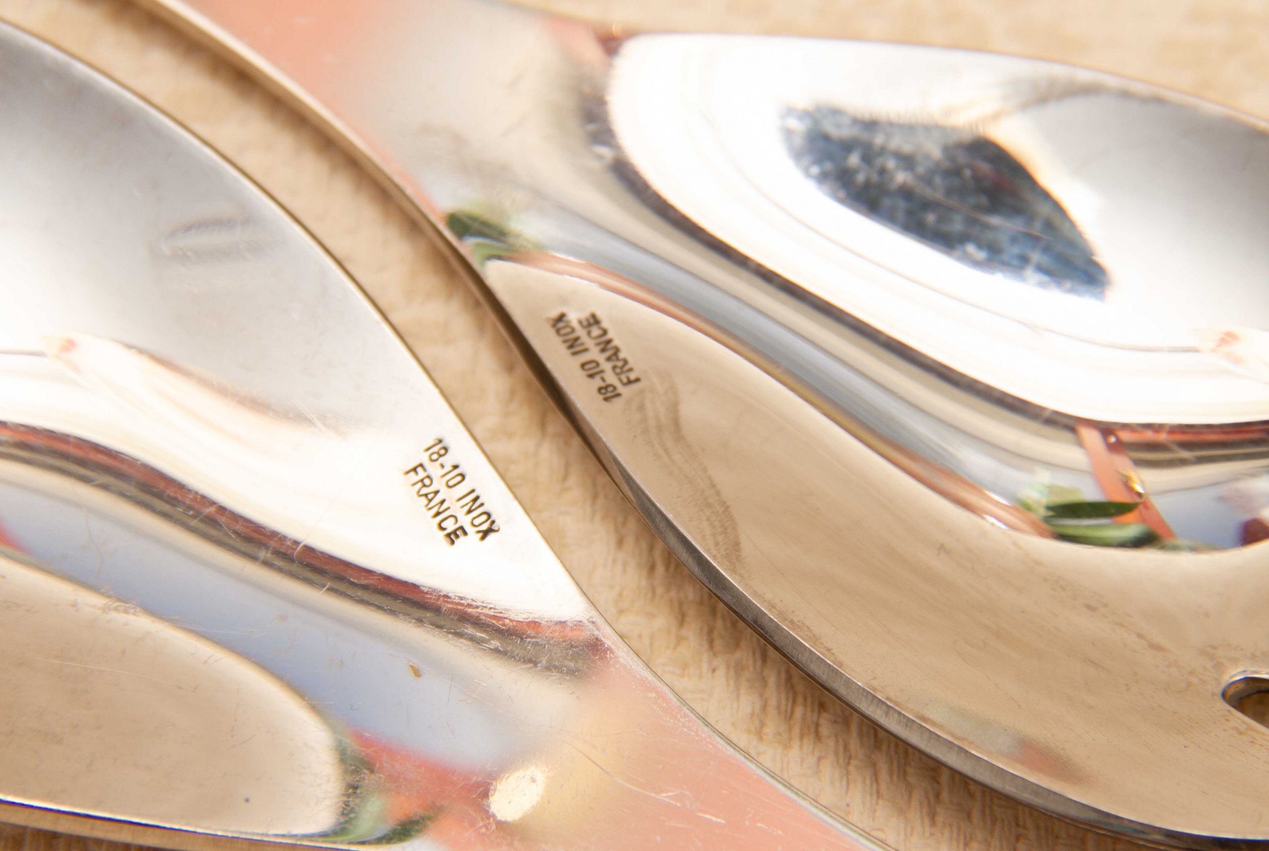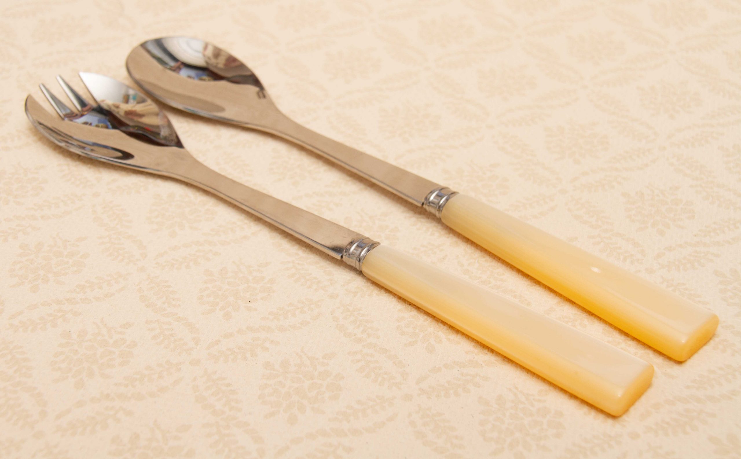 A pair of good quality vintage Inox 18/10 stainless steel spoon and fork style salad servers with wide mother of pearl style handles. Made in France