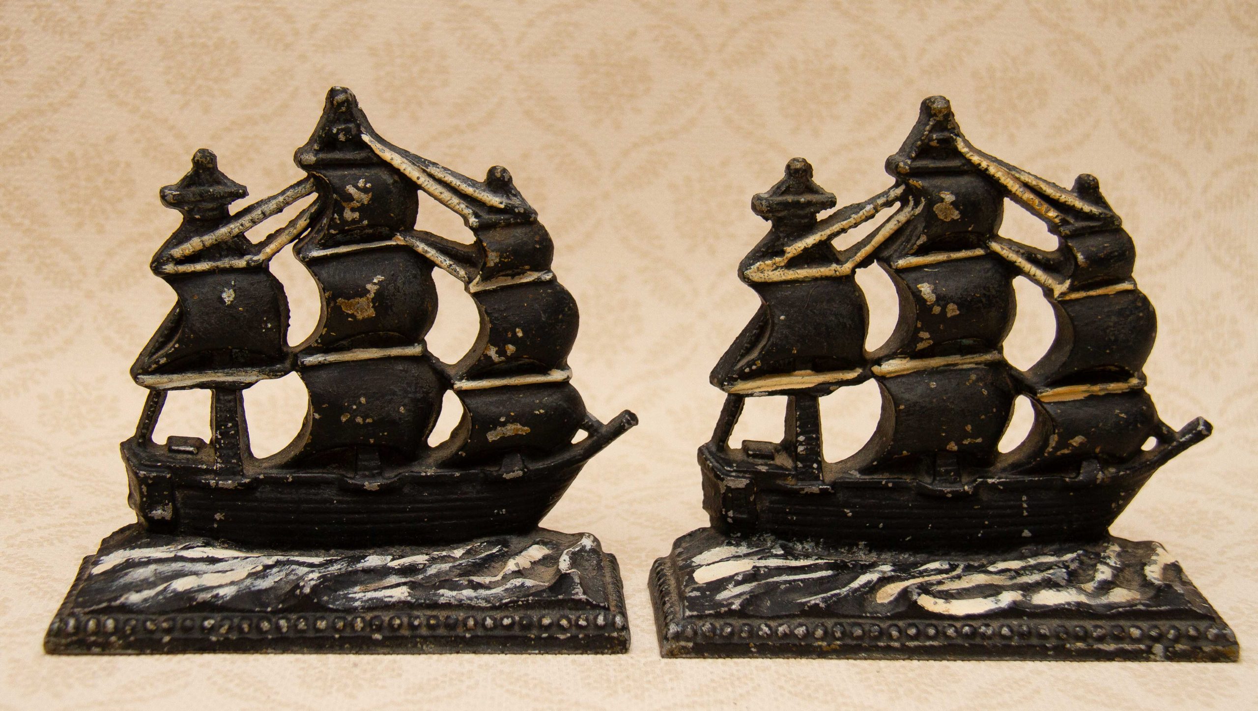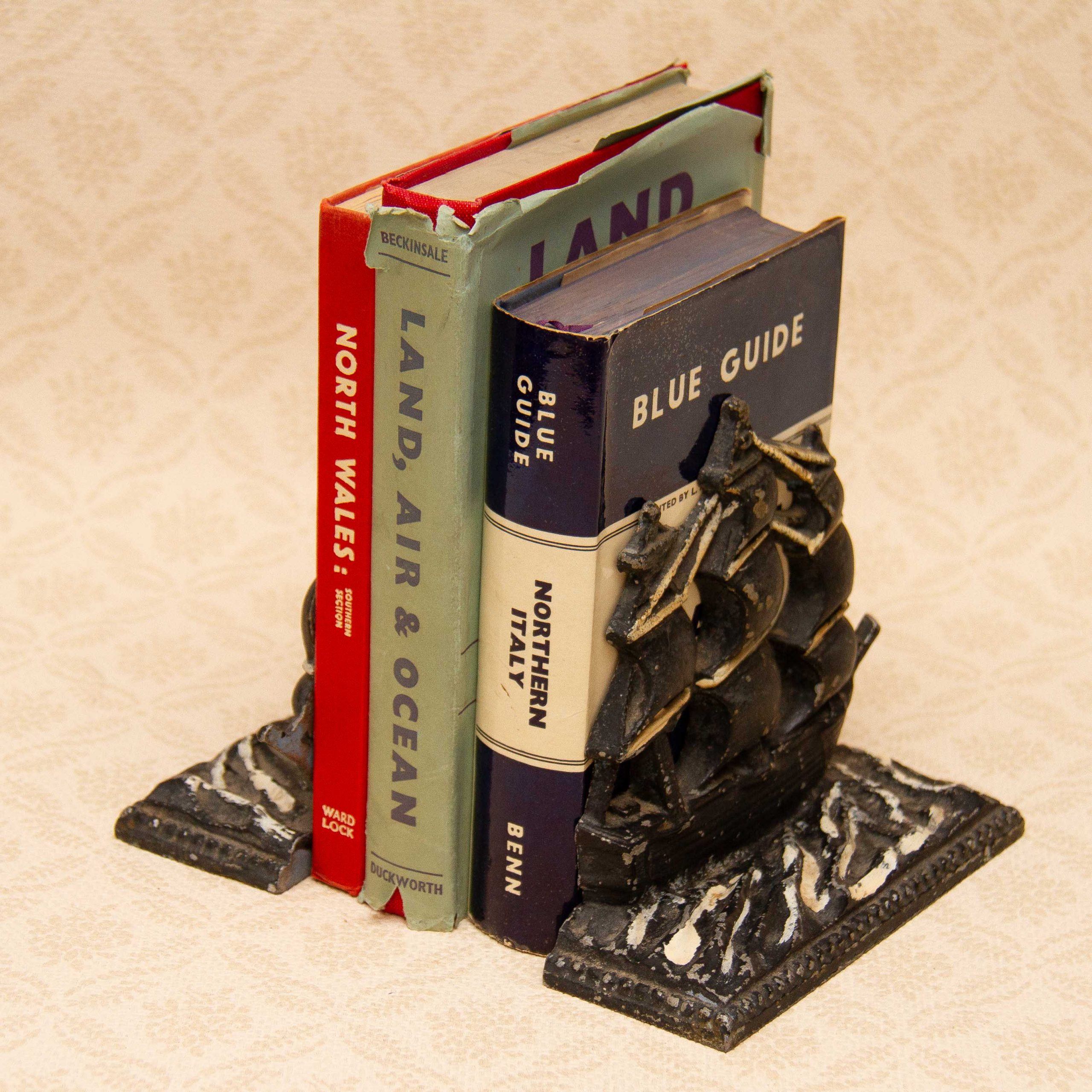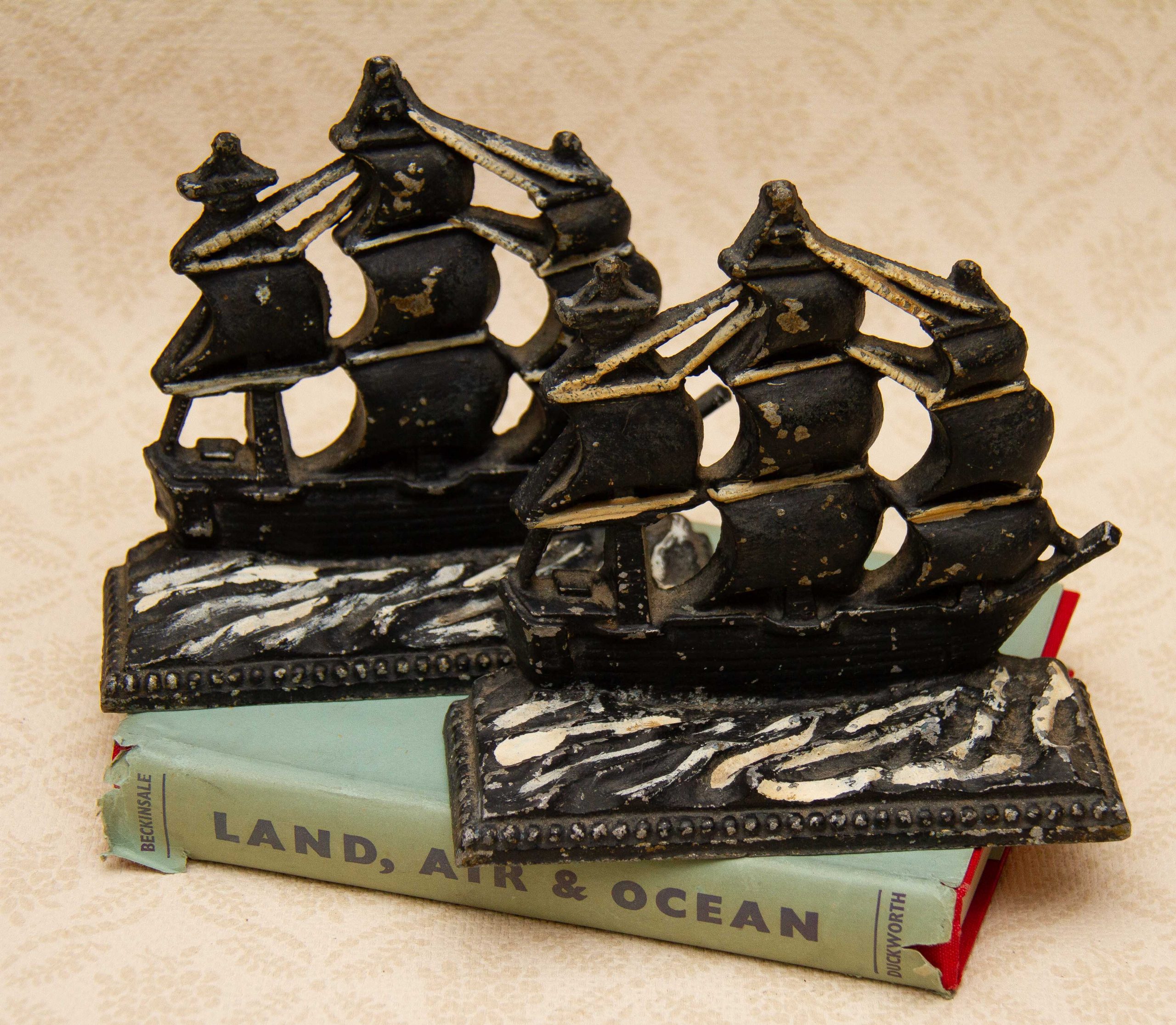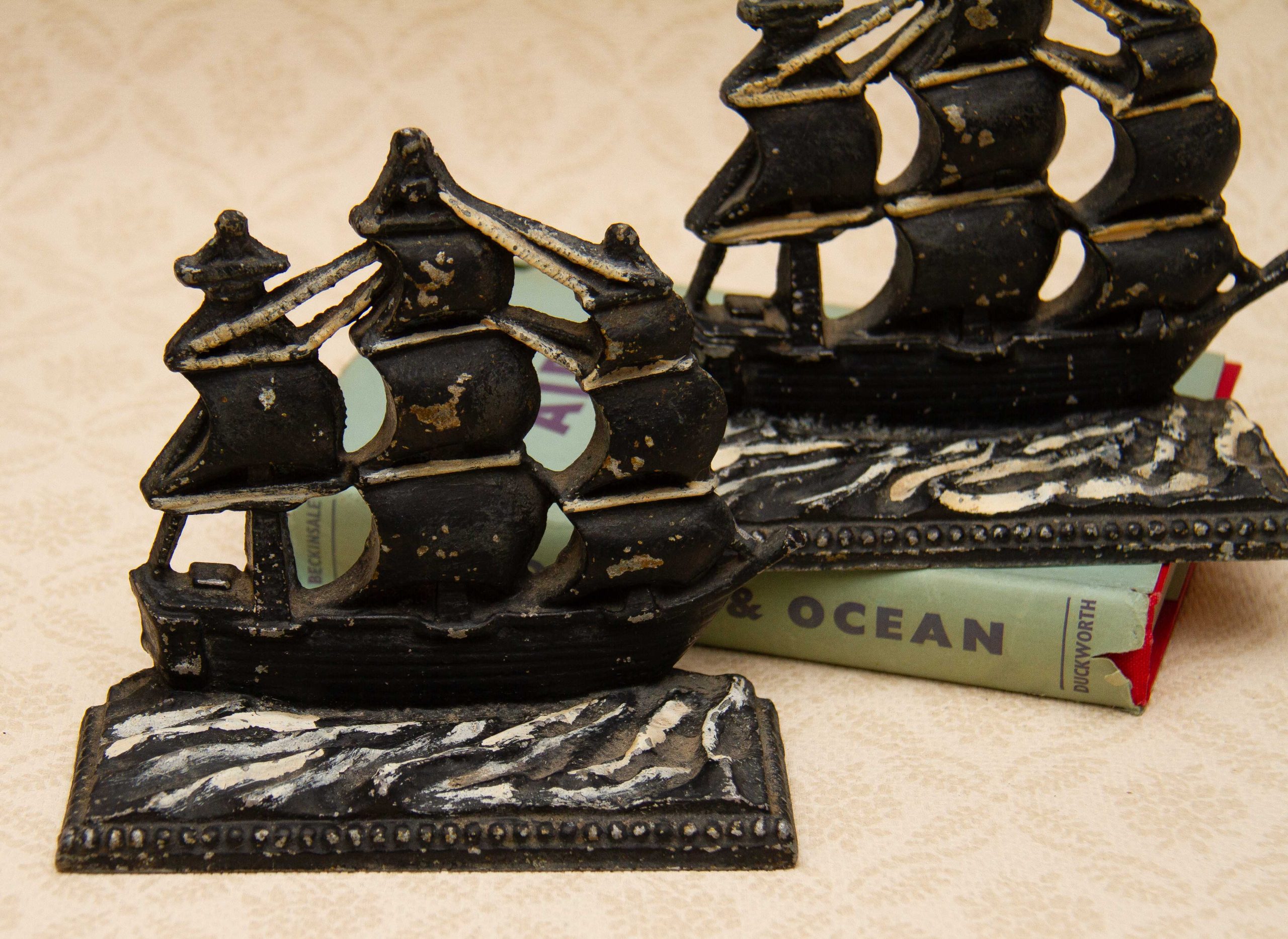 A pair of sailing ship cast iron vintage bookends, with a painted finish that has worn over time to give a distressed rustic look to them. These nautical themed bookends will add a bit of character to any book shelf.