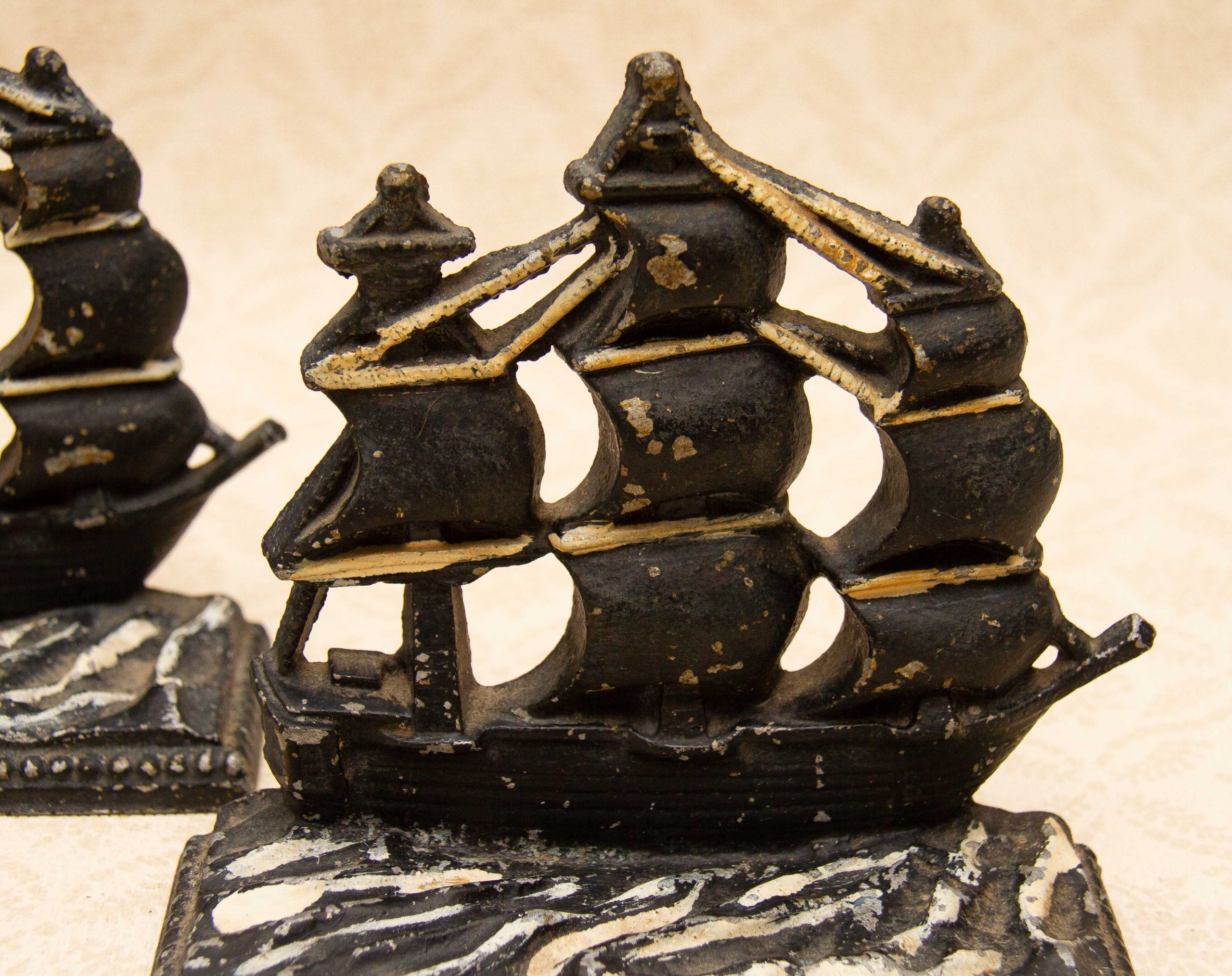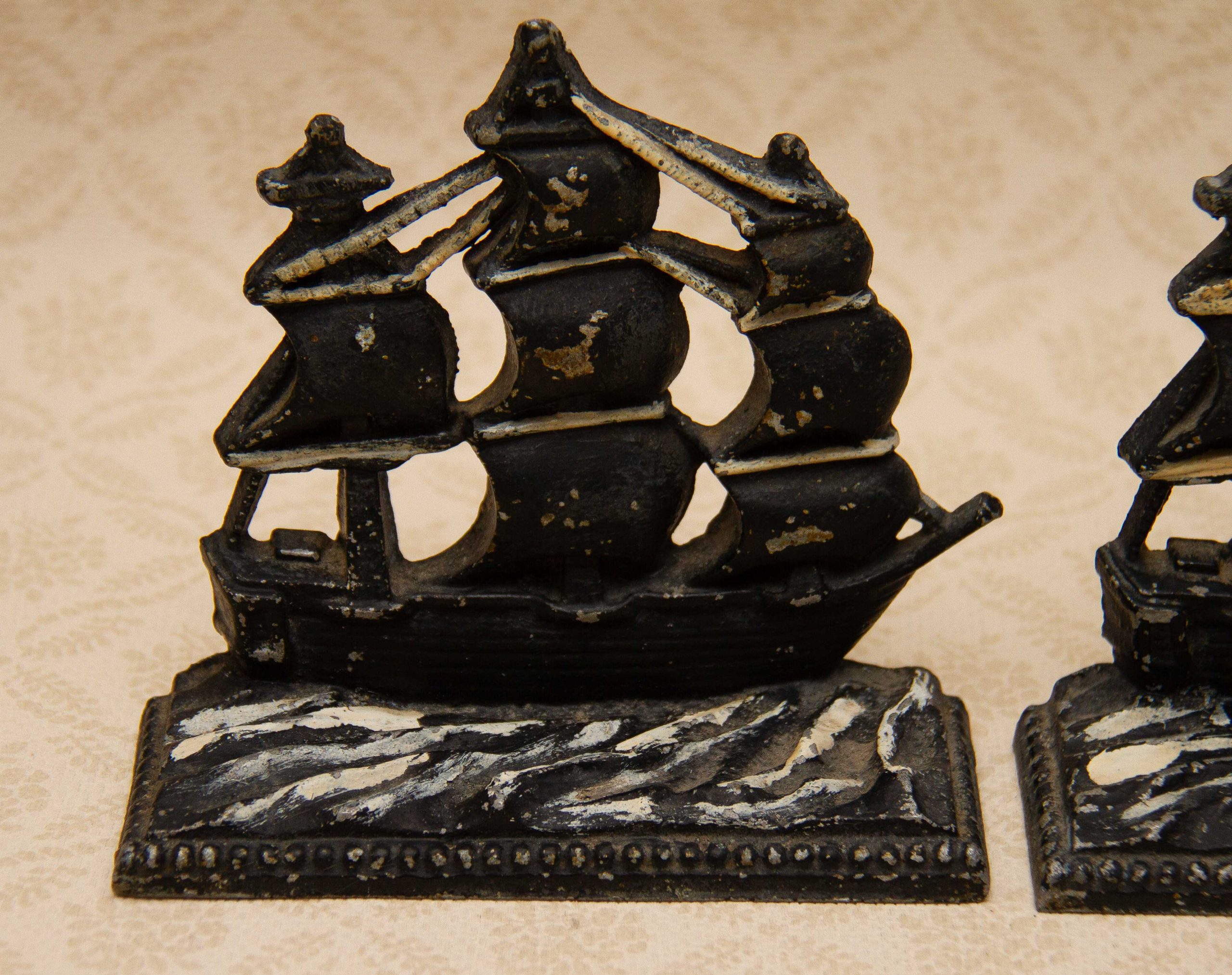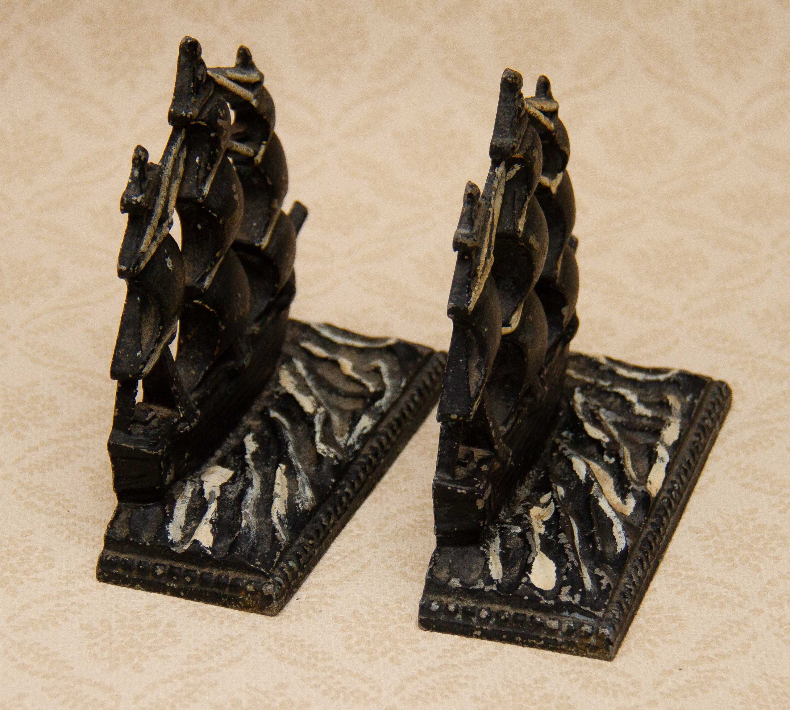A pair of sailing ship cast iron vintage bookends, with a painted finish that has worn over time to give a distressed rustic look to them. These nautical themed bookends will add a bit of character to any book shelf.