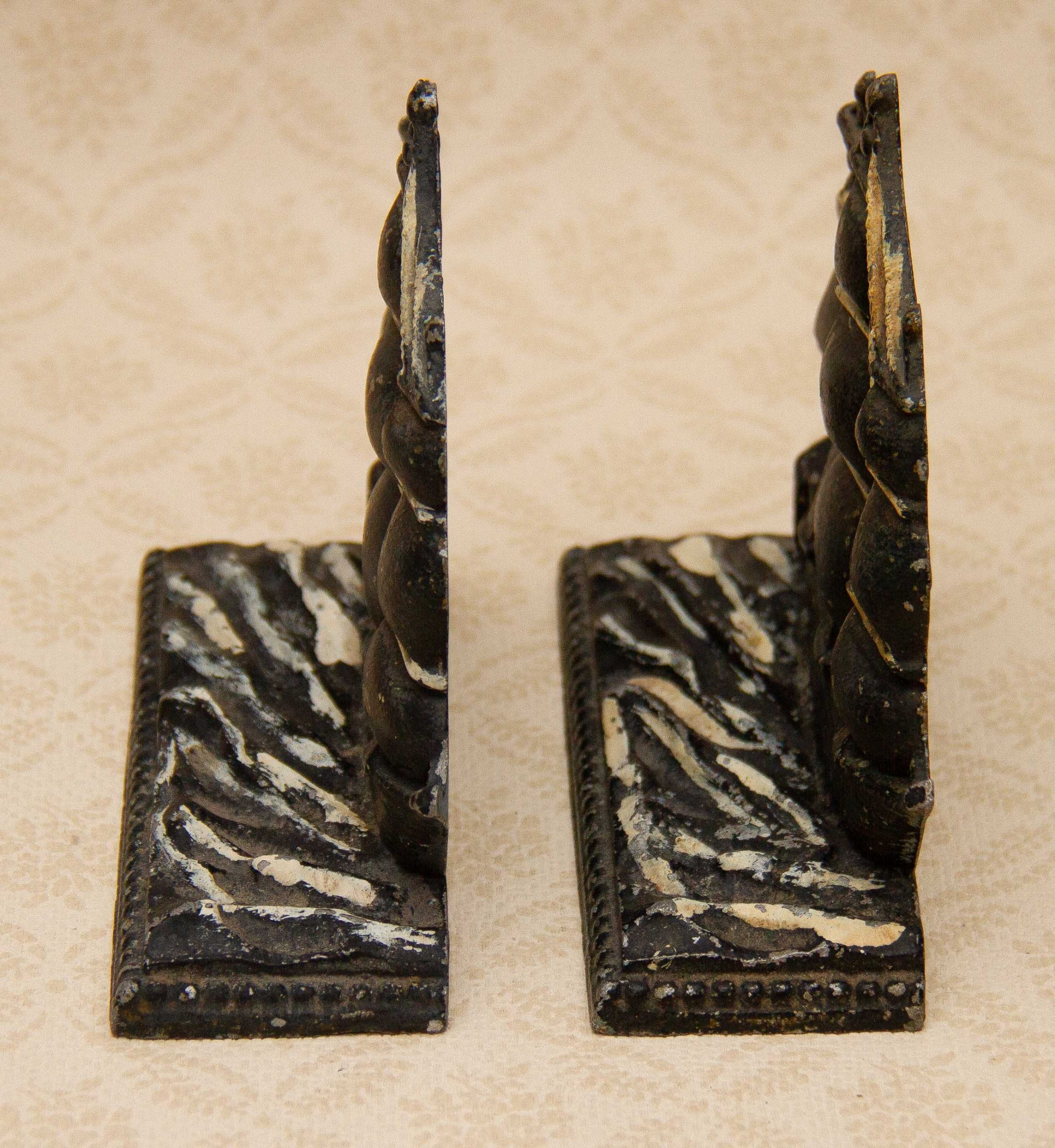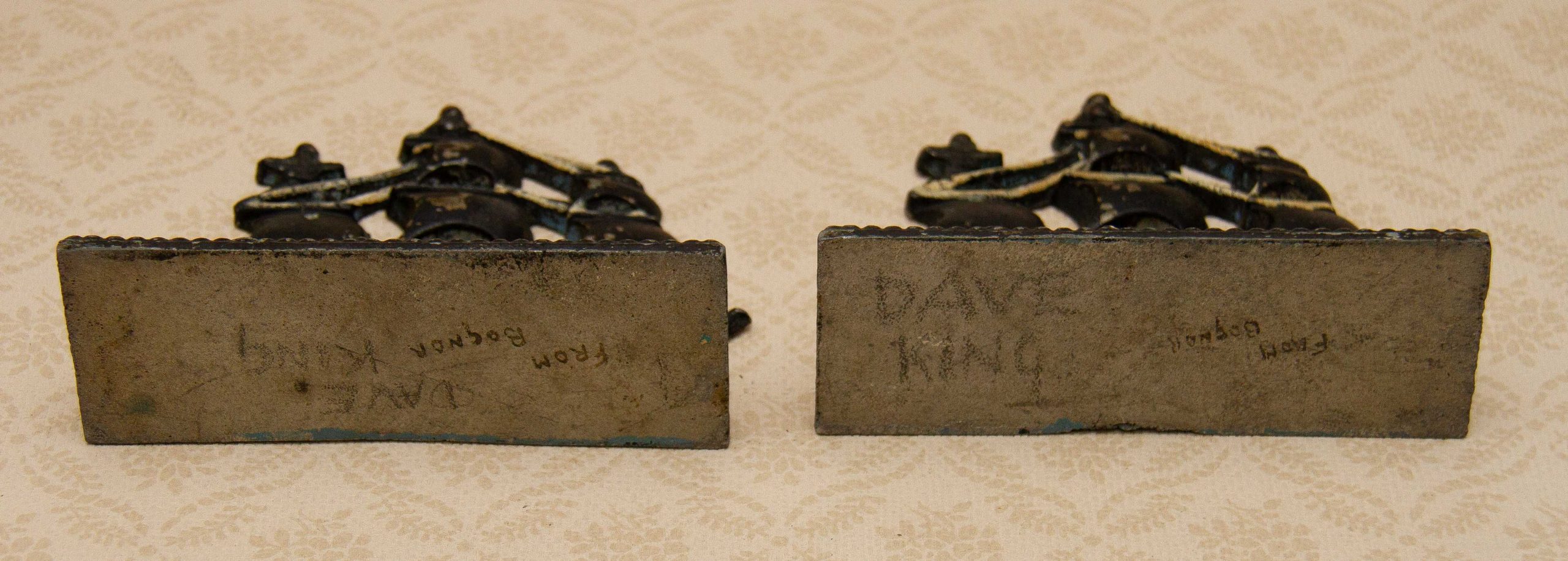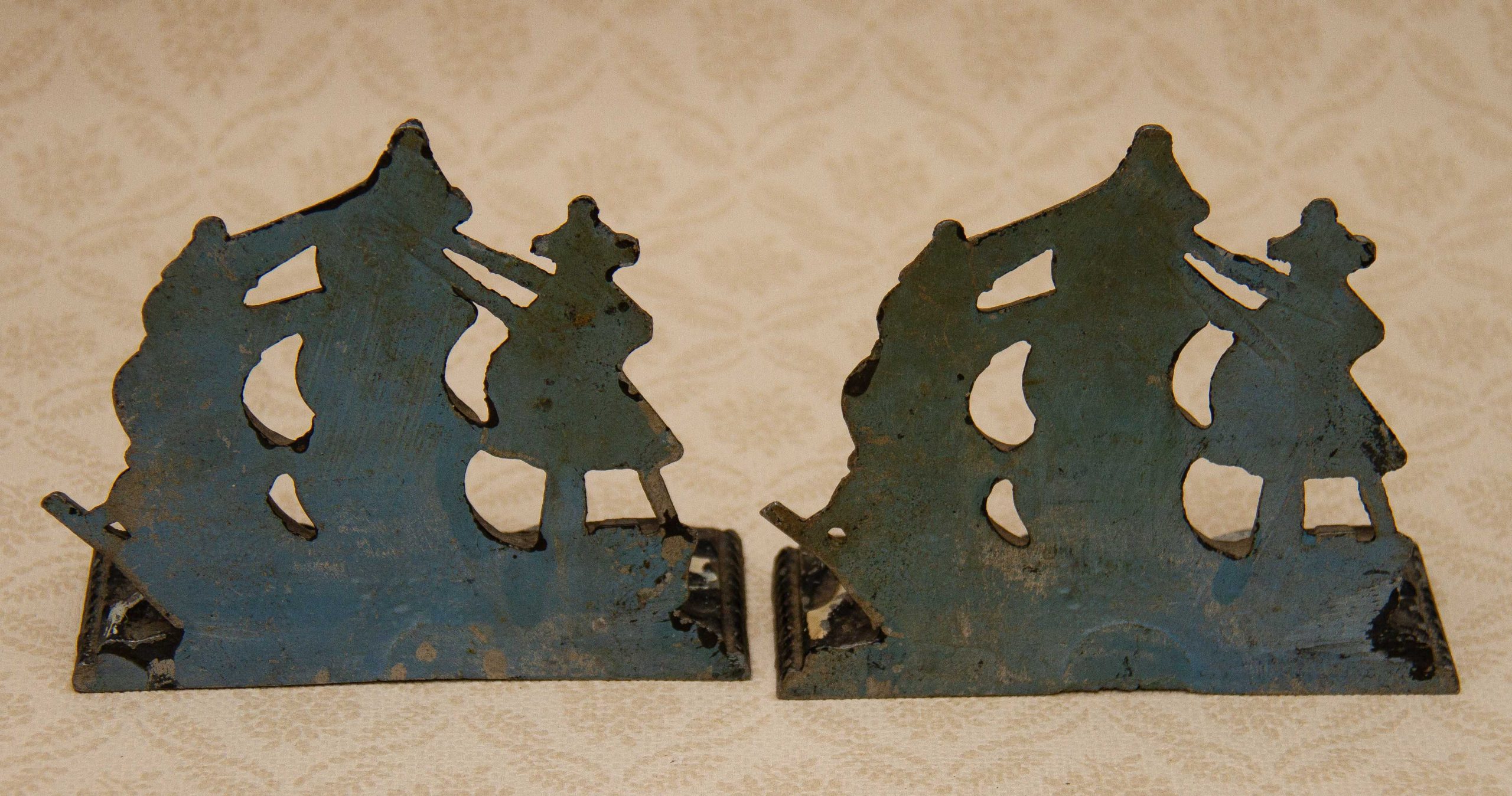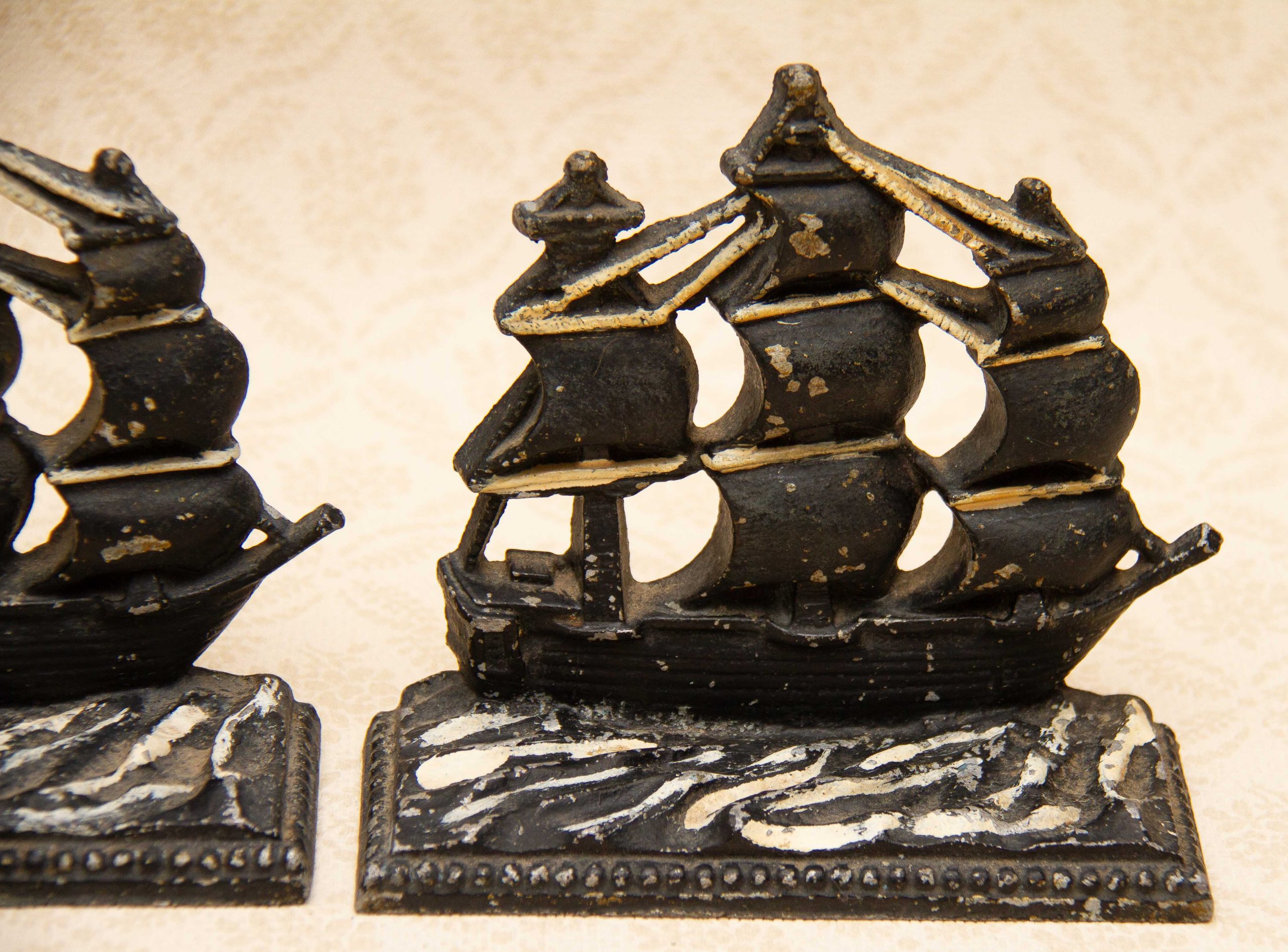 A pair of sailing ship cast iron vintage bookends, with a painted finish that has worn over time to give a distressed rustic look to them. These nautical themed bookends will add a bit of character to any book shelf.
