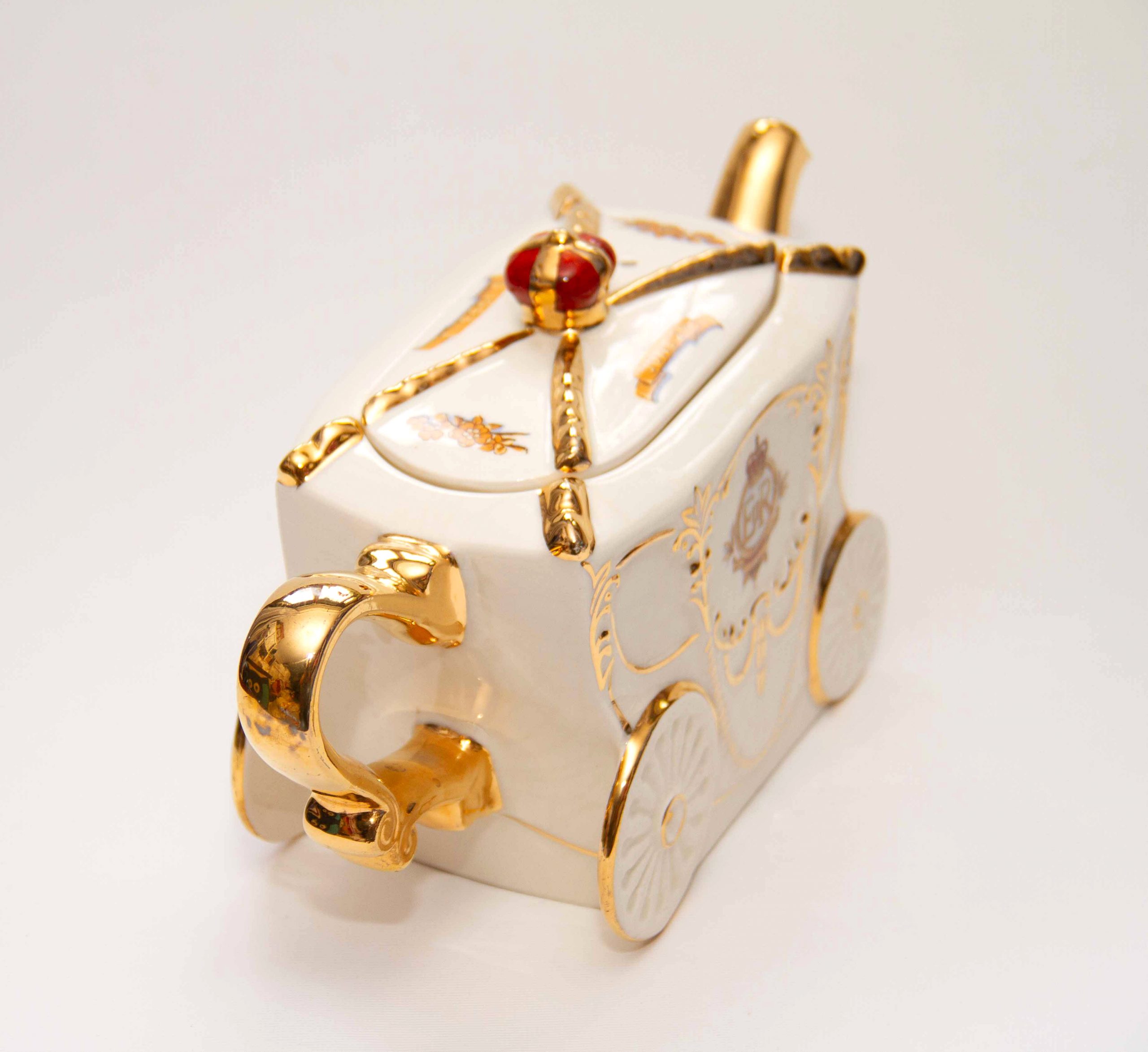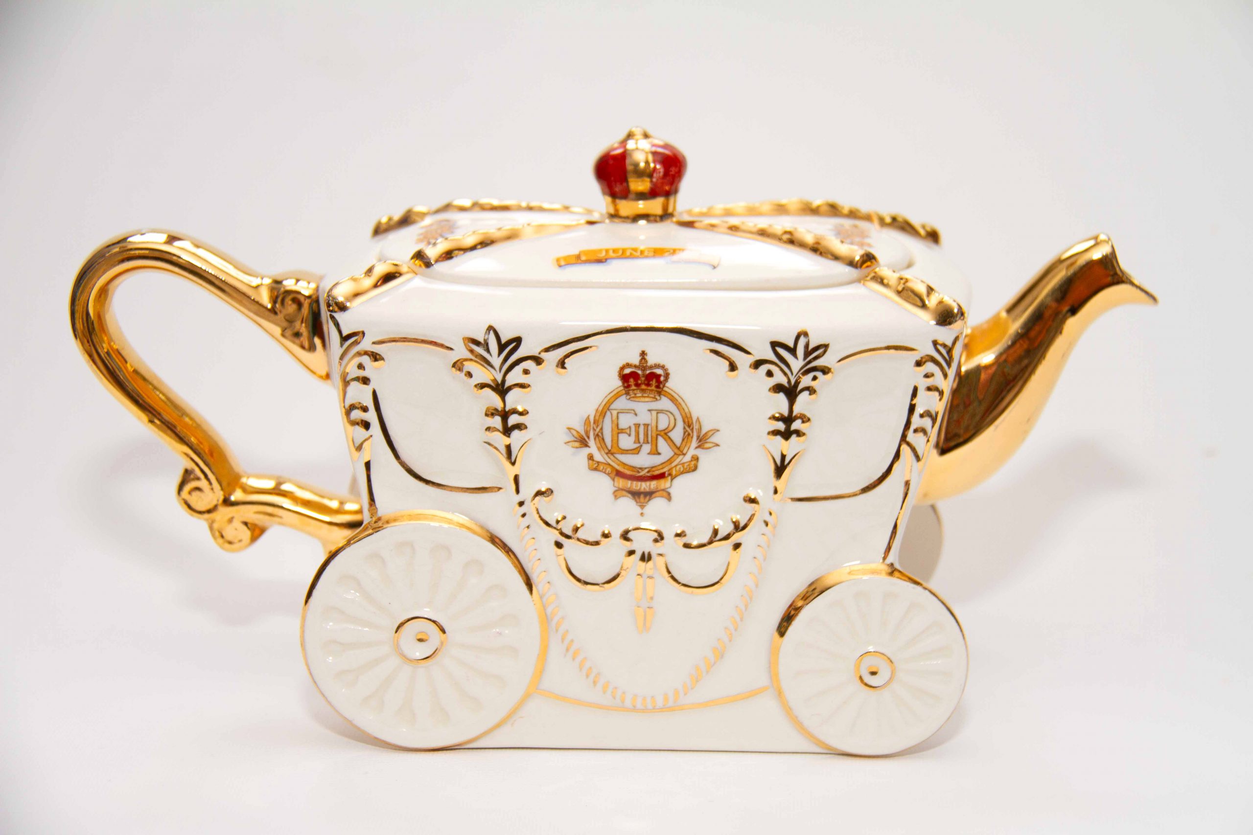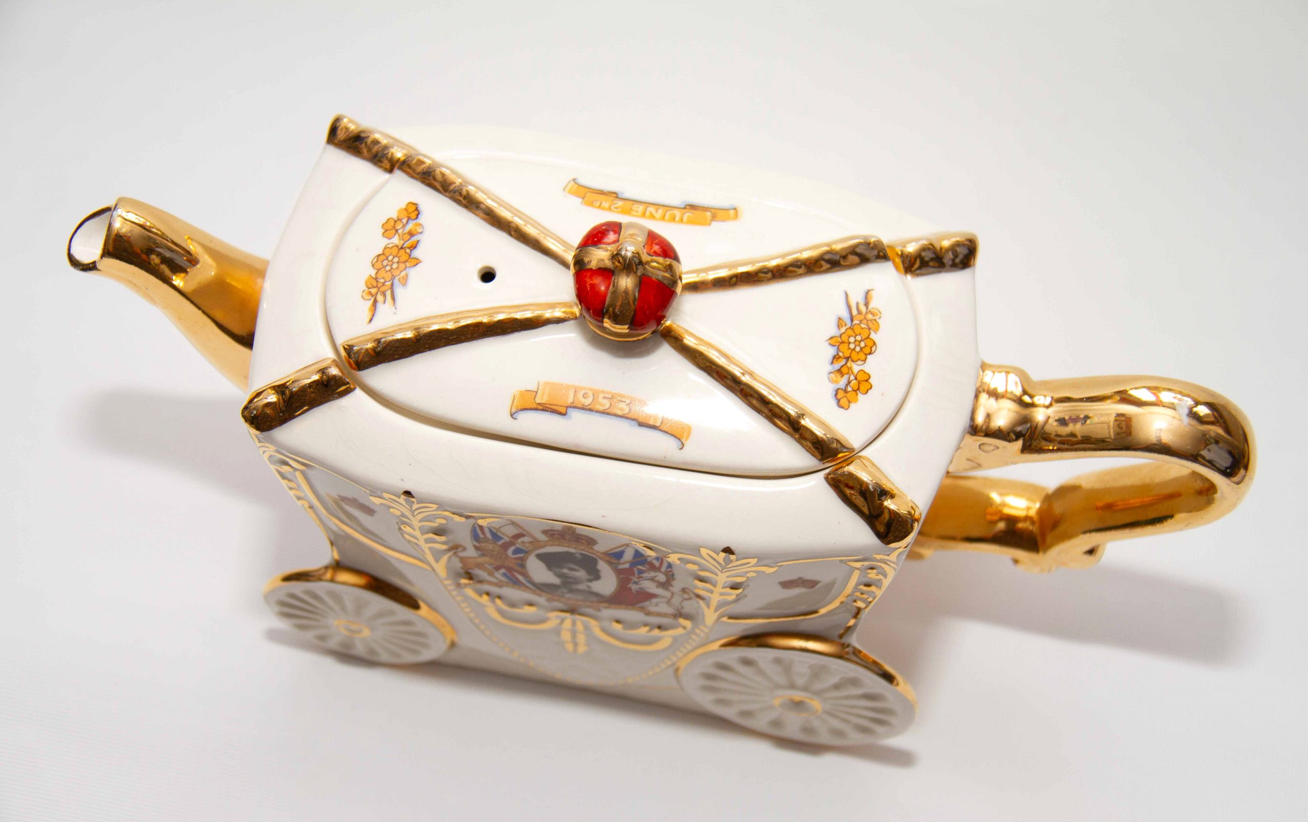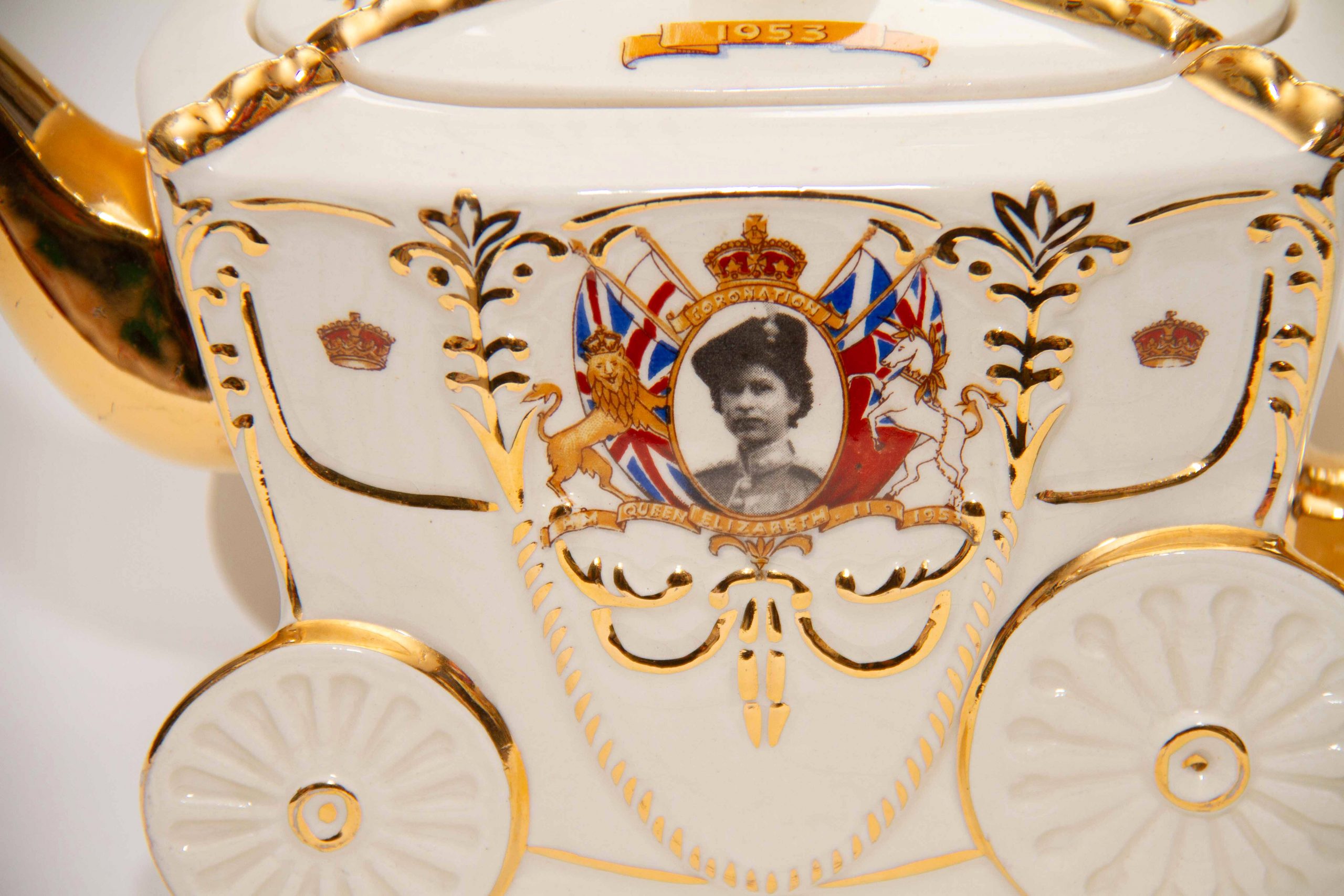 A Queen Elizabeth II 1953 Coronation commemorative teapot in the shape of the state coach. With gilding on the handle, spout and lid. Featuring a portrait of the Queen, a crown on the lid and decorated with British heraldry. A rare piece for Royal or teapot collectors. Made by Bancroft and Bennett – Garden House Pottery Stoke On Trent, England.