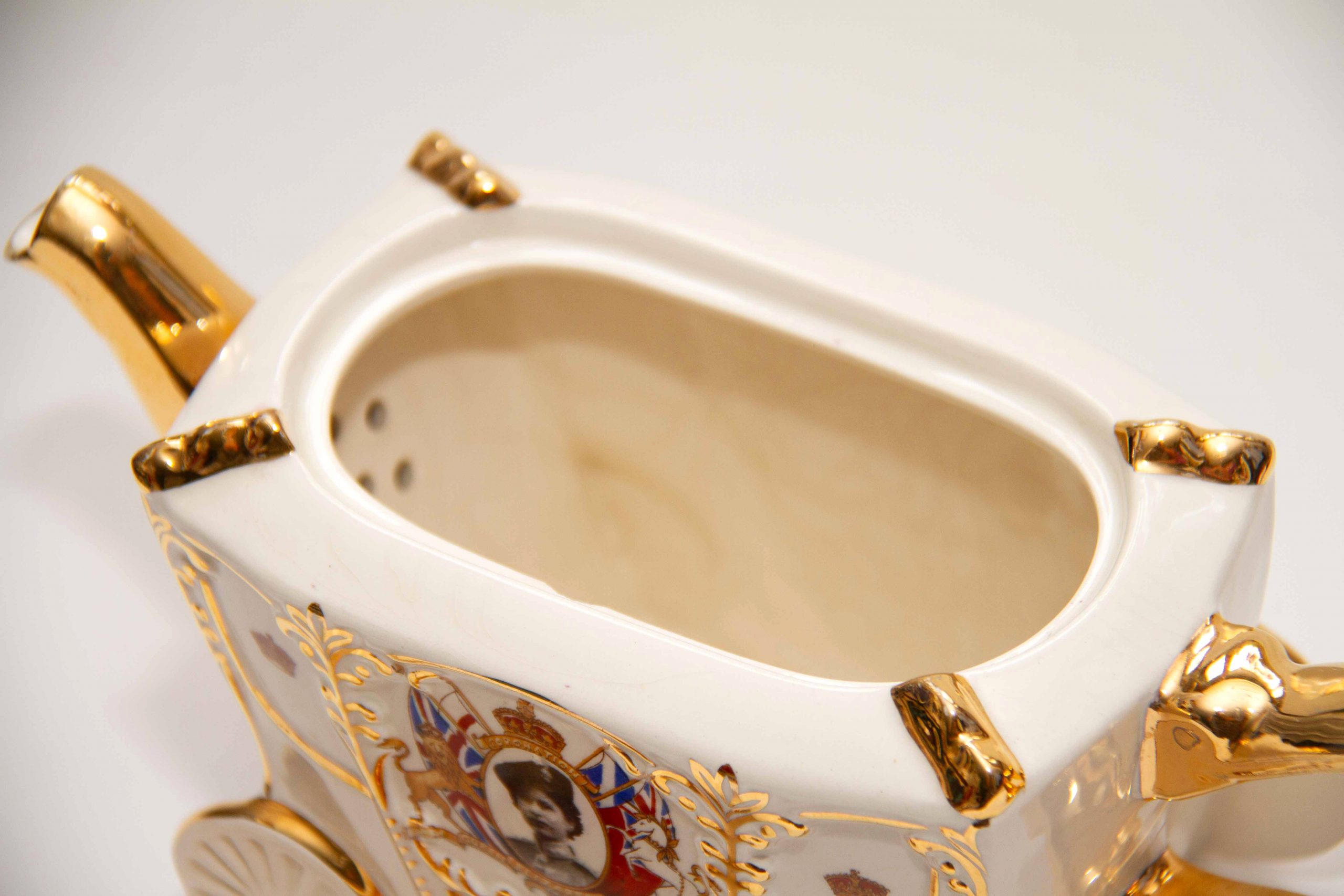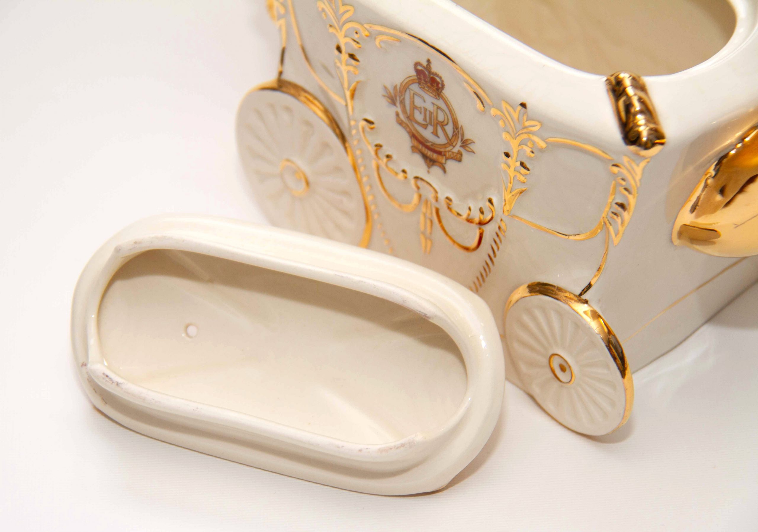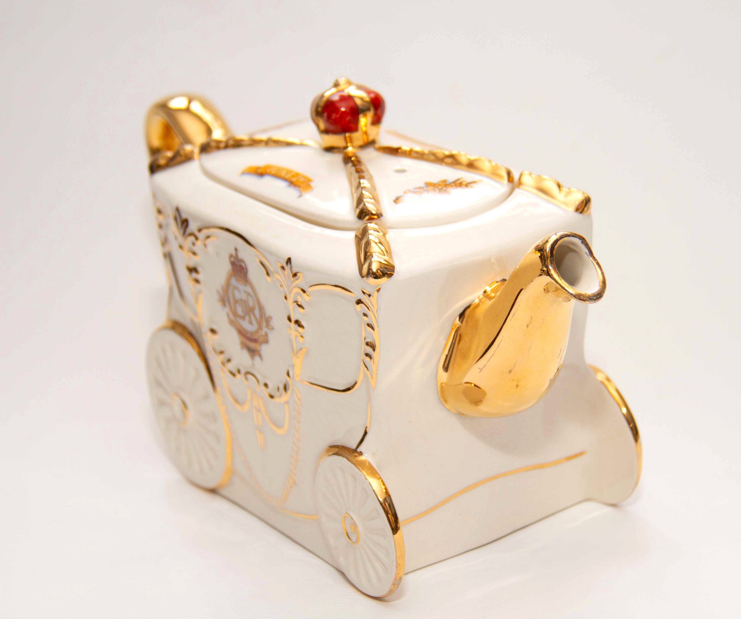 A Queen Elizabeth II 1953 Coronation commemorative teapot in the shape of the state coach. With gilding on the handle, spout and lid. Featuring a portrait of the Queen, a crown on the lid and decorated with British heraldry. A rare piece for Royal or teapot collectors. Made by Bancroft and Bennett – Garden House Pottery Stoke On Trent, England.