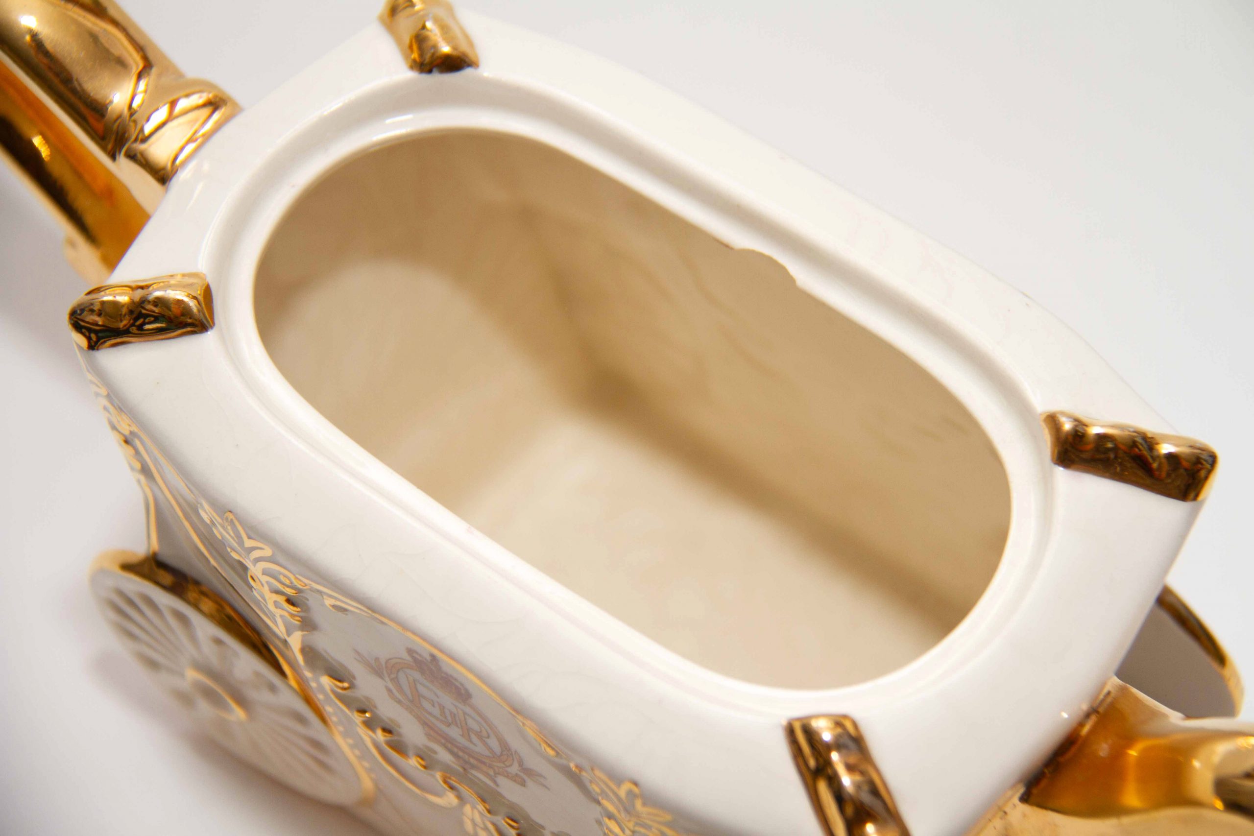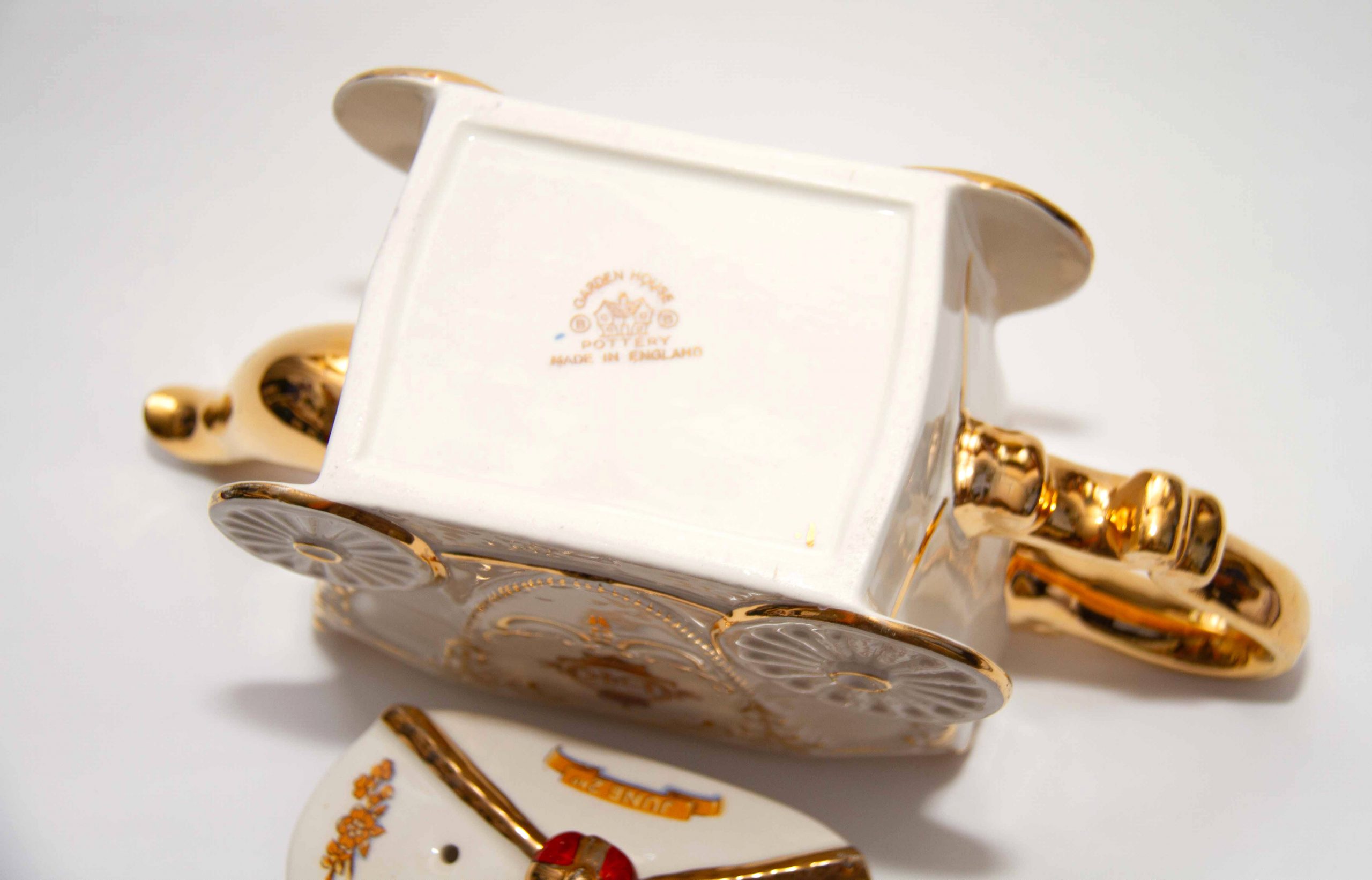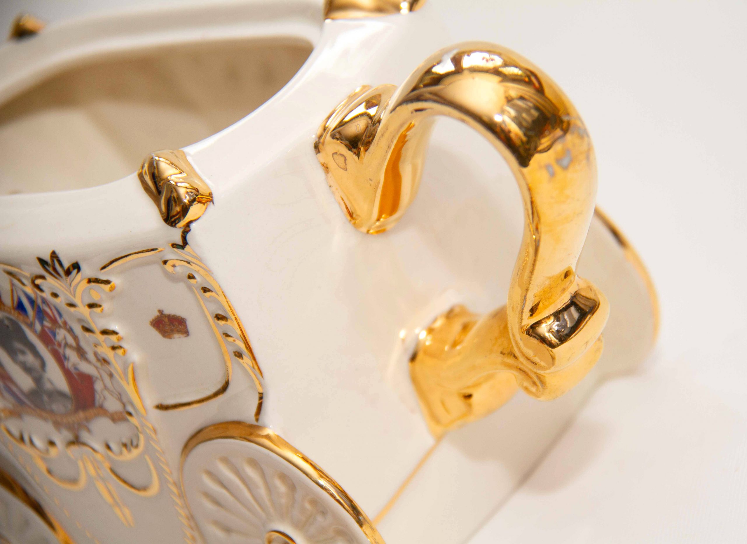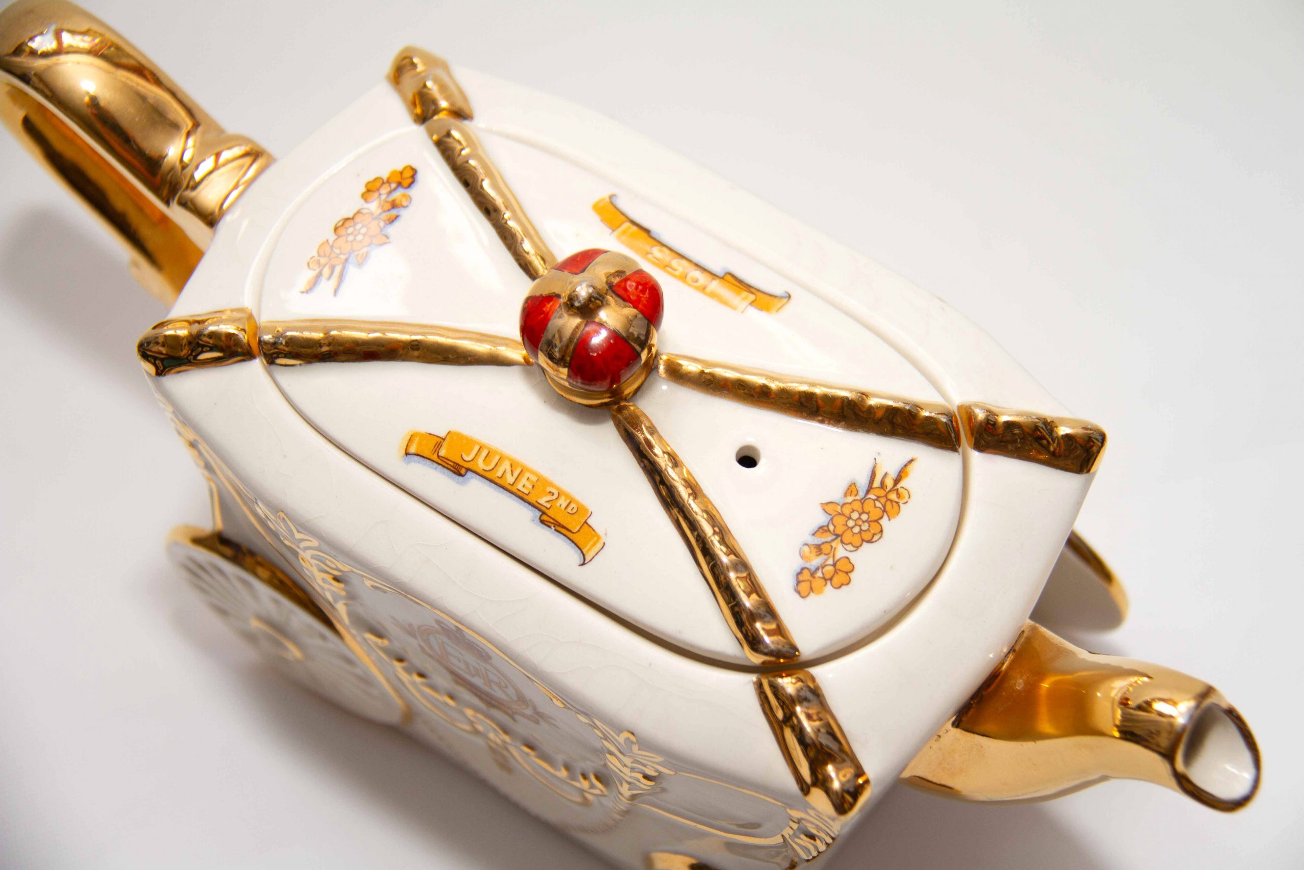 A Queen Elizabeth II 1953 Coronation commemorative teapot in the shape of the state coach. With gilding on the handle, spout and lid. Featuring a portrait of the Queen, a crown on the lid and decorated with British heraldry. A rare piece for Royal or teapot collectors. Made by Bancroft and Bennett – Garden House Pottery Stoke On Trent, England.