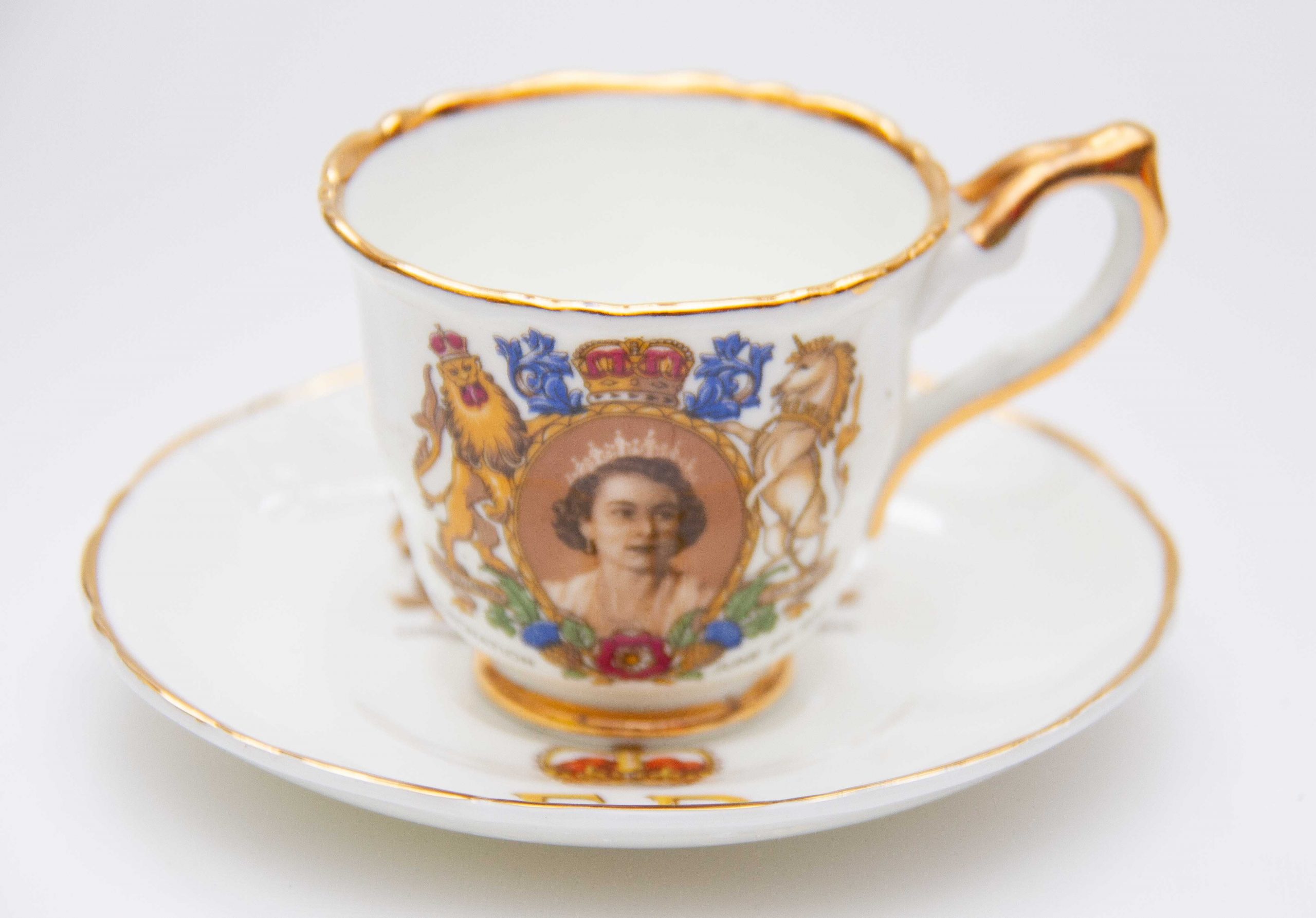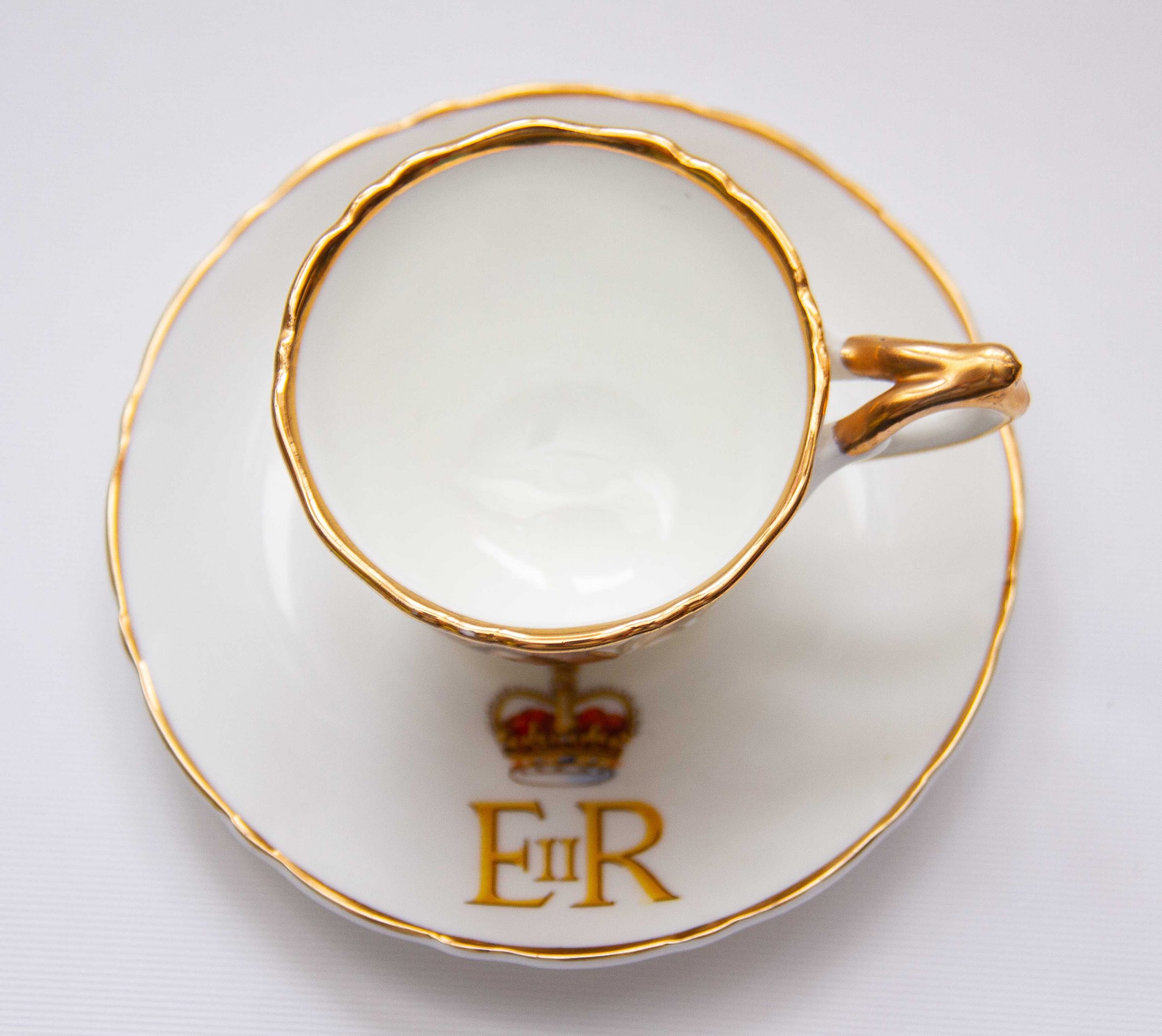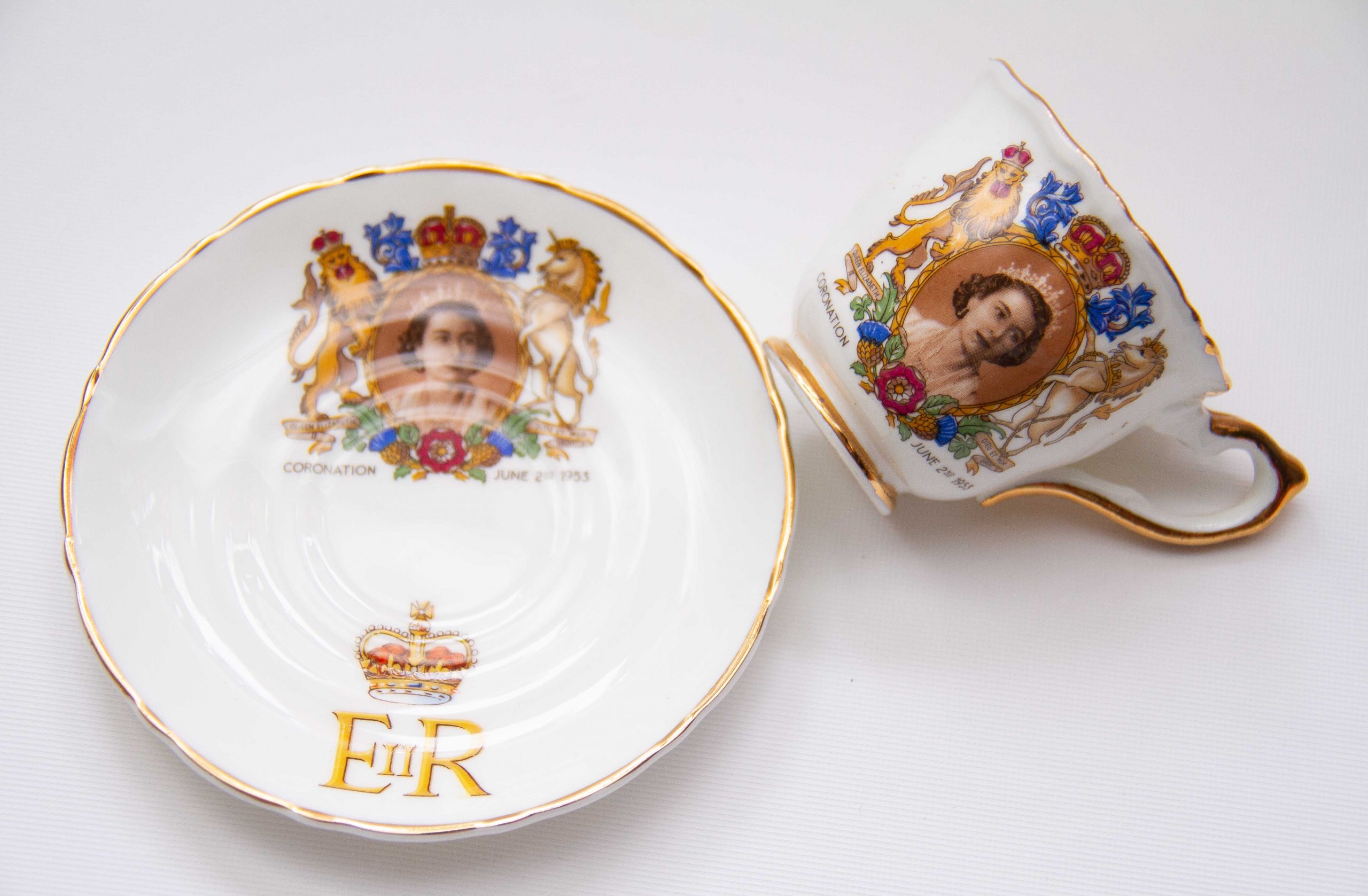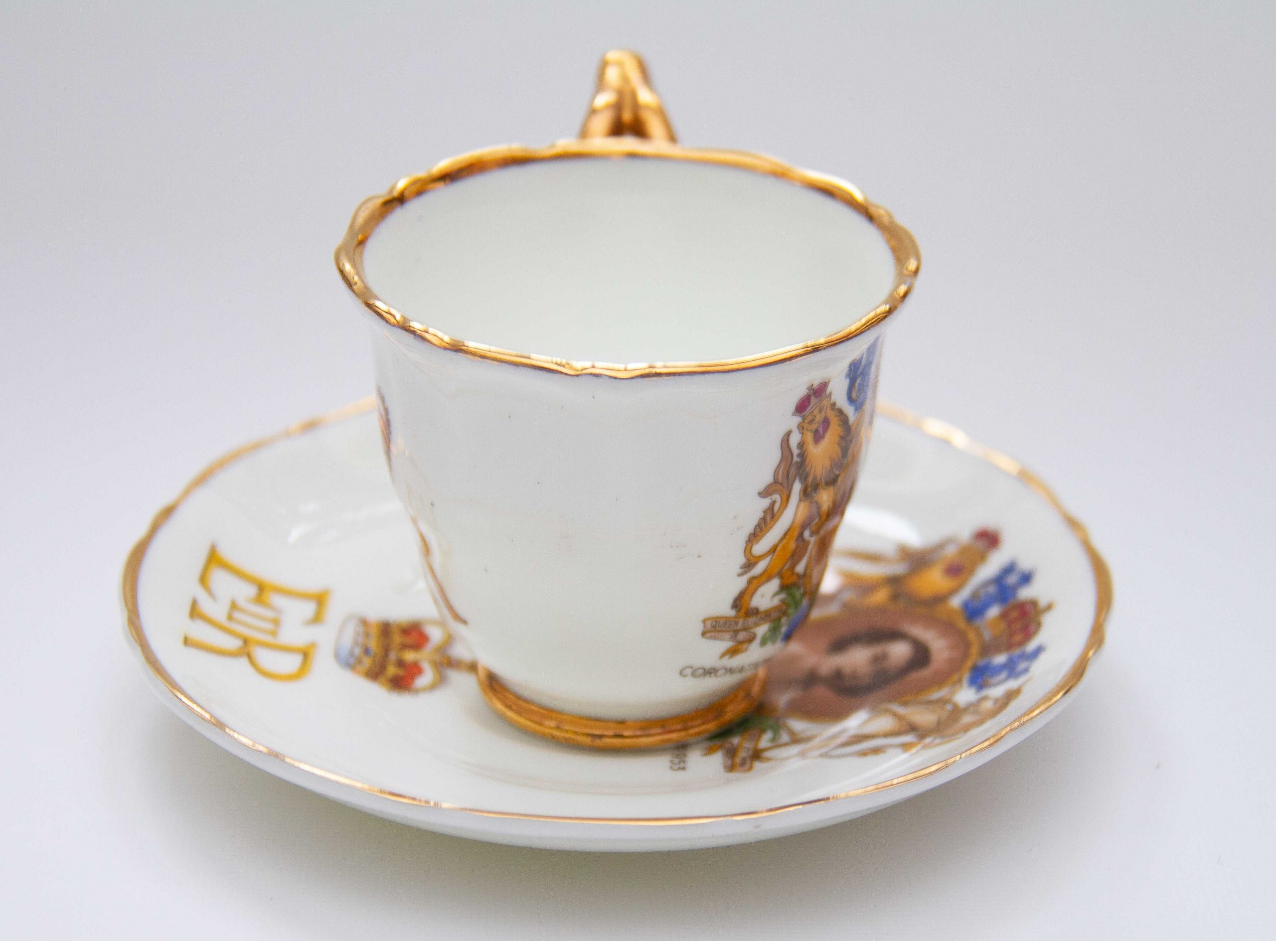 A Regency fine bone china cup and saucer with gold gilt edging, made to commemorate the Queen’s Coronation in 1953.