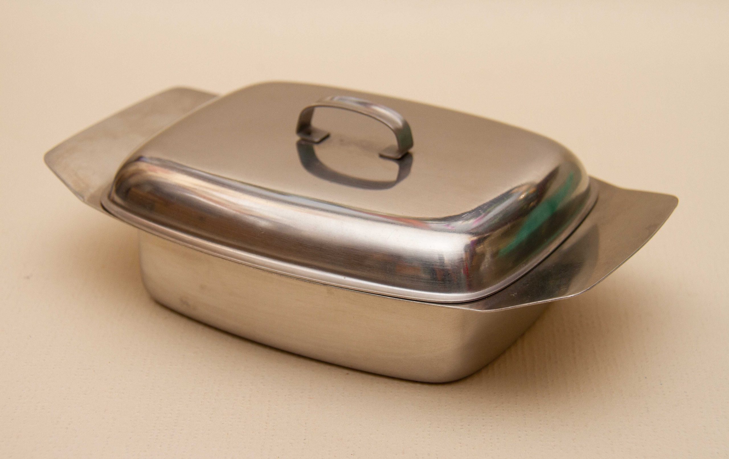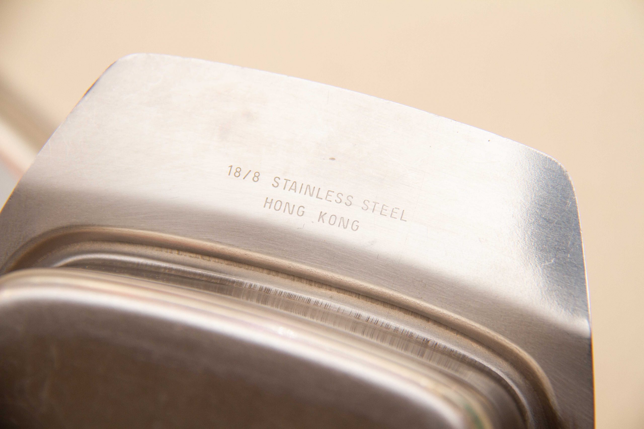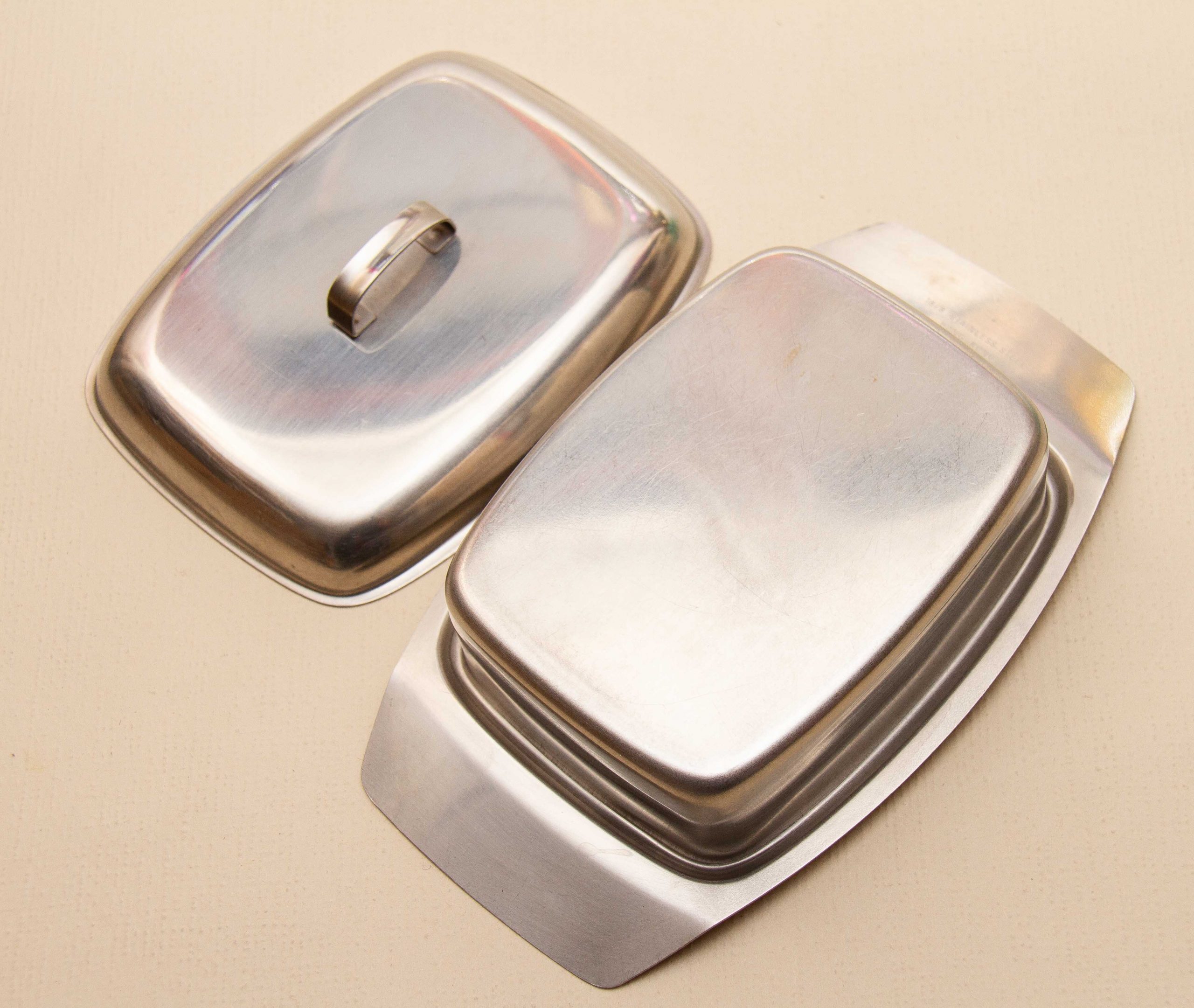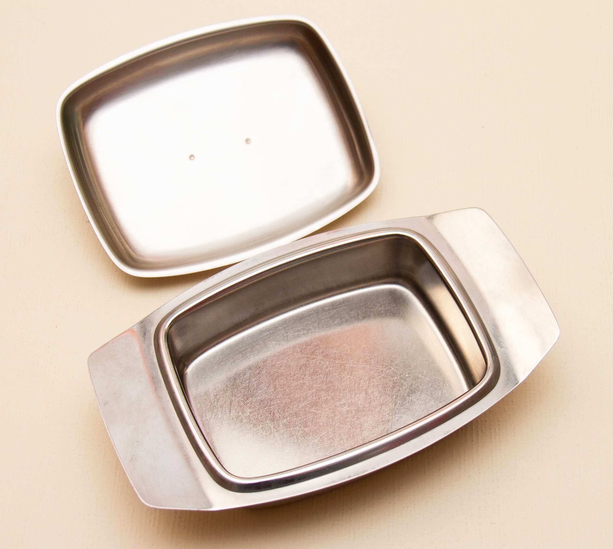 A vintage retro Stainless Steel butter dish with lid. The base is marked Hong Kong