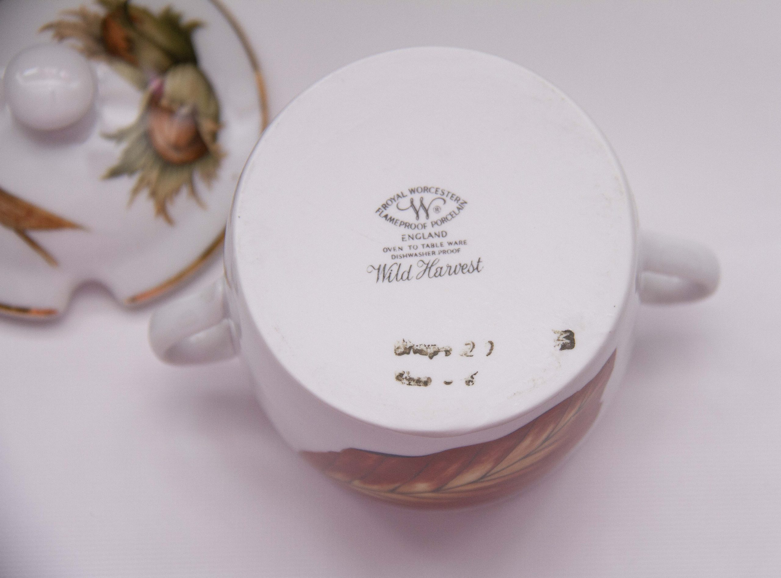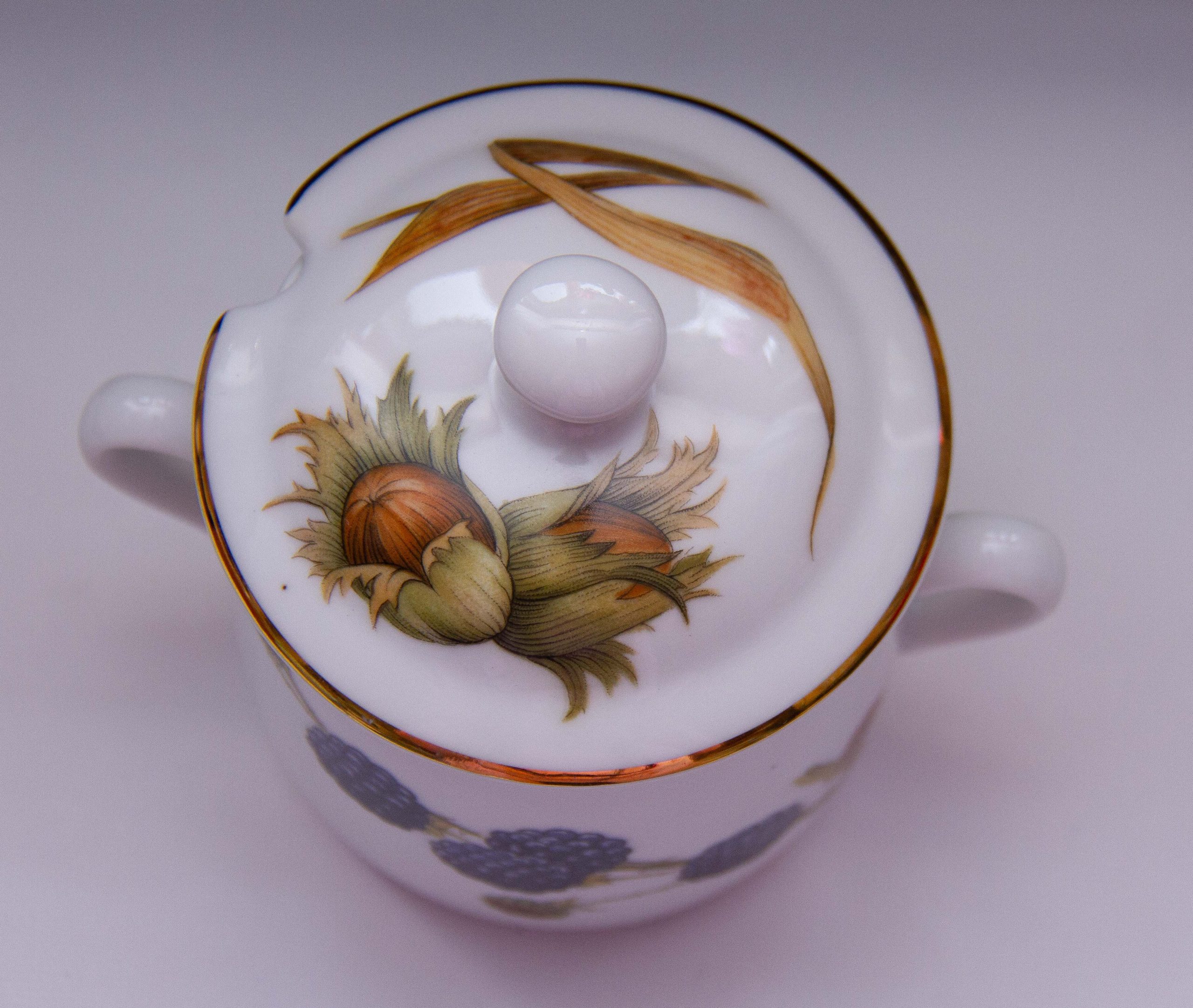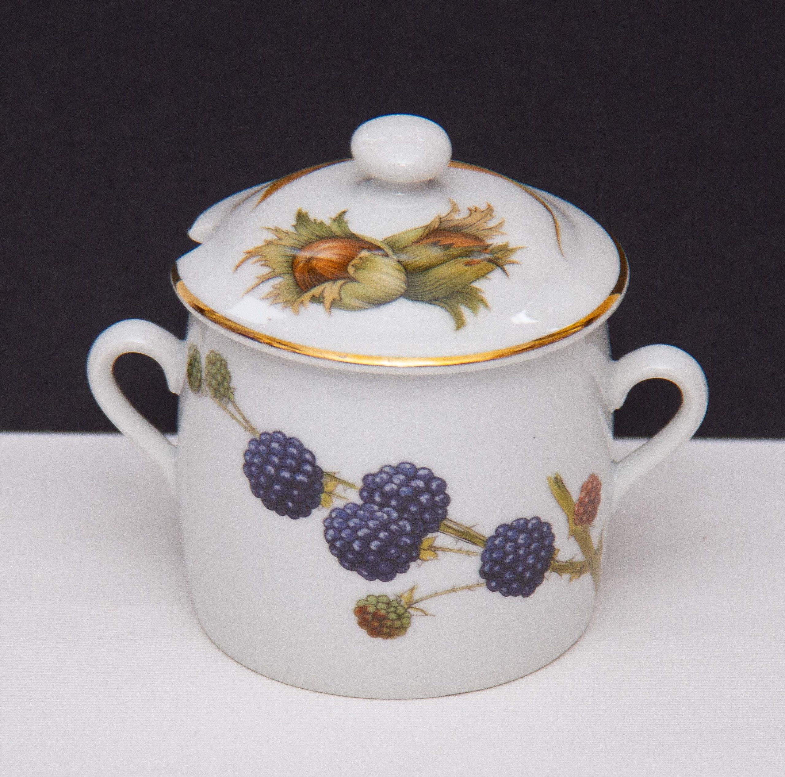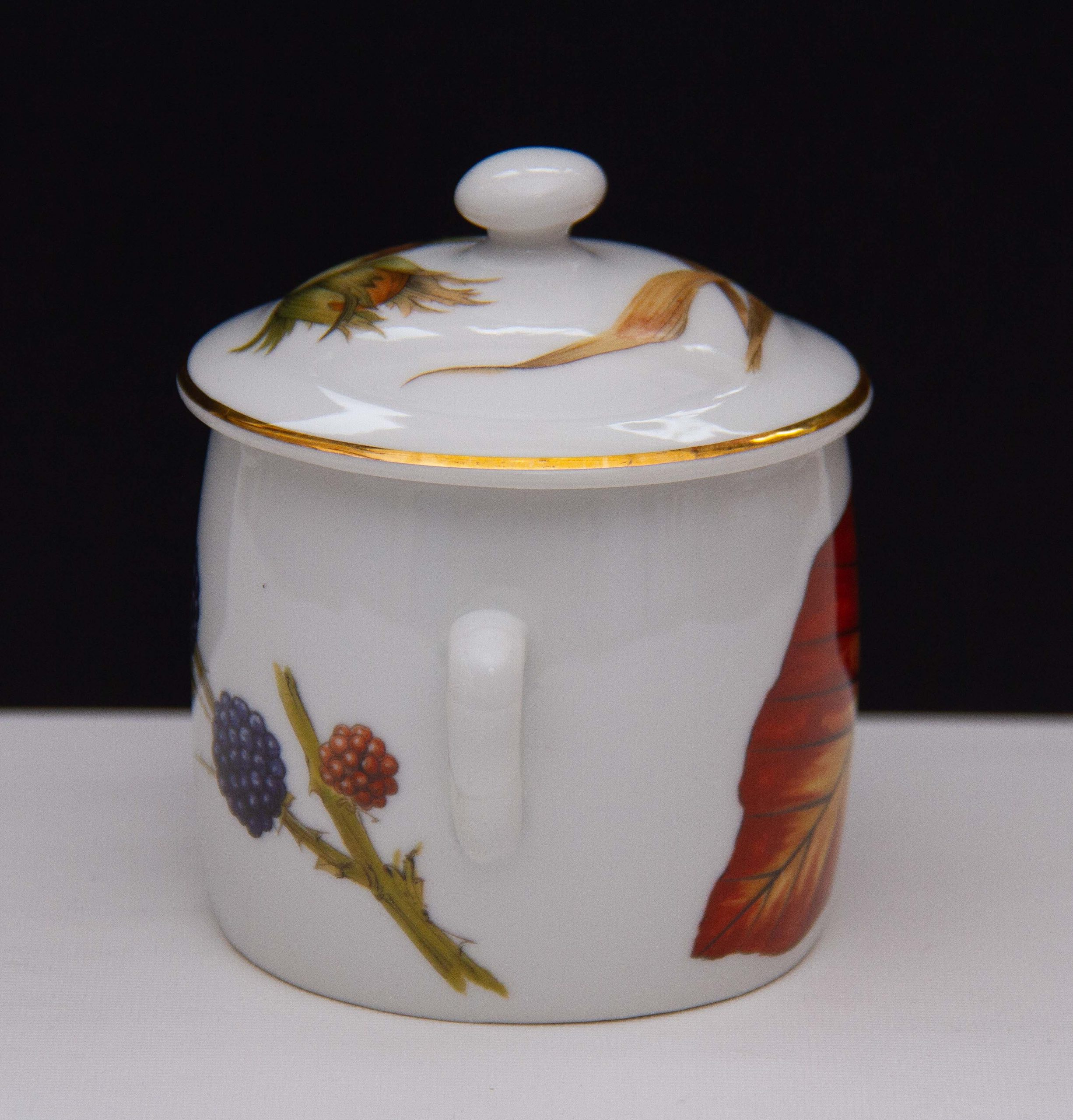 A Royal Worcester small pot with 2 handles and a lid with a gold rim. In the Wild Harvest pattern, featuring Autumn blackberries and leaves. Perfect for preserves, honey or sugar.