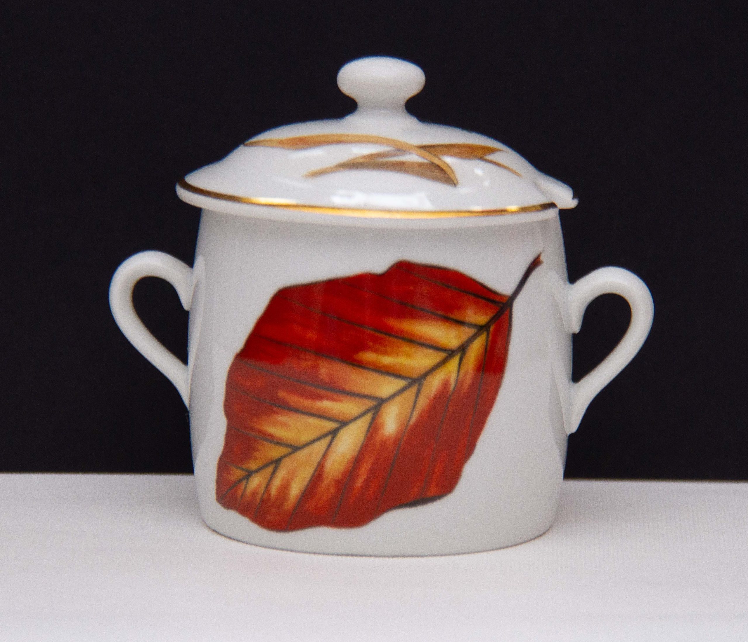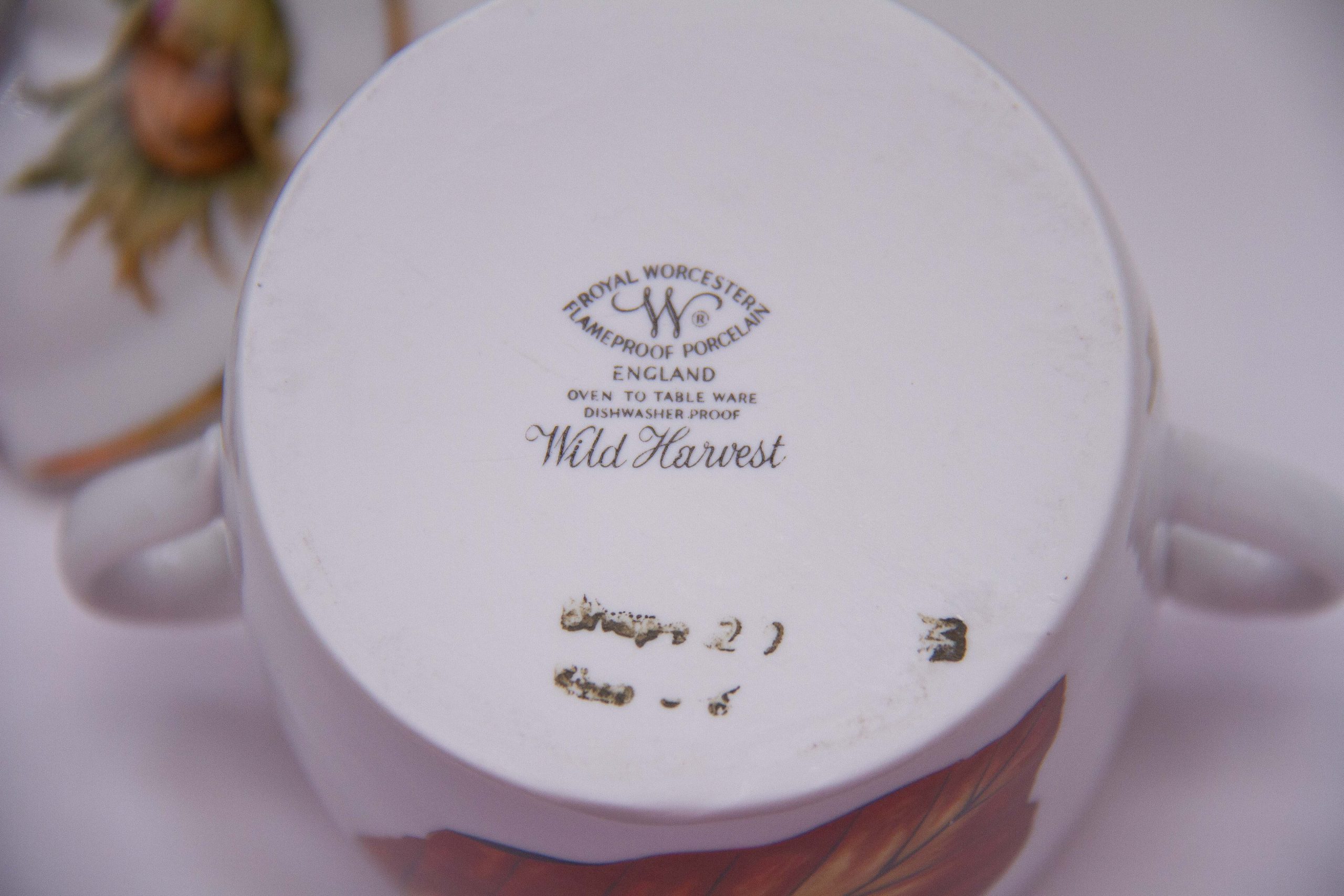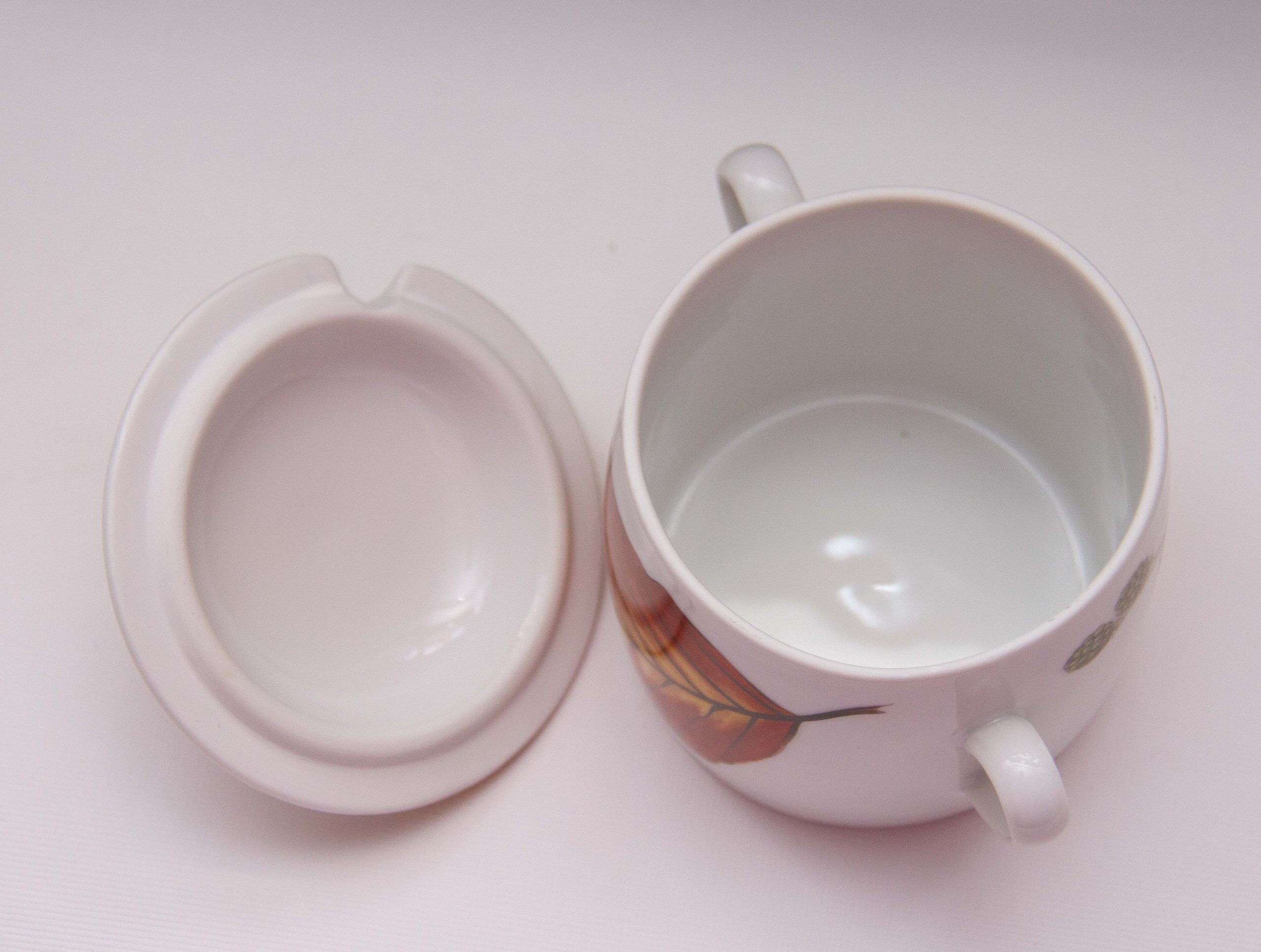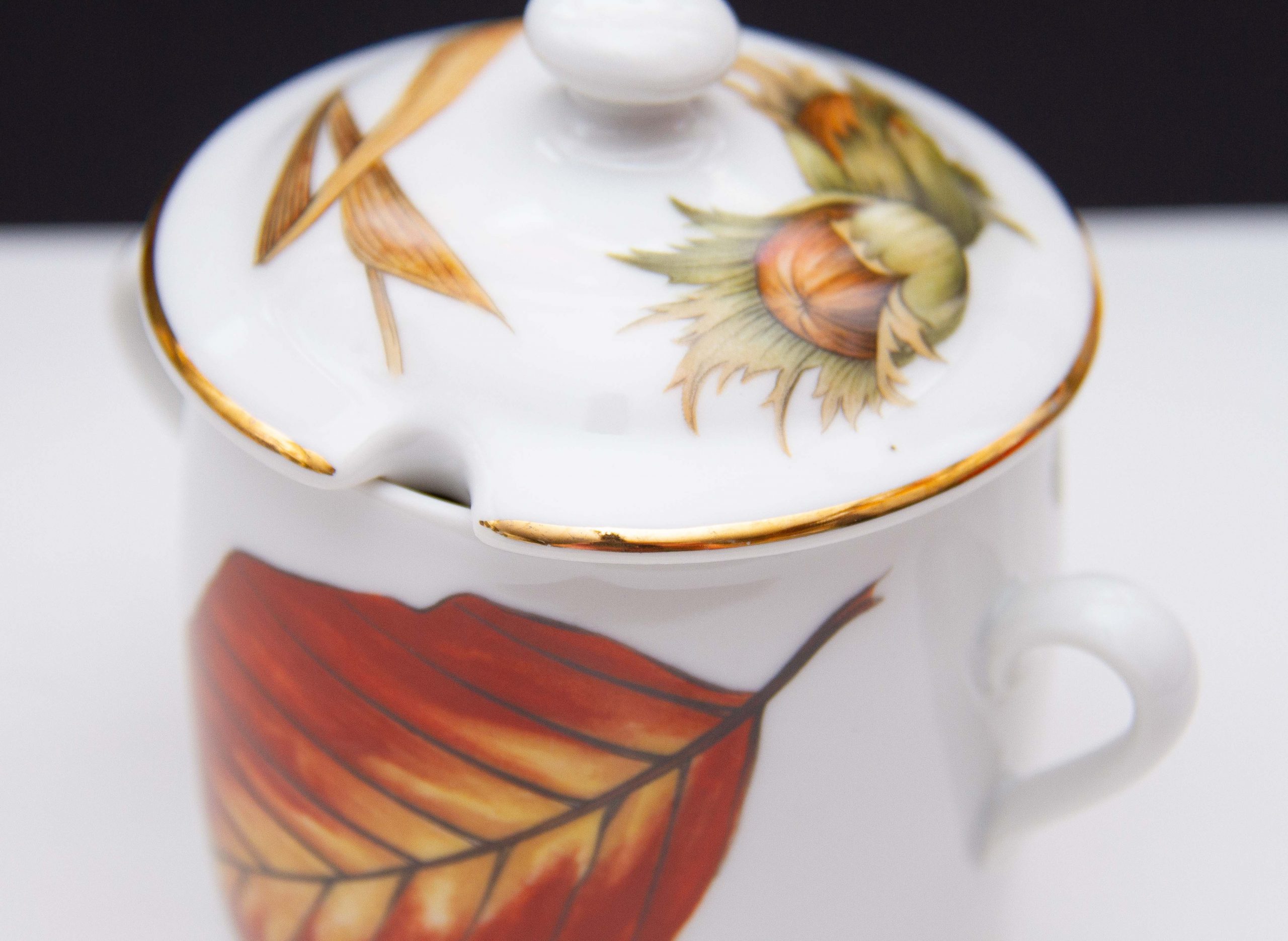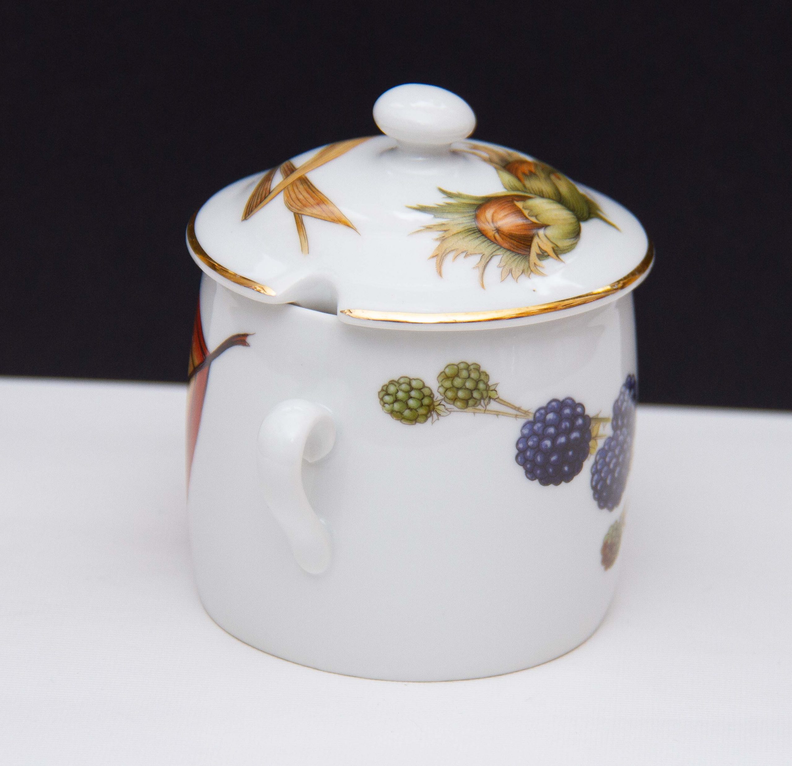 A Royal Worcester small pot with 2 handles and a lid with a gold rim. In the Wild Harvest pattern, featuring Autumn blackberries and leaves. Perfect for preserves, honey or sugar.