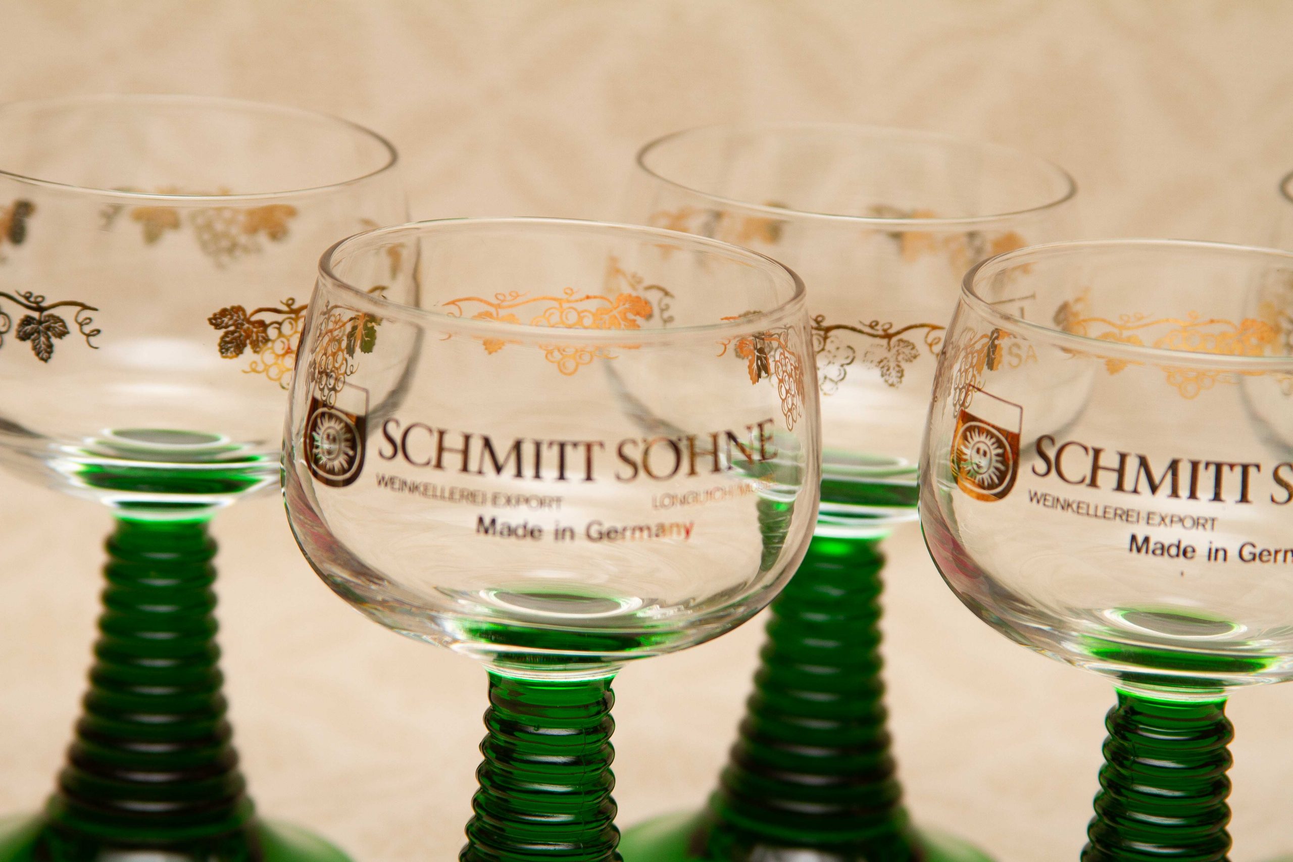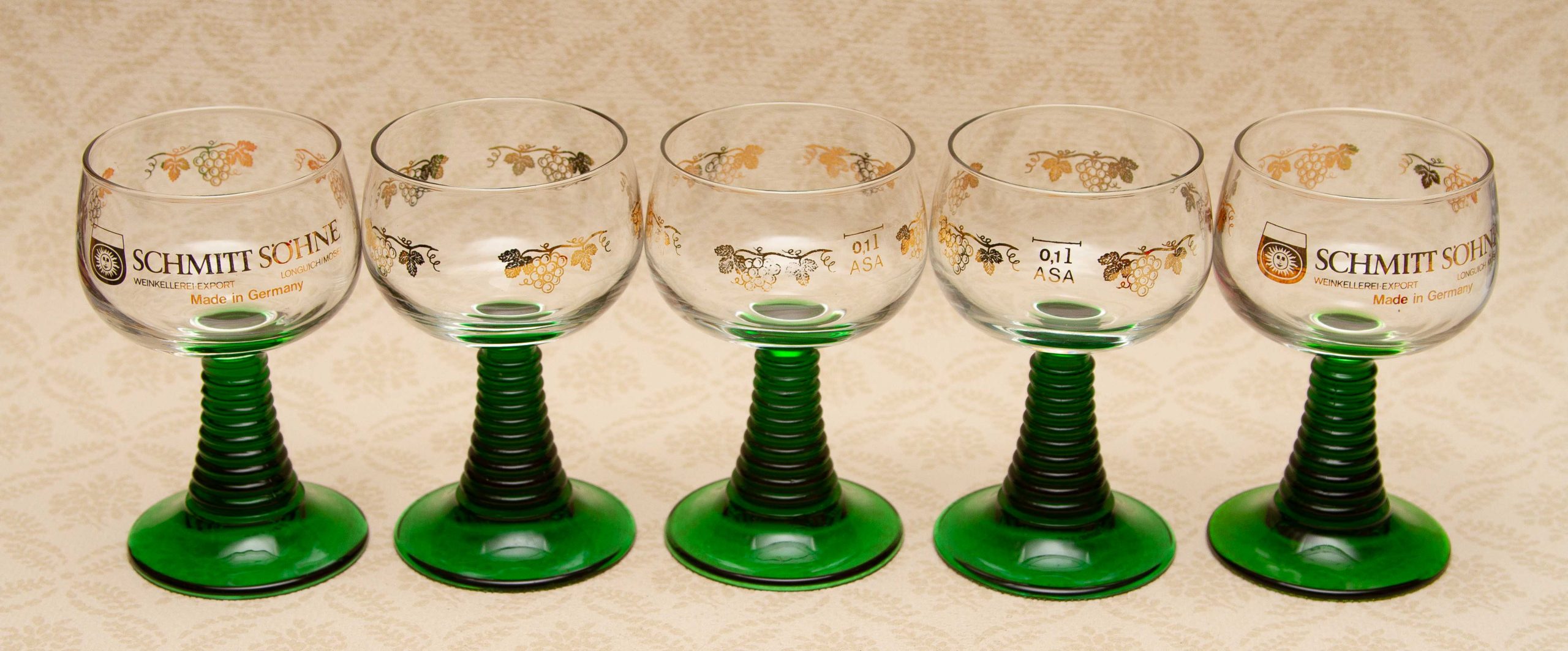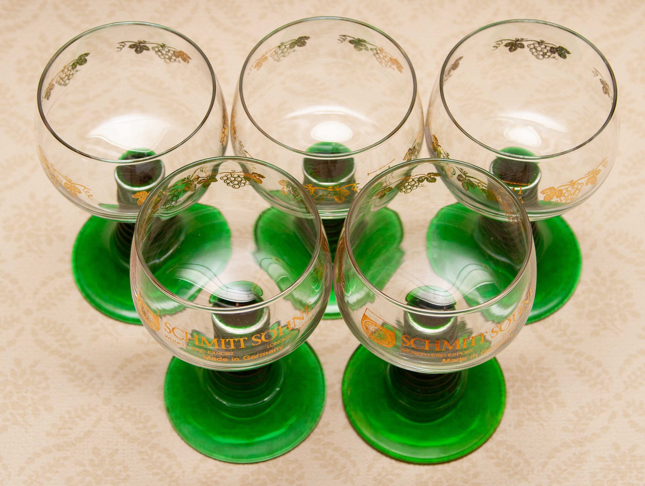A set of 5 retro vintage wine glasses with green stems, and decorated with grape vines and grapes in gold. Two of the glasses have SCHMITT SOHNE, Made in Germany on gold on them. All are marked Luminarc France on the base.
