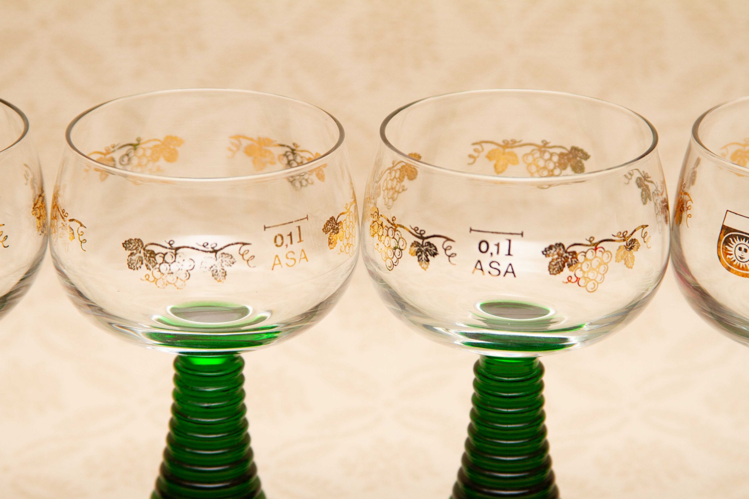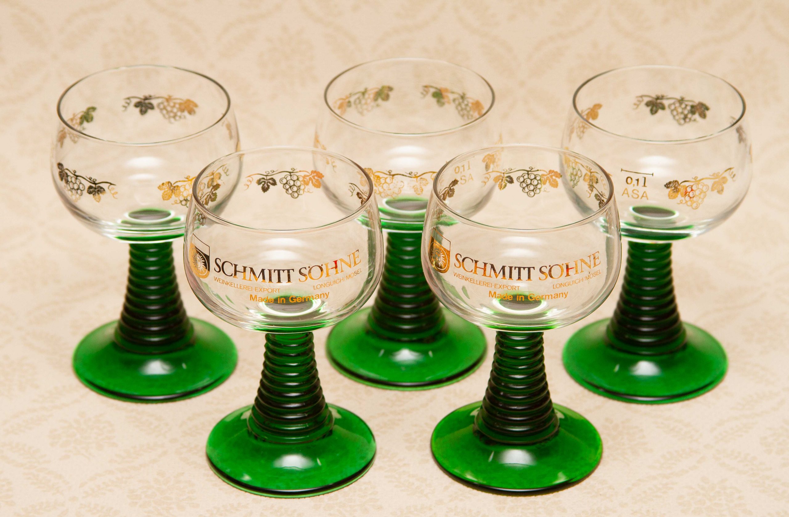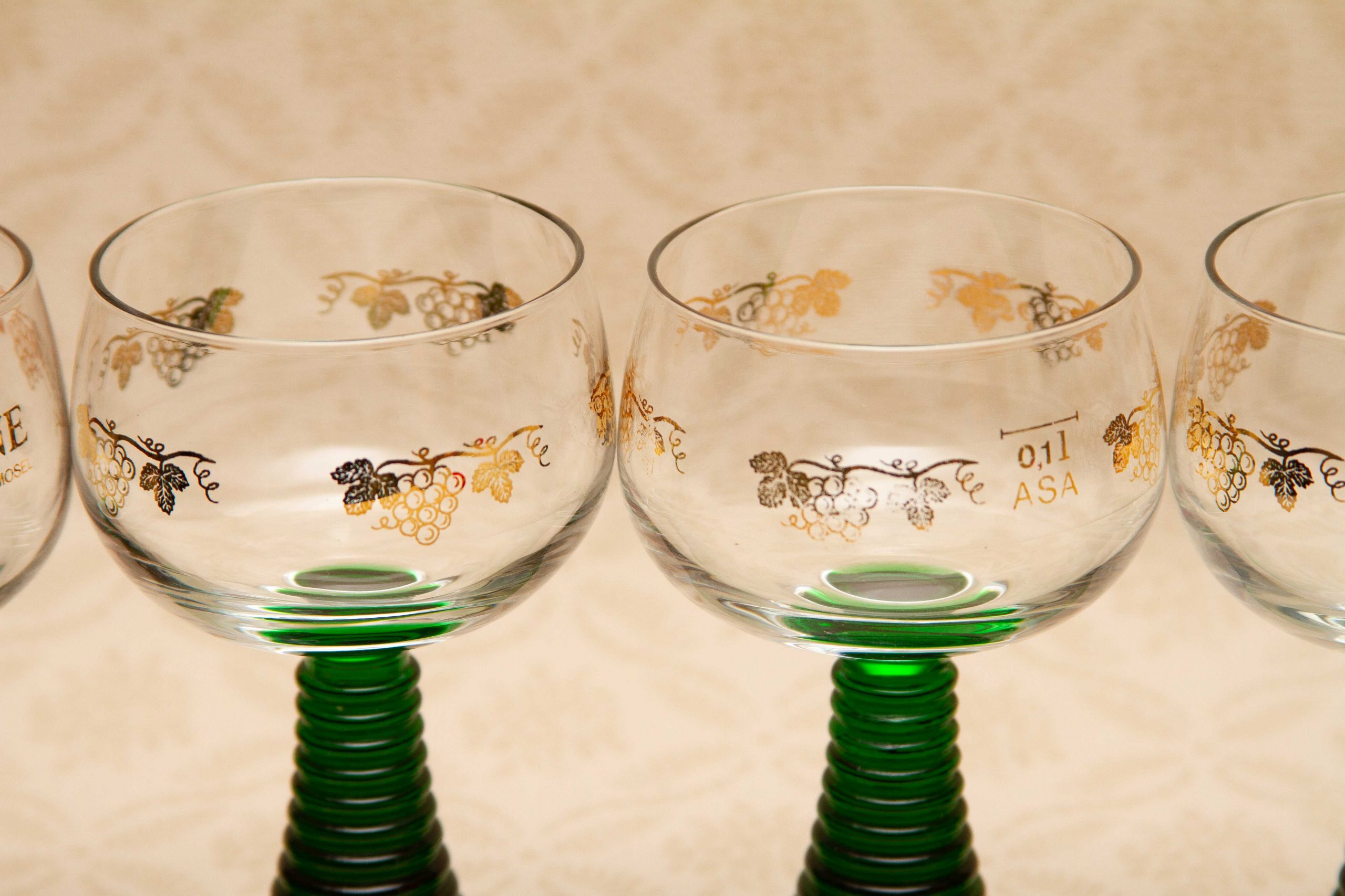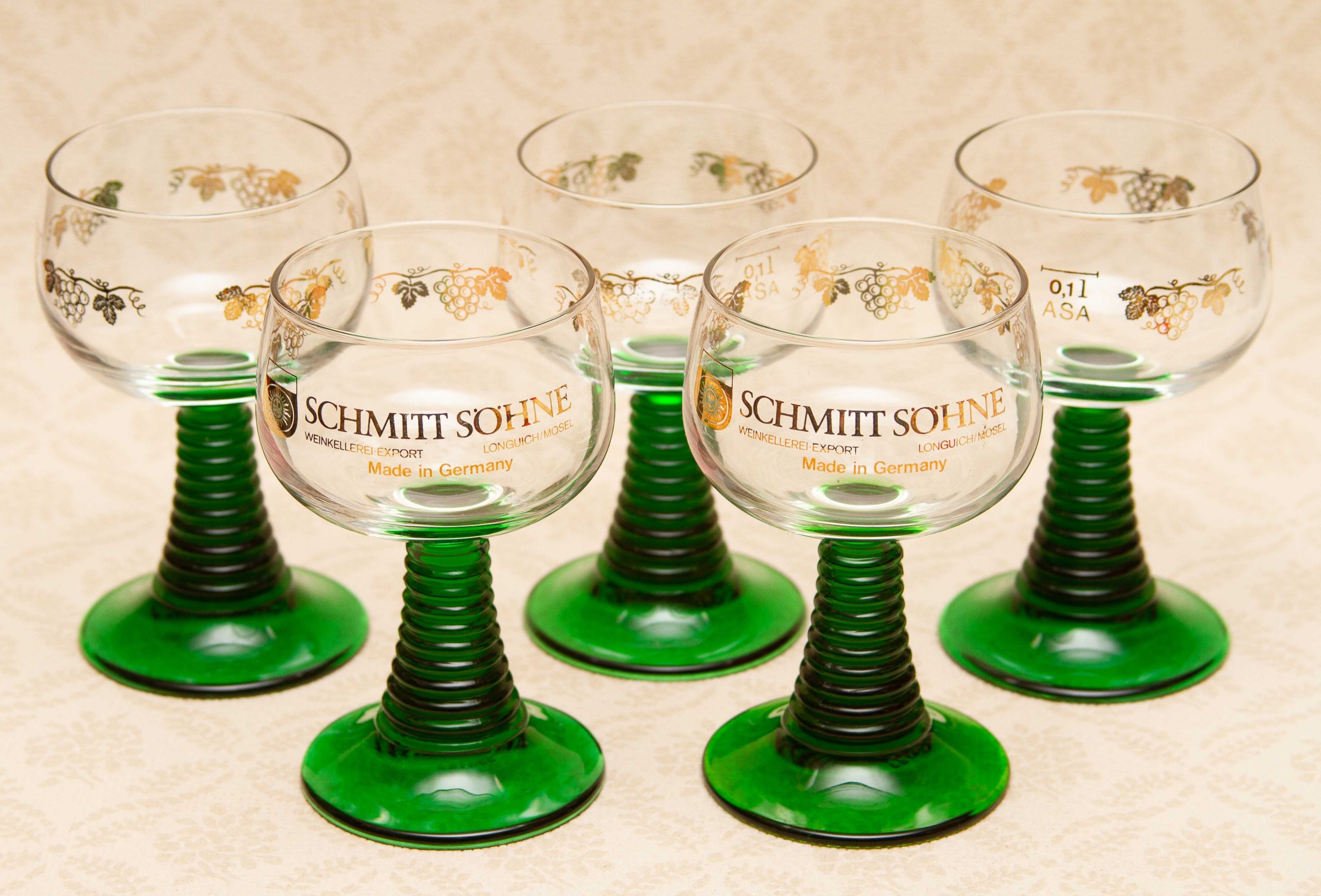 A set of 5 retro vintage wine glasses with green stems, and decorated with grape vines and grapes in gold. Two of the glasses have SCHMITT SOHNE, Made in Germany on gold on them. All are marked Luminarc France on the base.