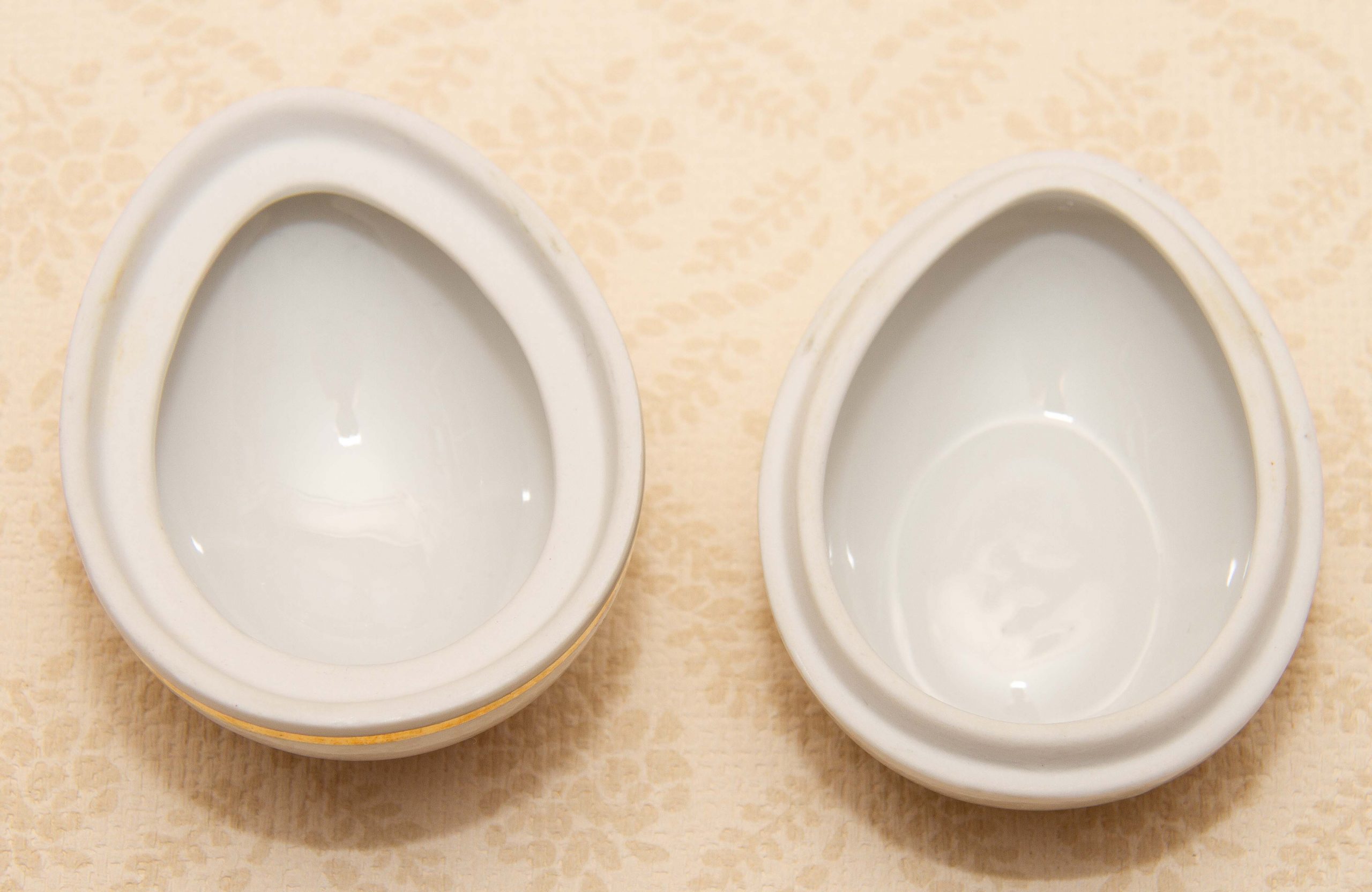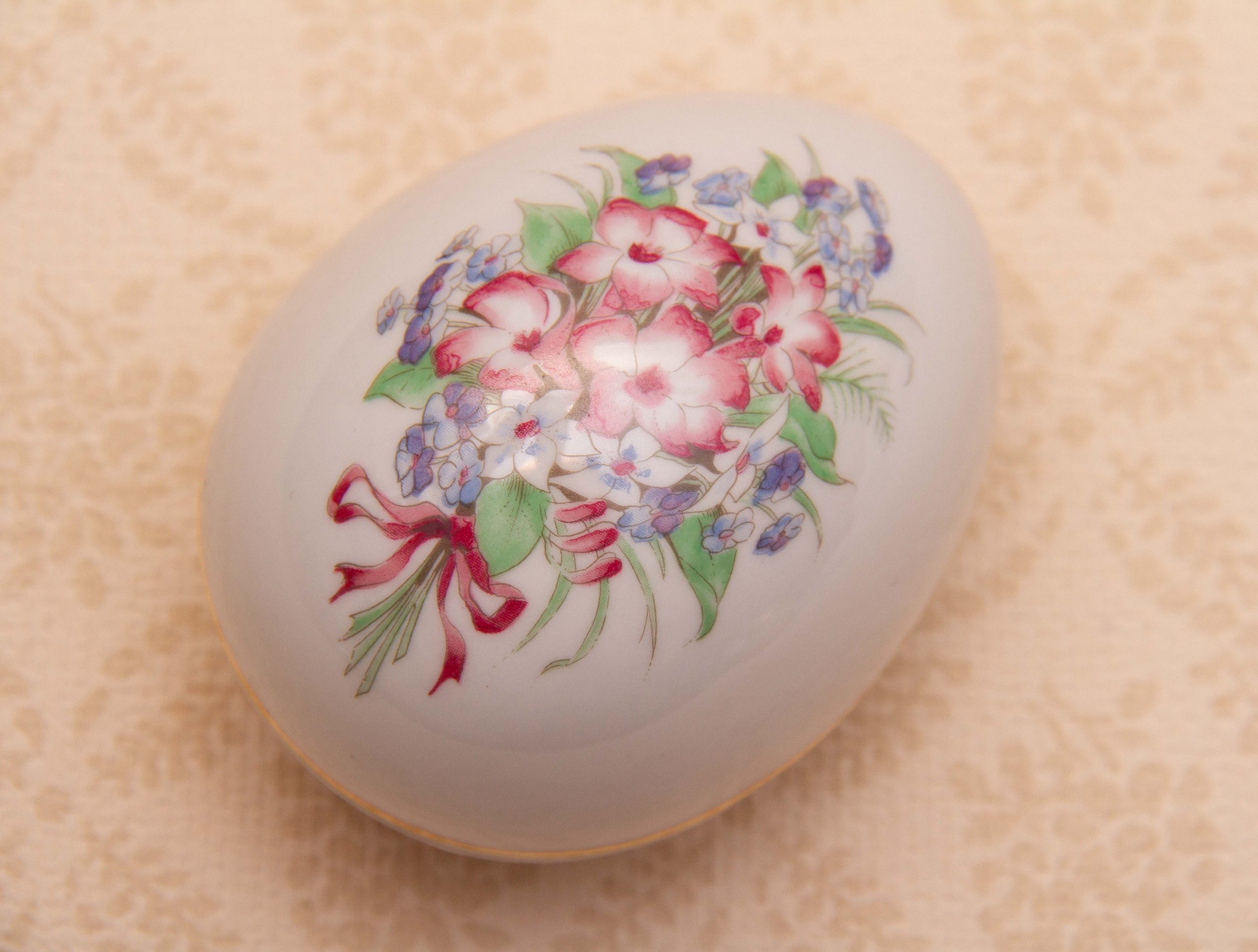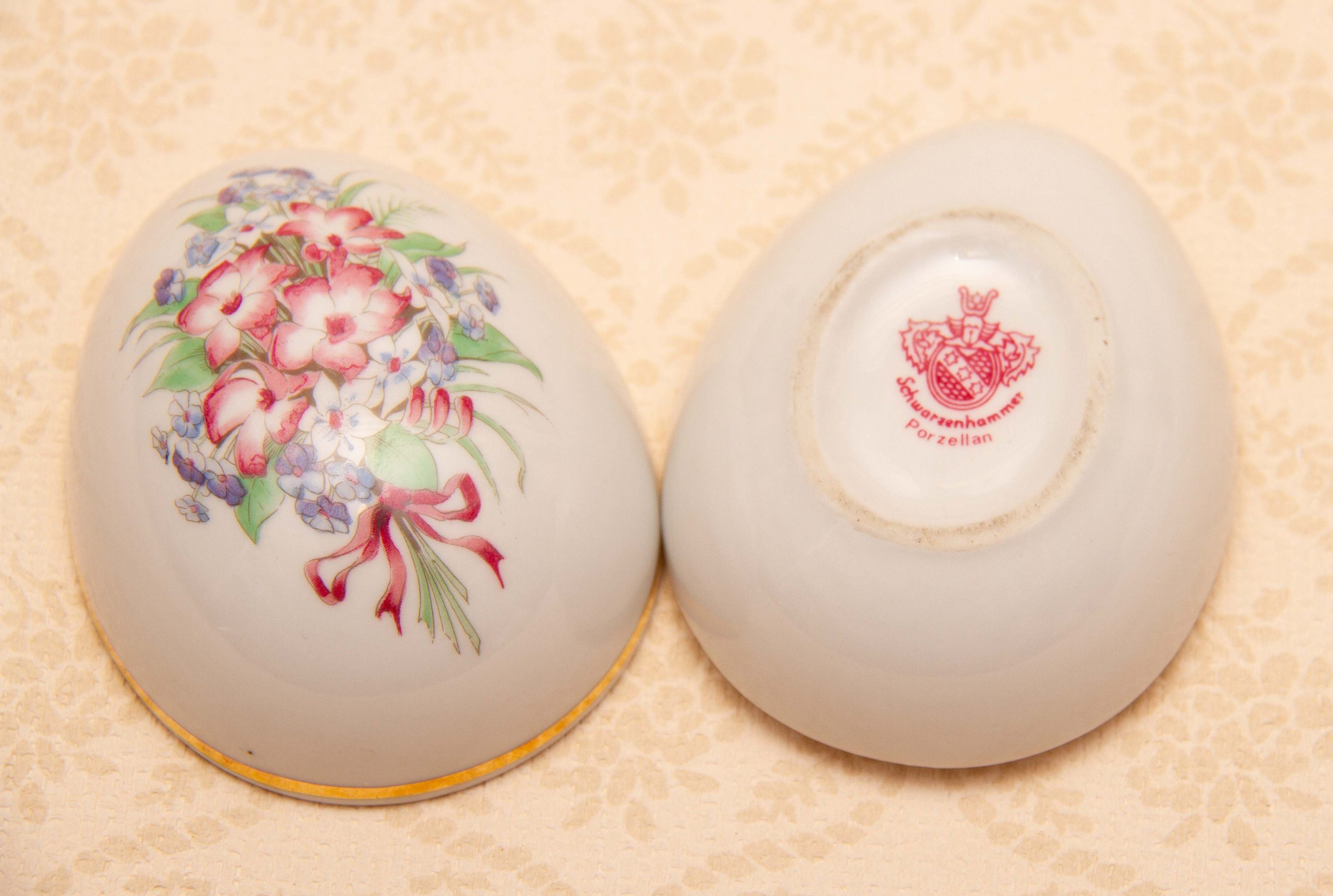 A vintage Schwarzenhammer Porcelain Egg Shaped Jewellery Trinket Box, with a floral pattern on the lid