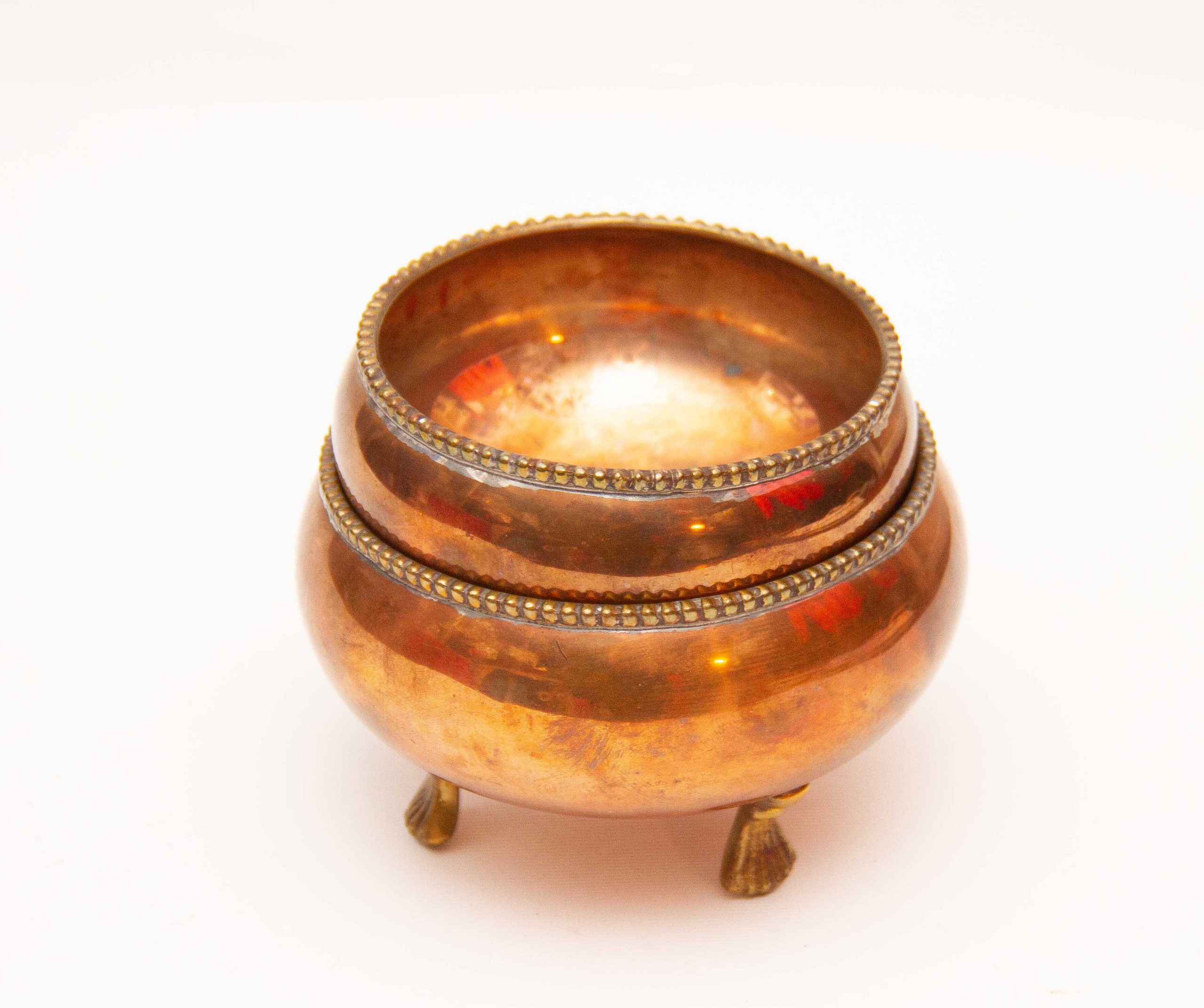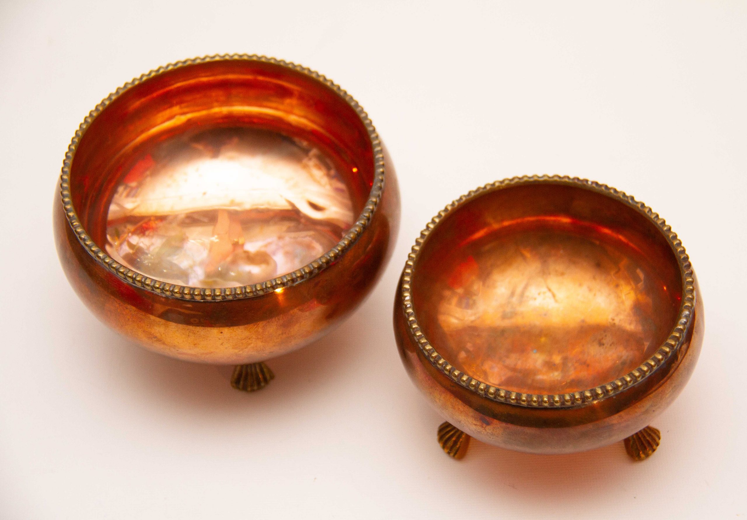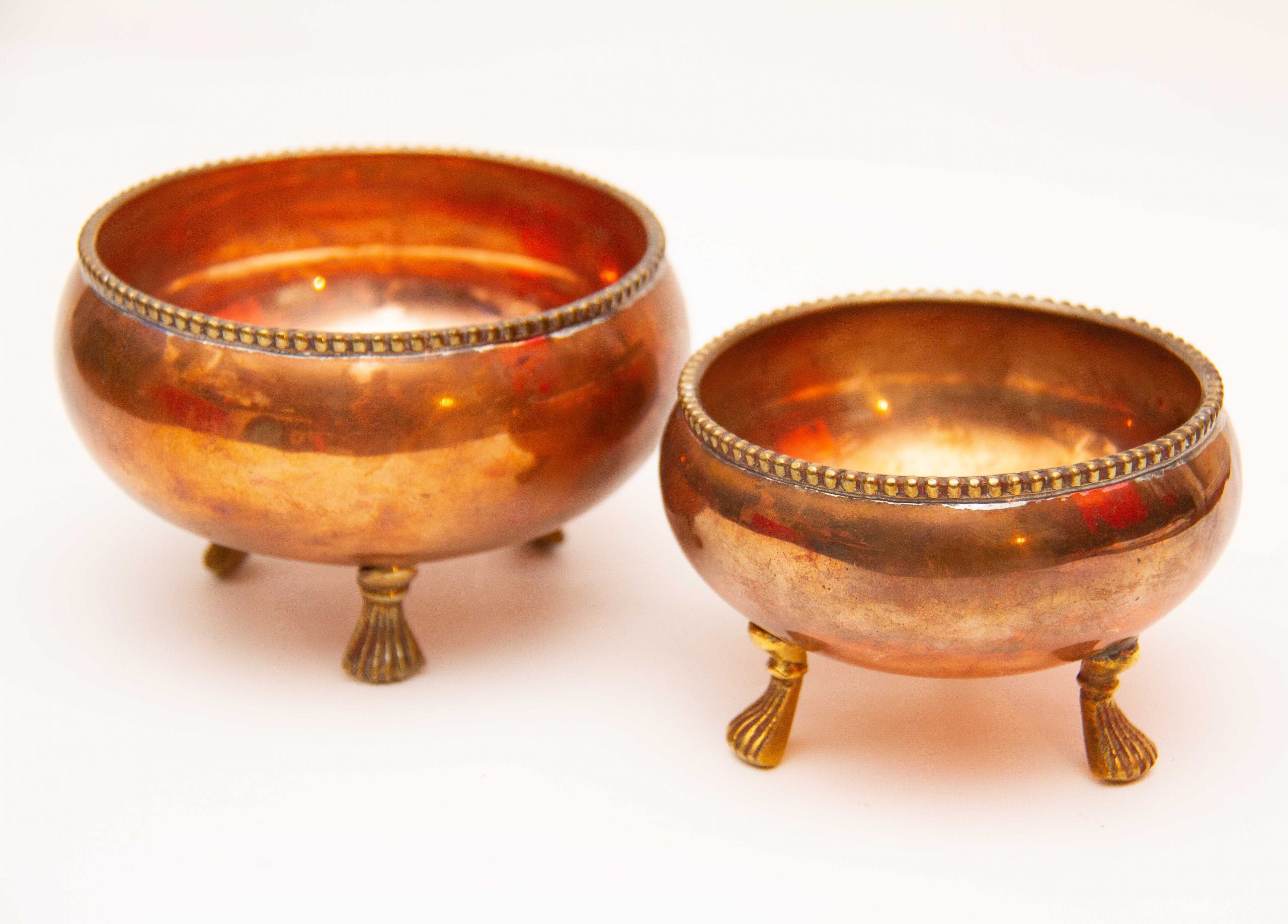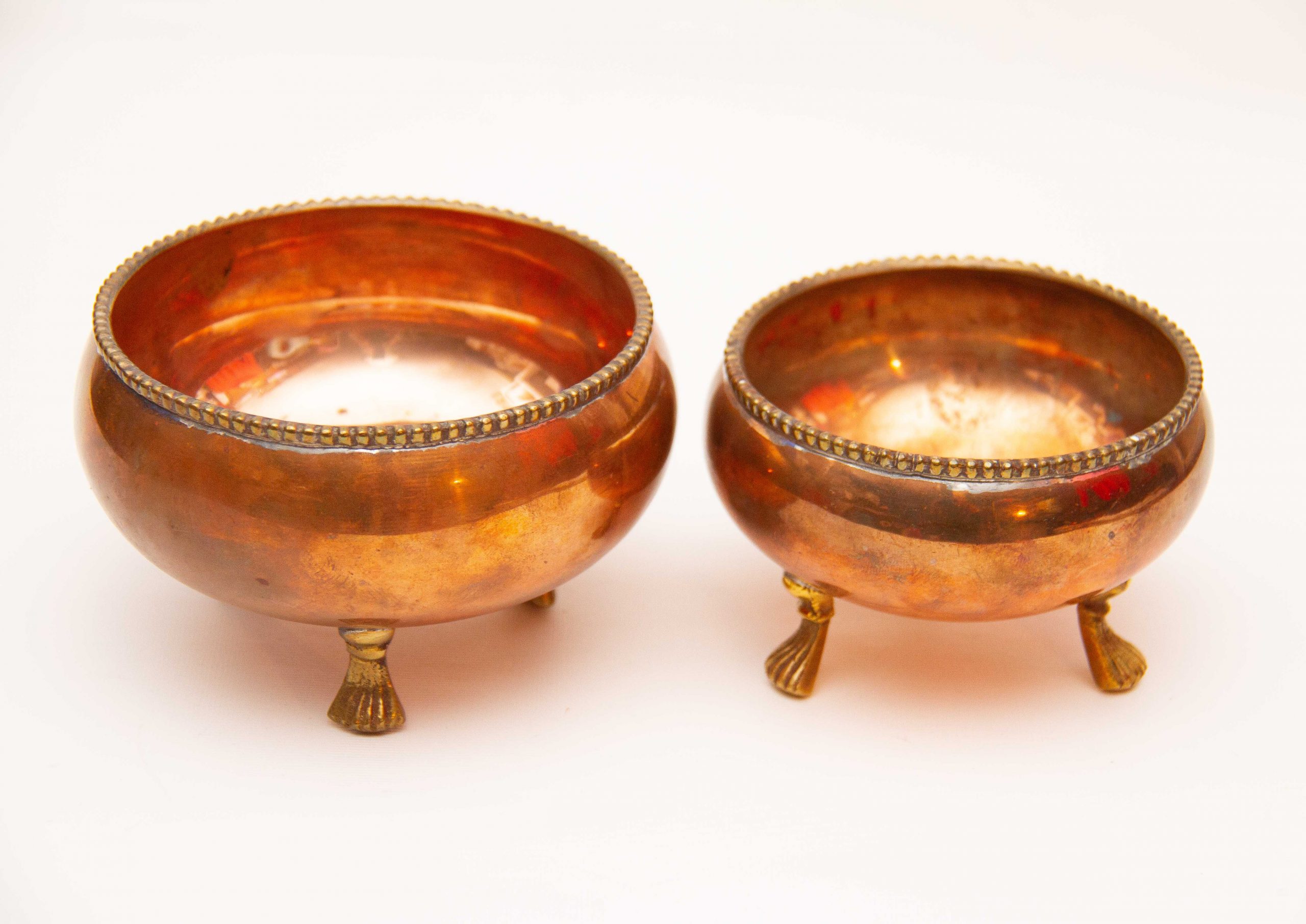 A set of 2 vintage small copper bowls with a brass edging, each standing on 3 brass feet.