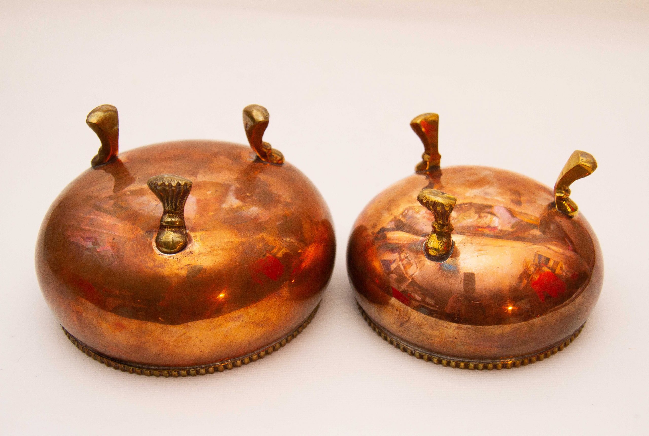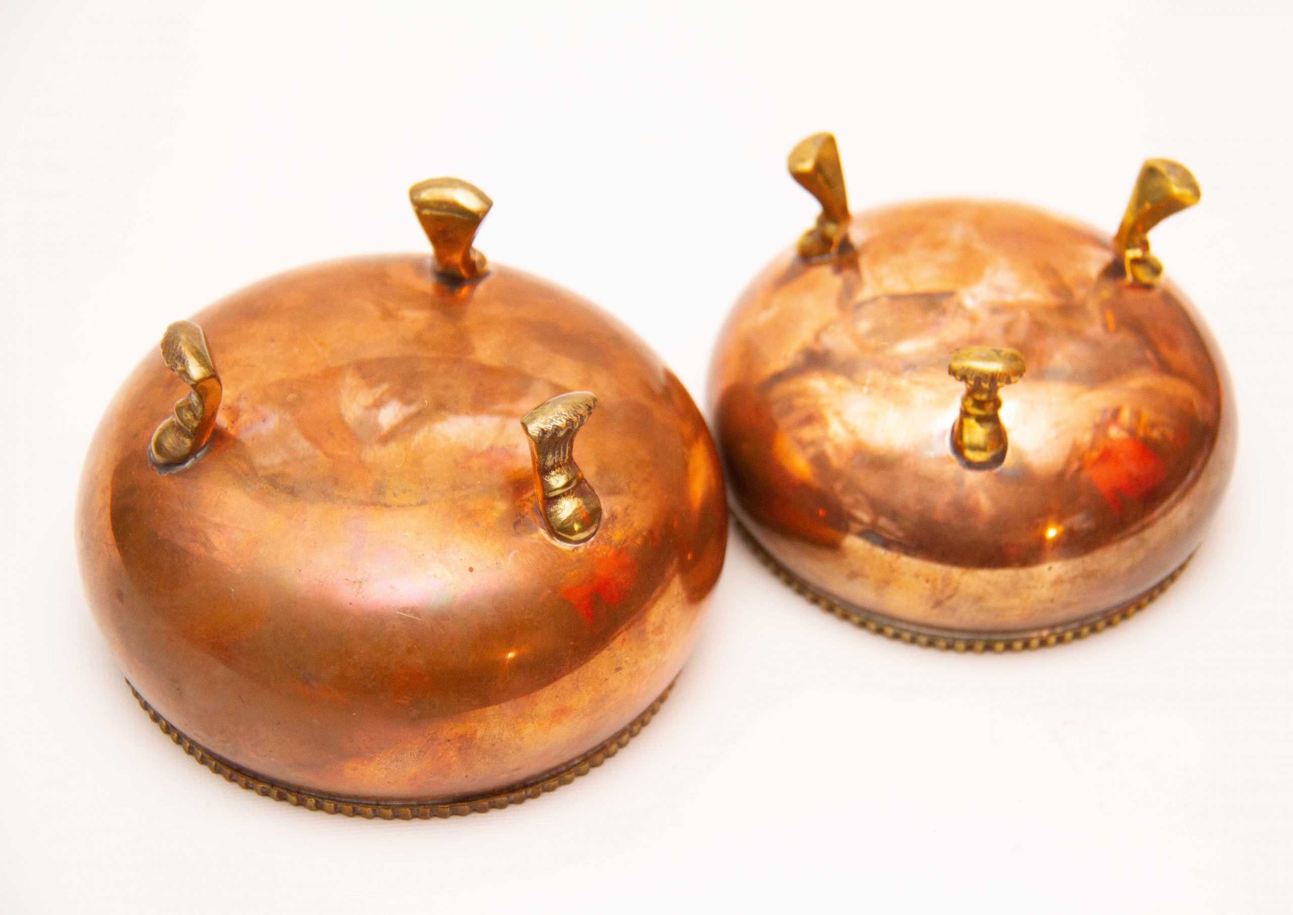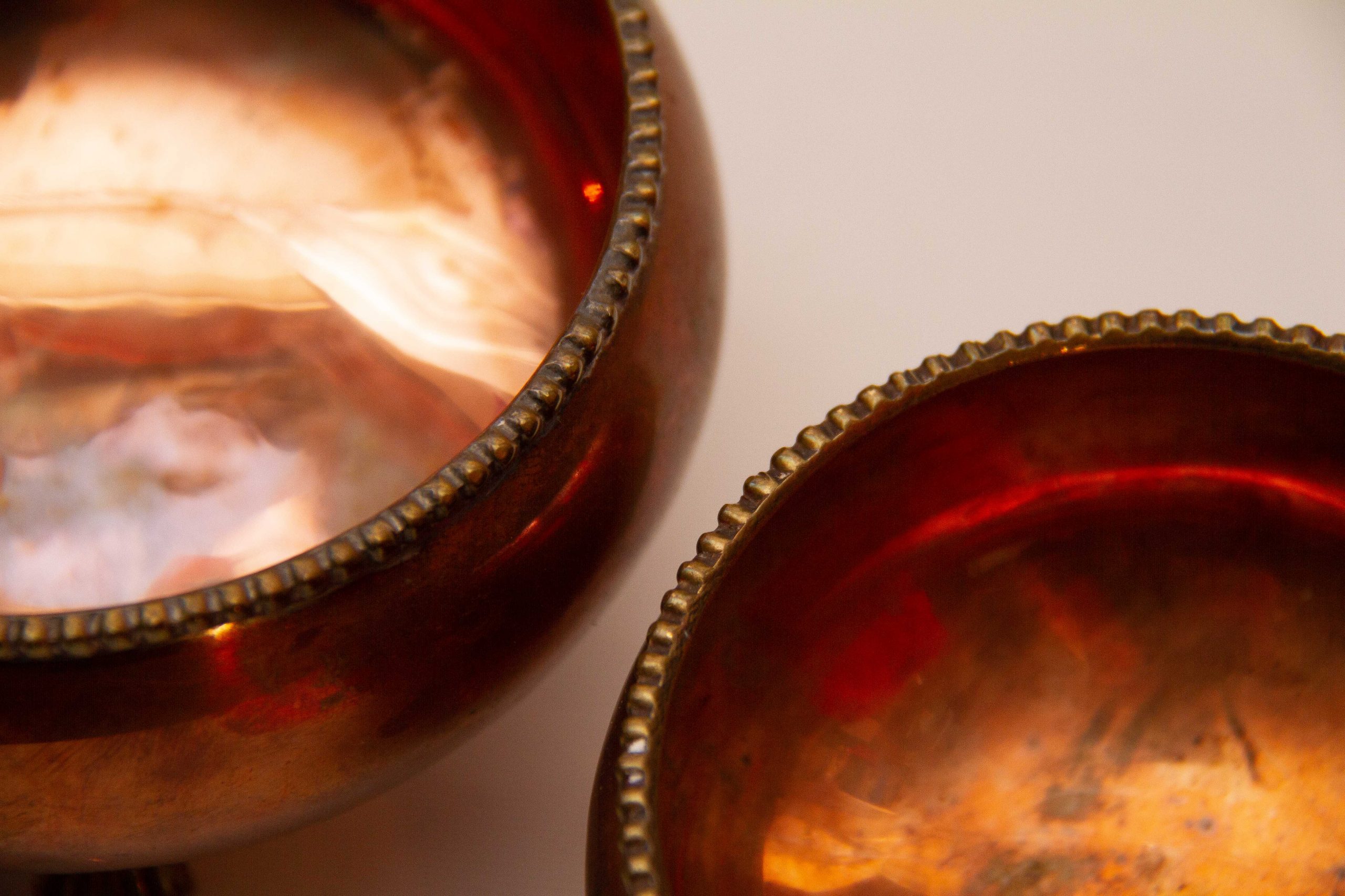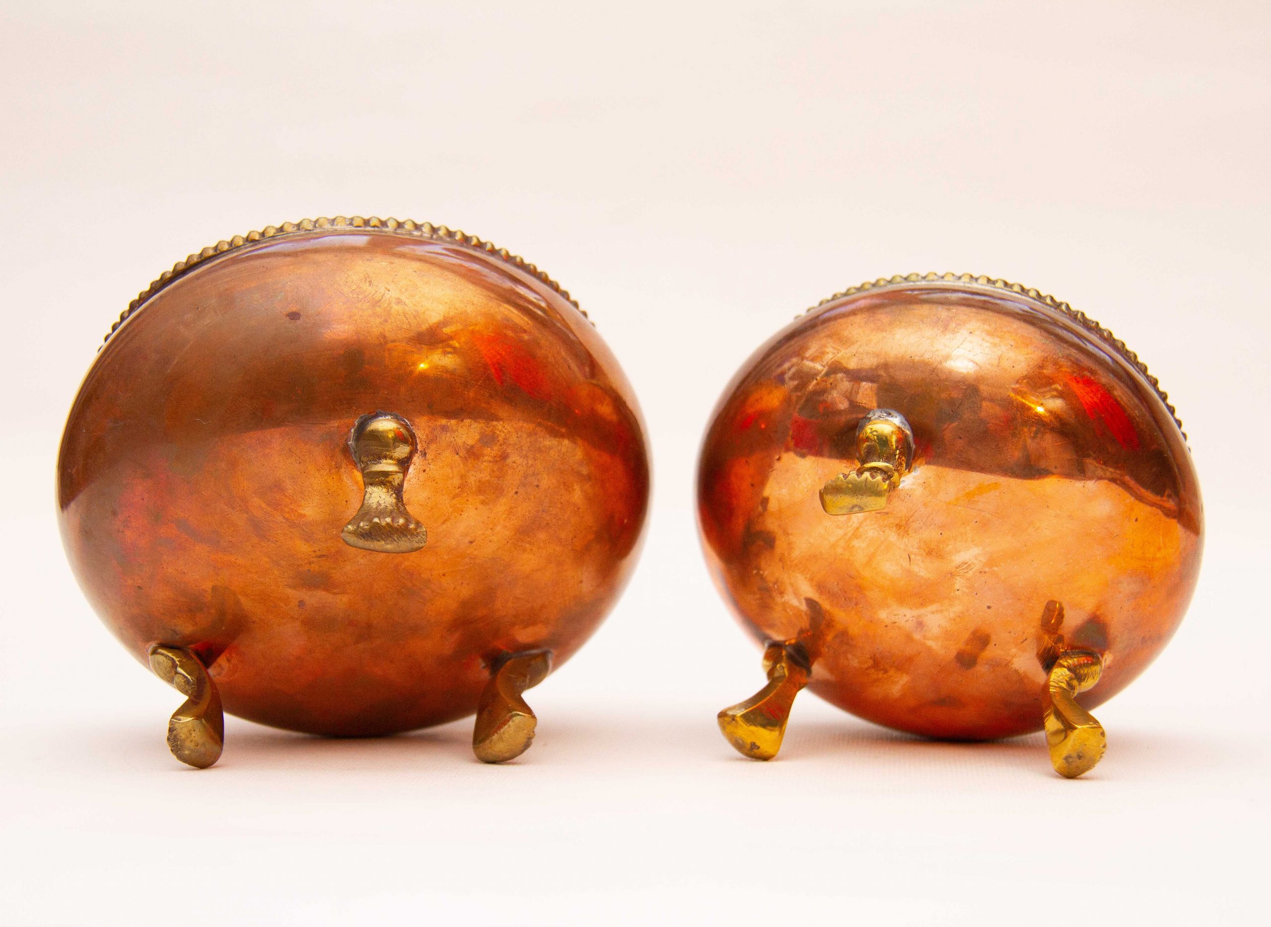 A set of 2 vintage small copper bowls with a brass edging, each standing on 3 brass feet.