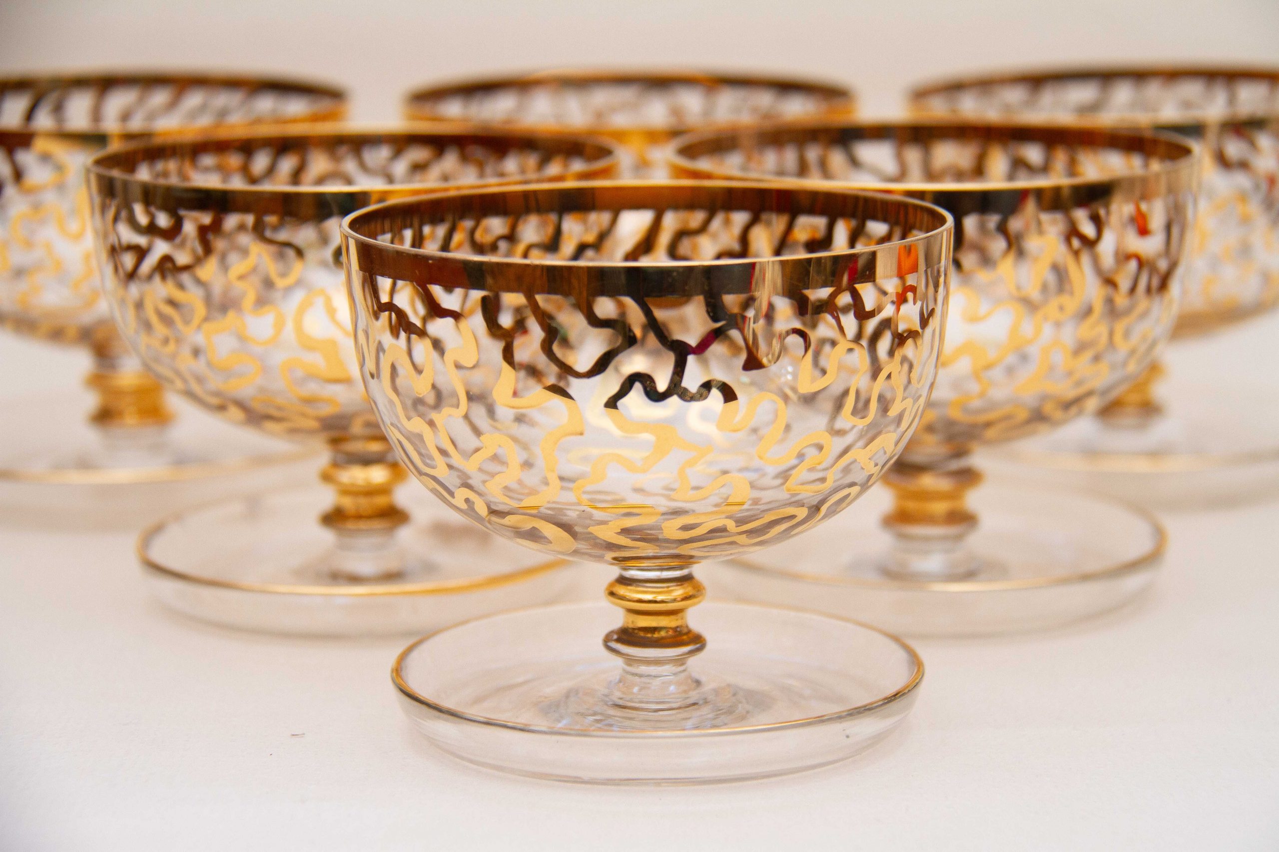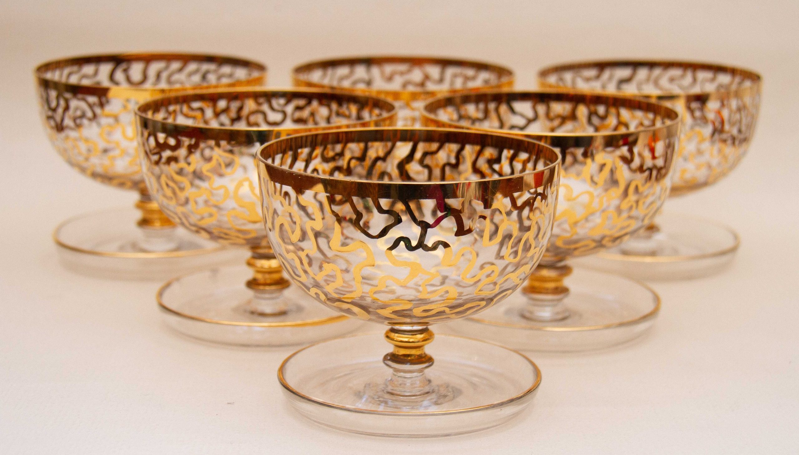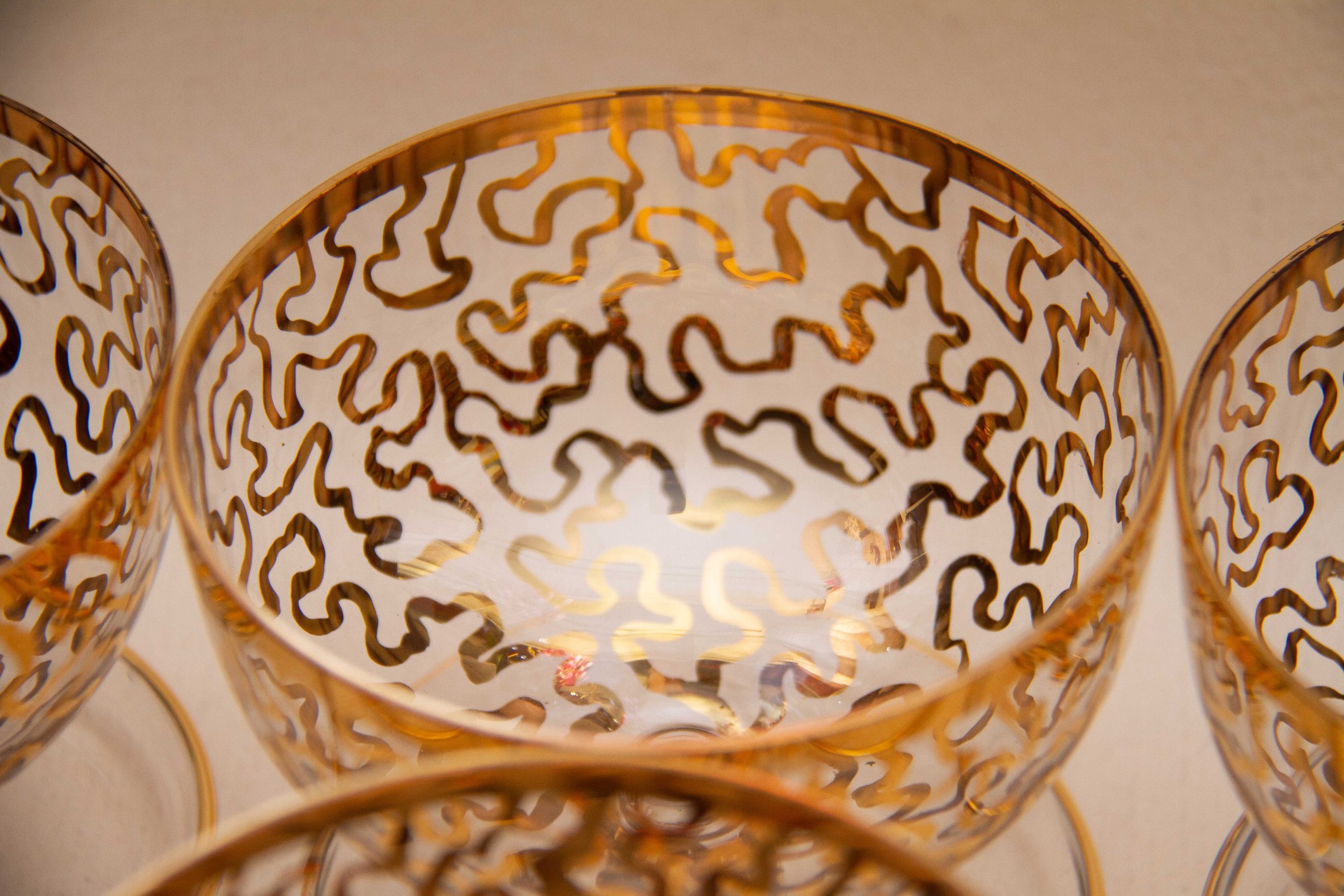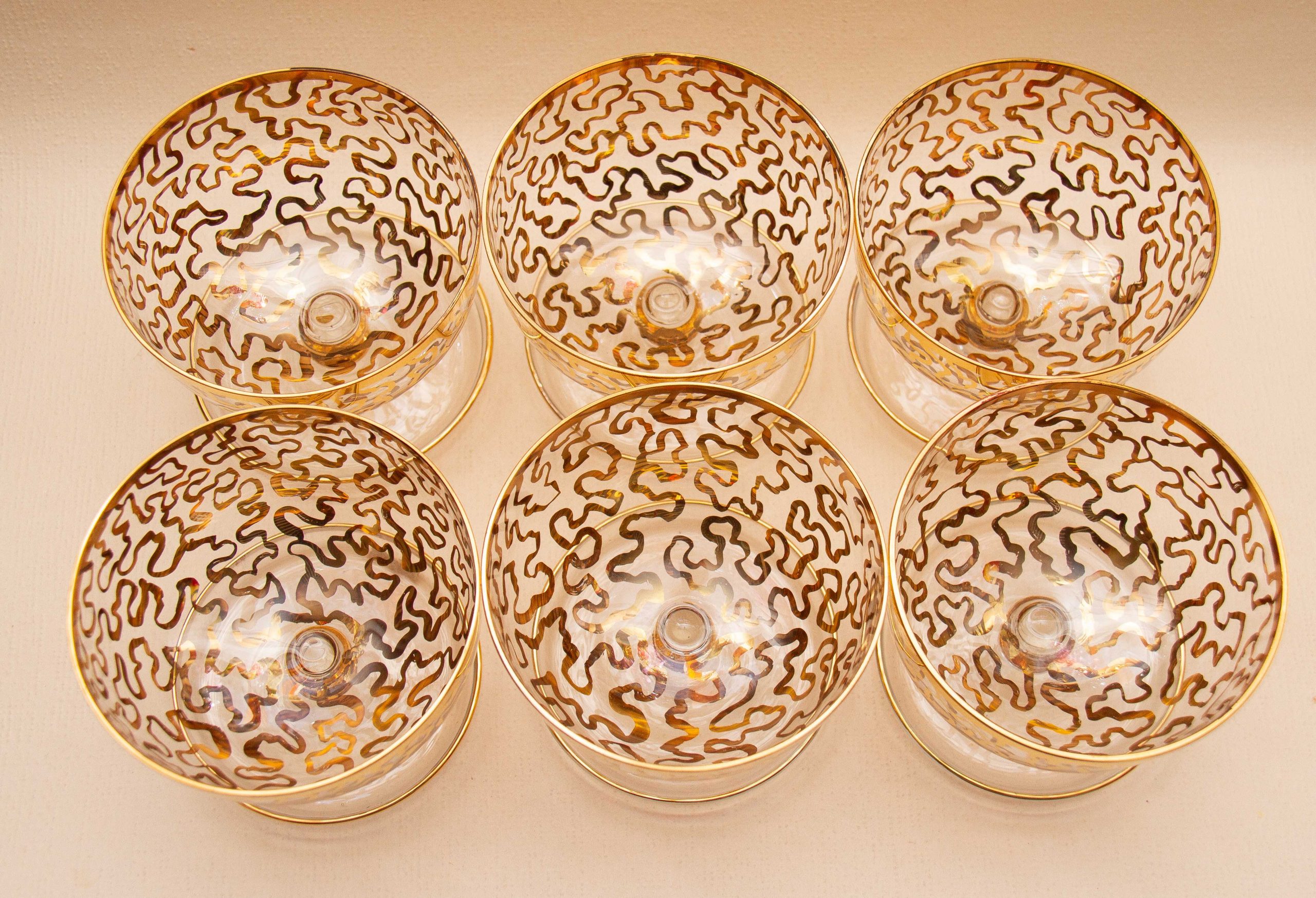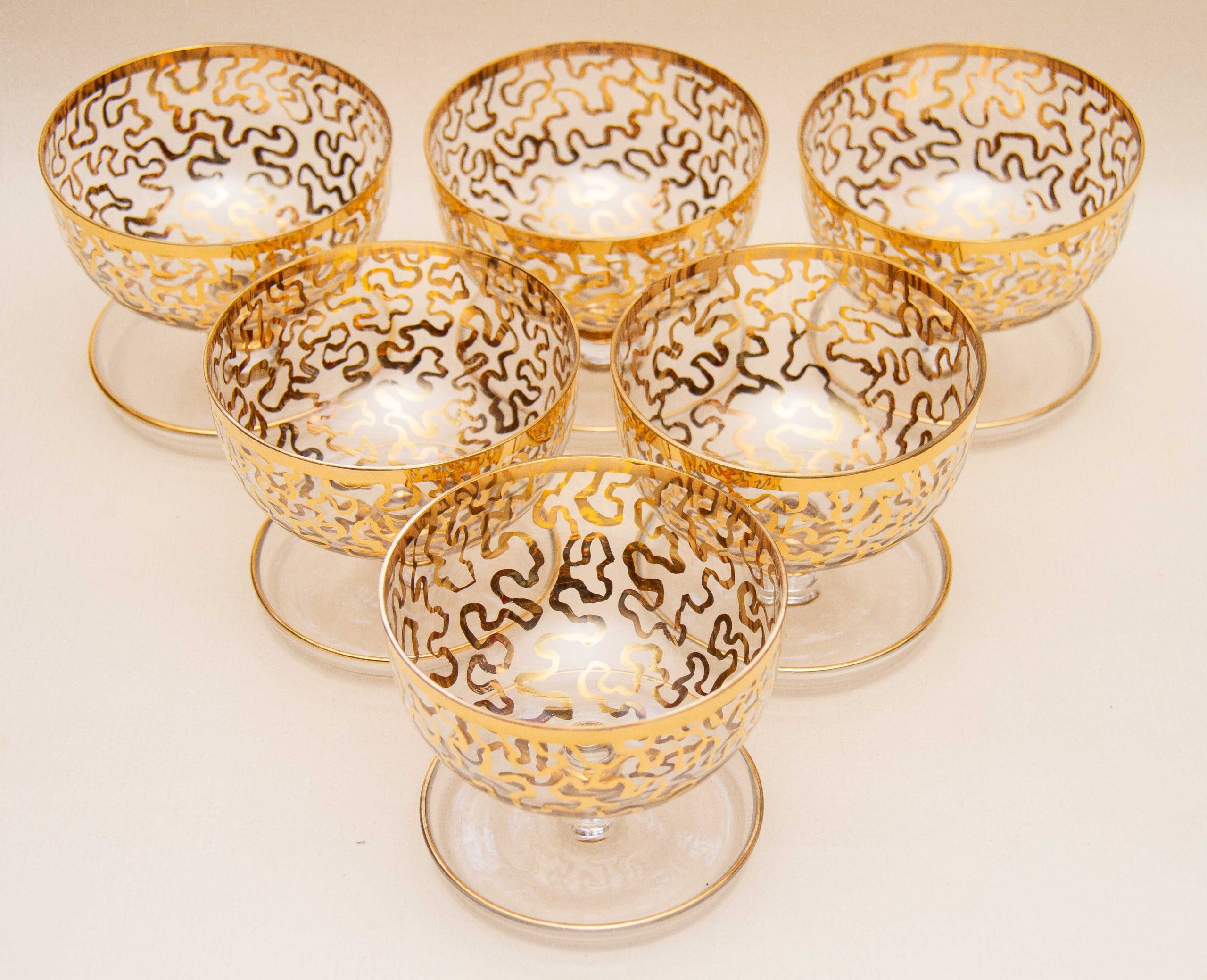 A set of 6 stunning footed glass dessert/trifle/ice cream dishes decorated with a gold pattern, with wide gold rims.