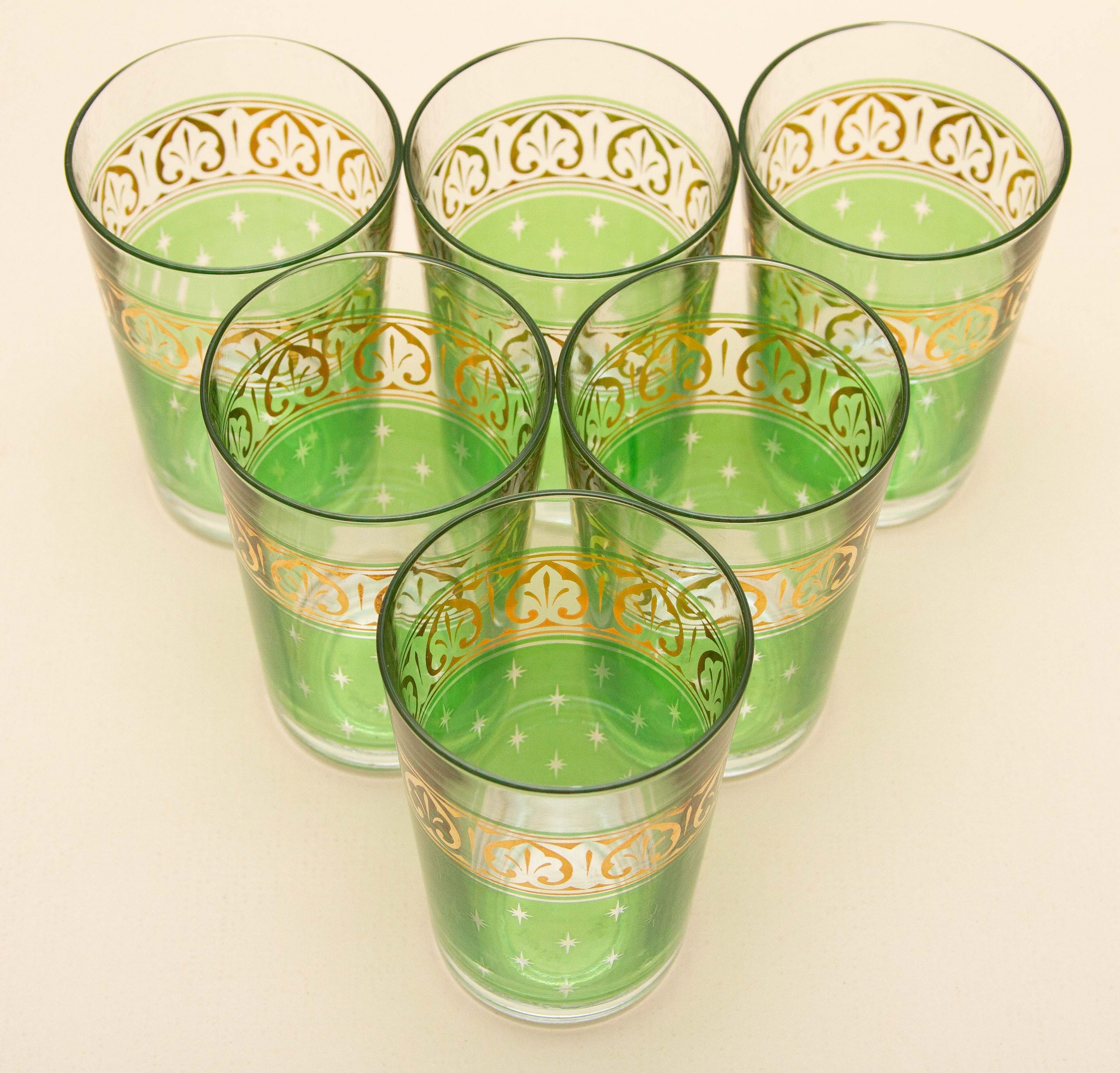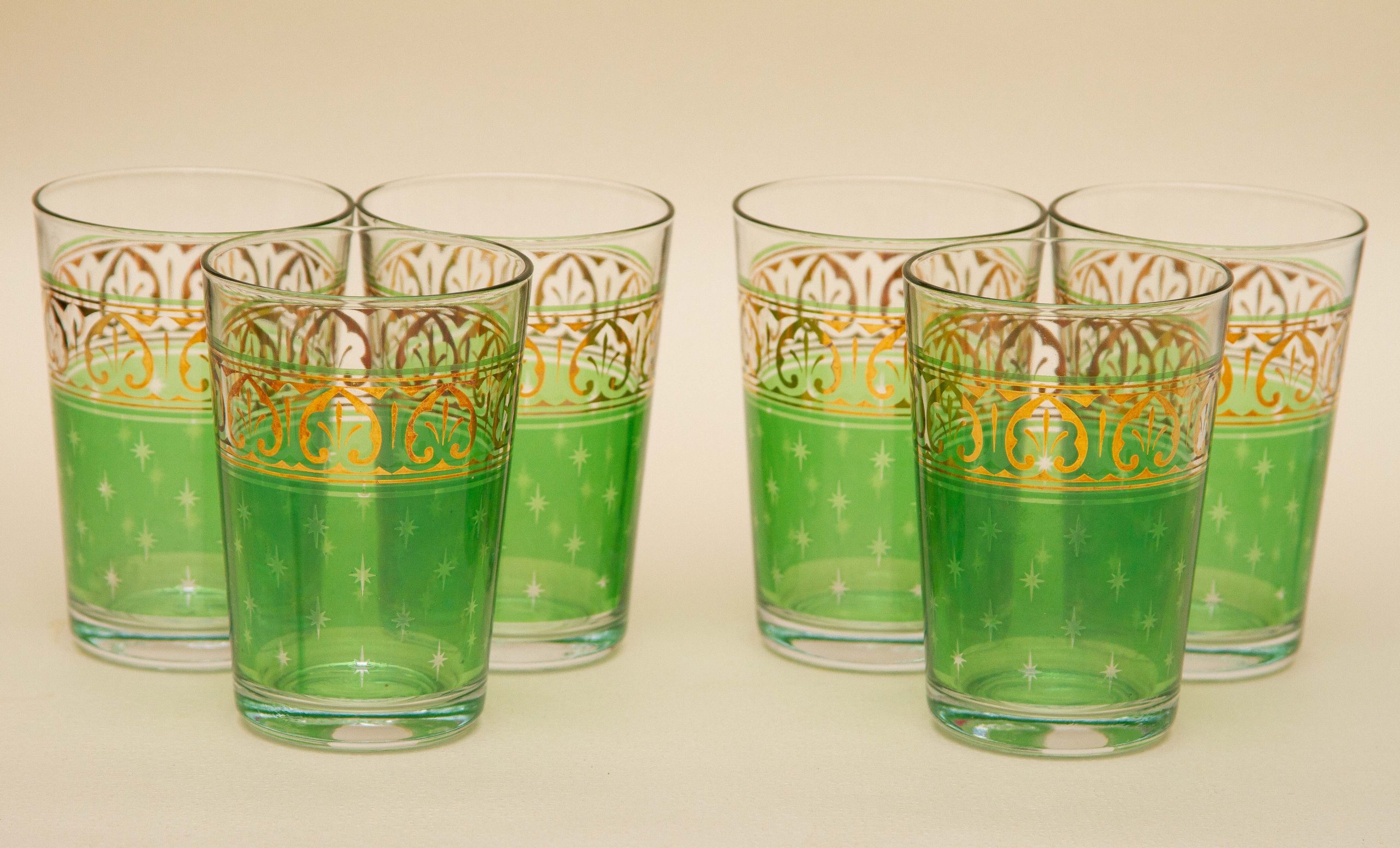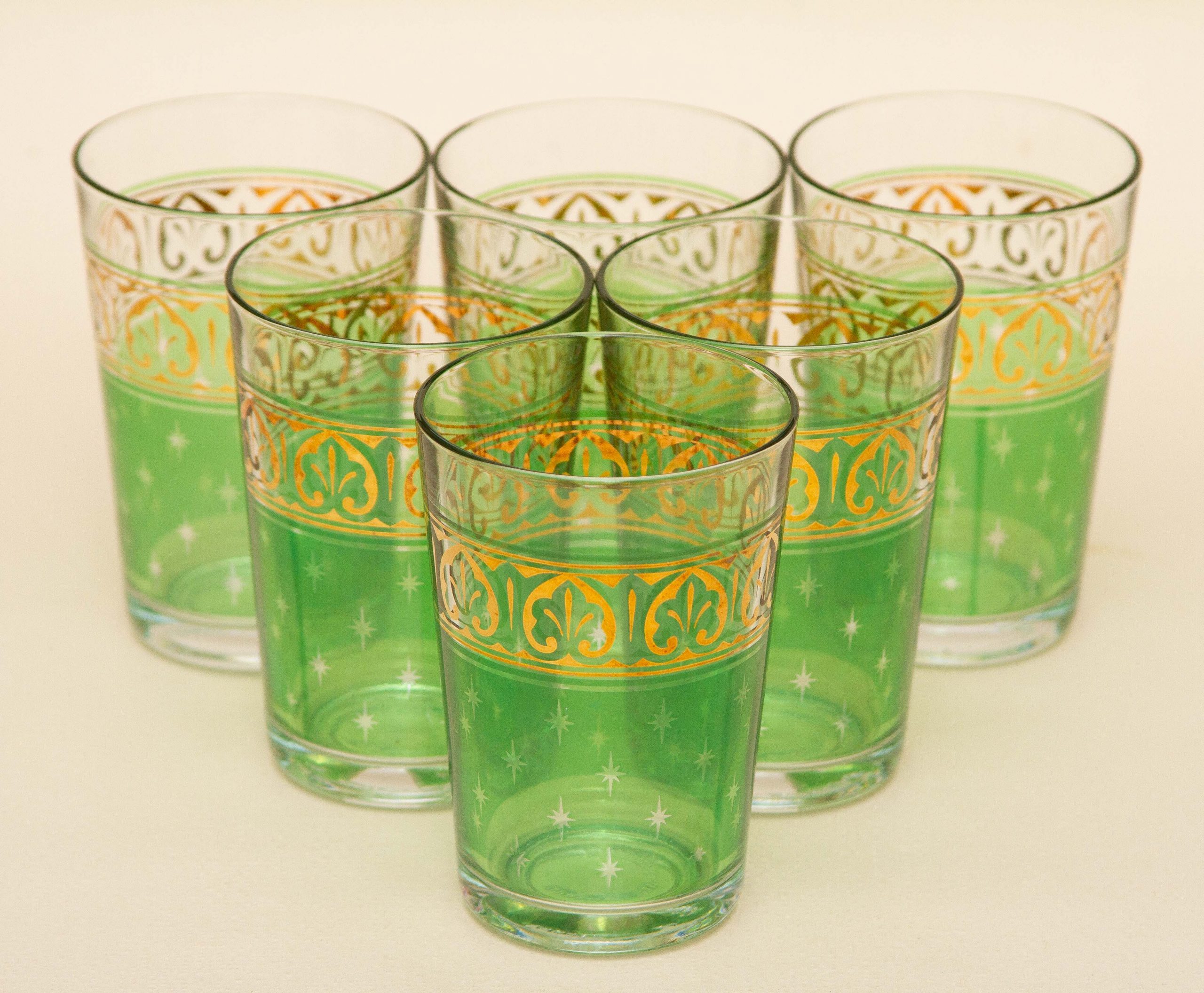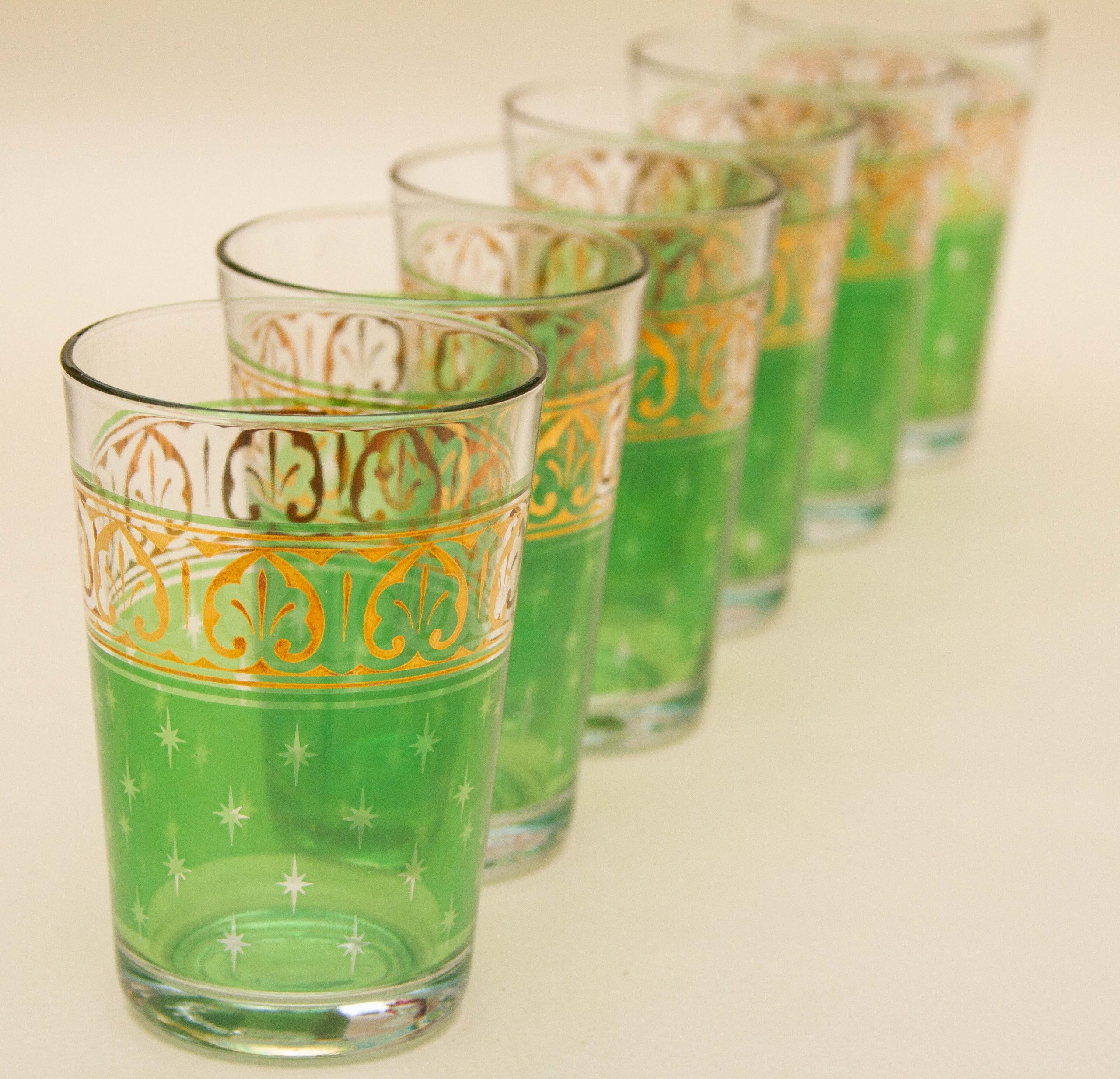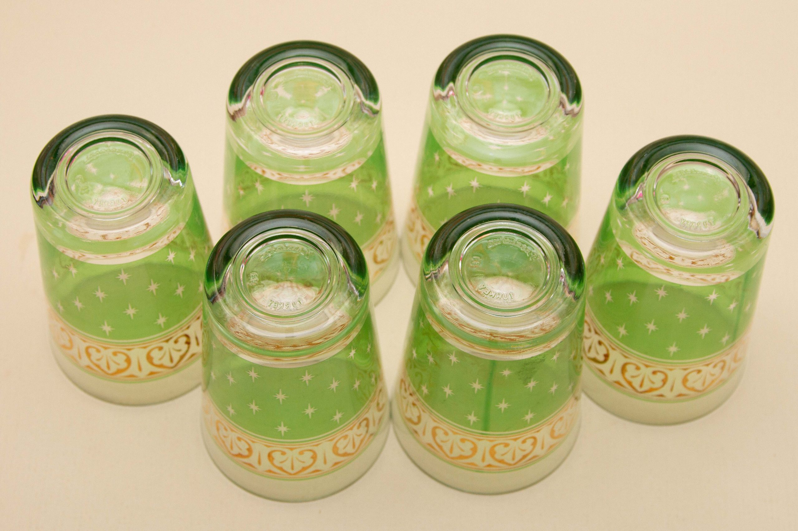A set of 6 vintage PASABAHCE glasses, decorated in green and gold. Made in Turkey