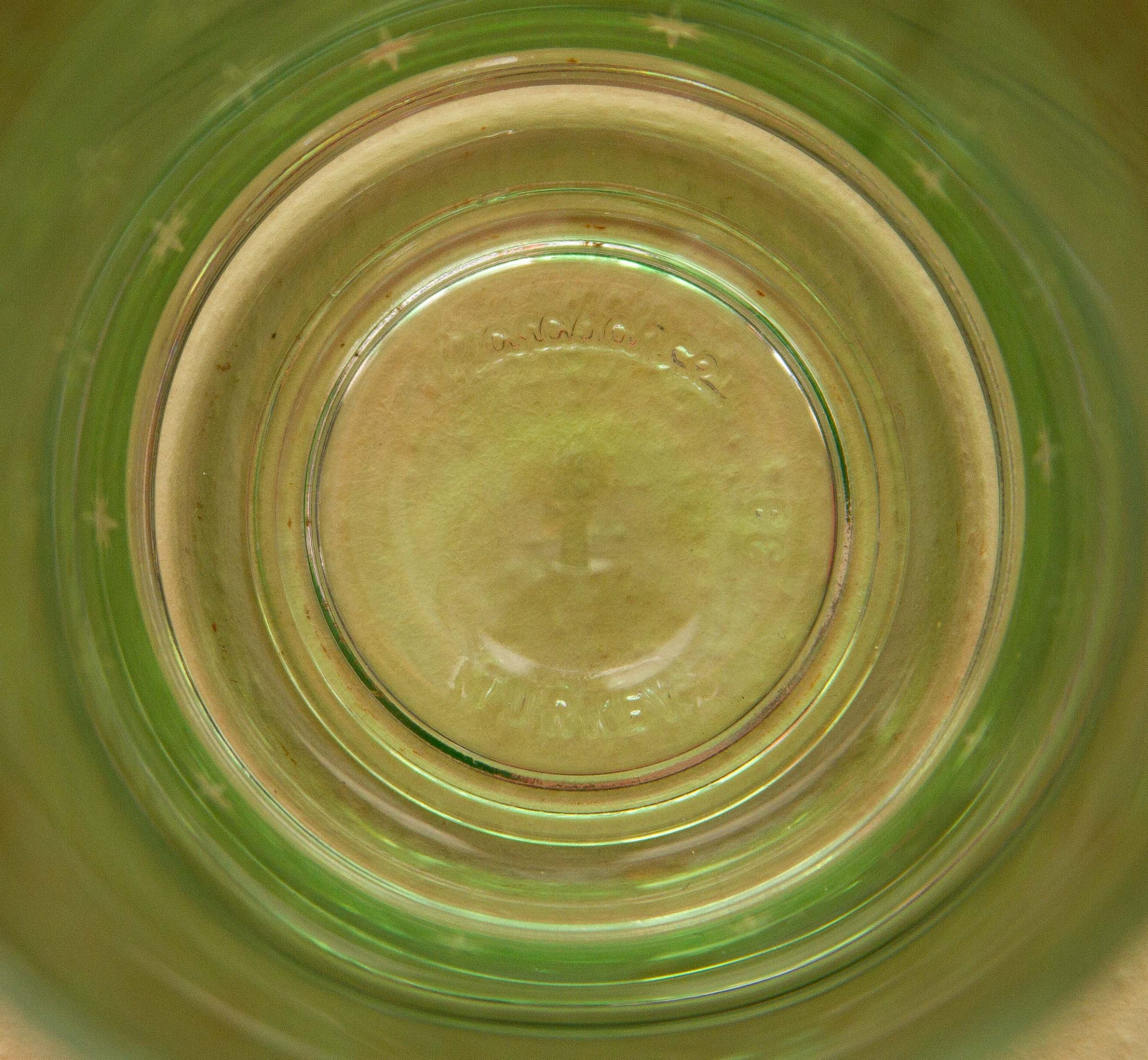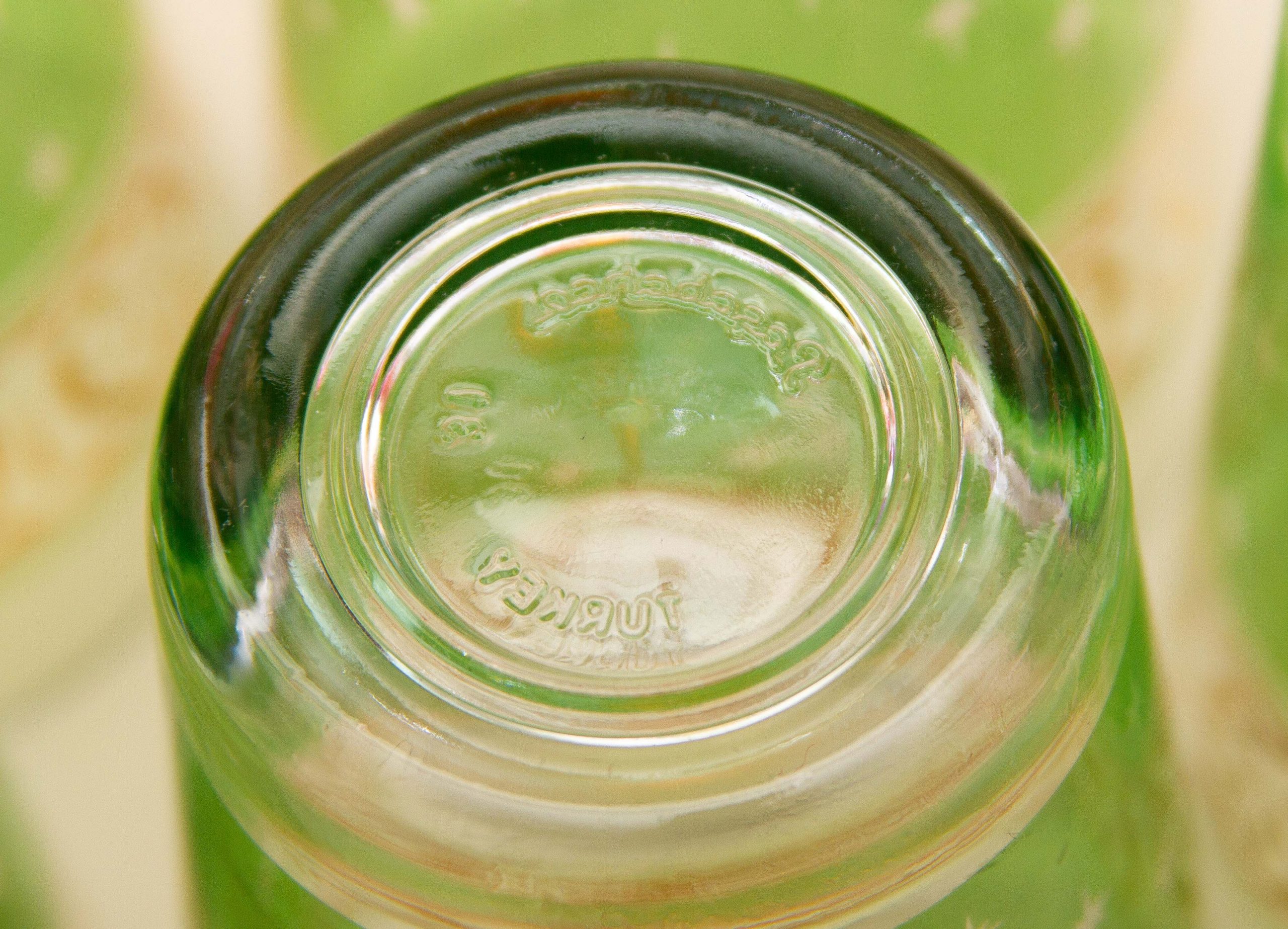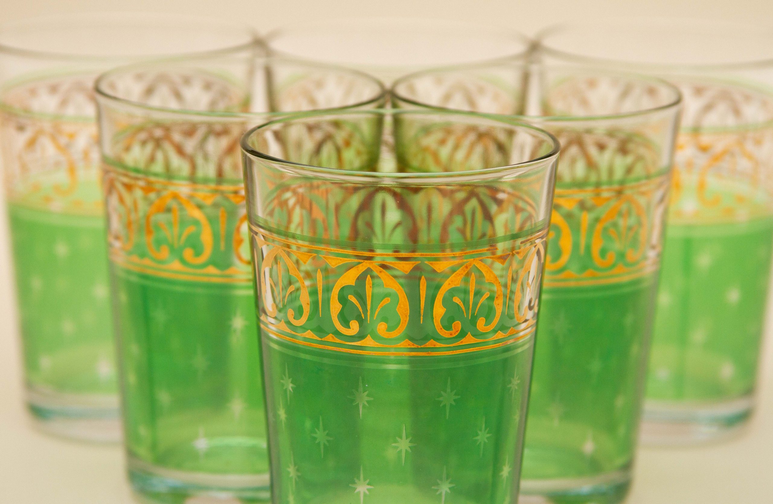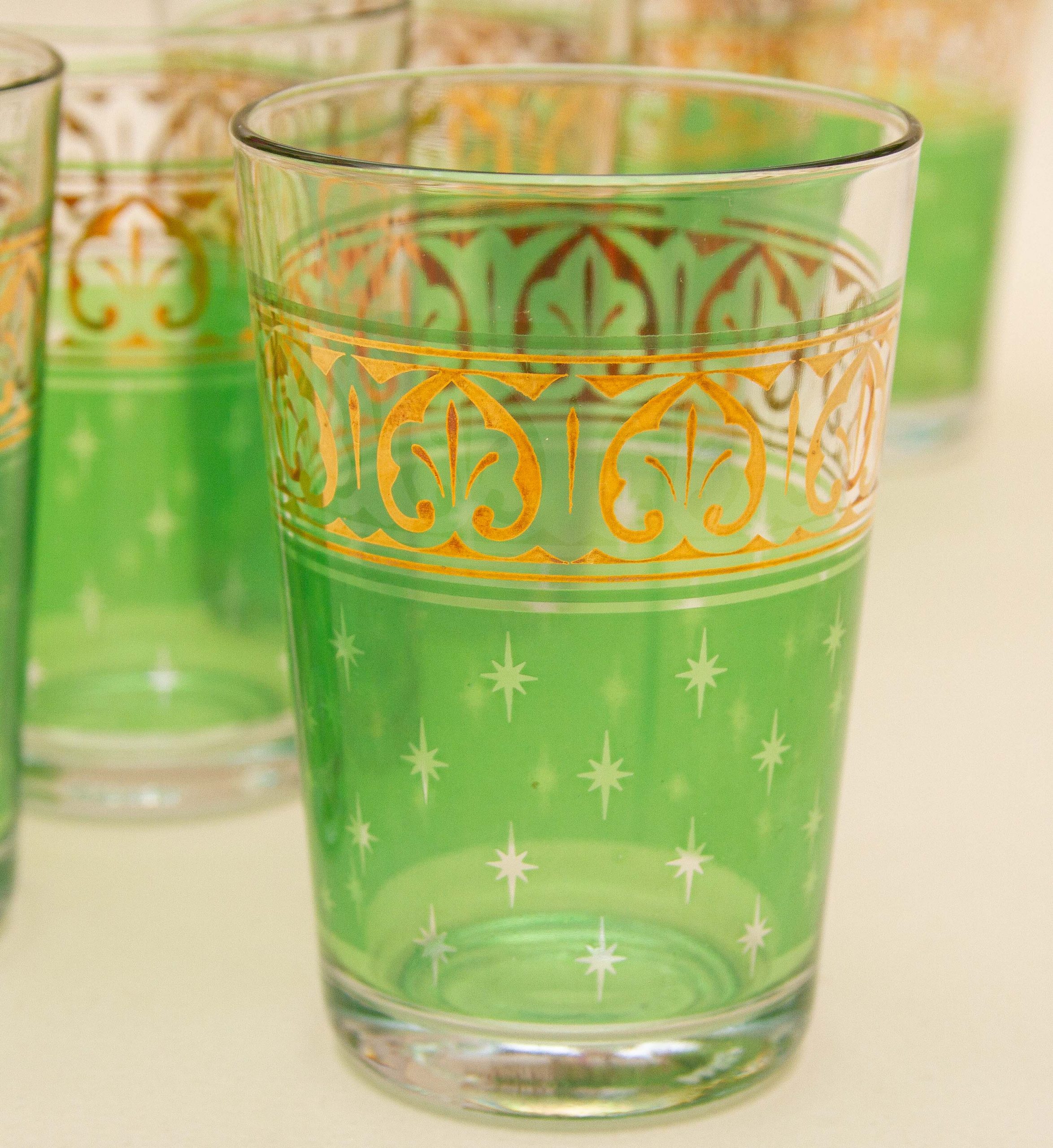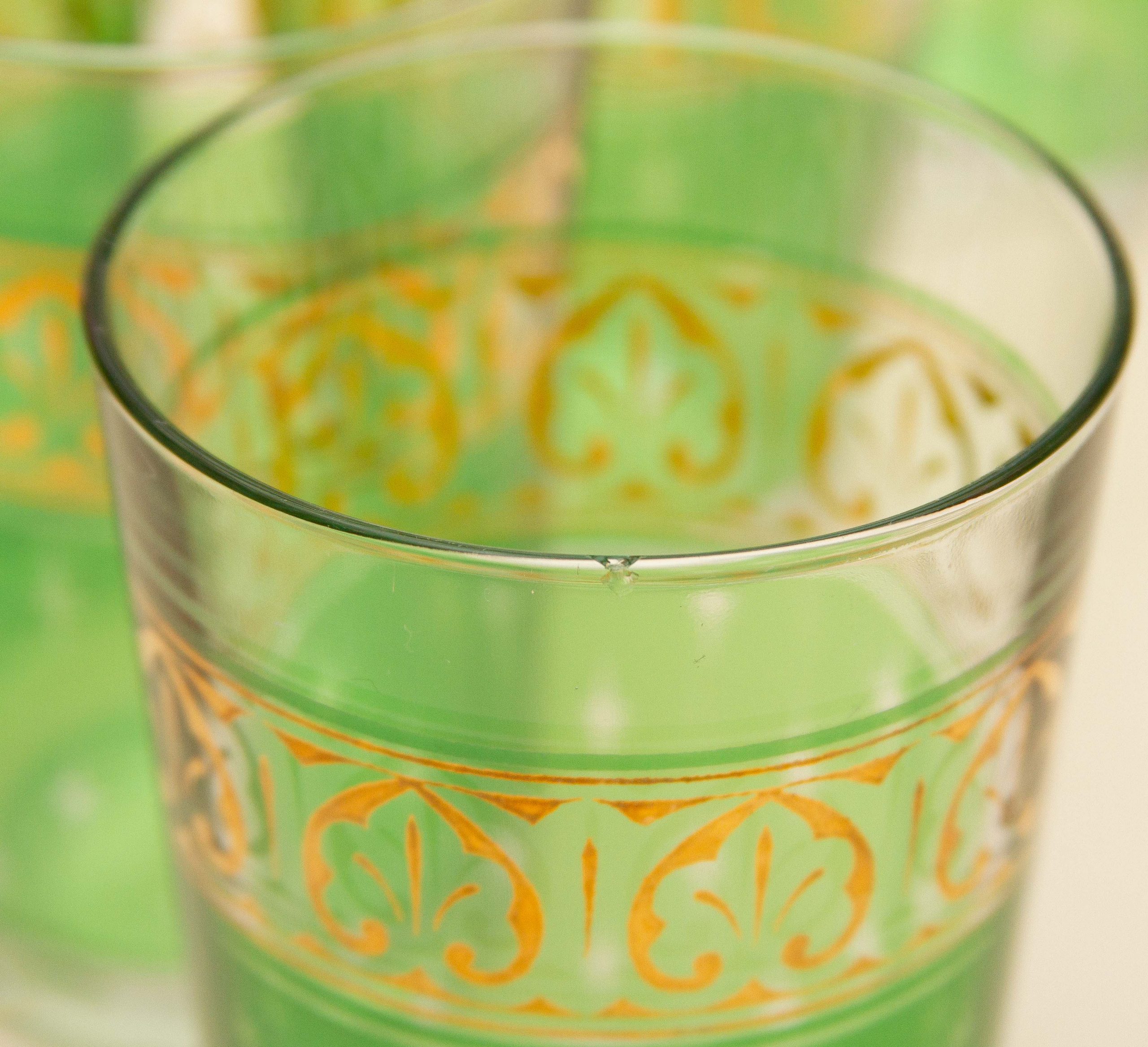 A set of 6 vintage PASABAHCE glasses, decorated in green and gold. Made in Turkey
