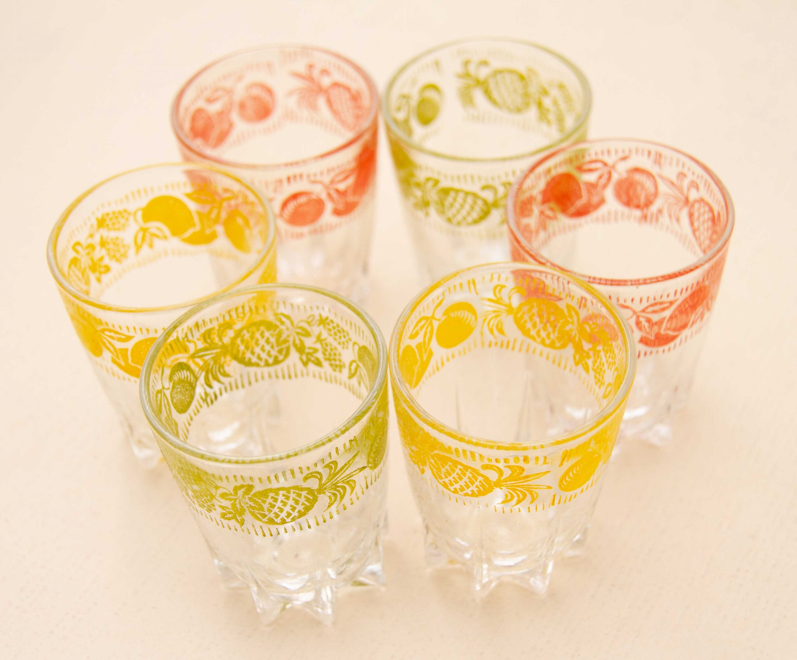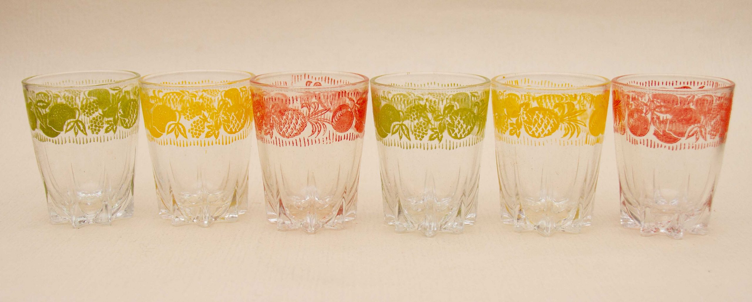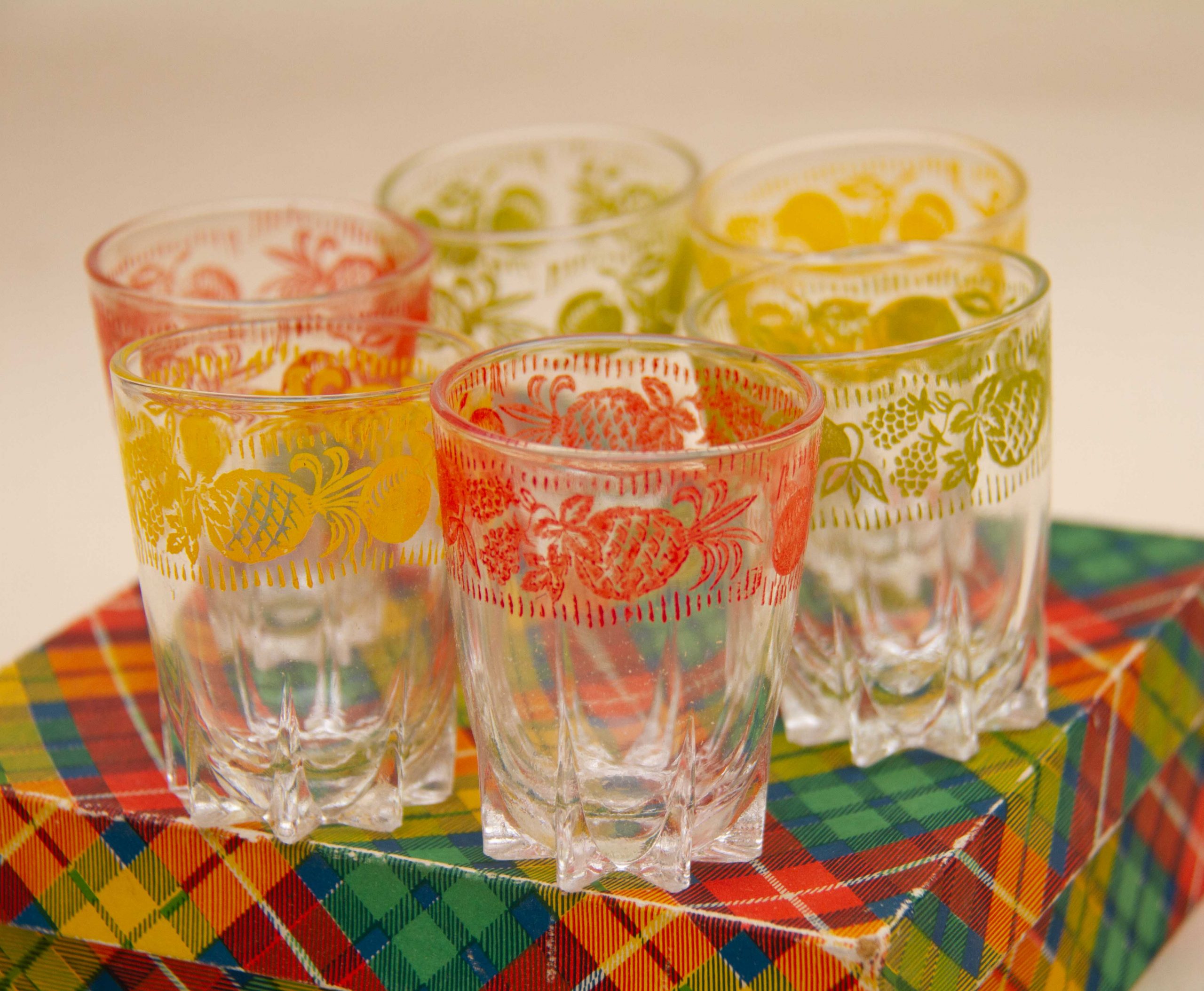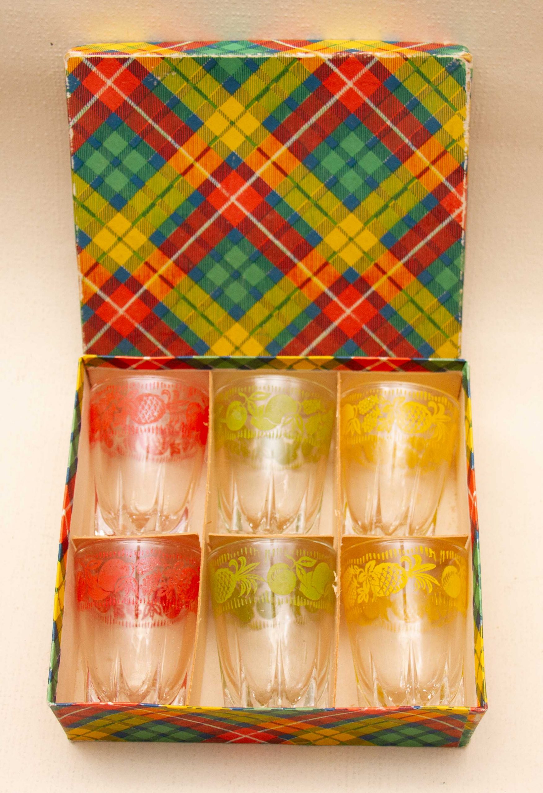 A set of six vintage shot glasses in a tartan pattern box. In red, yellow and green – 2 of each colour, with a tropical fruit pattern on.