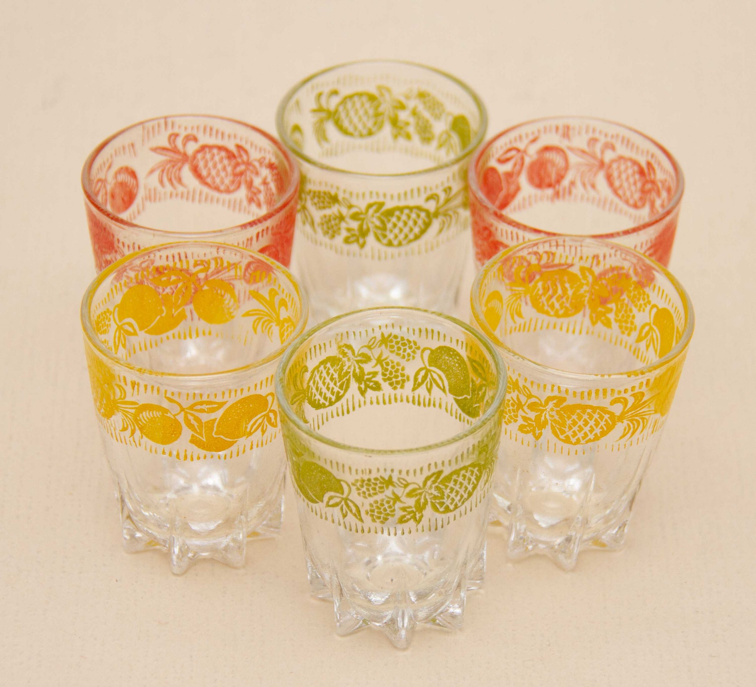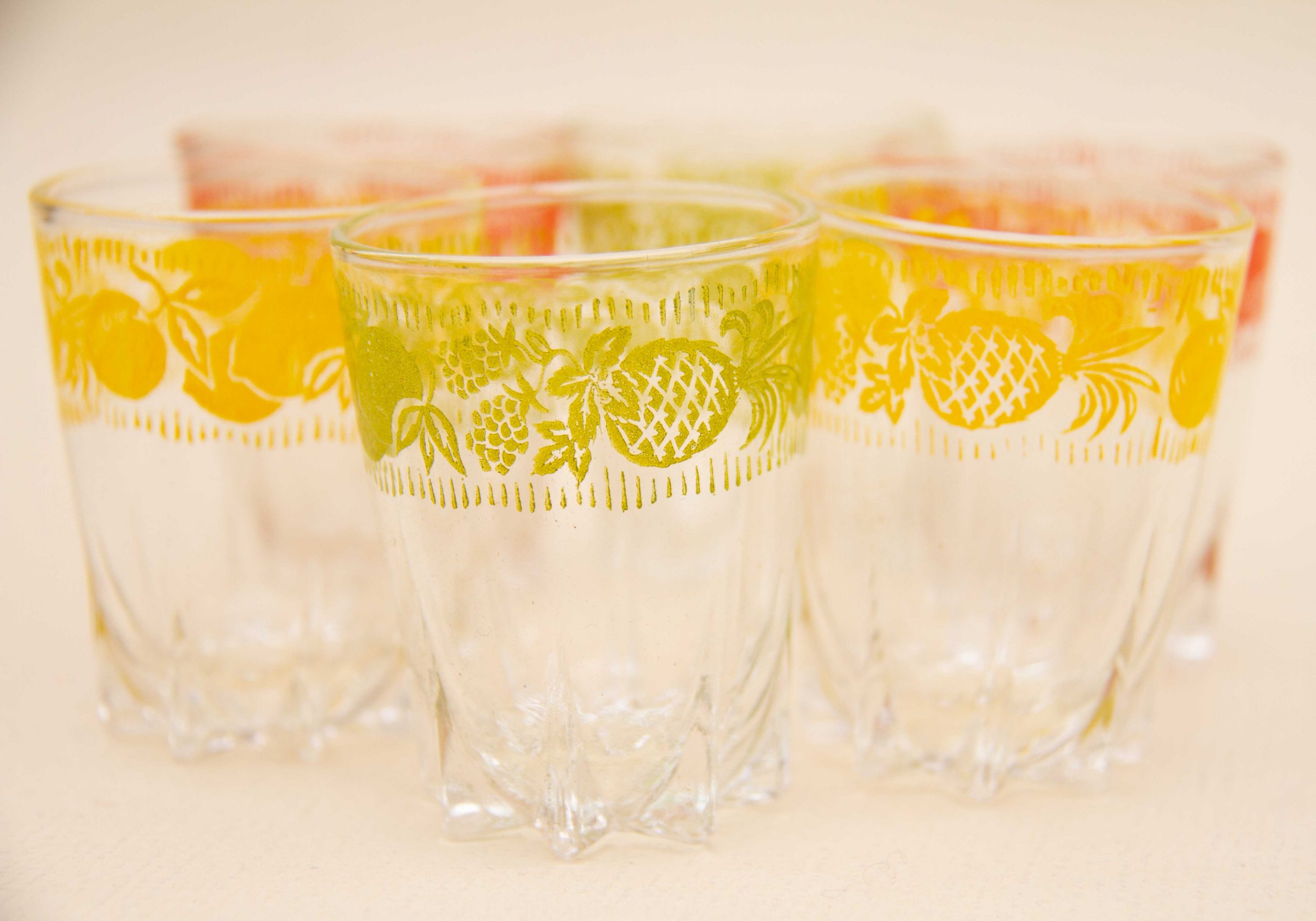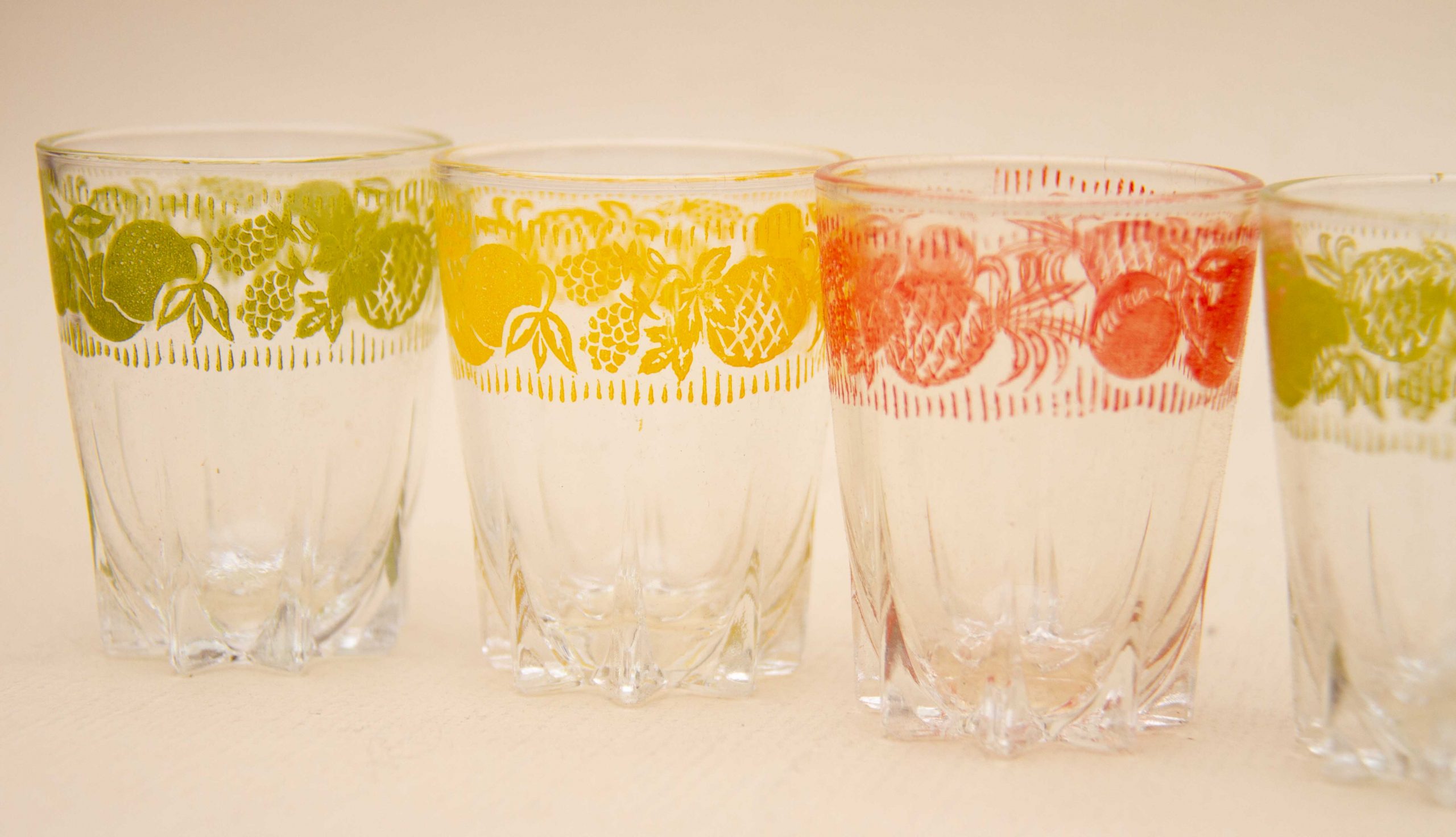 A set of six vintage shot glasses in a tartan pattern box. In red, yellow and green – 2 of each colour, with a tropical fruit pattern on.
