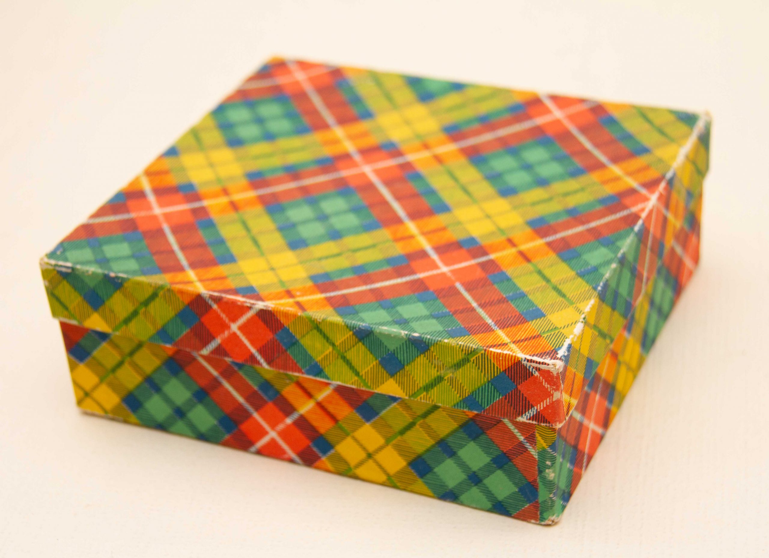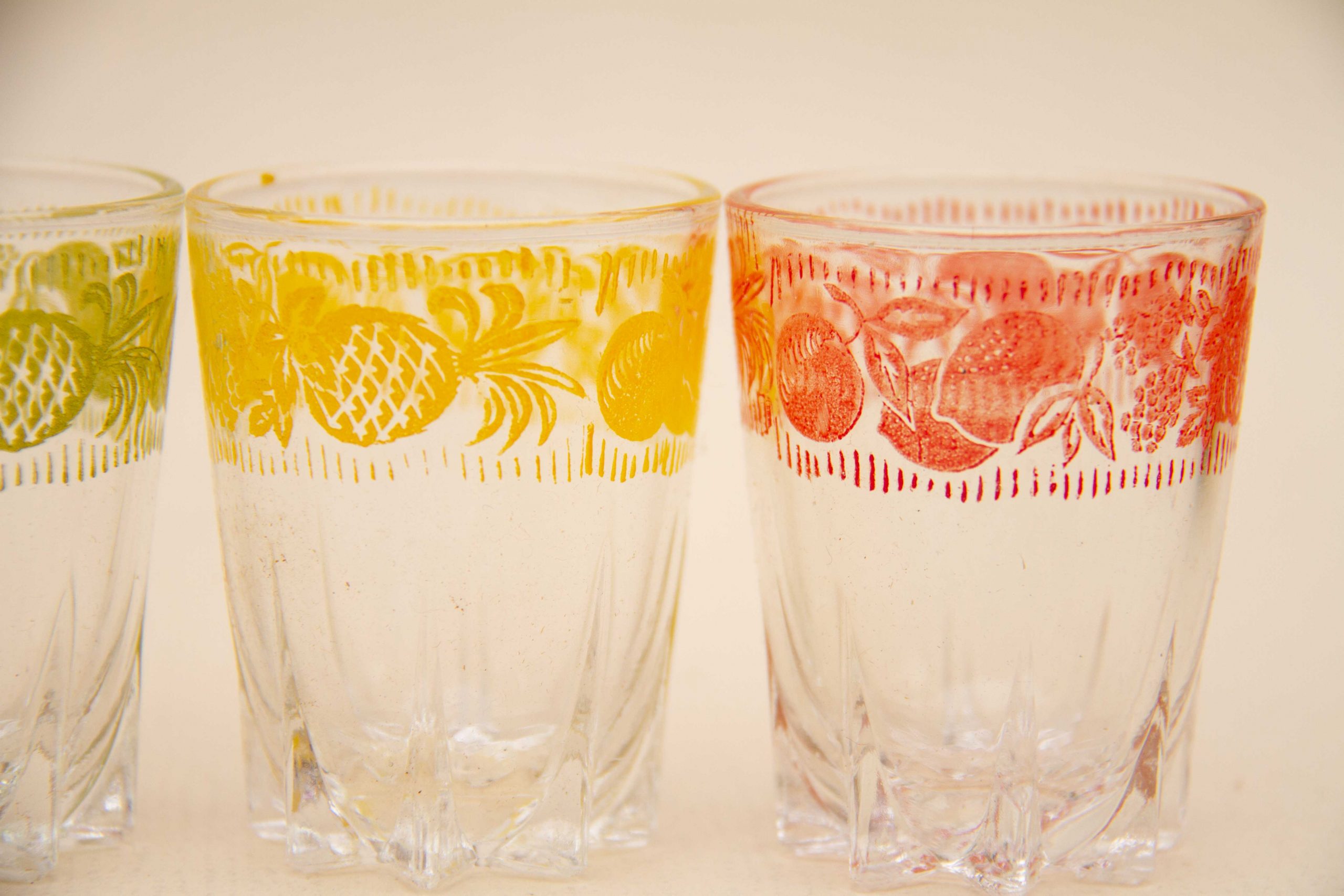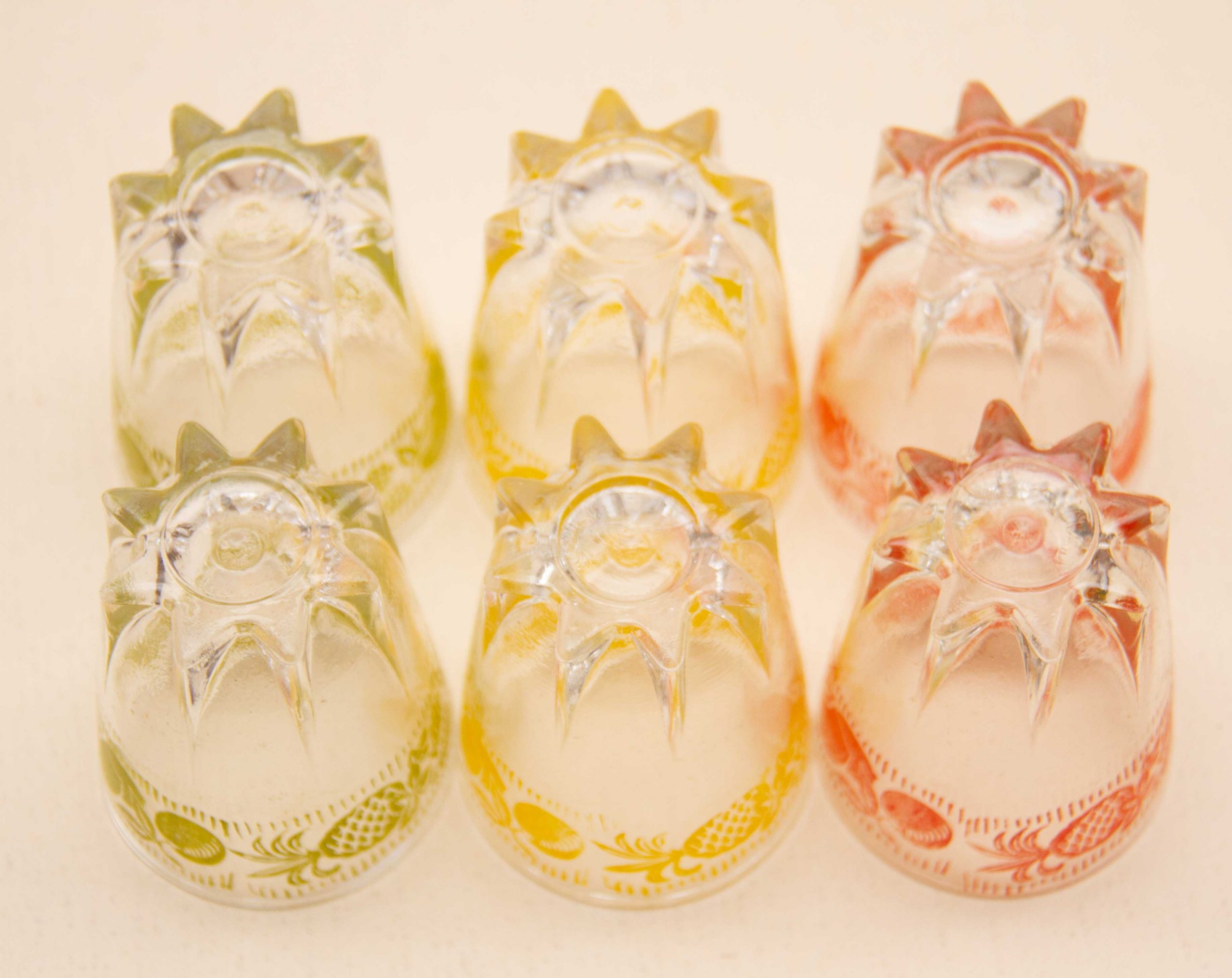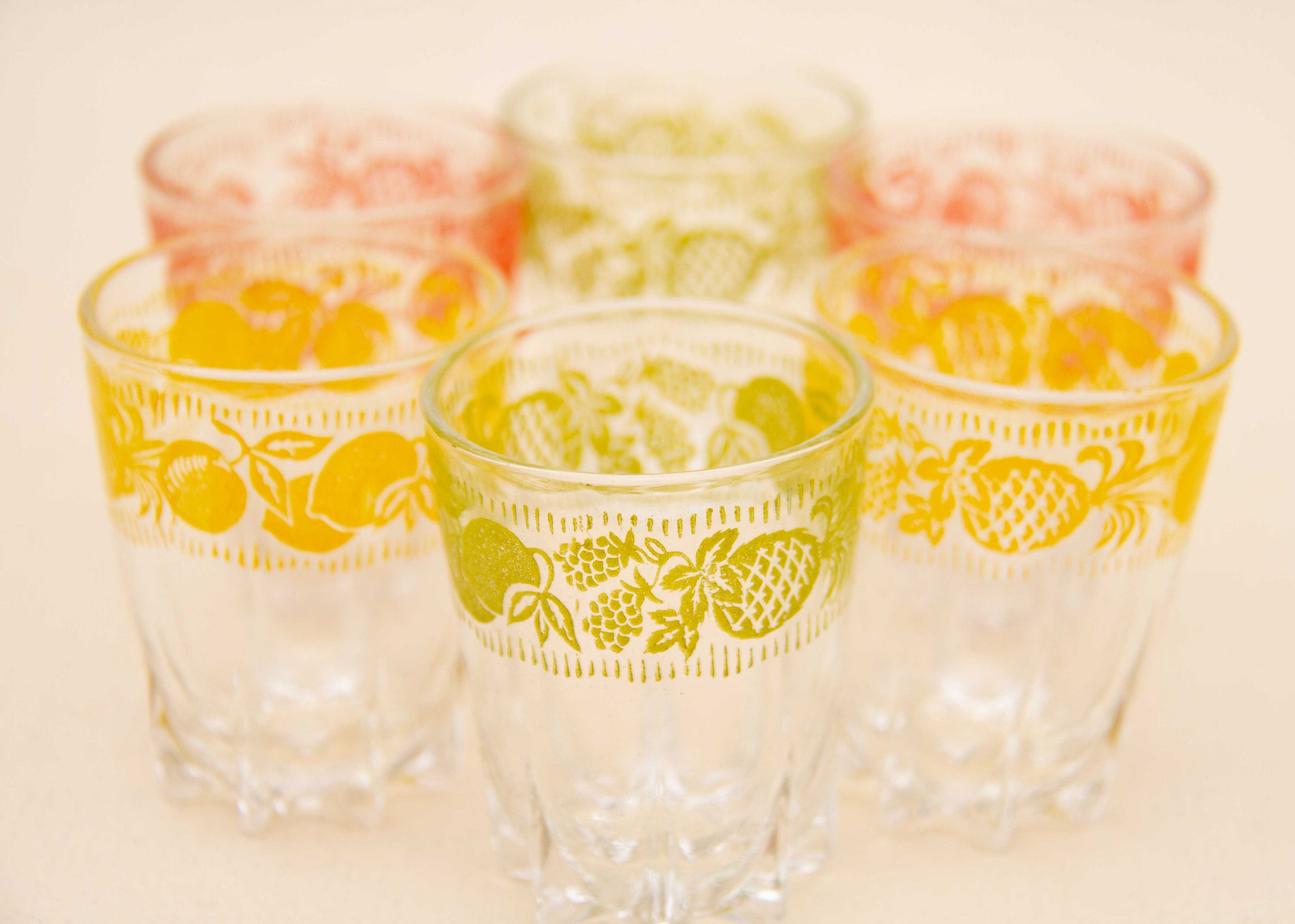 A set of six vintage shot glasses in a tartan pattern box. In red, yellow and green – 2 of each colour, with a tropical fruit pattern on.