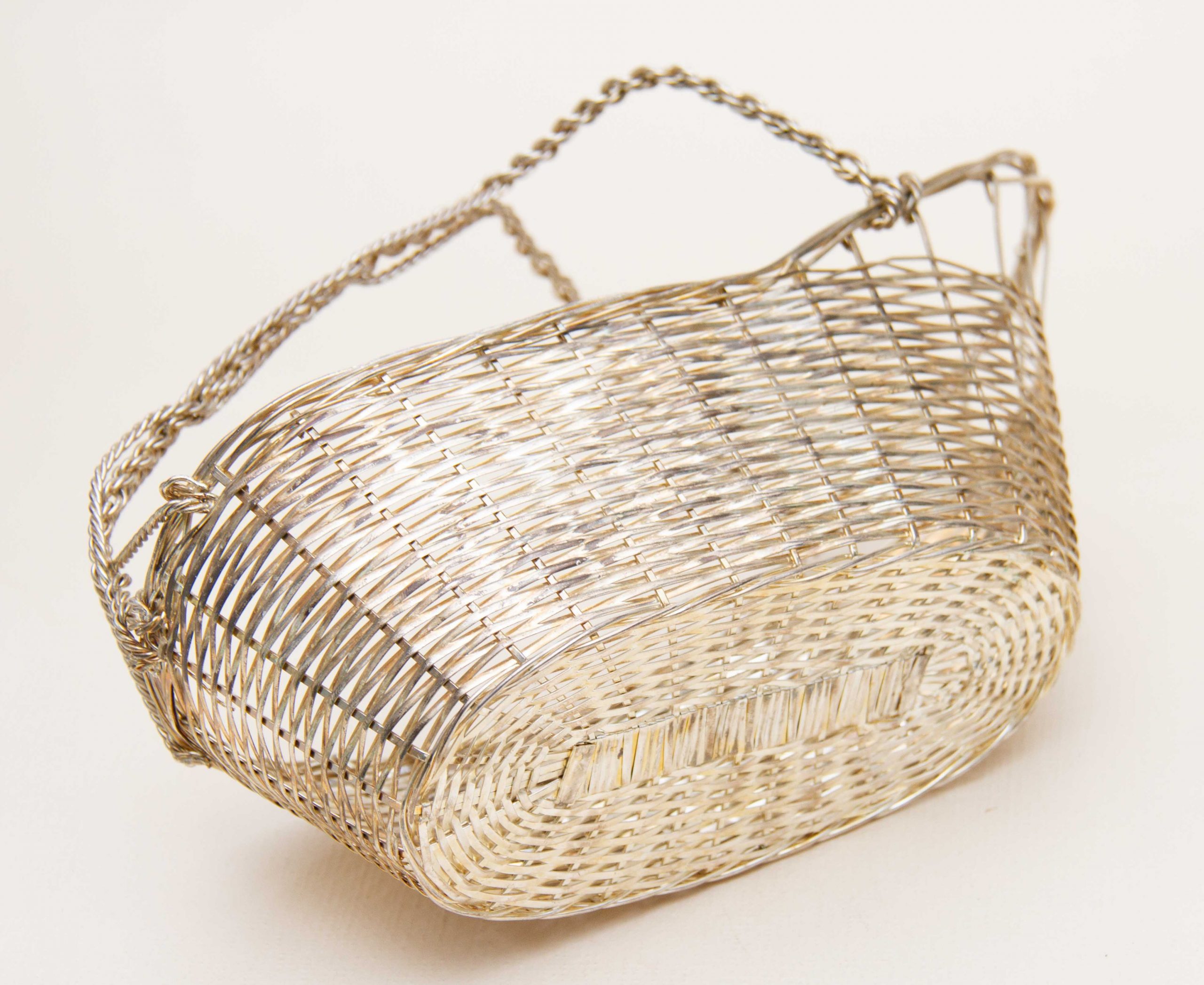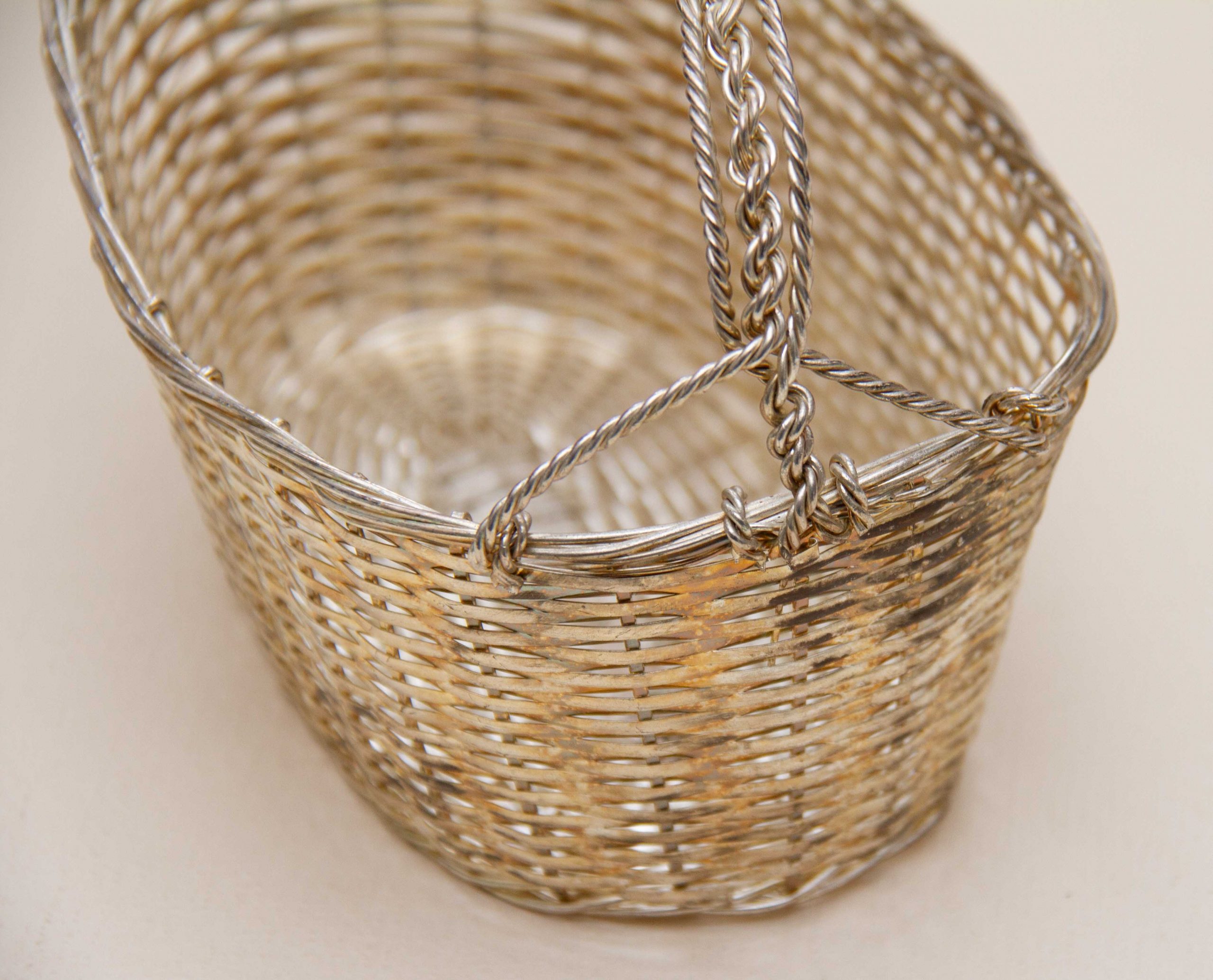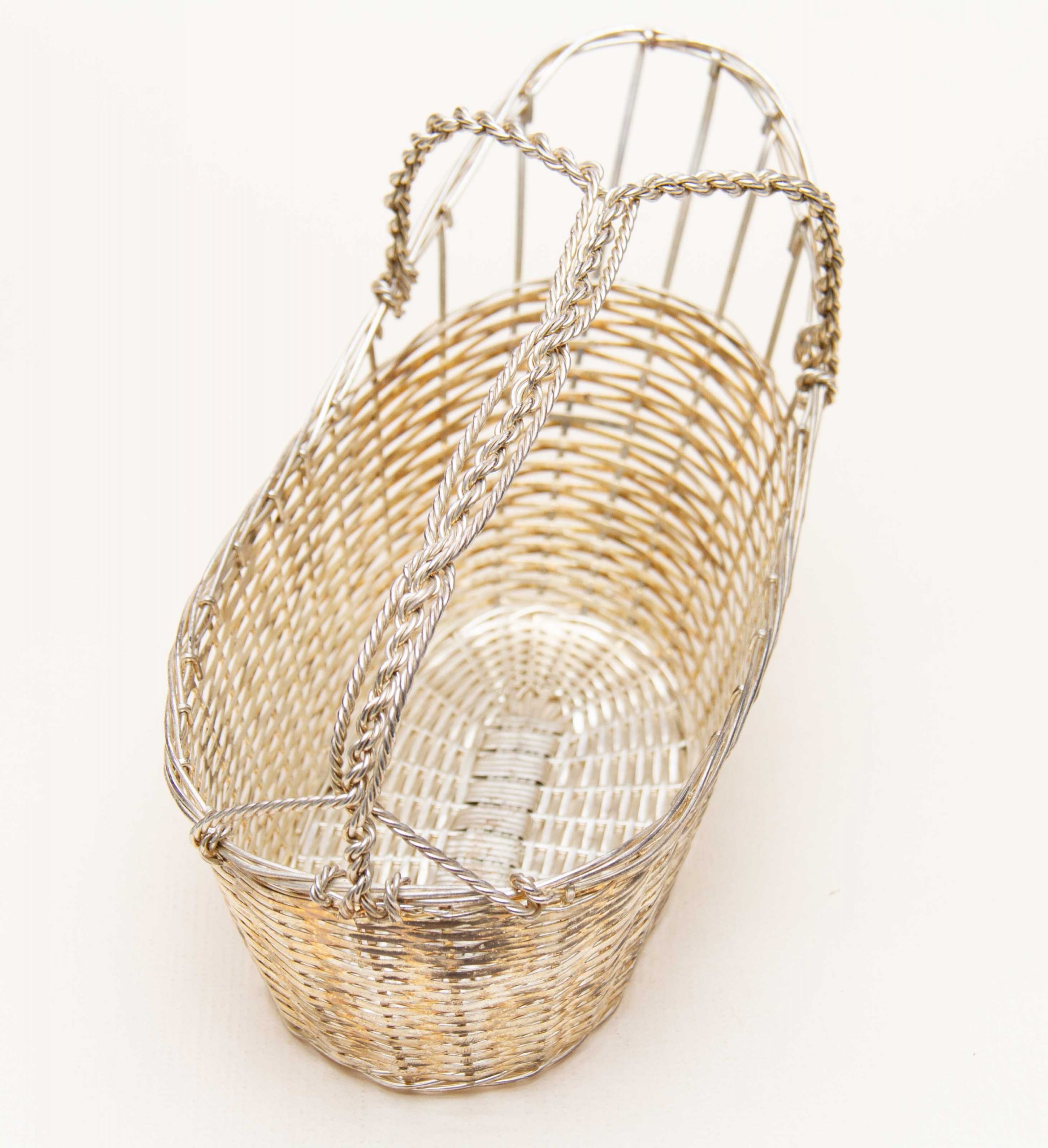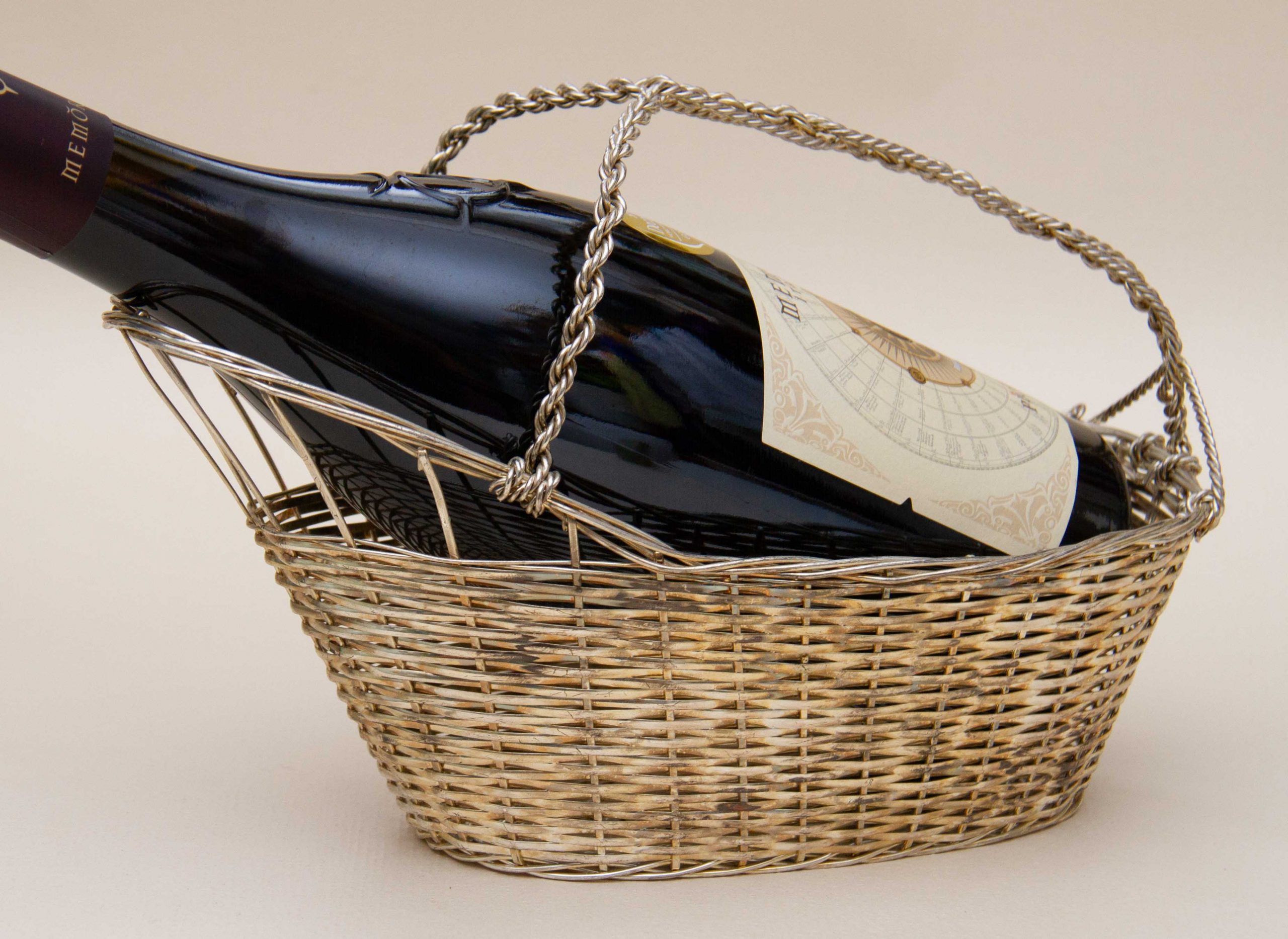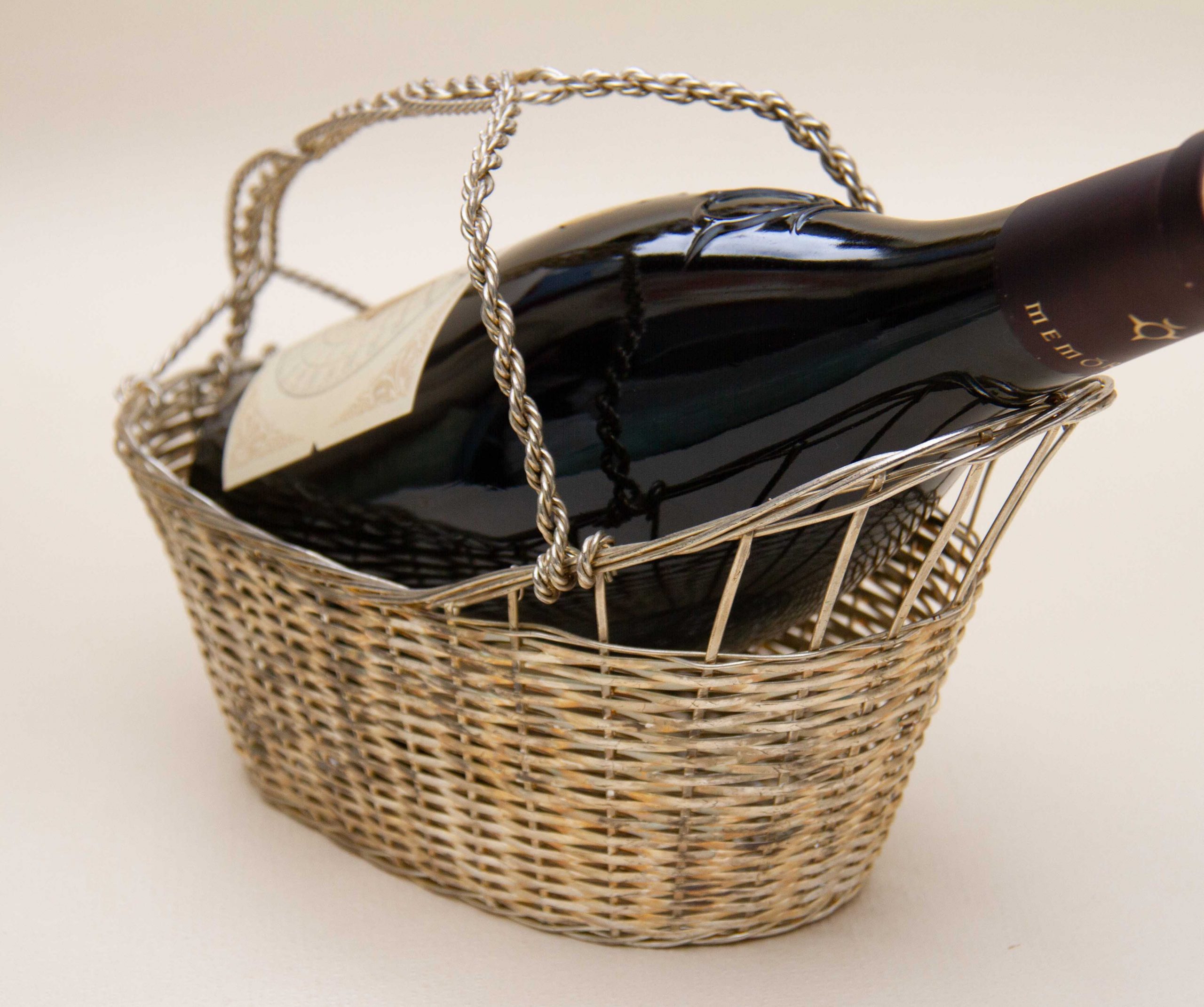 A vintage silver plated woven basket wine bottle pourer and holder with a handle. Perfect for displaying and presenting a special bottle of wine.